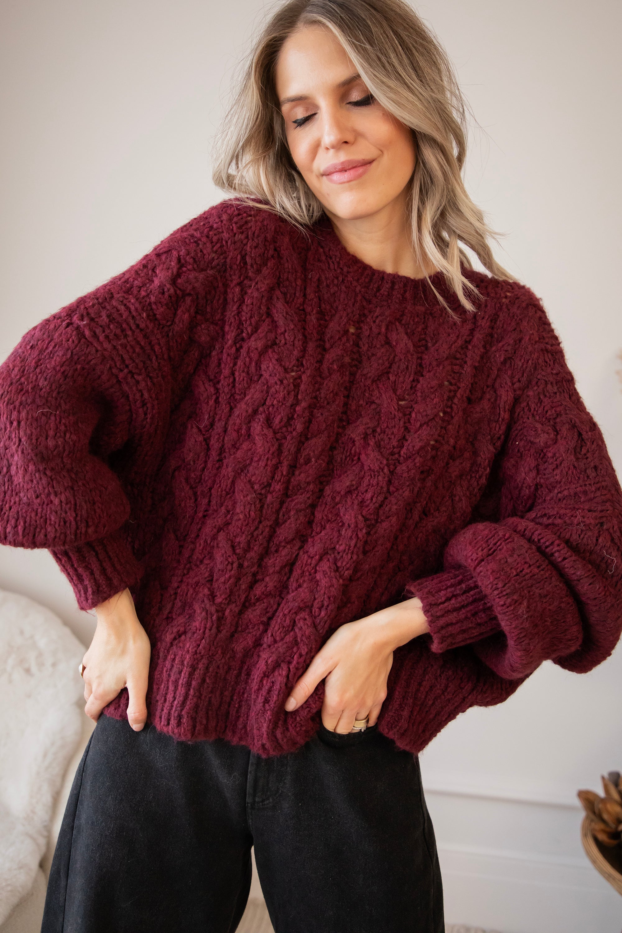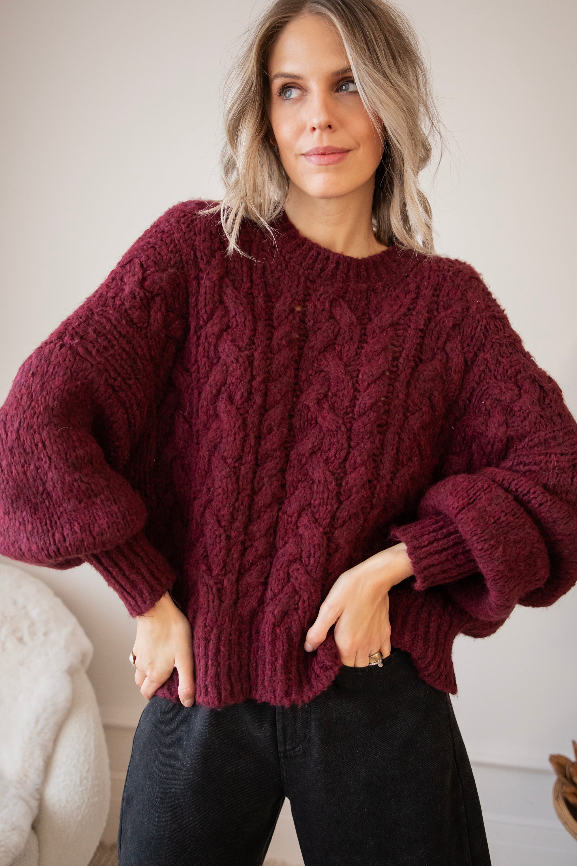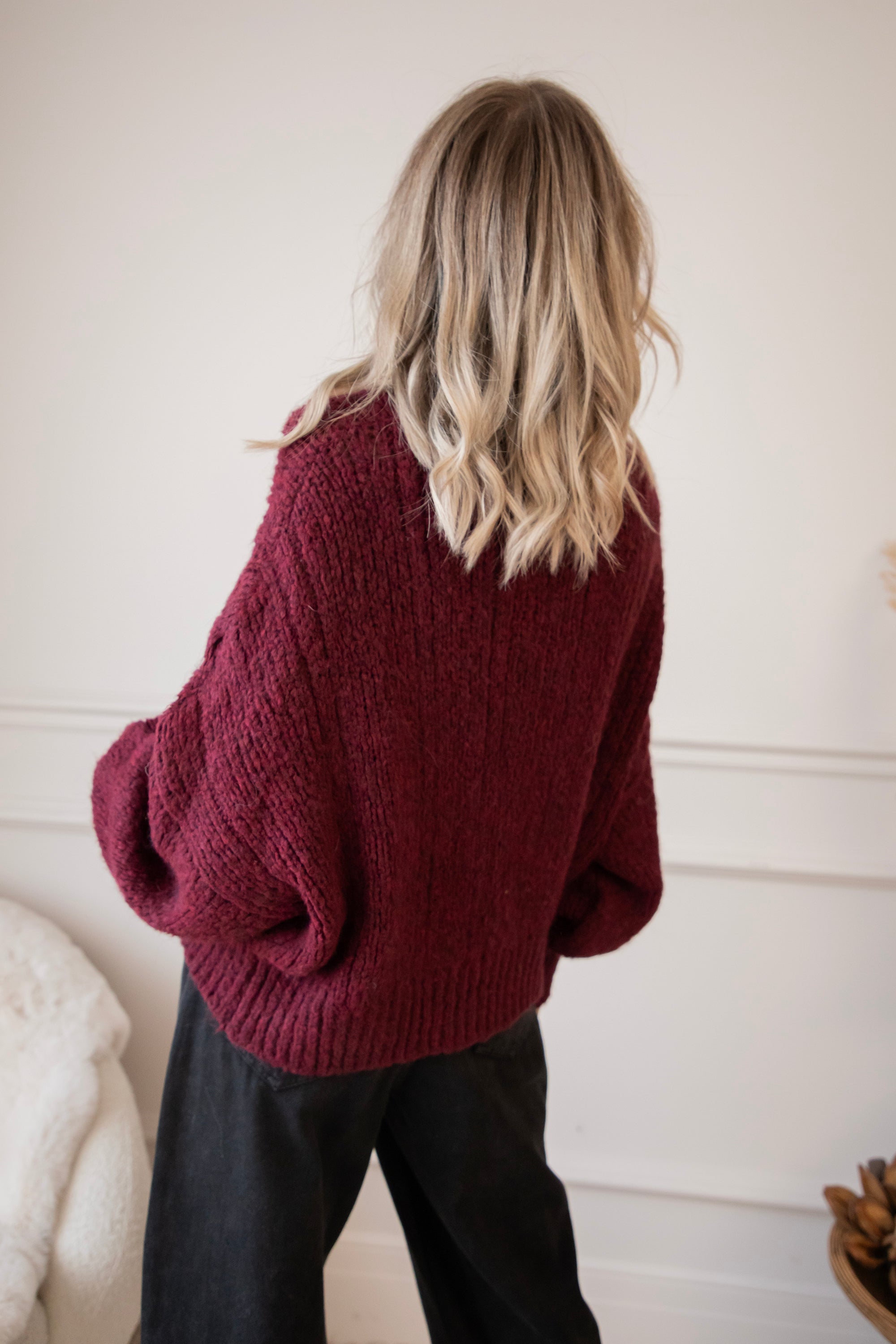 Ja echt, het kabelpatroon charmeert mij elke keer weer! 🥹 Het straalt gewoon zoveel gezelligheid uit en… deze trui is mijn nieuwe winterfavoriet! Het baggy modelletje met die schattige pofmouwtjes en natuurlijk die warme bordeaux kleur… ahhh, ik smelt gewoon ❤️