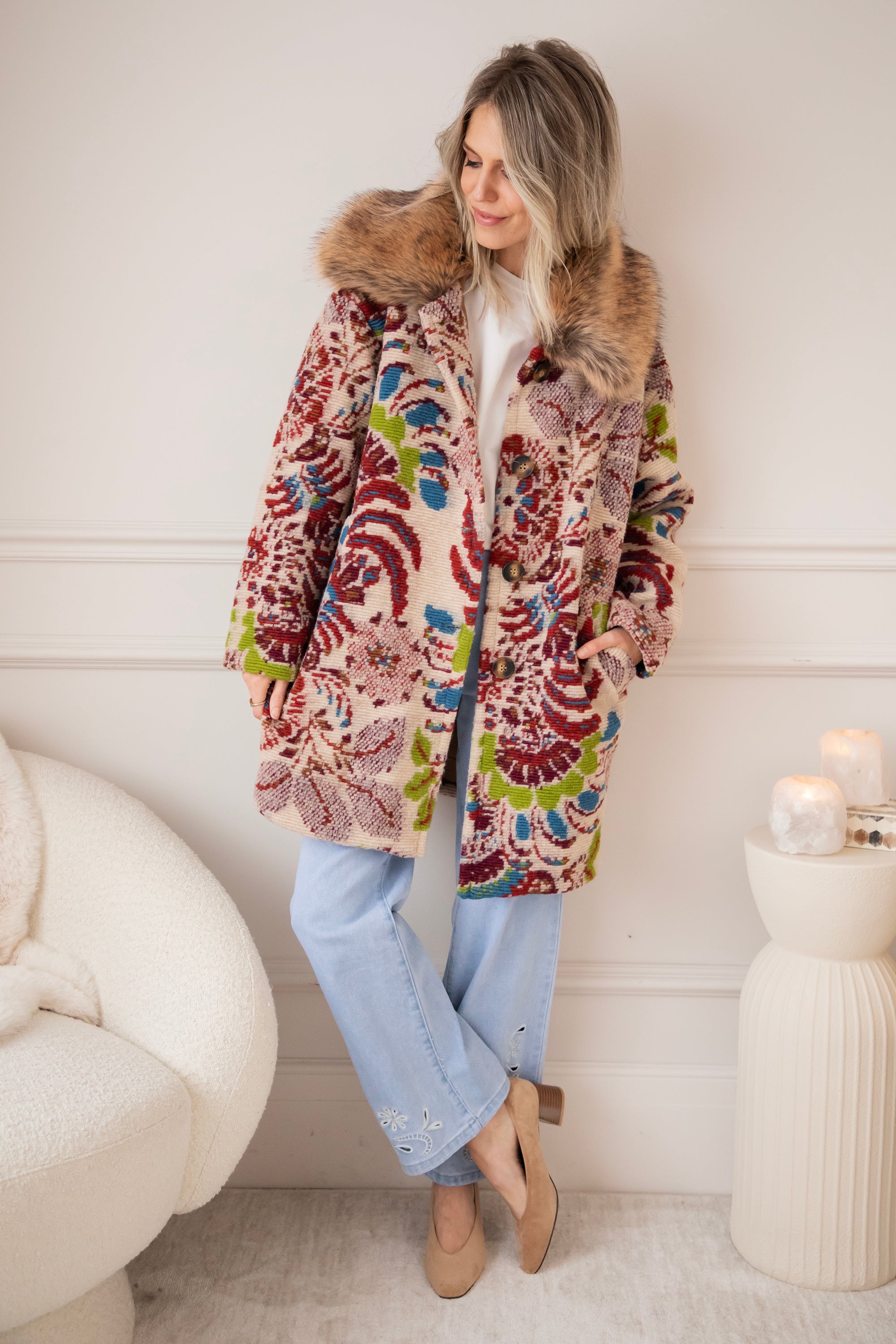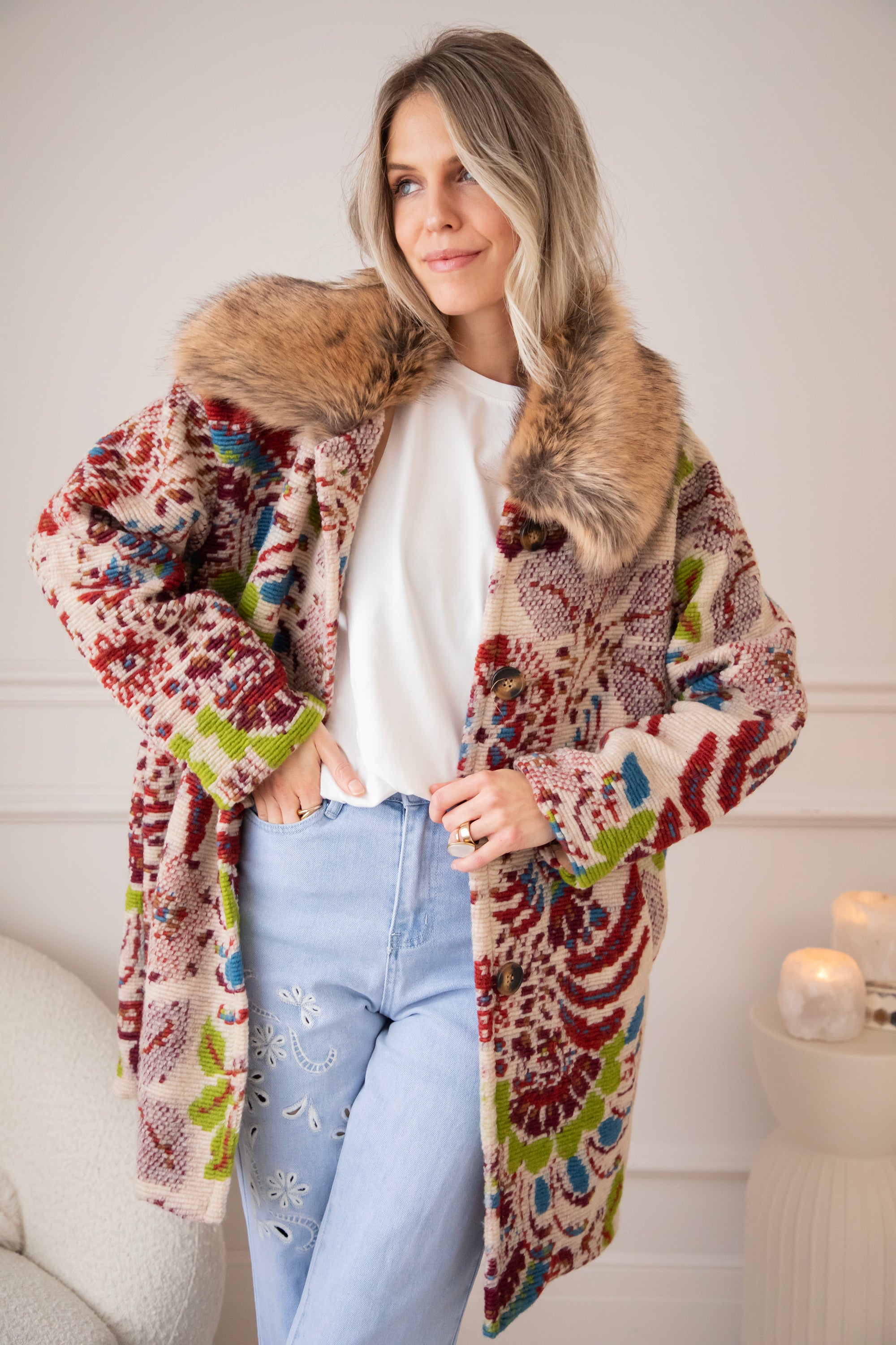 De faux fur kraag in luxueuze camel- en bruintinten maakt het geheel extra zacht en chic, precies dat beetje warmte en luxe dat je look compleet maakt ✨