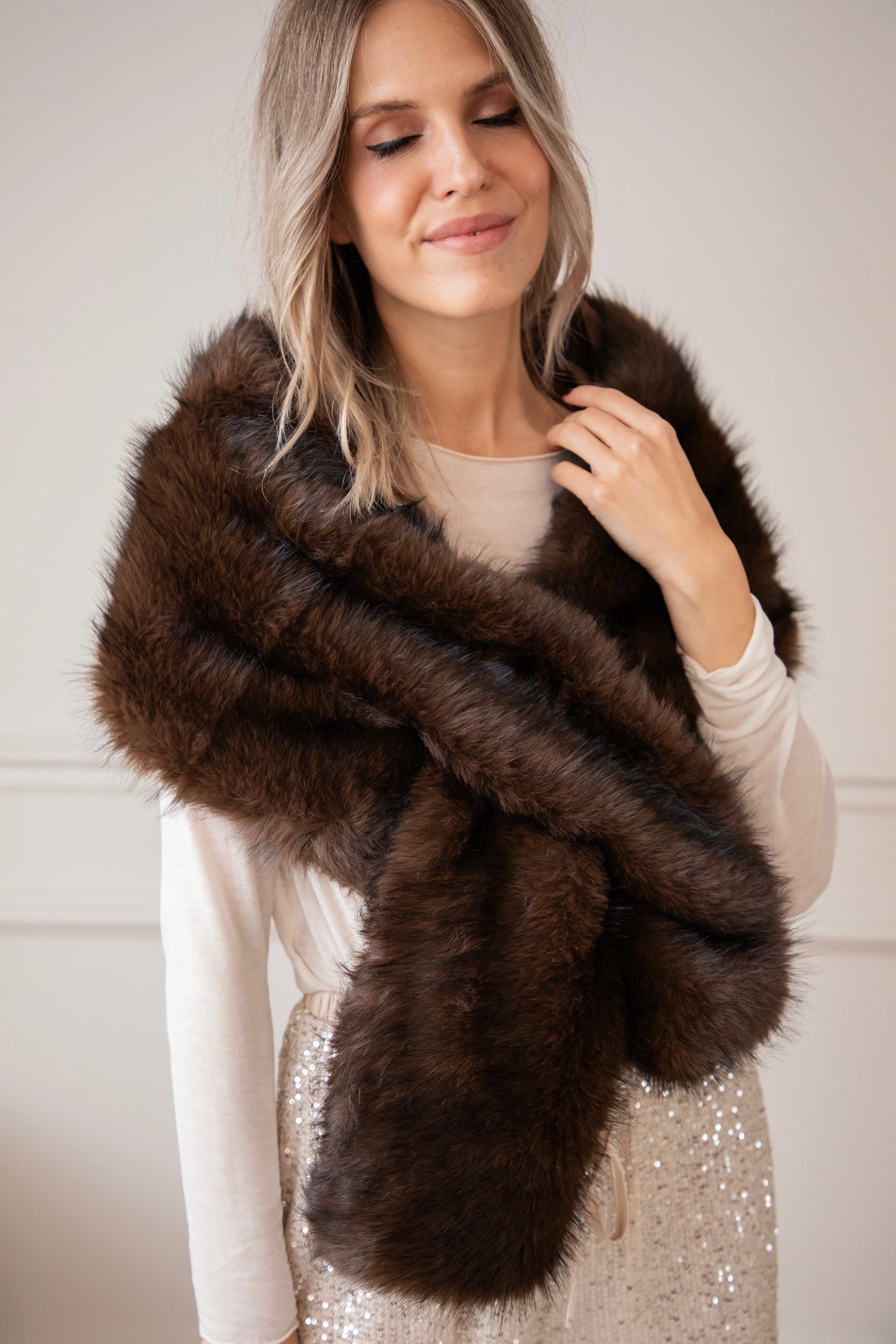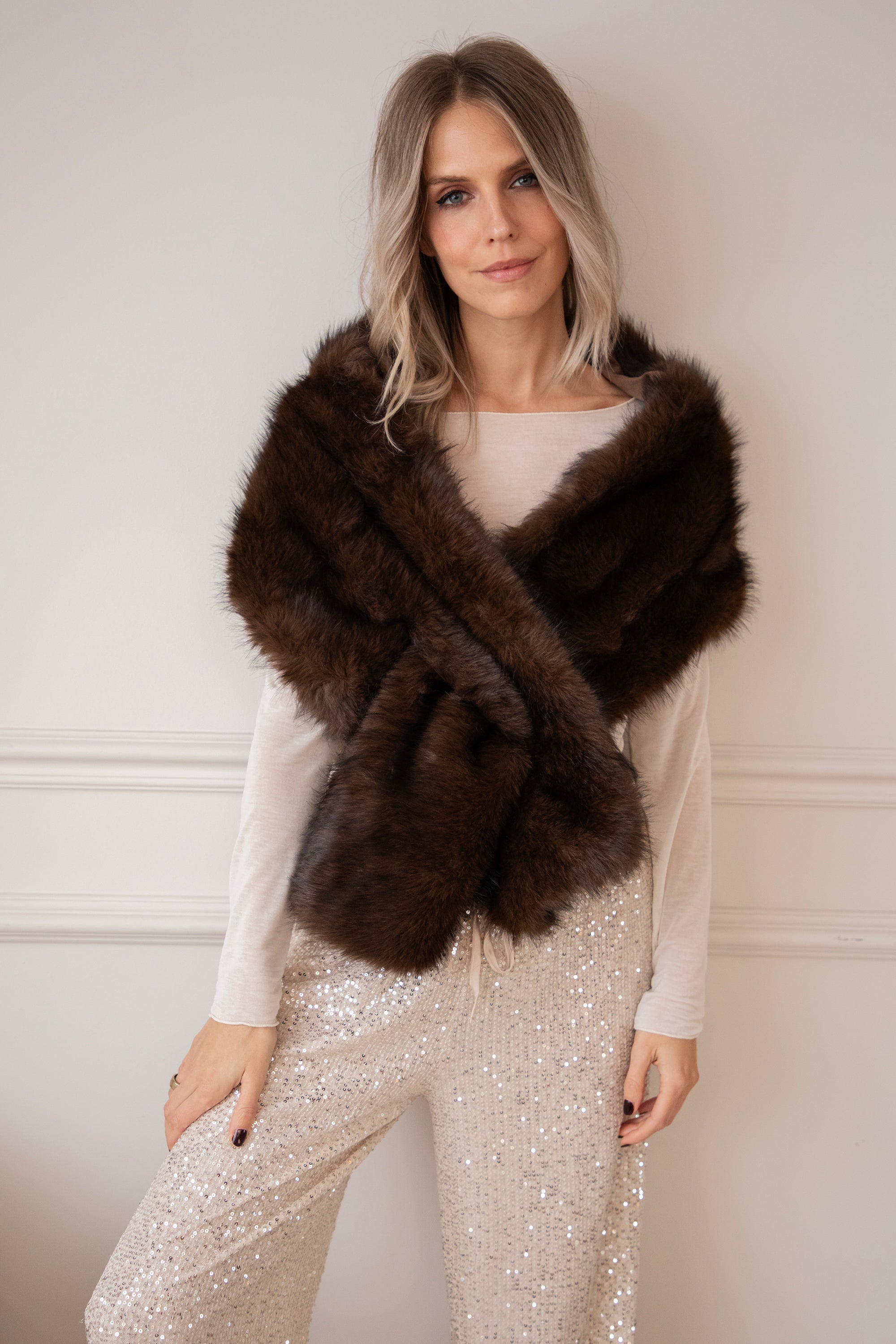 Onze Fur Hugs sjaal is een heerlijk bont exemplaar in warme bruine ombre tinten! Je kunt ‘m zo sierlijk om je heen draperen 🎀 Echt een klasse stuk! Ik draag ze het liefst een beetje naar beneden over de schouders heen, als een elegante stola 😍 Zo krijgt je outfit meteen een classy touch!