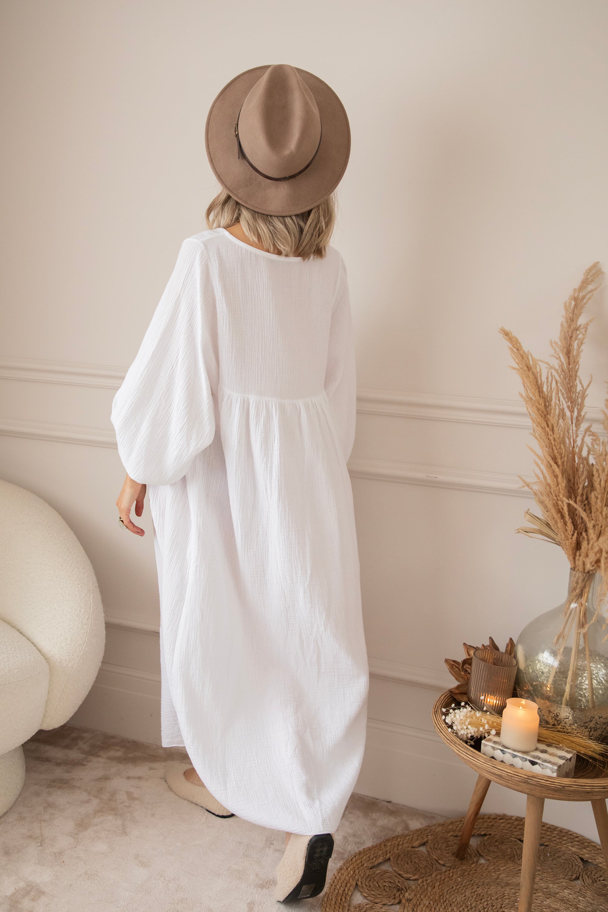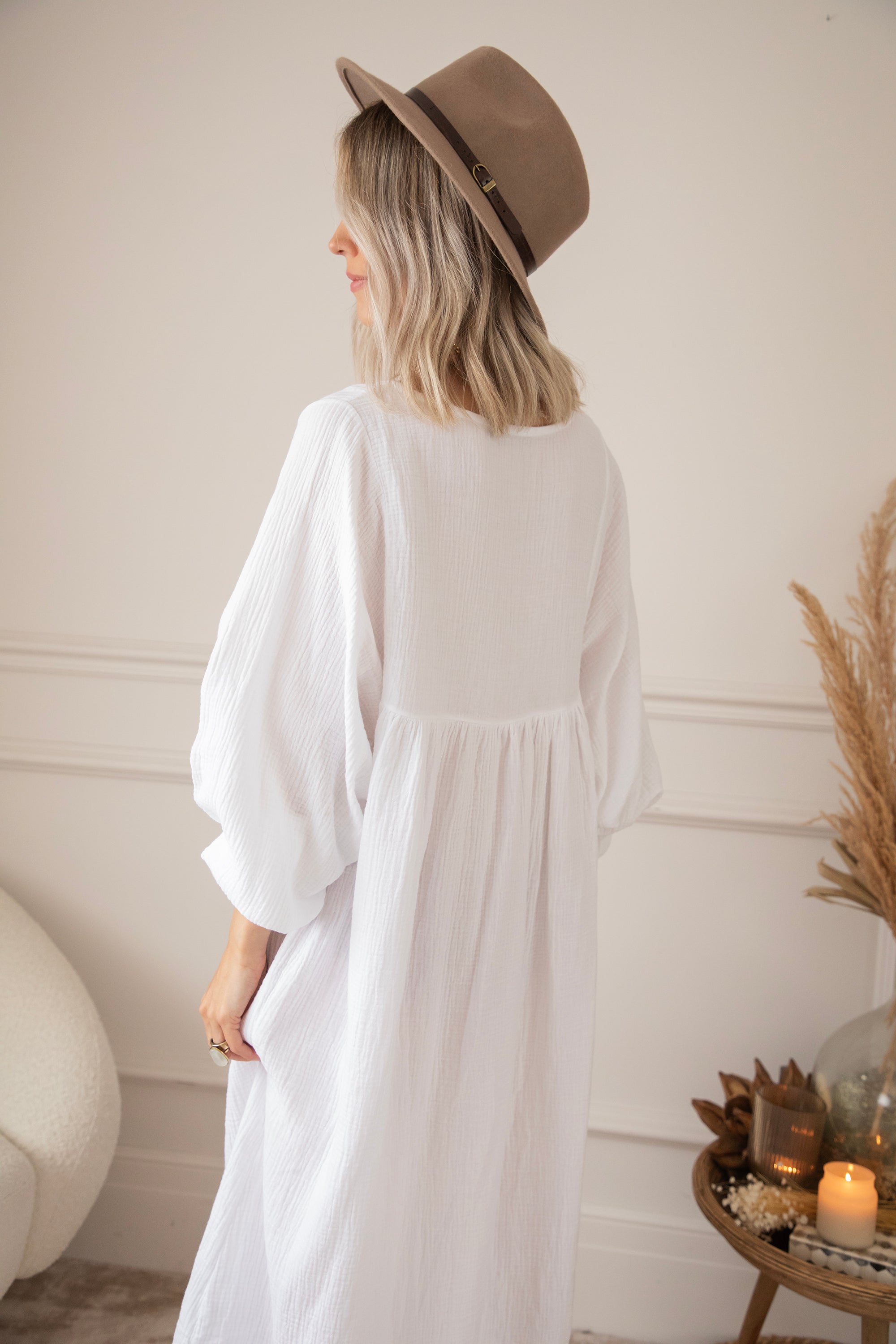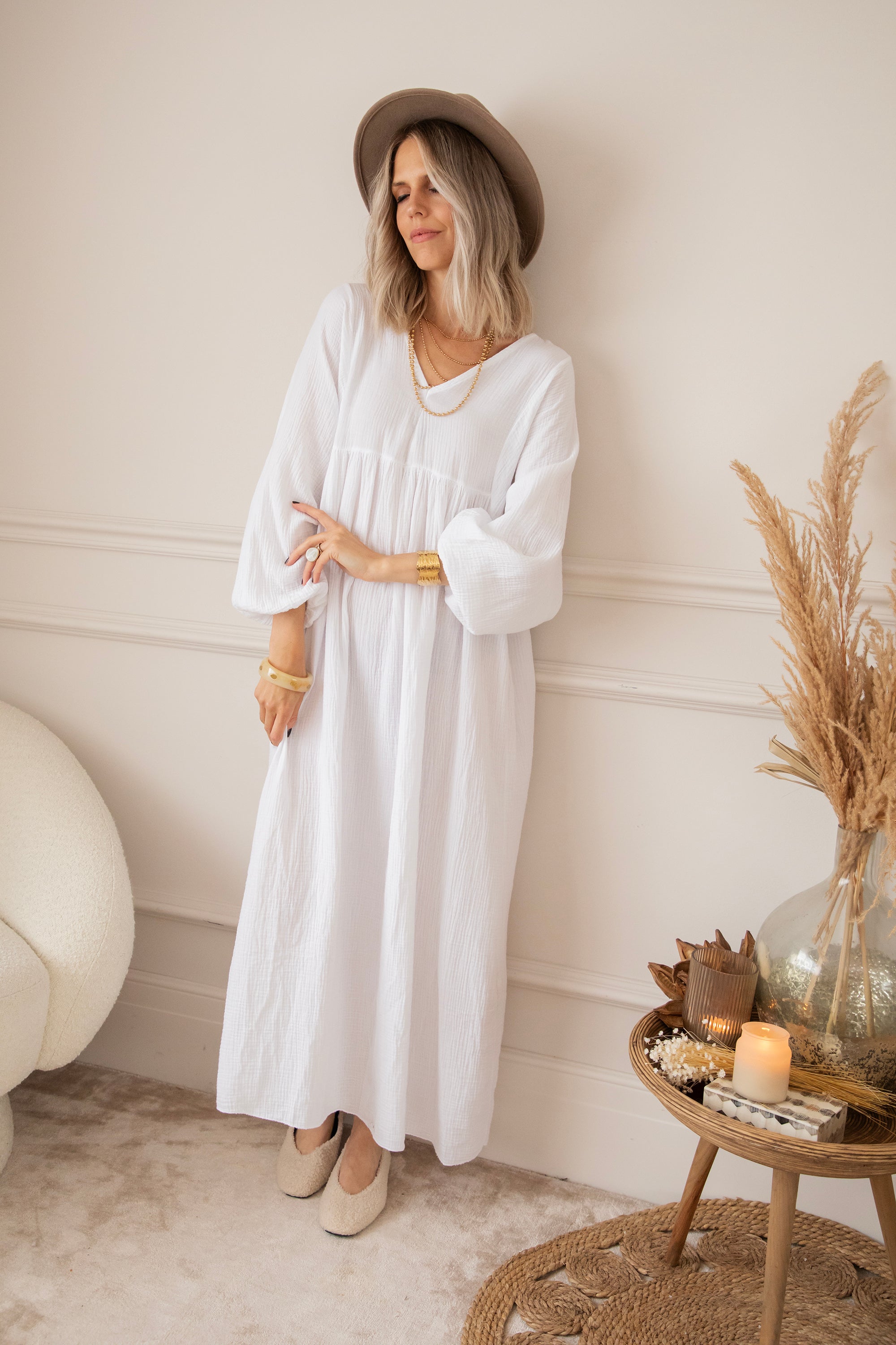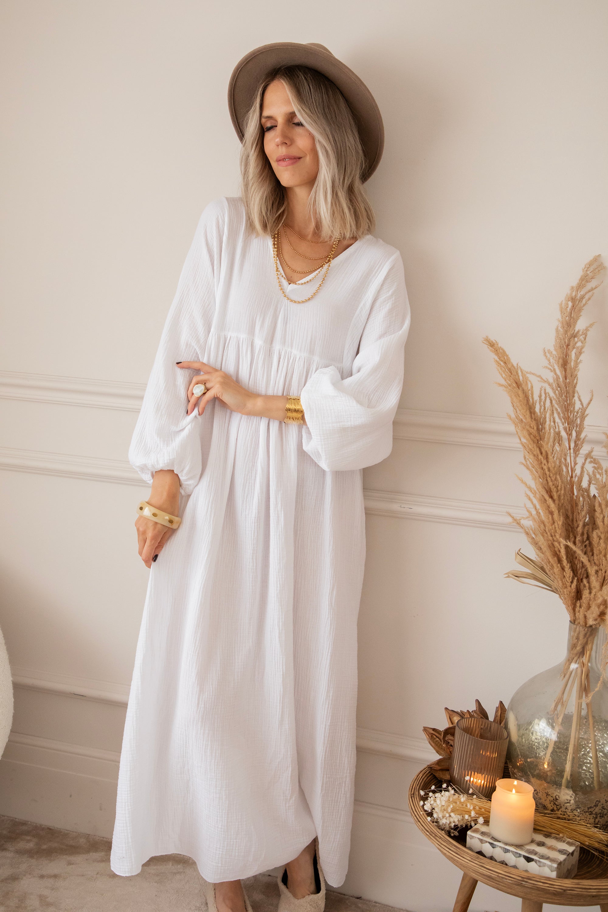 De jurk valt vrij wijd! Ik vind dat héérlijk 🤩 De achterkant valt ook ietsje langer! Vanaf de boezem wijdt de jurk mooi naar buiten en zwiert ze leuk 🎀