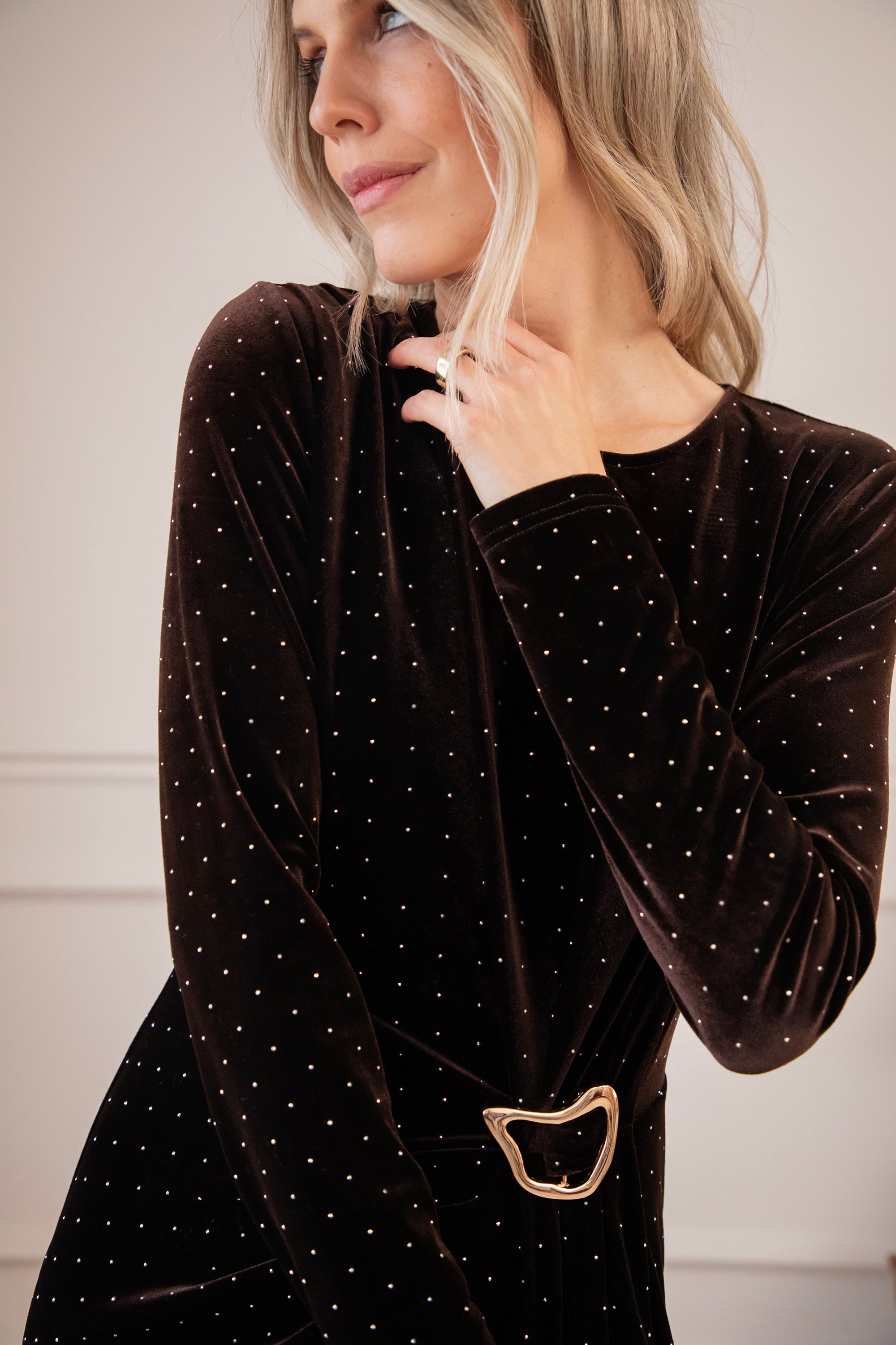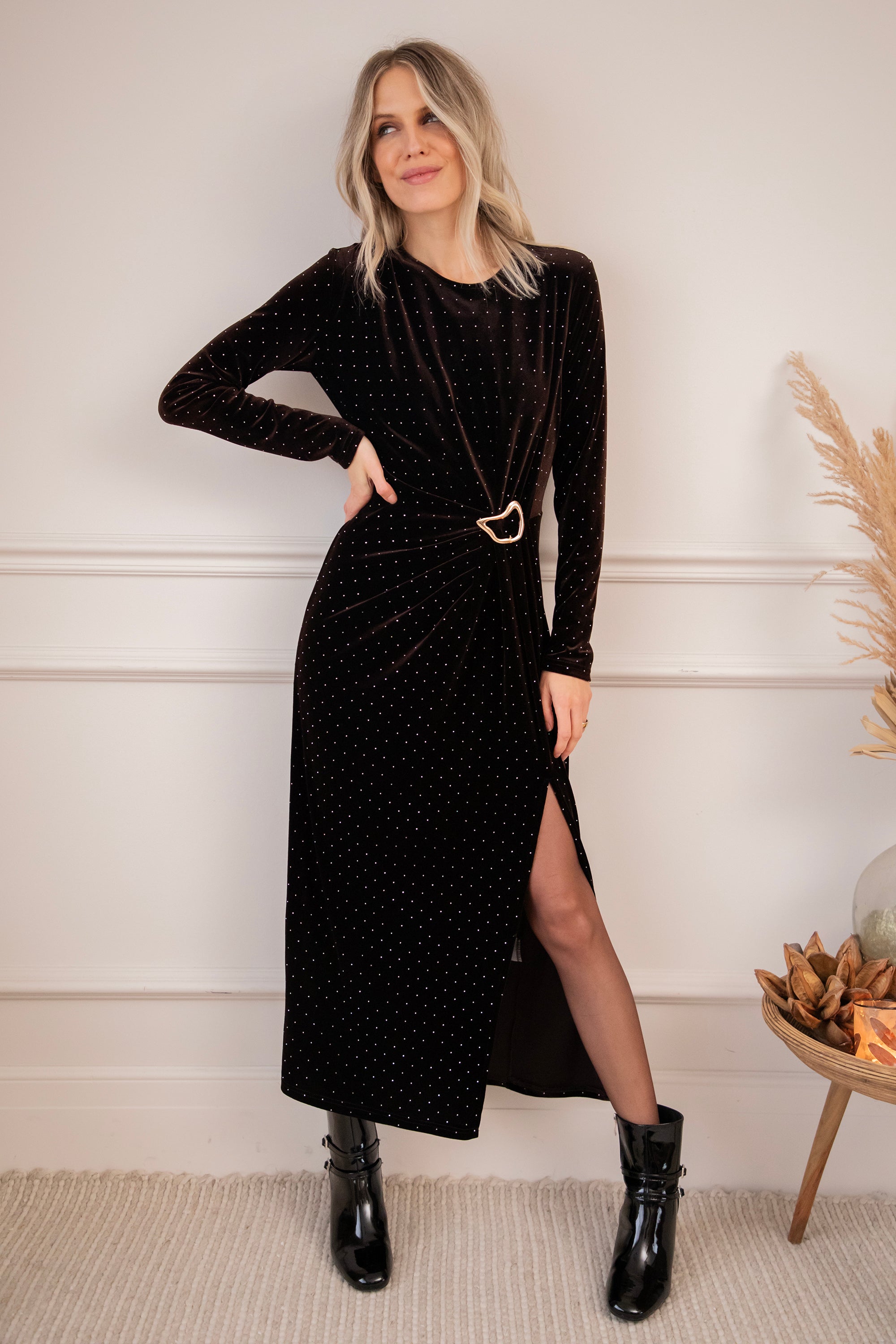 En dan dat gouden juweeldetail… echt de kers op de taart! Zo feestelijk, zo chic ⭐️ Het hoge splitdetail maakt de look helemaal af: romantisch, vrouwelijk en just a little bit sexy!