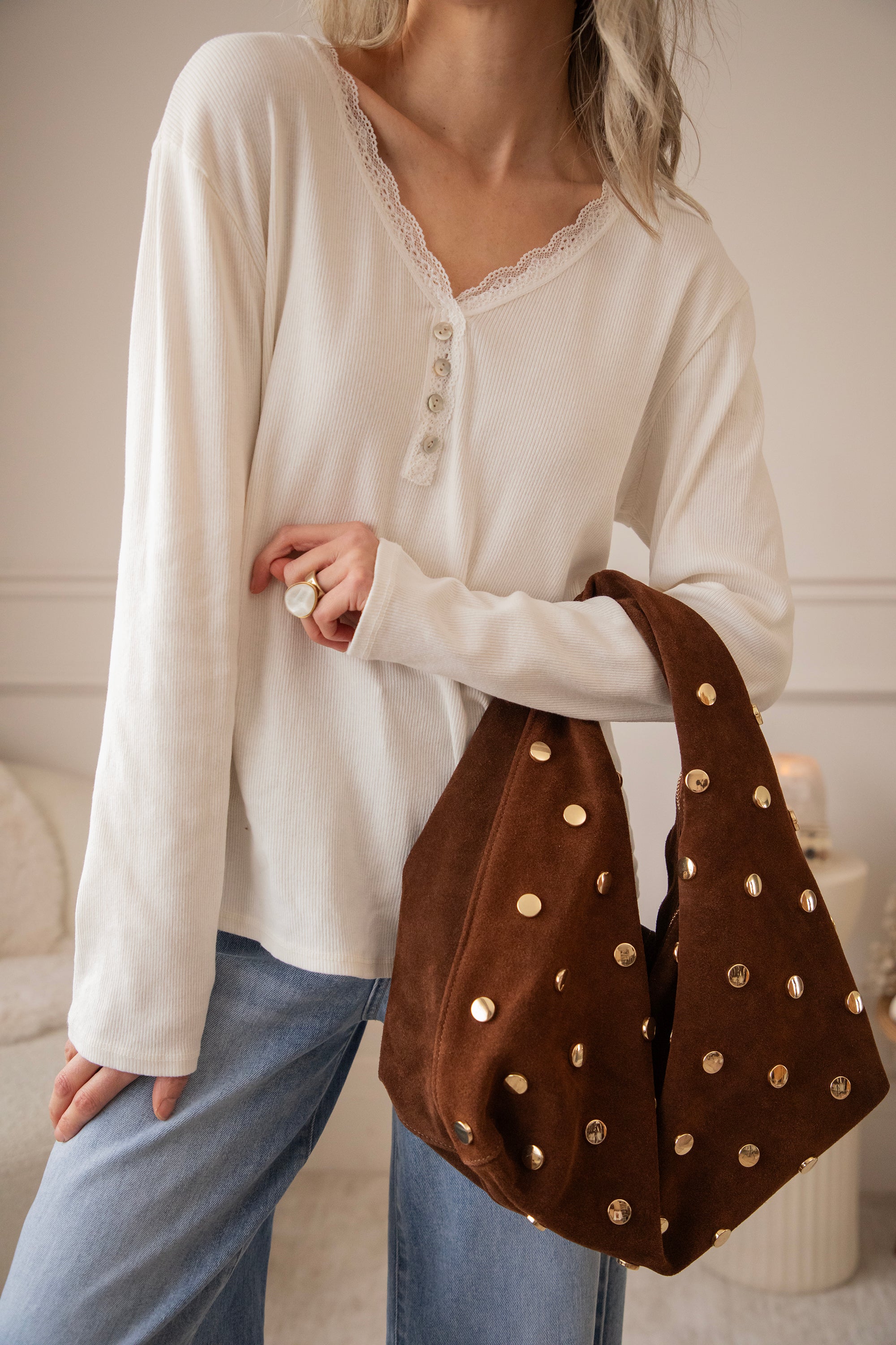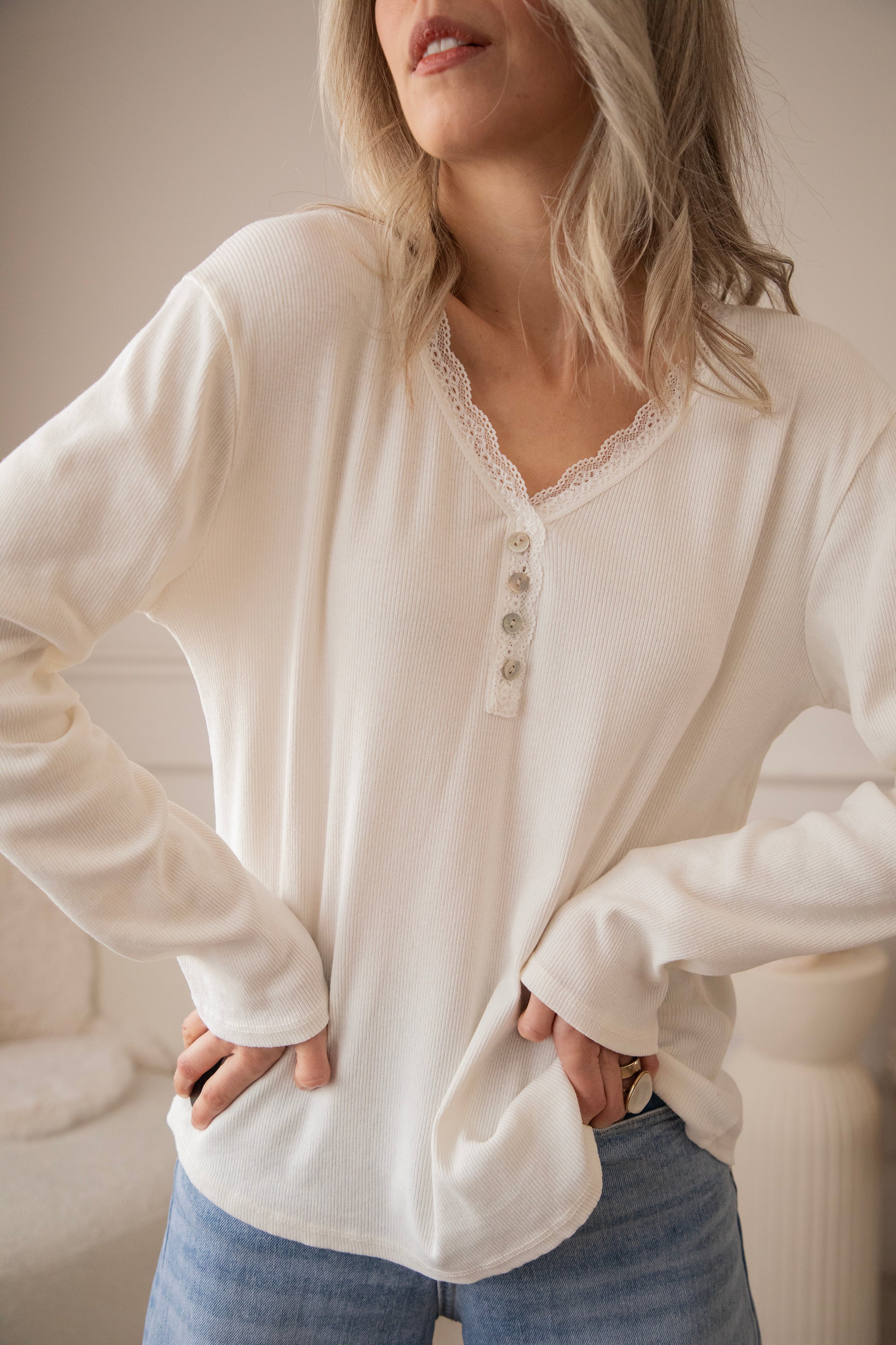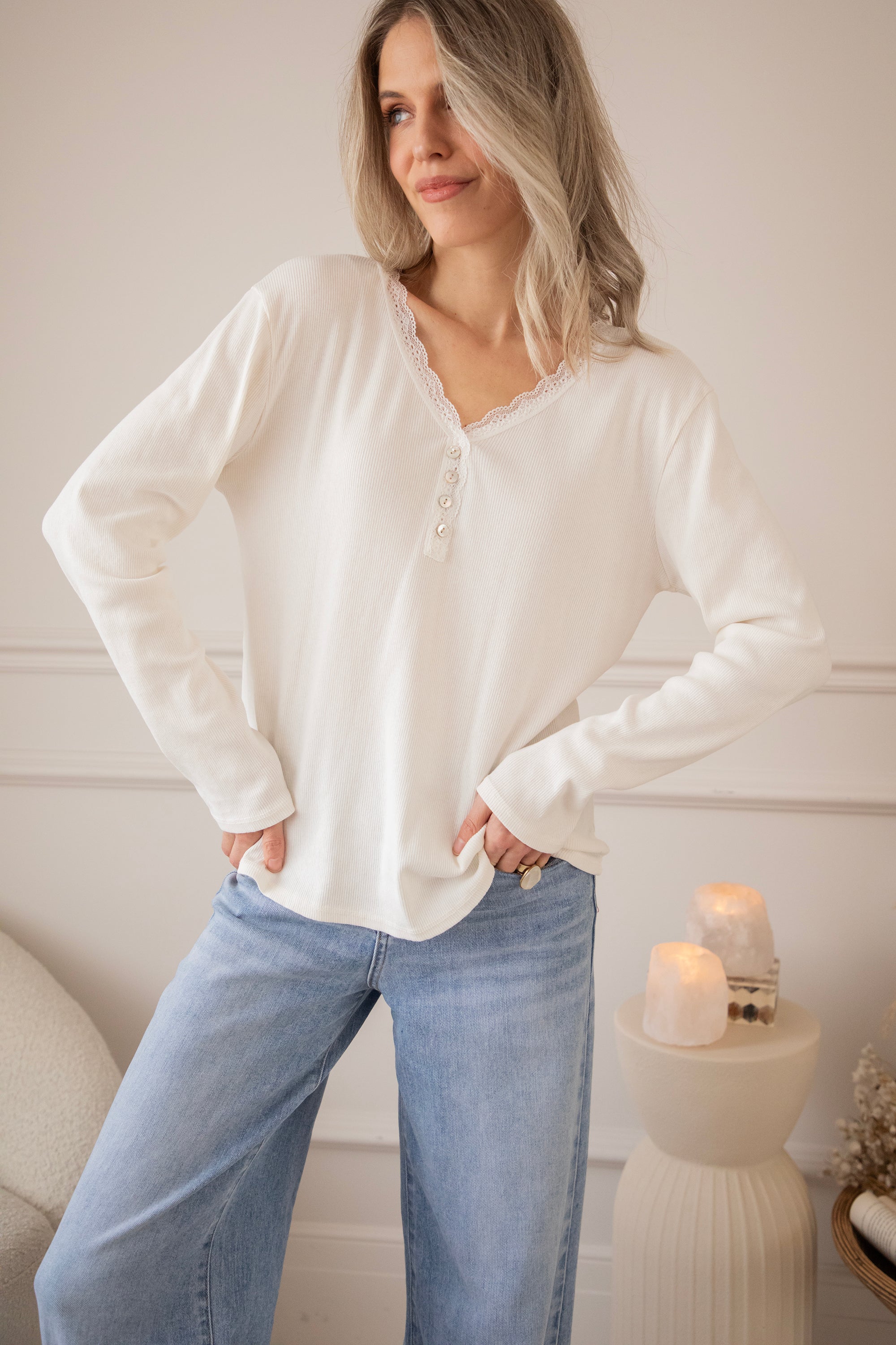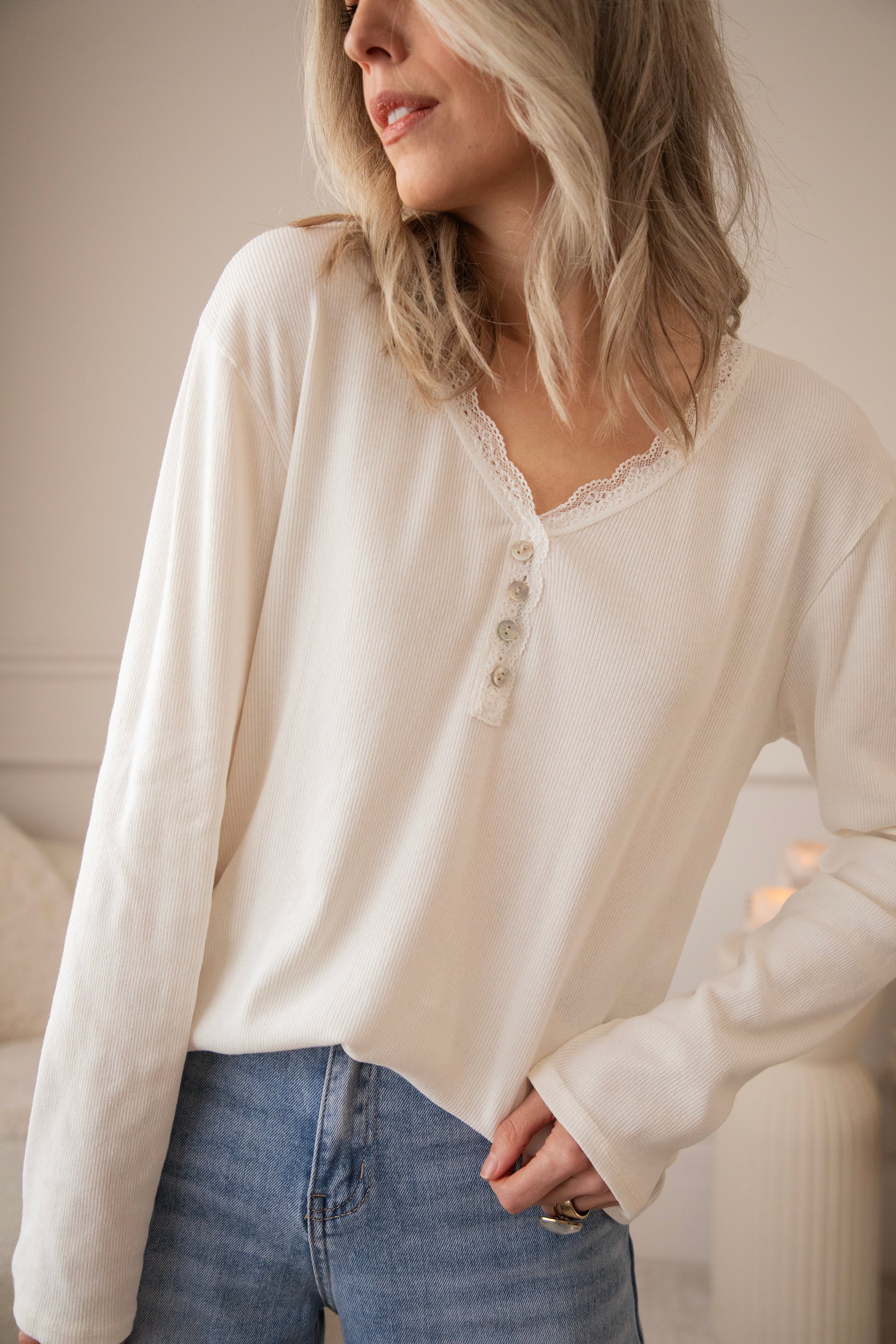 Het nieuwe seizoen begin ik graag met heel wat goede basics waaronder longsleeves met leuke details! Die je eindeloos kan combineren en nog heel lang kan doordragen. Rosie Lou is zo'n fijn ribgrebreid modelletje die soepel en los valt. De kanten halsrand en de parelmoeren knoopjes voegen een girly accentje toe 🎀