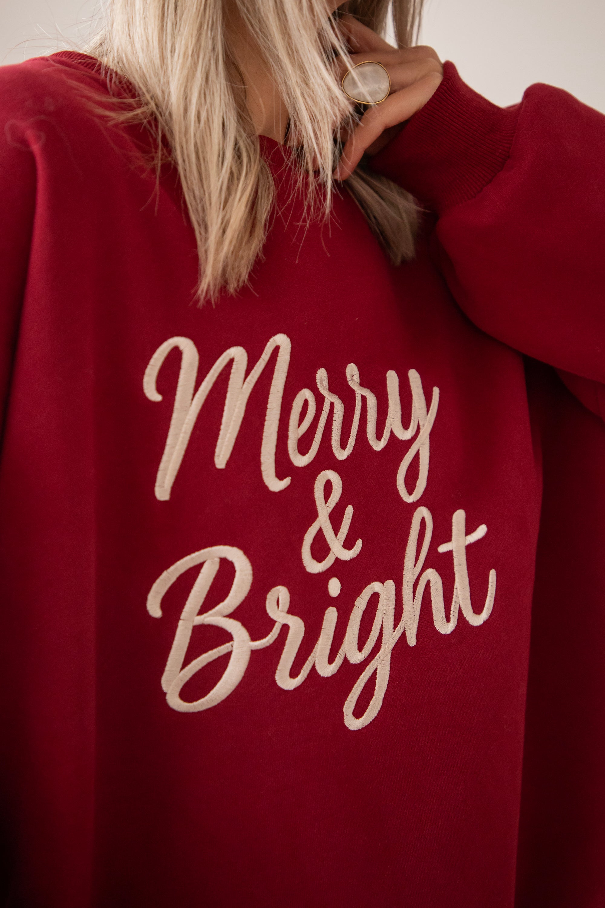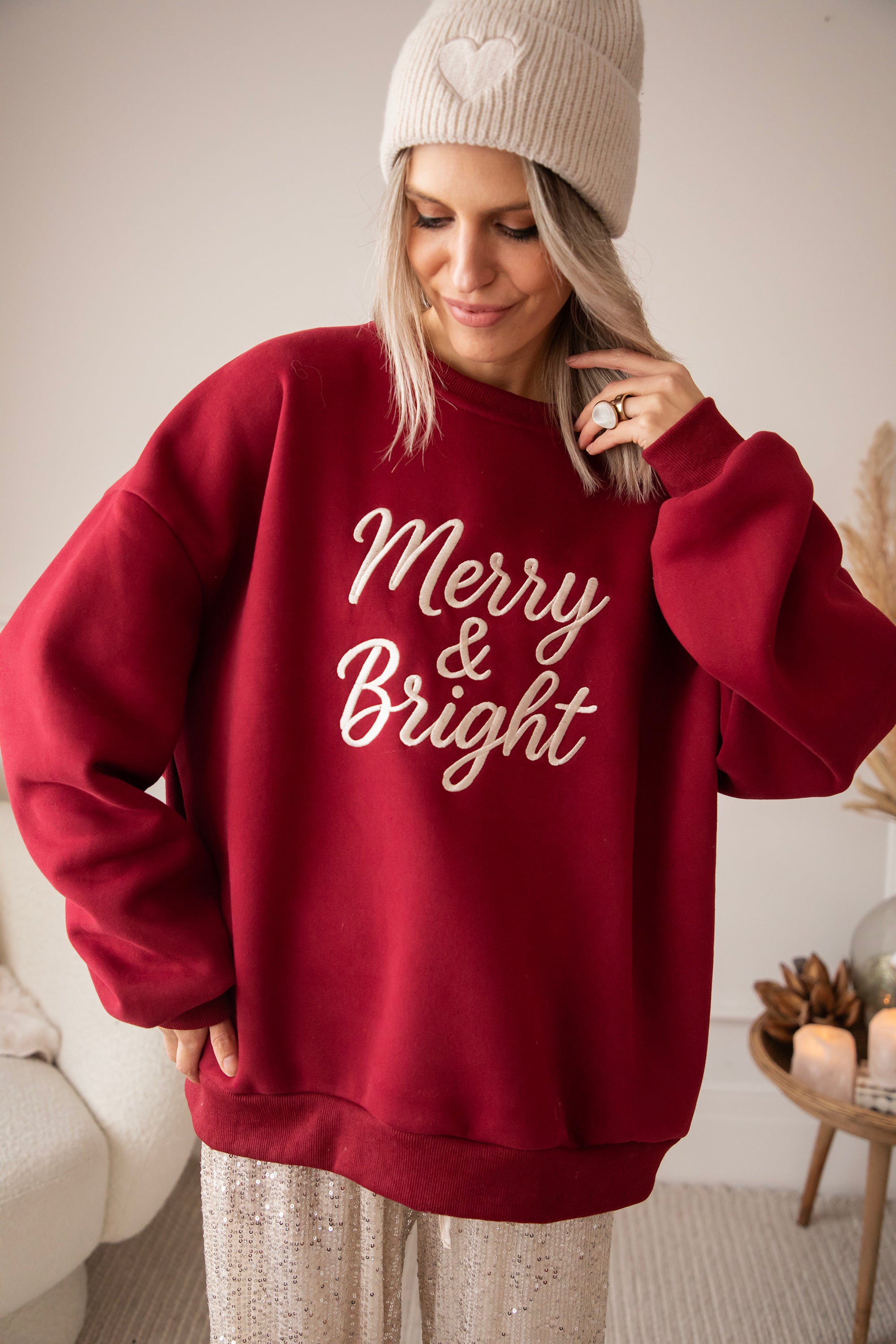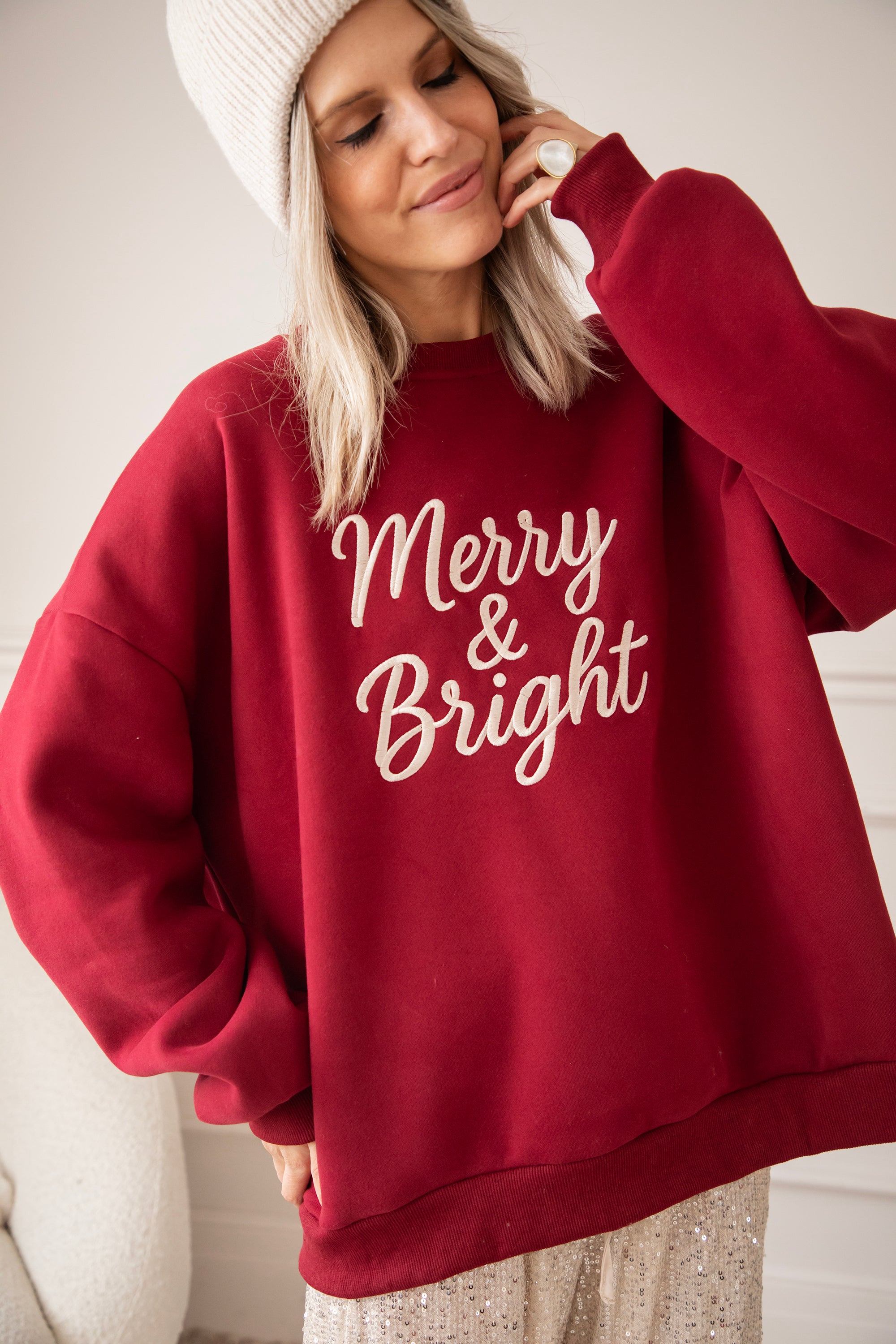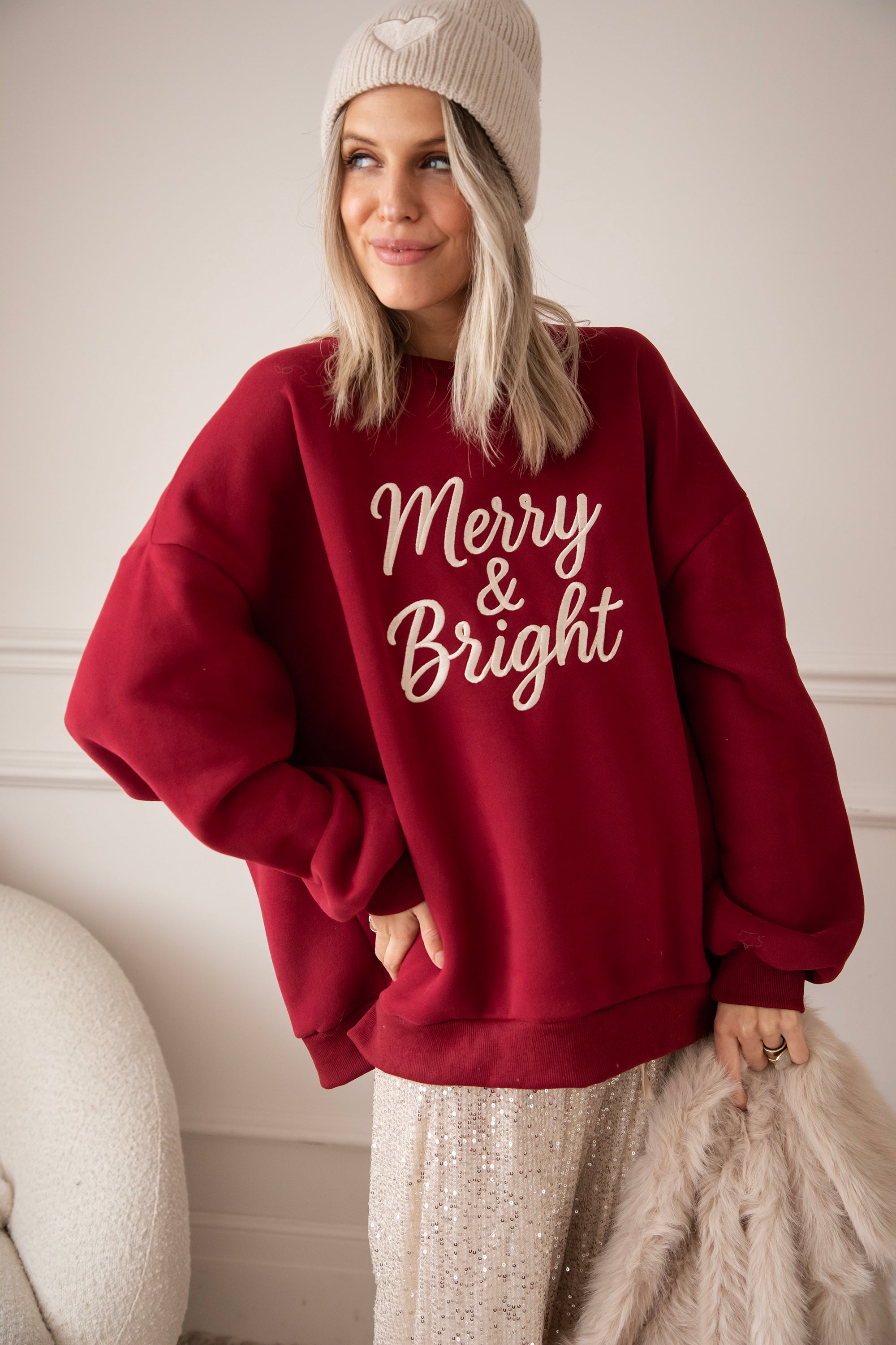 In het midden staat ‘Merry & Bright’ in een dikker, schuingeschreven lettertype: speels, cozy en helemaal holiday-ready! Zeker in combinatie met de bordeaux kleur van de sweater ❤️