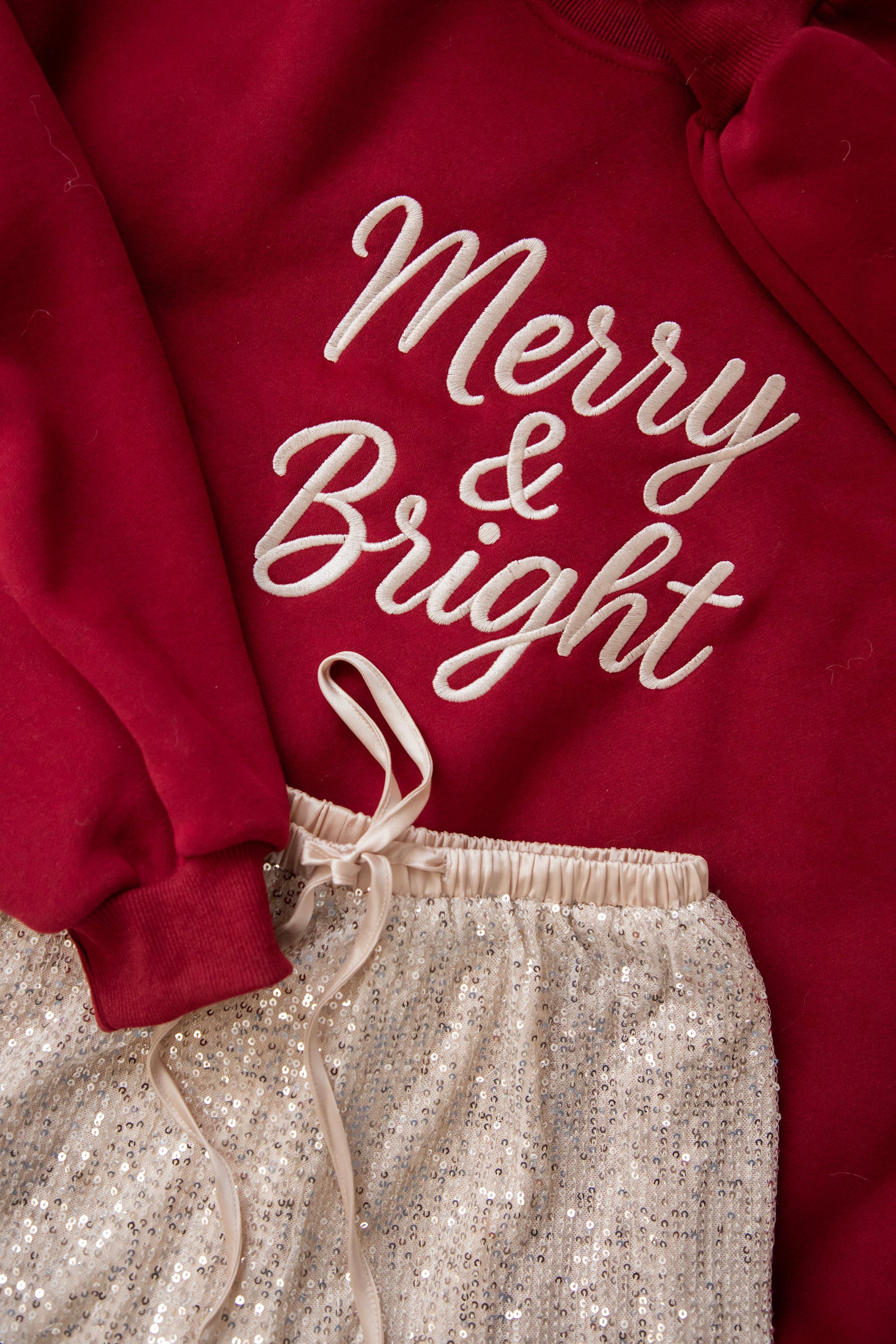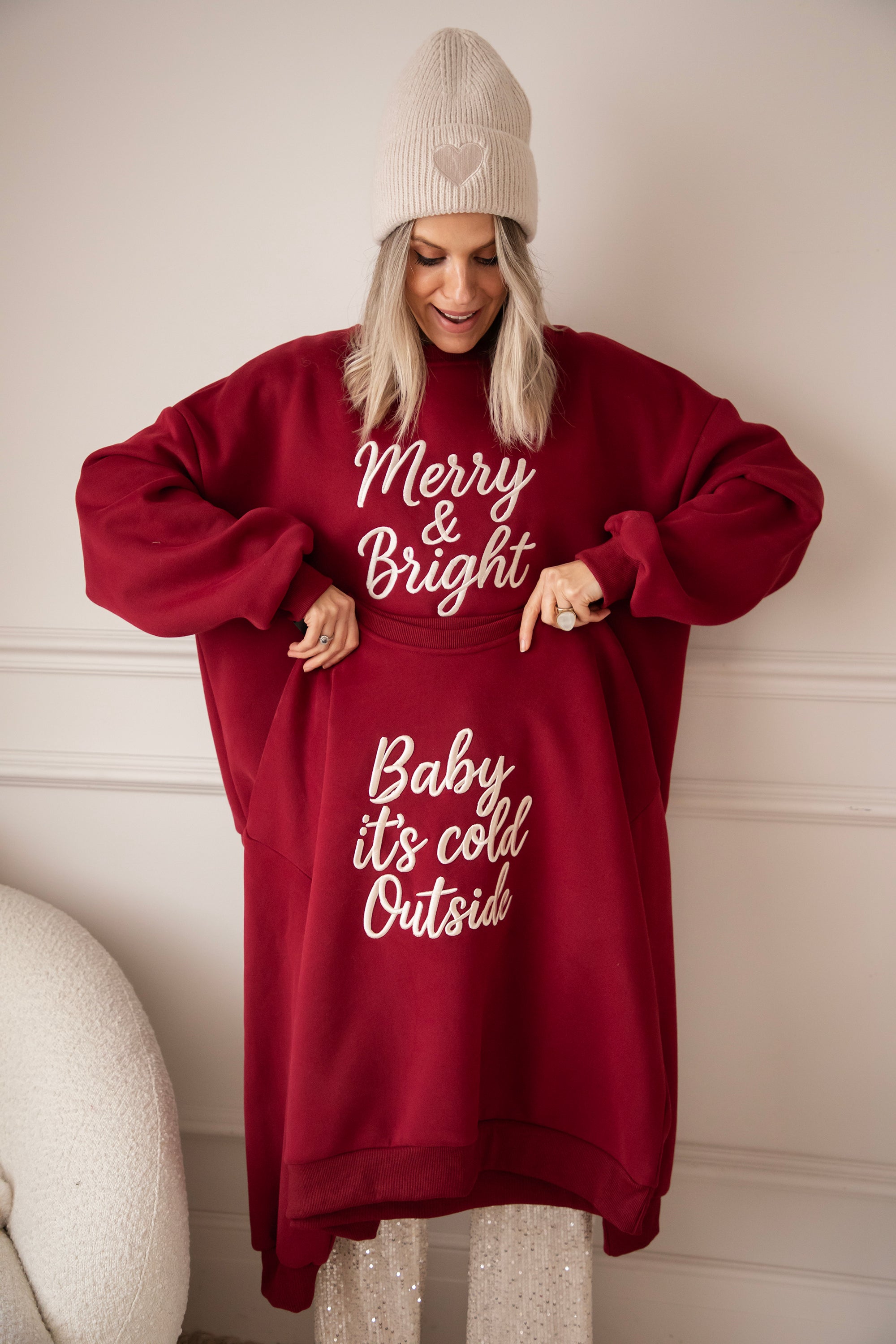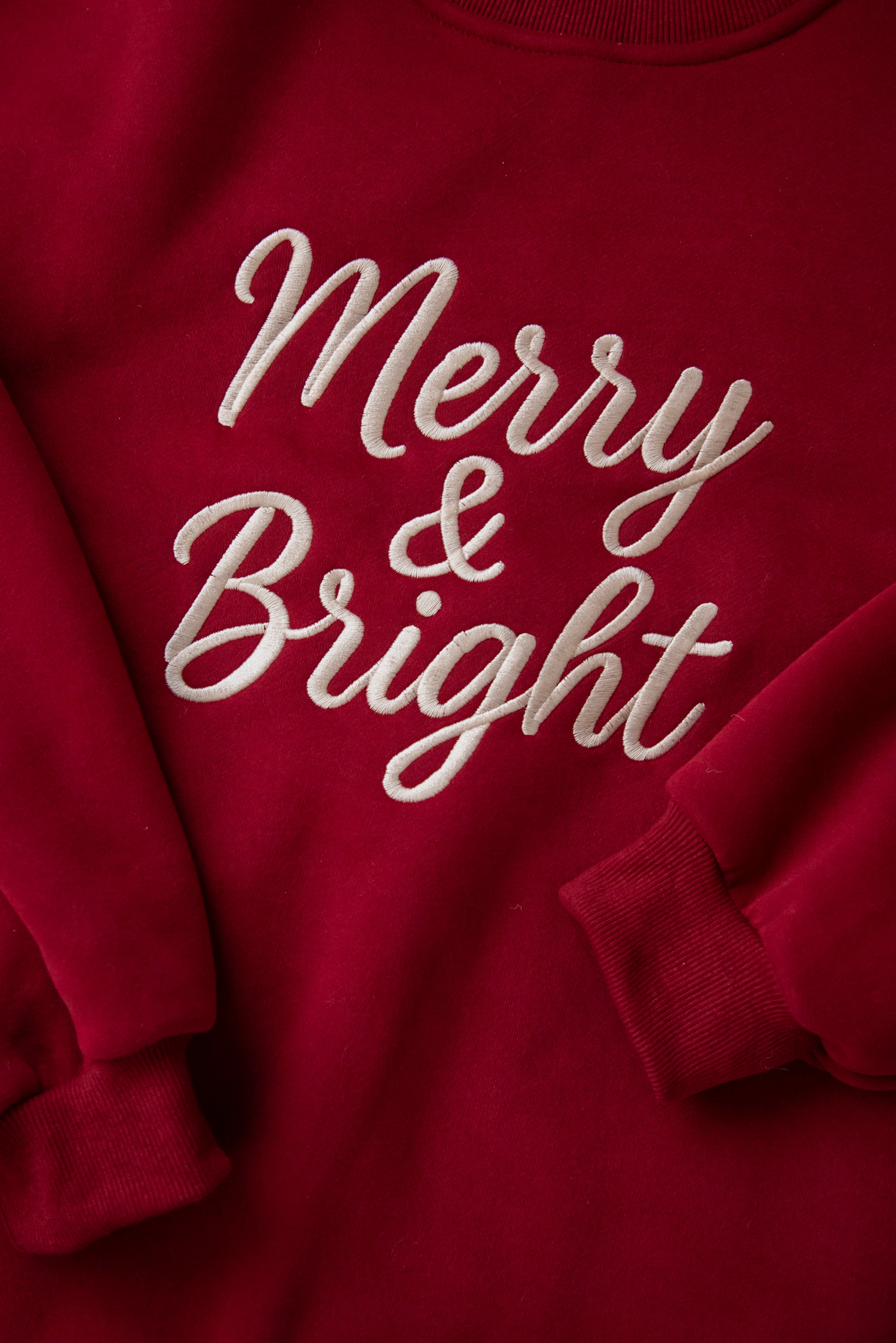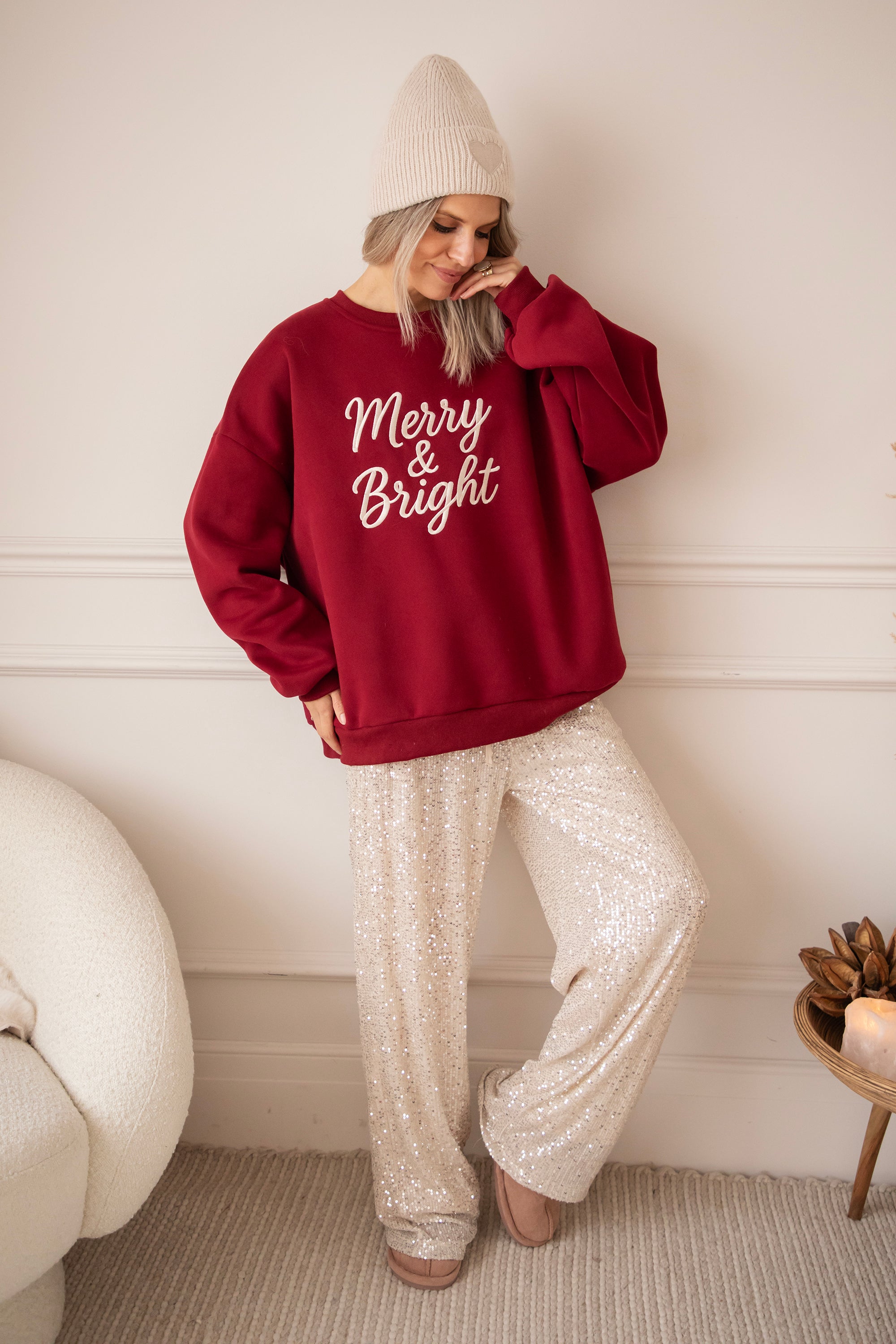 In het midden staat ‘Merry & Bright’ in een dikker, schuingeschreven lettertype: speels, cozy en helemaal holiday-ready! Zeker in combinatie met de bordeaux kleur van de sweater ❤️