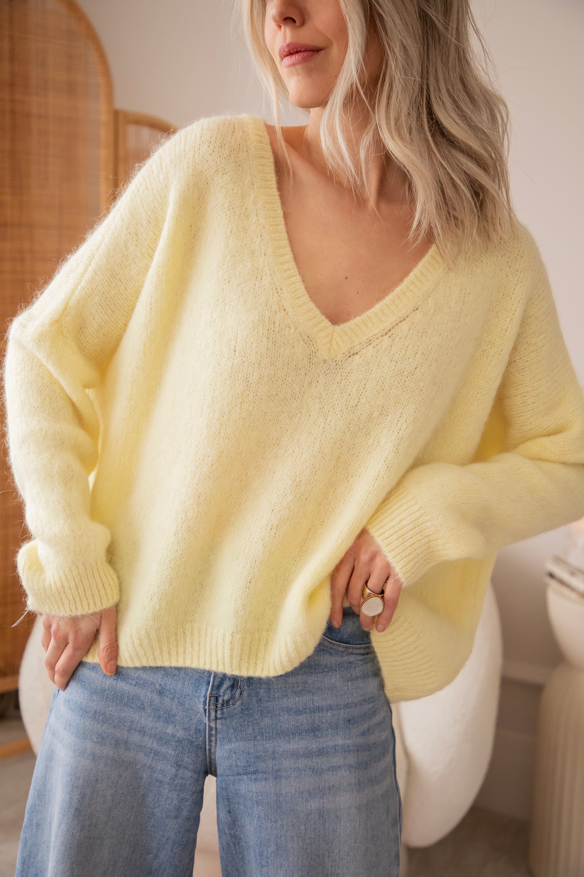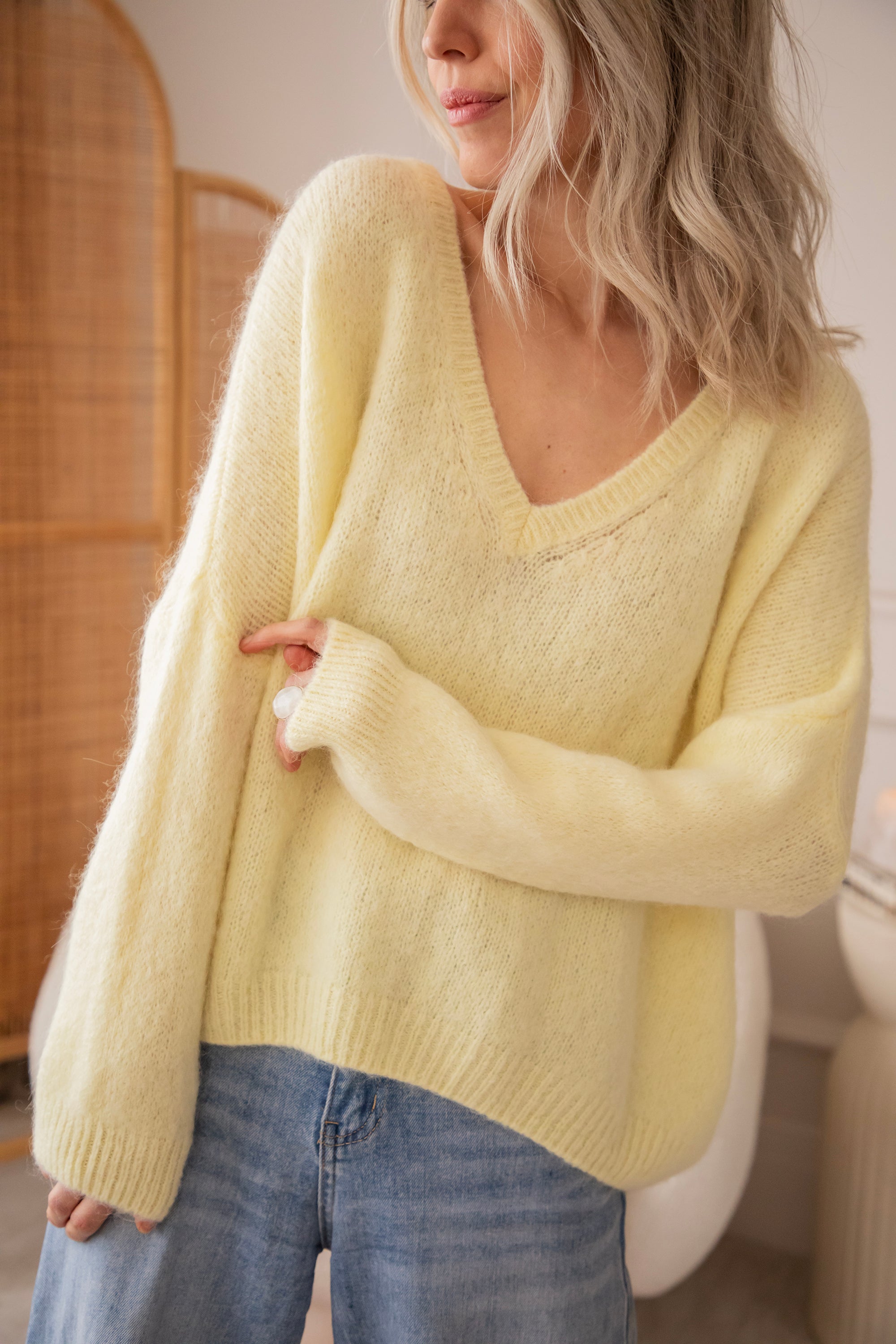 De V-hals geeft haar een frisse, luchtige uitstraling en maakt haar net dat tikkeltje vrouwelijker. En ja… we hebben duidelijk een zwak voor losse, zachte knitjes in lieve lentekleuren hihi 🌿