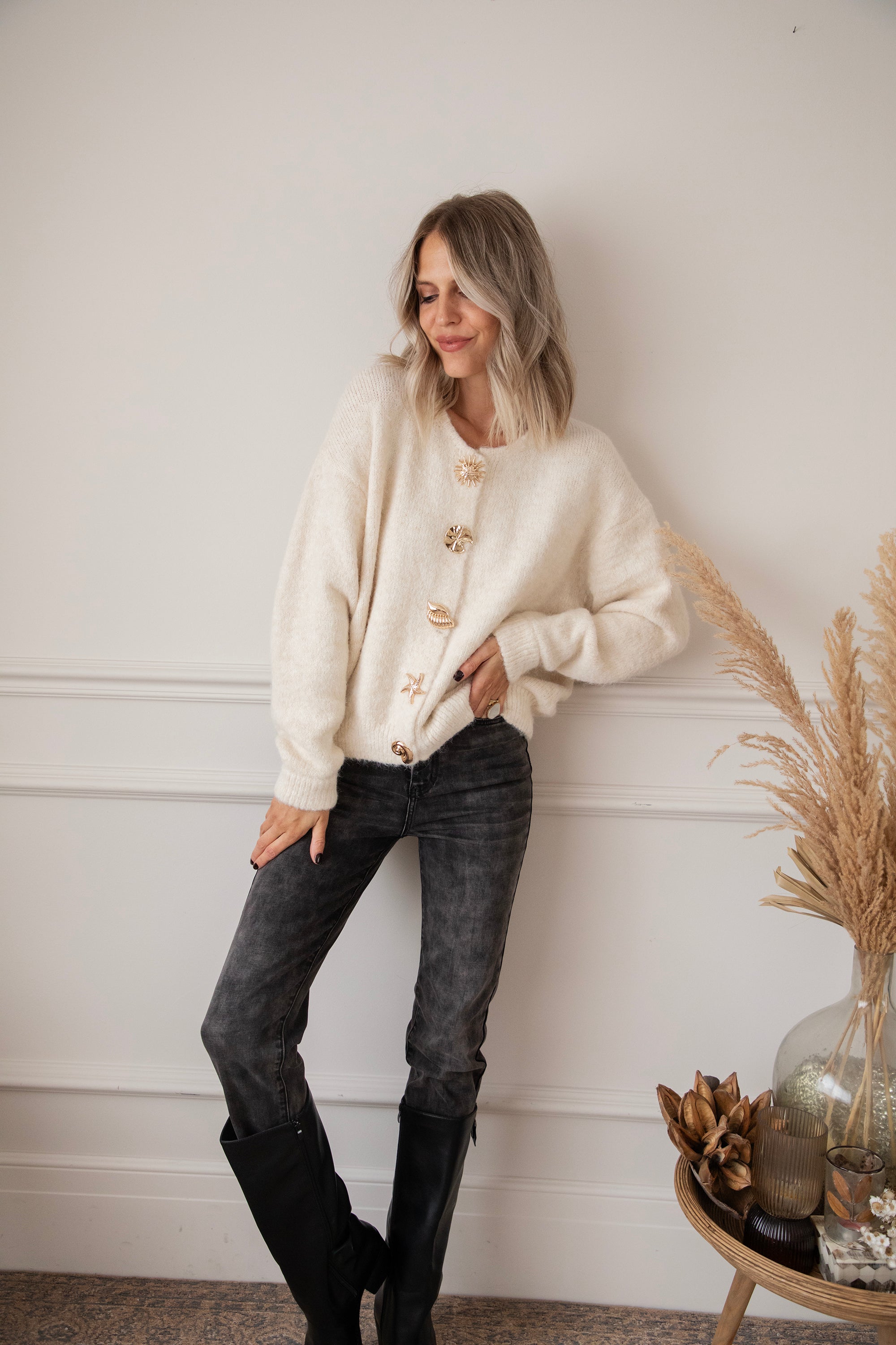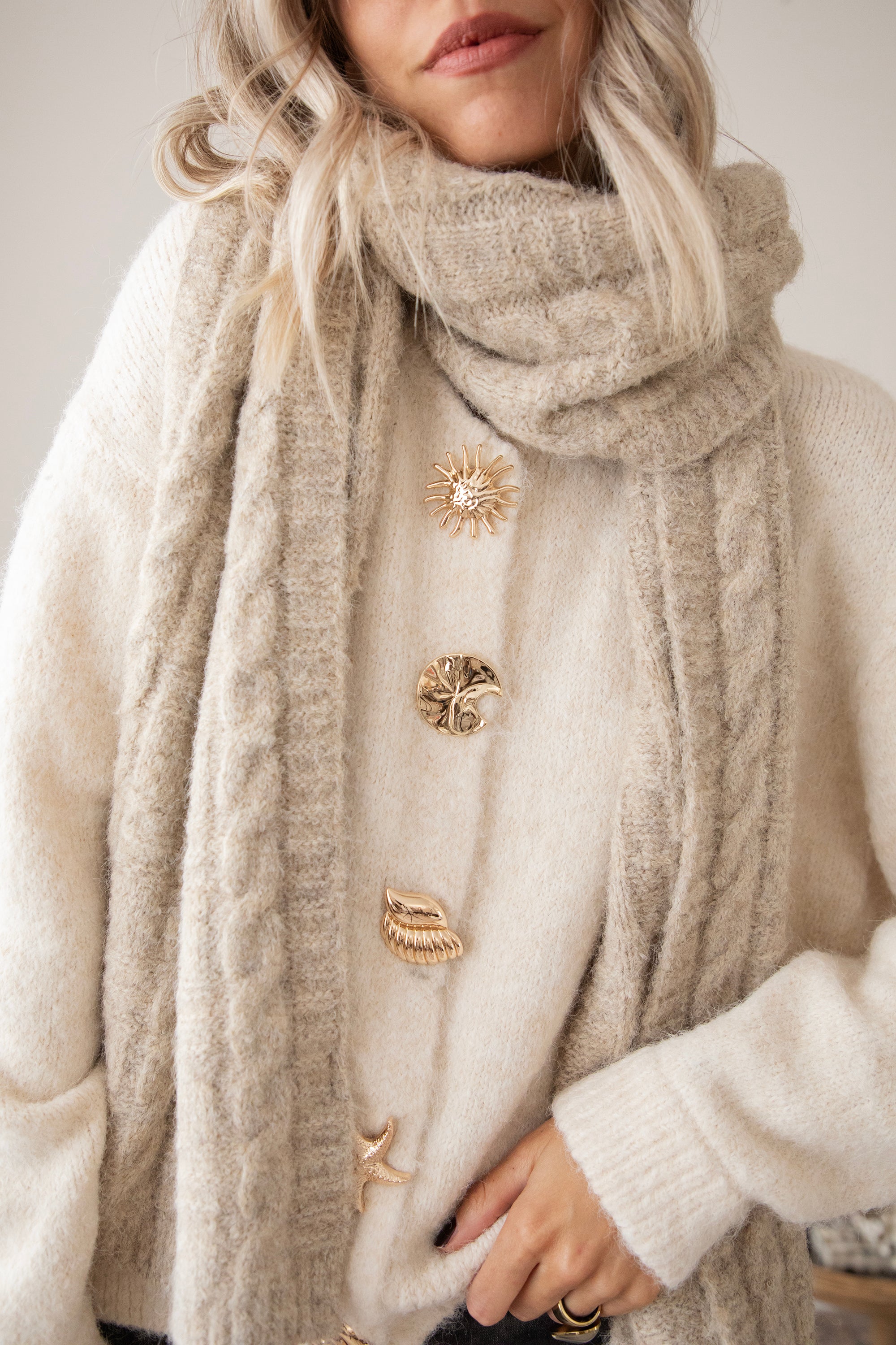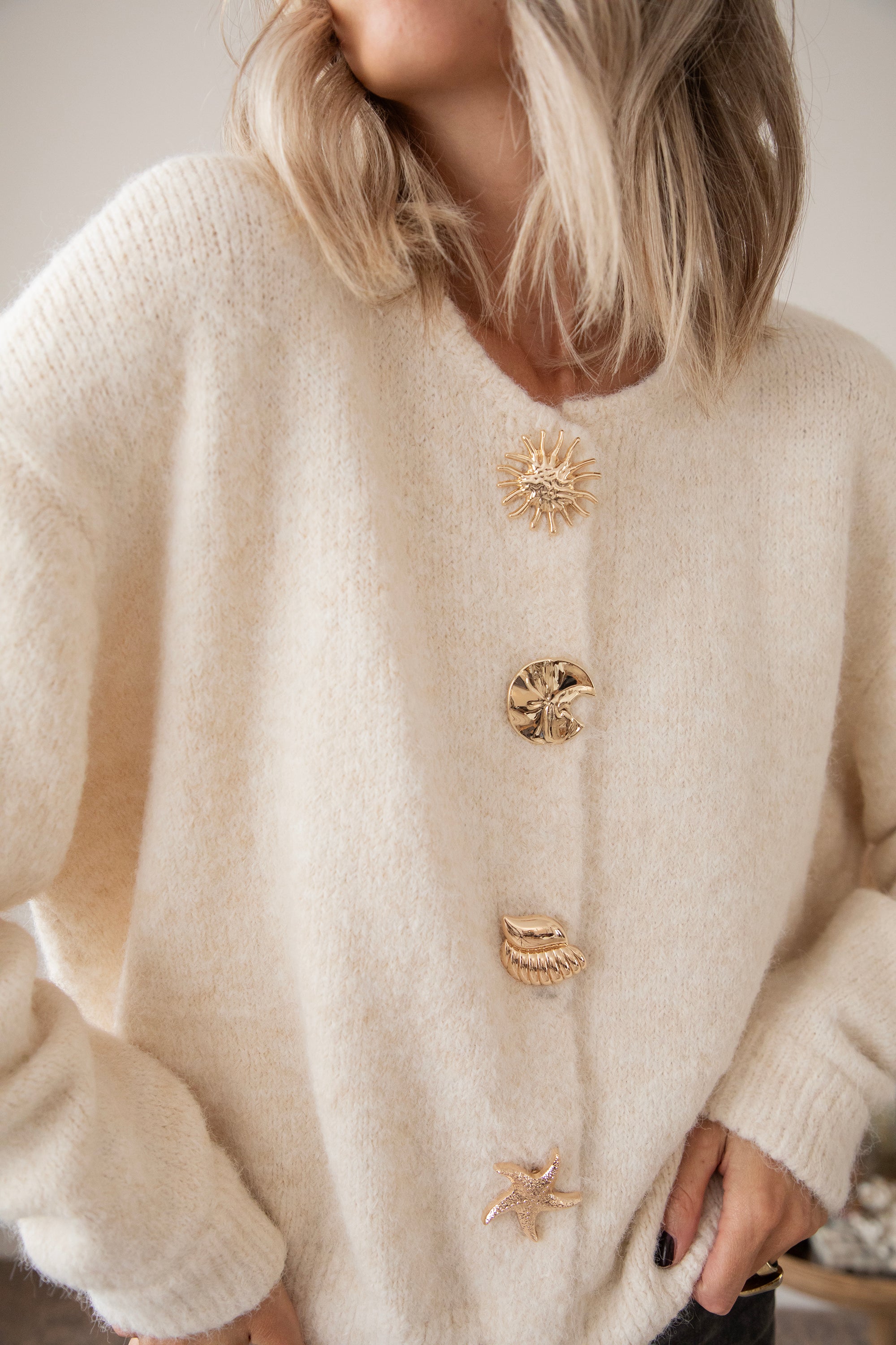 Tya Treasure is een knus pareltje uit de collectie ✨ Wat ik zo leuk vind aan dit vest zijn de knopen: kleine gouden schatten uit de zee, zoals een schelpje en een zeester ⚓️ Mij doen deze knopen meteen terugdenken aan die rustige, zachte dagen die we aan zee hebben gehad met het gezin! So dreamy & cozy 🌊