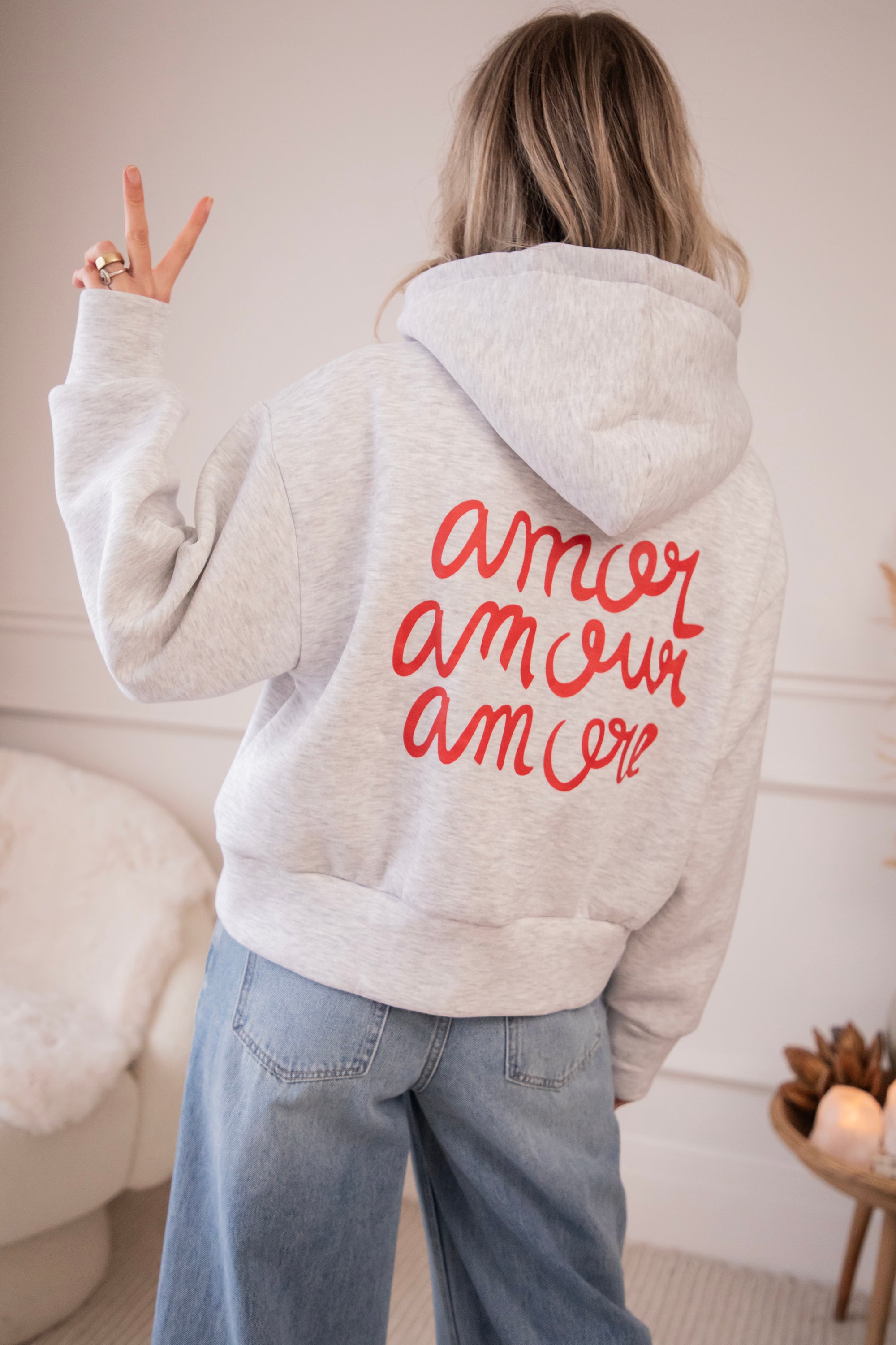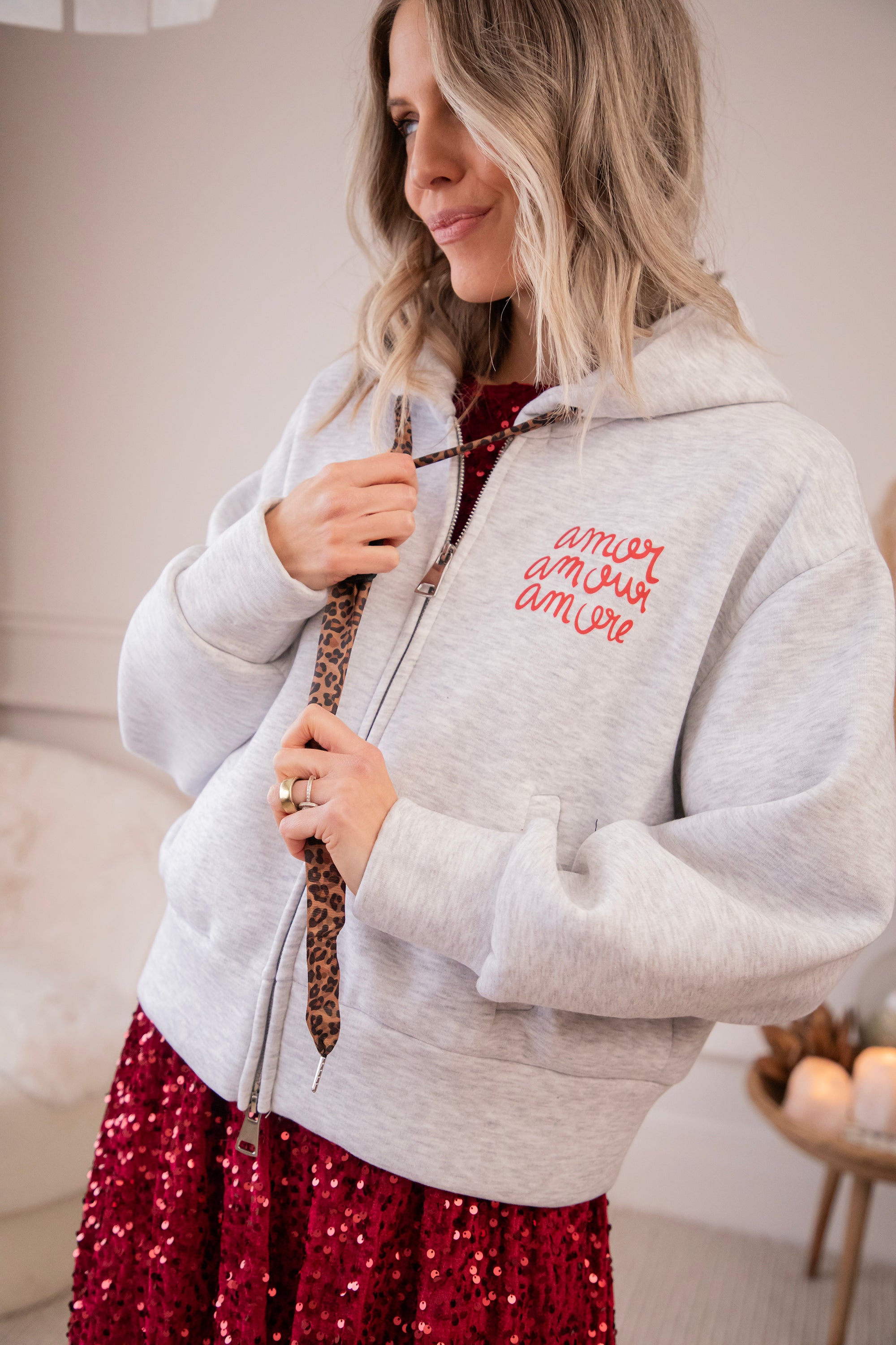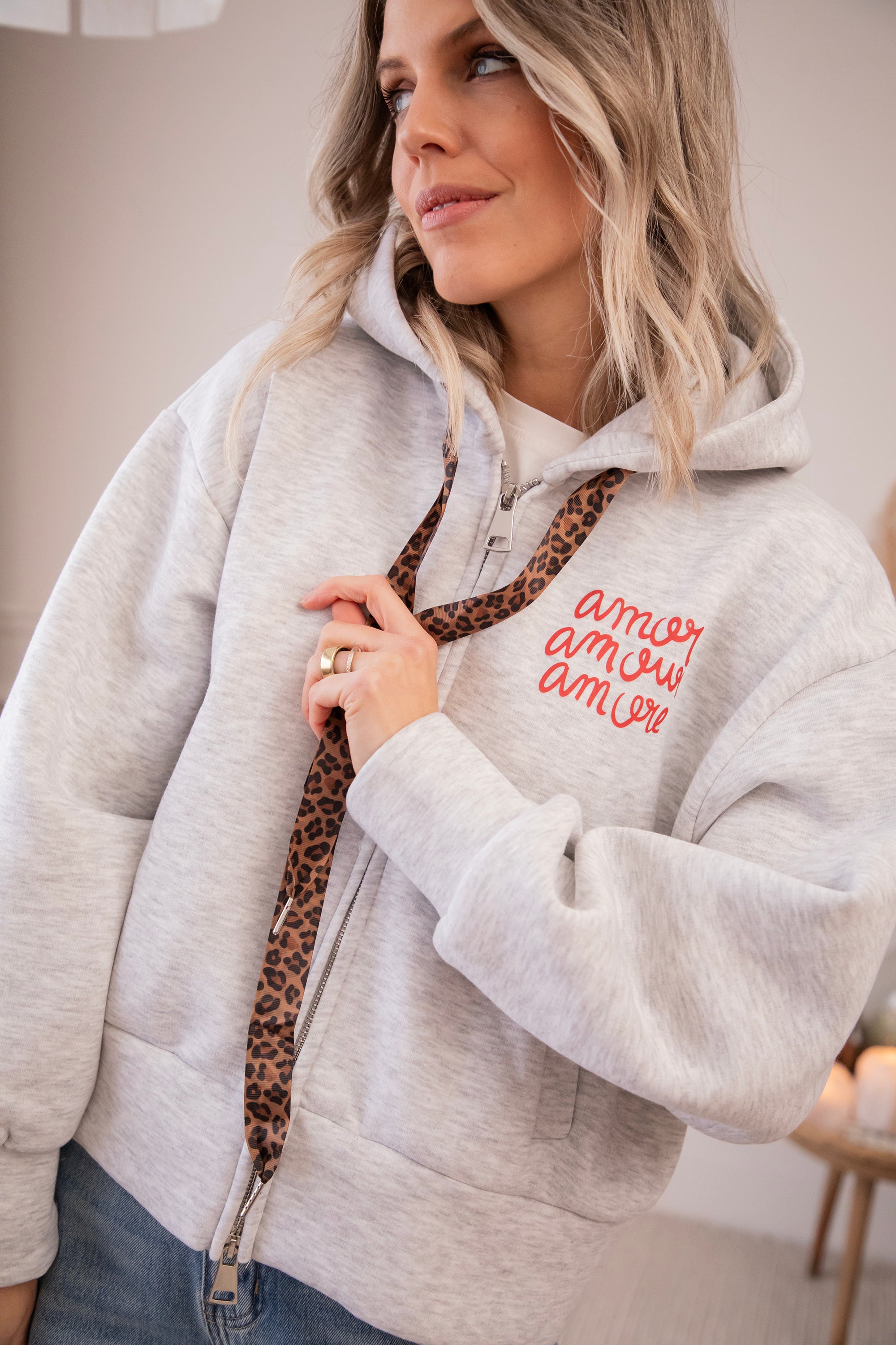 Een cozy kap, leopard koordjes enĀ amour in knalrode letters op de borst Ć©n op de rug⦠Super vet! Love & leopard in one piece = š„