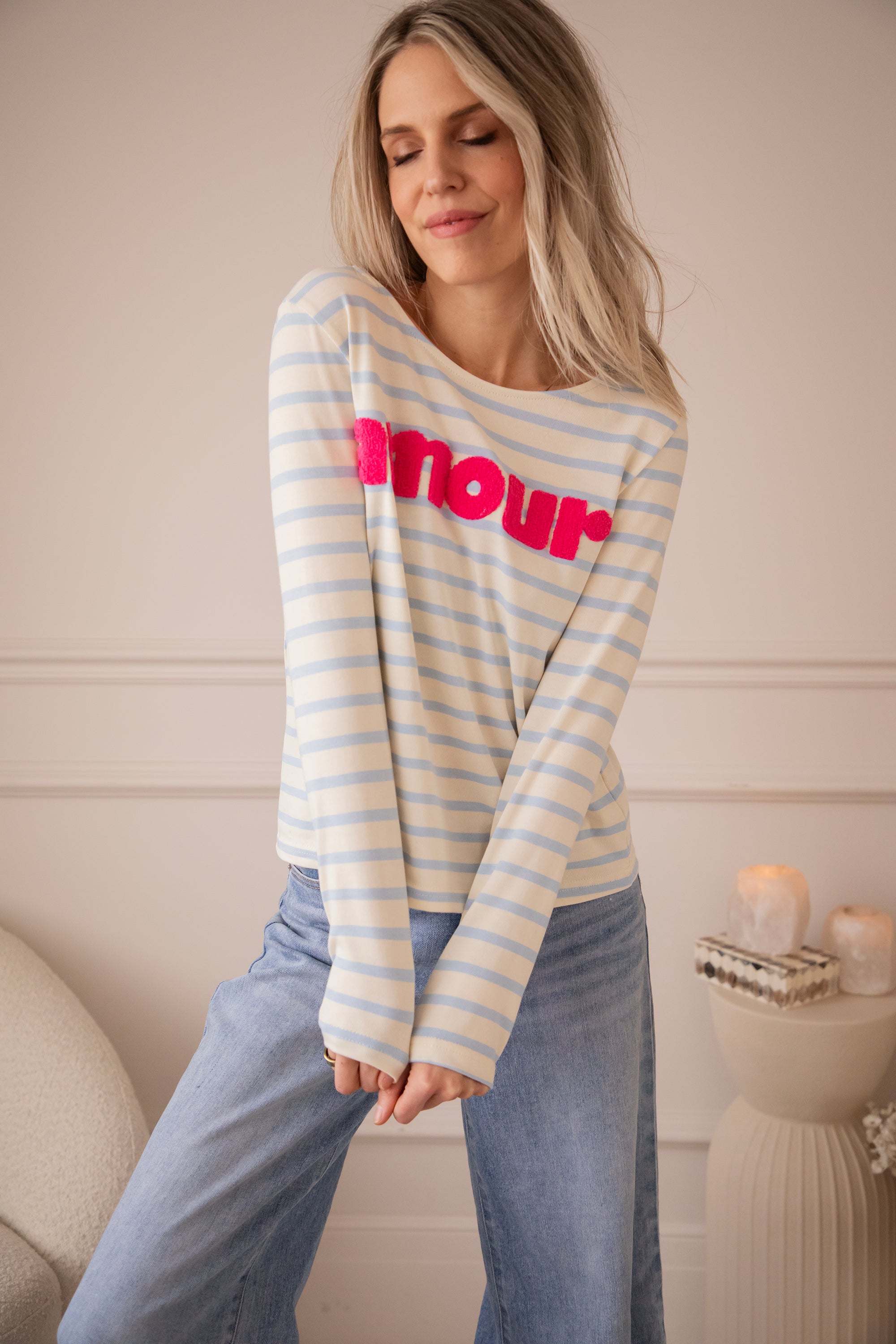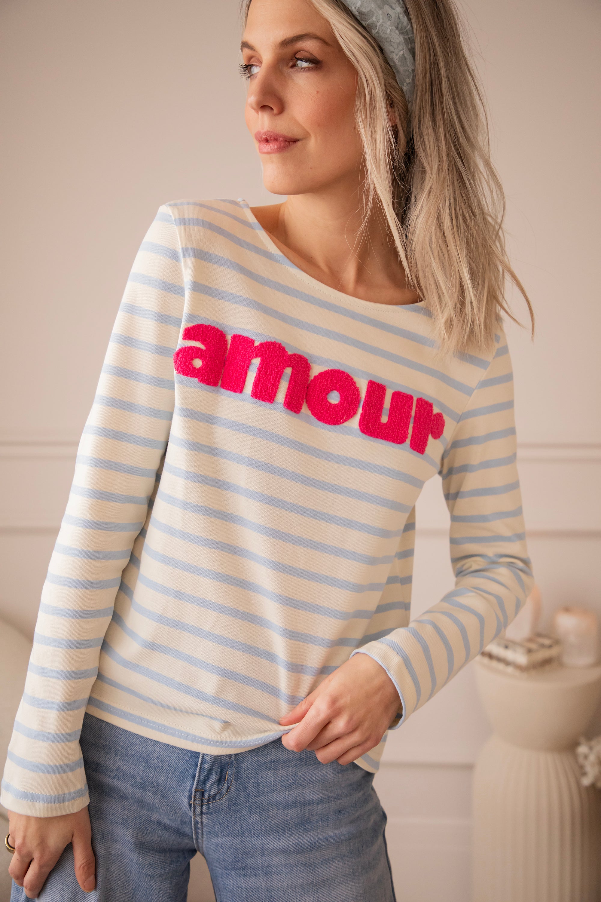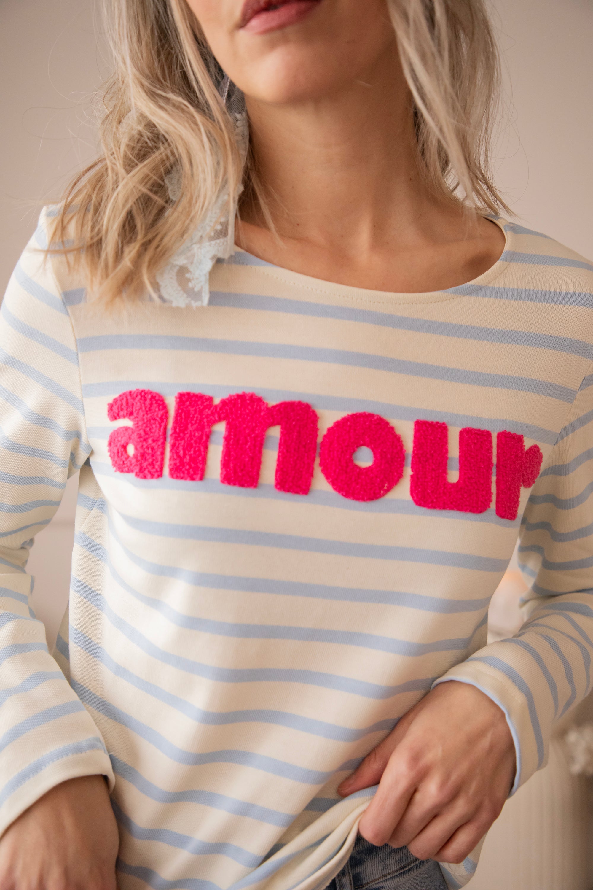 Deze herken je vast, ladies! Amour Stripes is al lang een vaste waarde in onze shop - van T-shirts tot sweaters en longsleeves, stuk voor stuk echte blijvers om van te houden 🥰De baby blue strepen vormen een frisse, zachte basis, terwijl het fuchsia ‘amour’ logo er speels en vrolijk uitspringt 🩷 Echt zo’n combo die meteen opvalt!