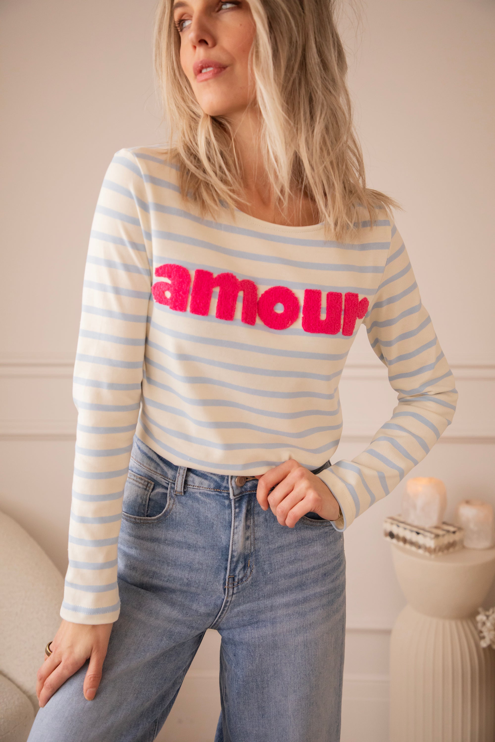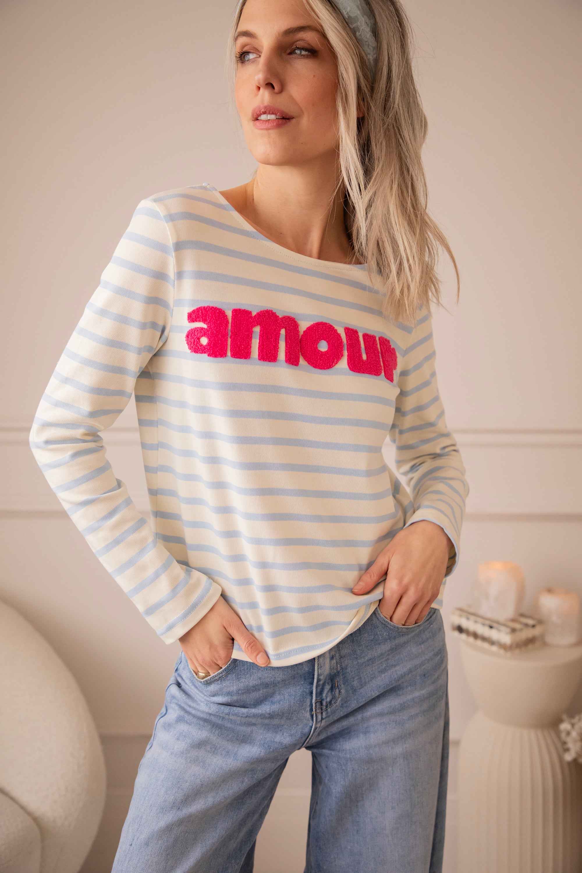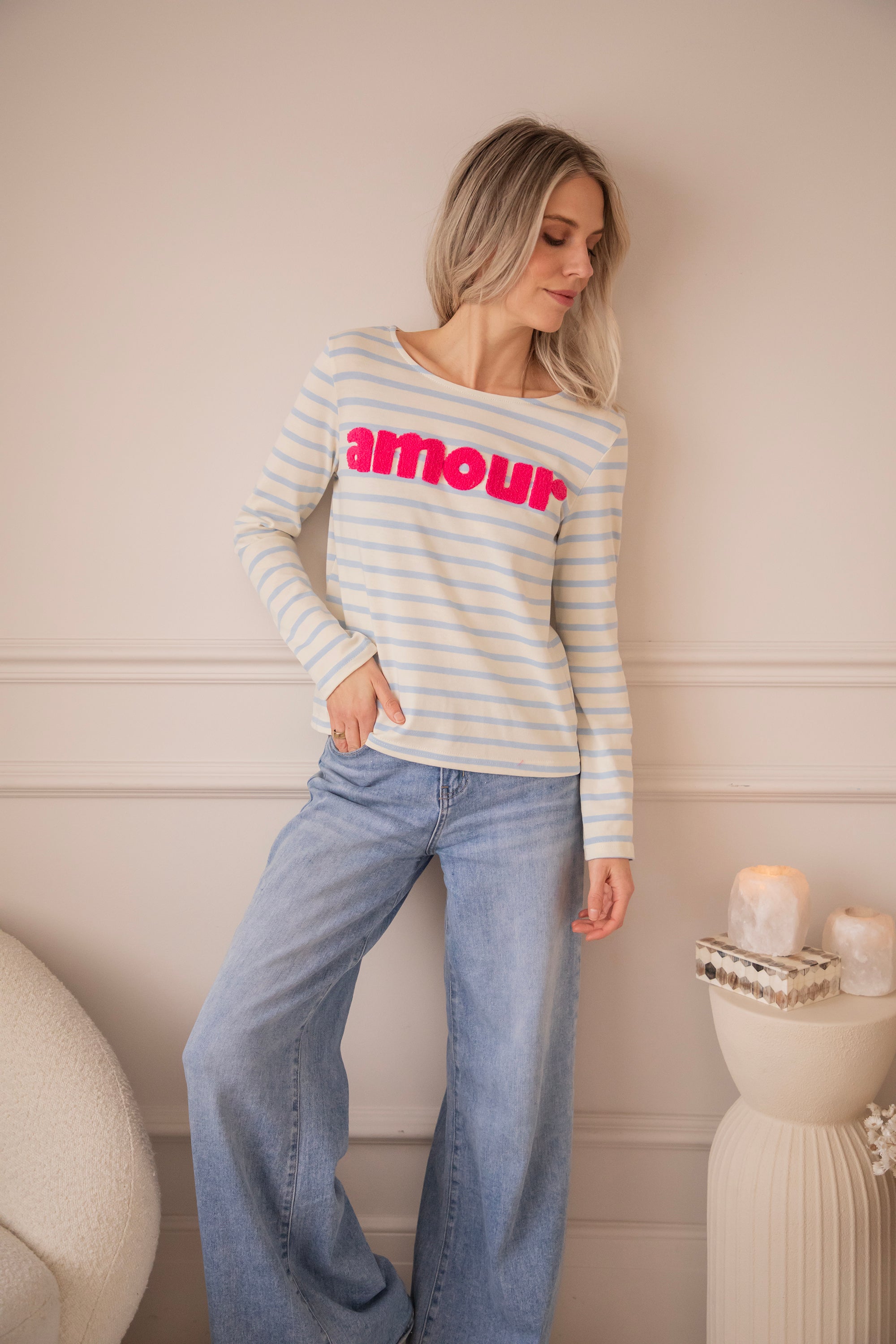Deze herken je vast, ladies! Amour Stripes is al lang een vaste waarde in onze shop - van T-shirts tot sweaters en longsleeves, stuk voor stuk echte blijvers om van te houden 🥰De baby blue strepen vormen een frisse, zachte basis, terwijl het fuchsia ‘amour’ logo er speels en vrolijk uitspringt 🩷 Echt zo’n combo die meteen opvalt!