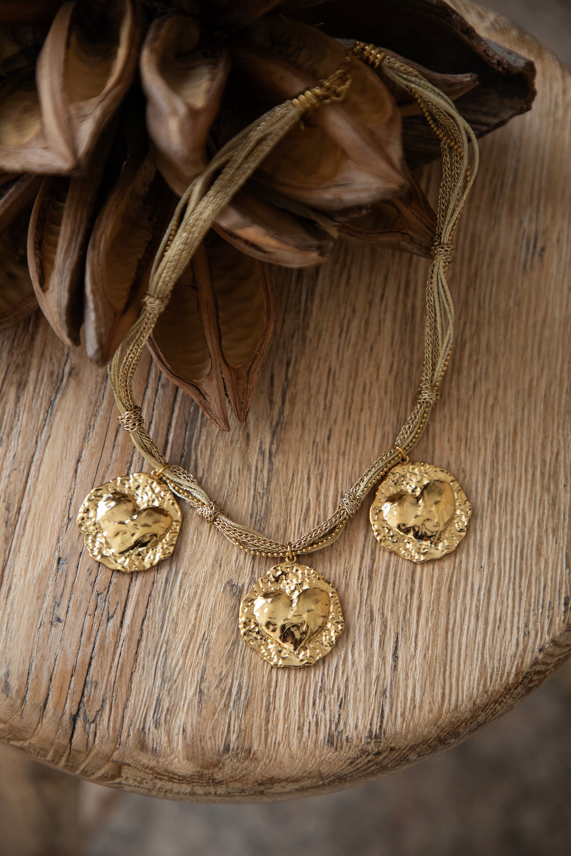 De ketting heeft gouden amulets met schattige hartjes erin verwerkt en dankzij de handmade look krijgt hij meteen dat coole, unieke karakter 🫶