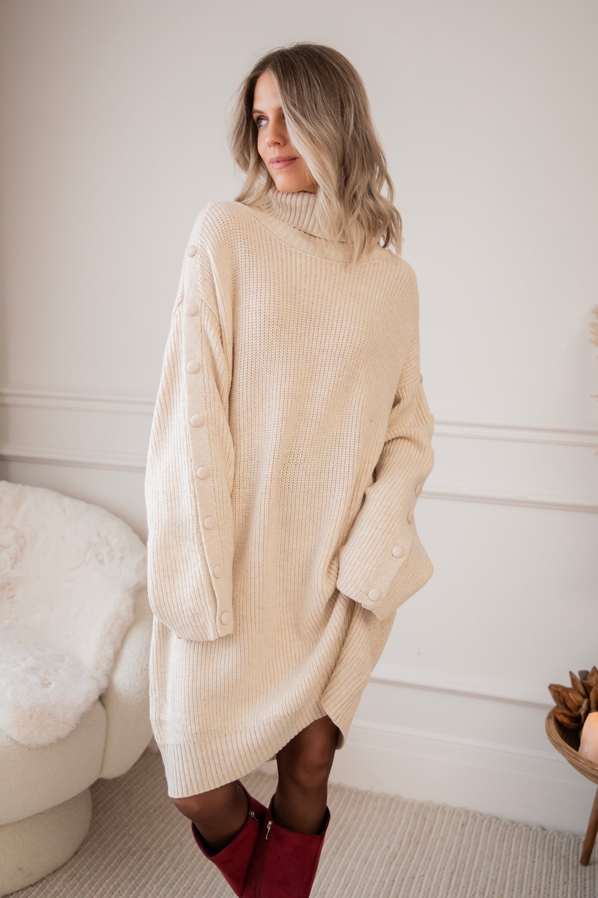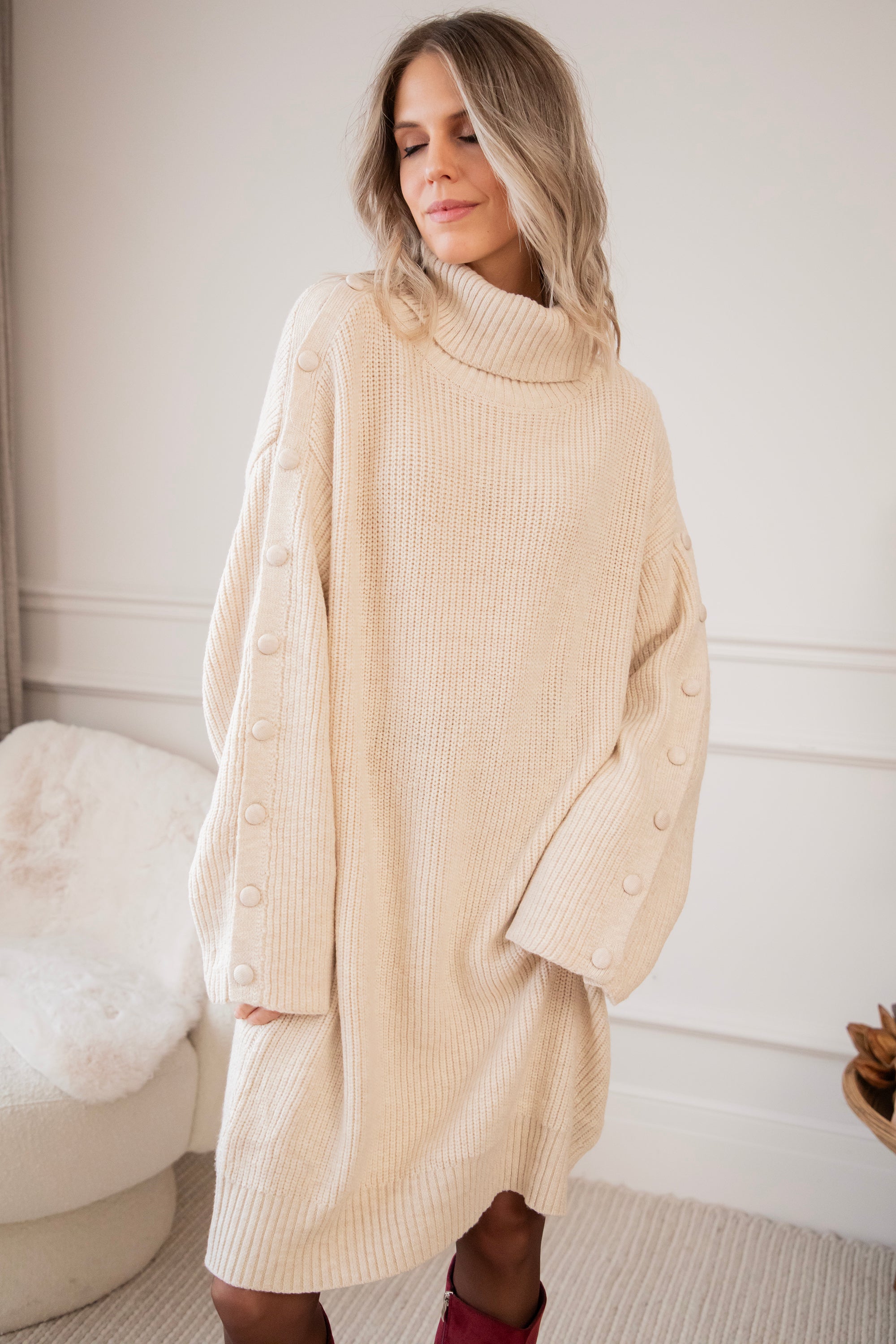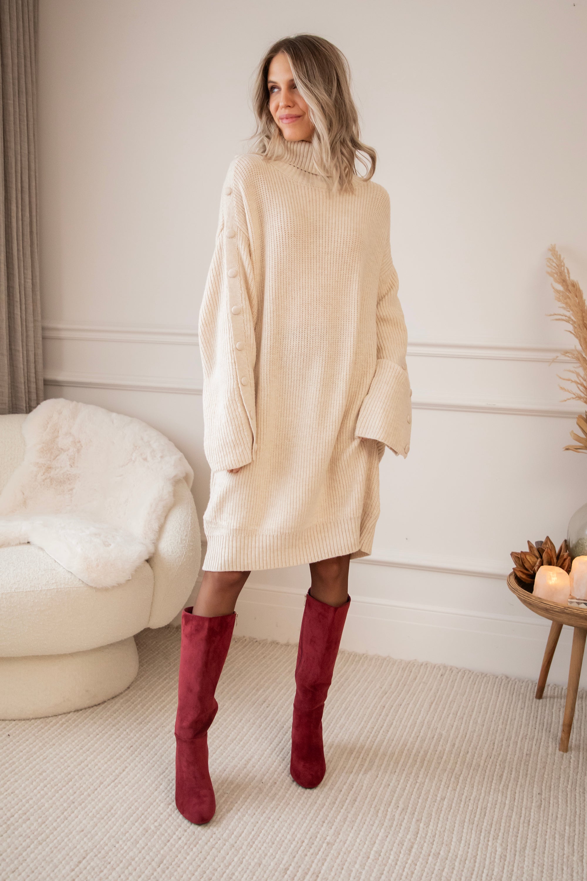 Sweater dress obsessionnn! 🔥 Een los, comfy modelletje waarbij dit keer de mouwen in de spotlight staan. Ze zijn zo prachtig afgewerkt met een rijtje gestoffeerde ronde knopen! 😍 Het breiwerk voelt heerlijk warm aan, rekt mooi mee en dan… die rolkraag! Ik vind dat zo’n pluspunt bij sweater dresses. Instant cozy vibes 🎀