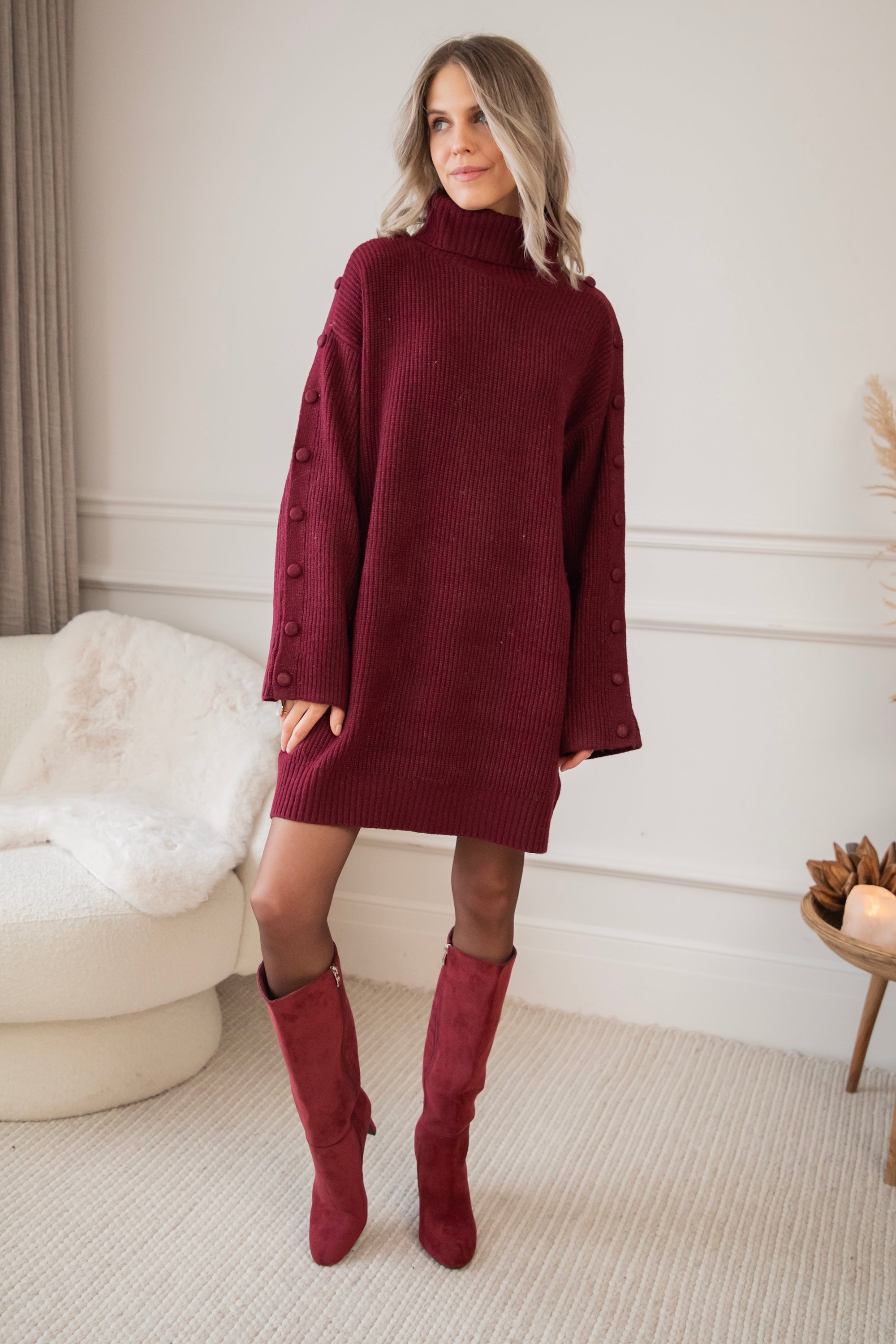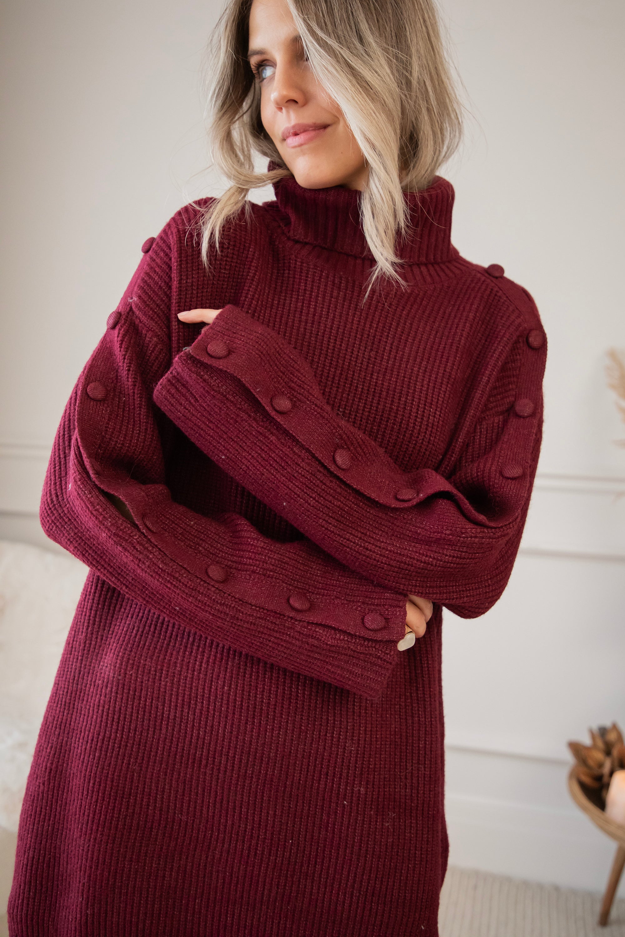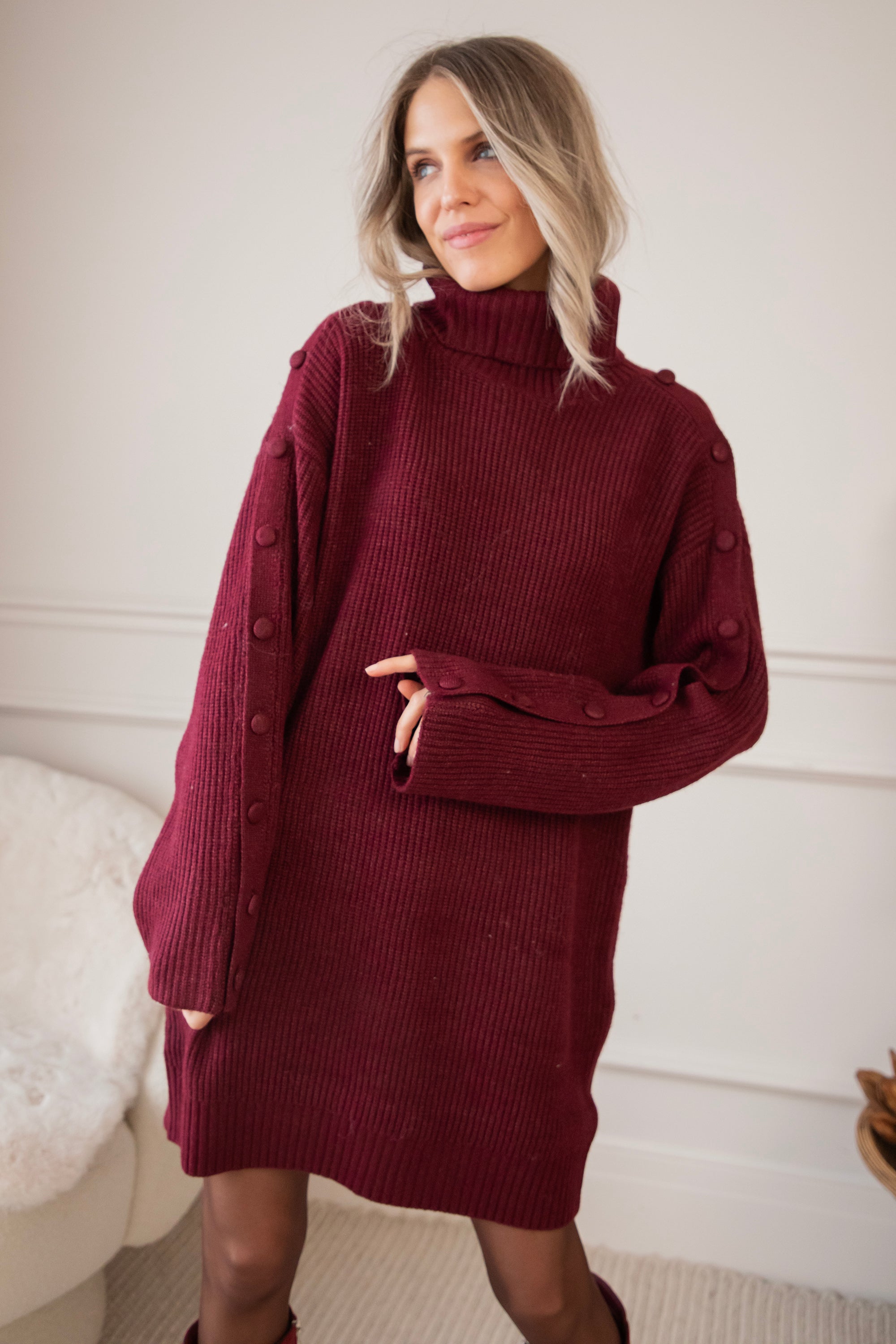 Sweater dress obsessionnn! 🔥 Een los, comfy modelletje waarbij dit keer de mouwen in de spotlight staan. Ze zijn zo prachtig afgewerkt met een rijtje gestoffeerde ronde knopen! 😍 Het breiwerk voelt heerlijk warm aan, rekt mooi mee en dan… die rolkraag! Ik vind dat zo’n pluspunt bij sweater dresses. Instant cozy vibes 🎀