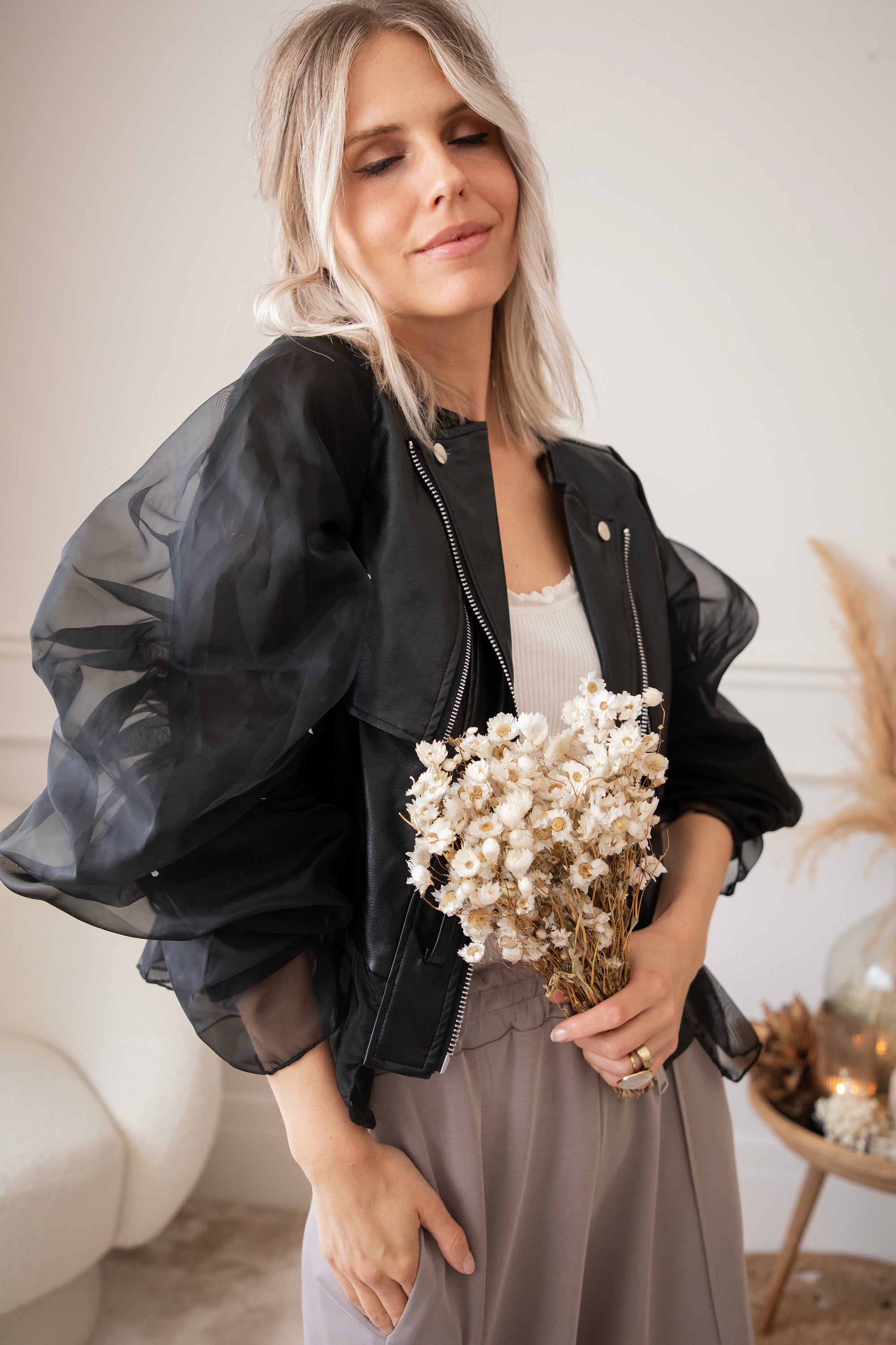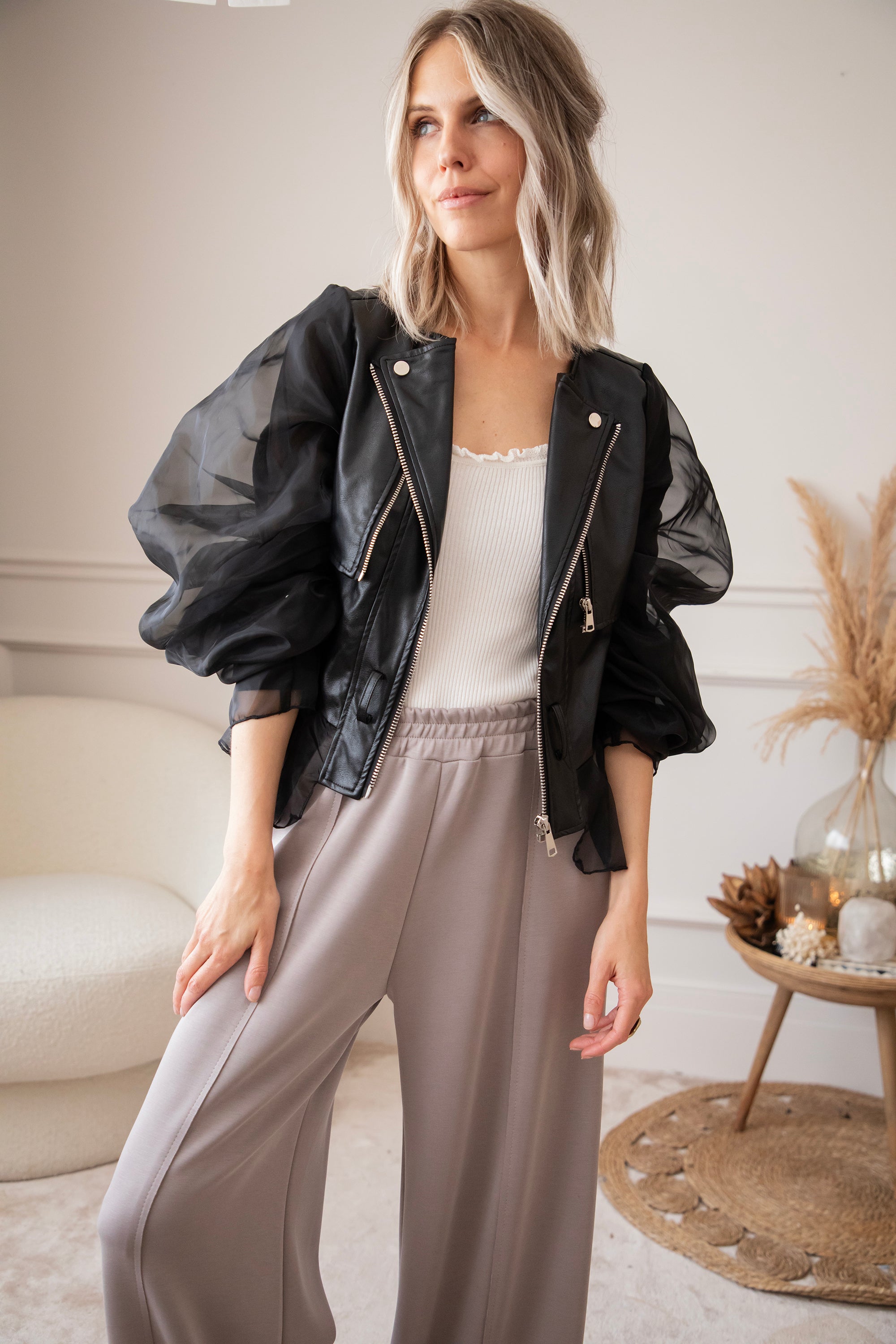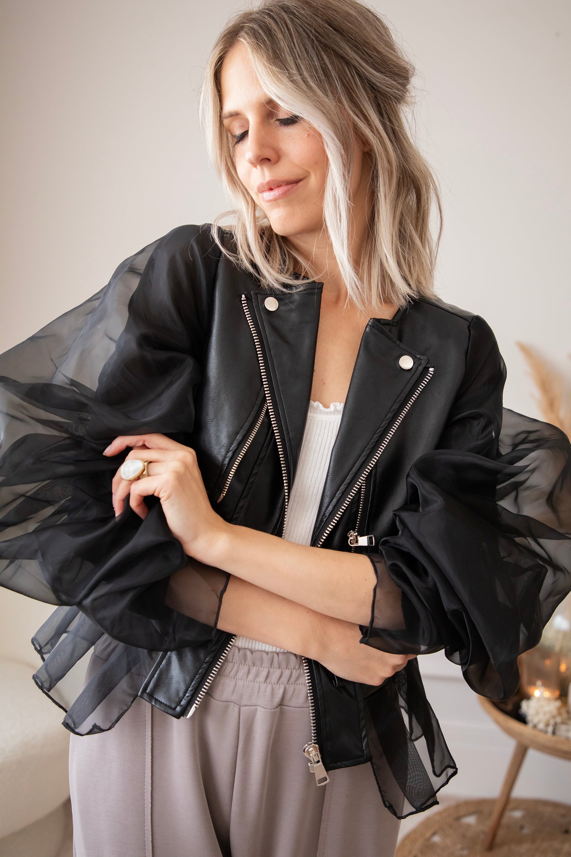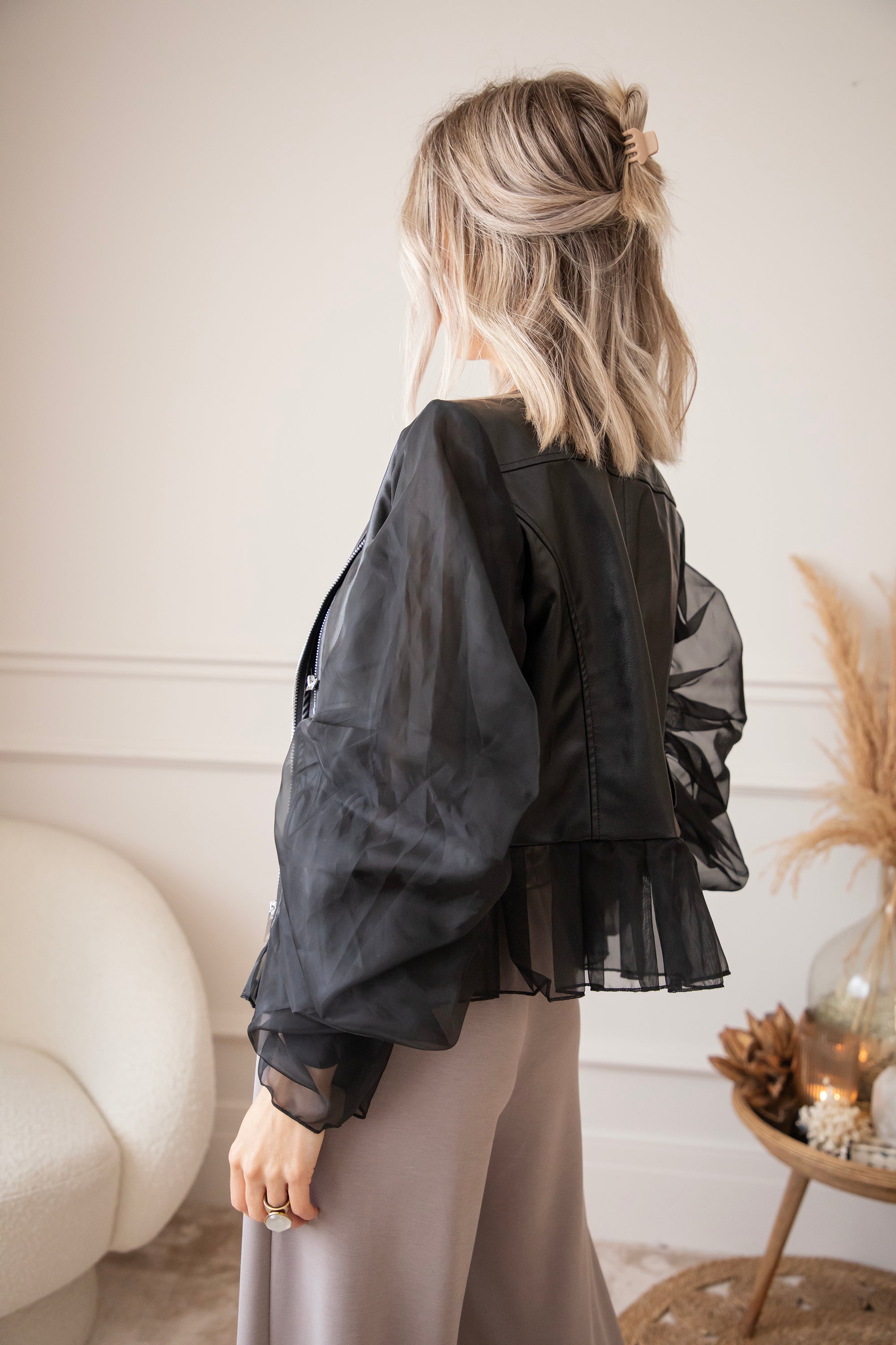 Zeg hallo tegen jouw nieuwe showstopper! De Belle Couture jacket is niet zomaar een jasje! Dit is een exclusief ellemilla design dat je nergens anders vindt. Stoer én ultra vrouwelijk, met edgy PU-leather in het midden en romantische kanten mouwen die een echte statement maken 💥 Ja dit is toch wel echt een item op trots op te zijn!