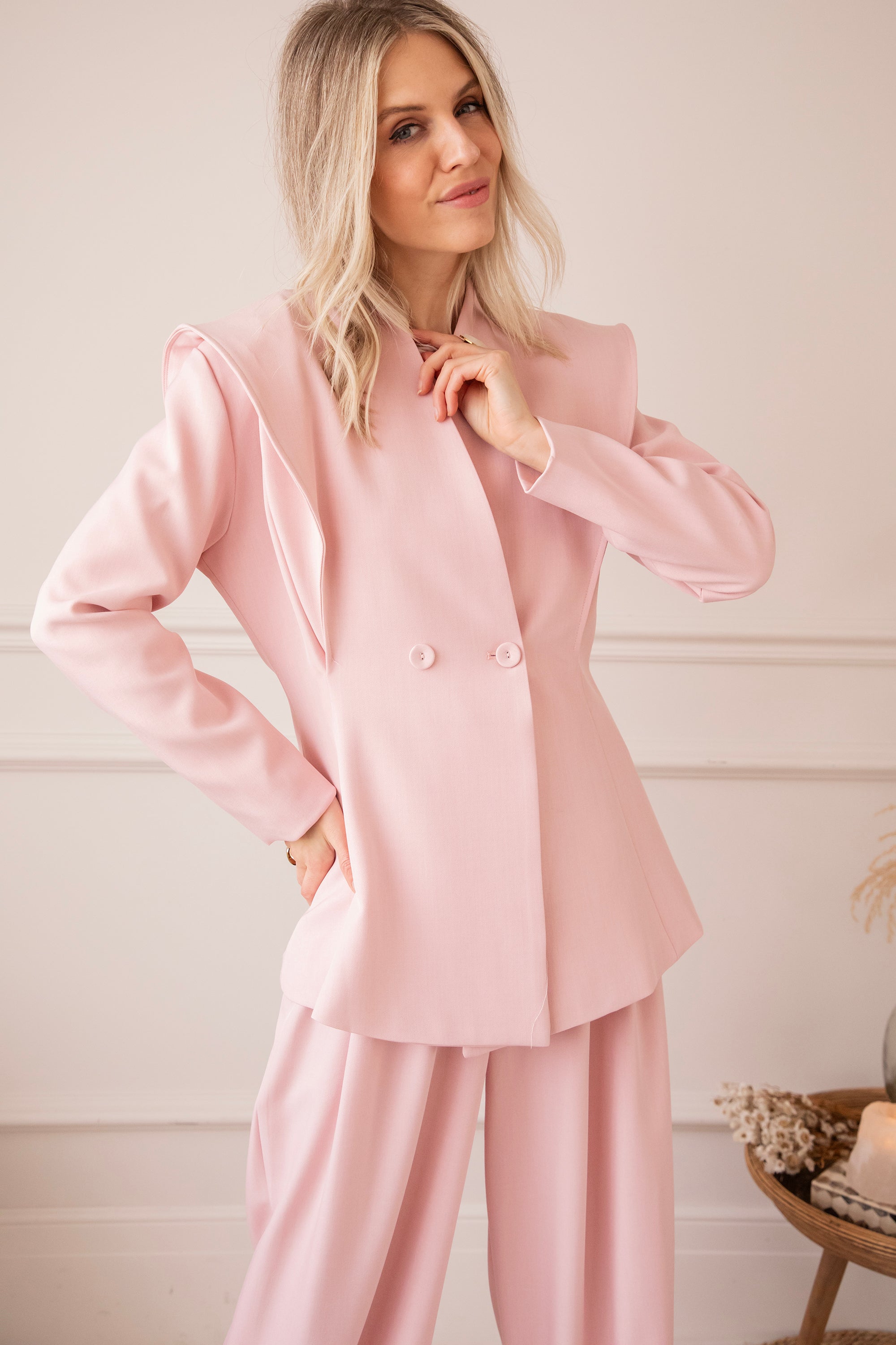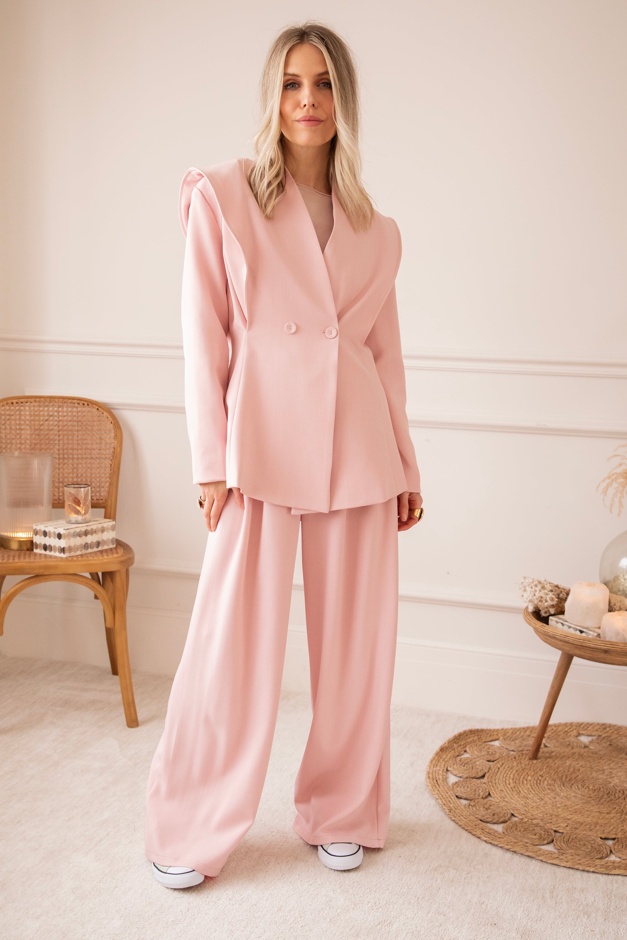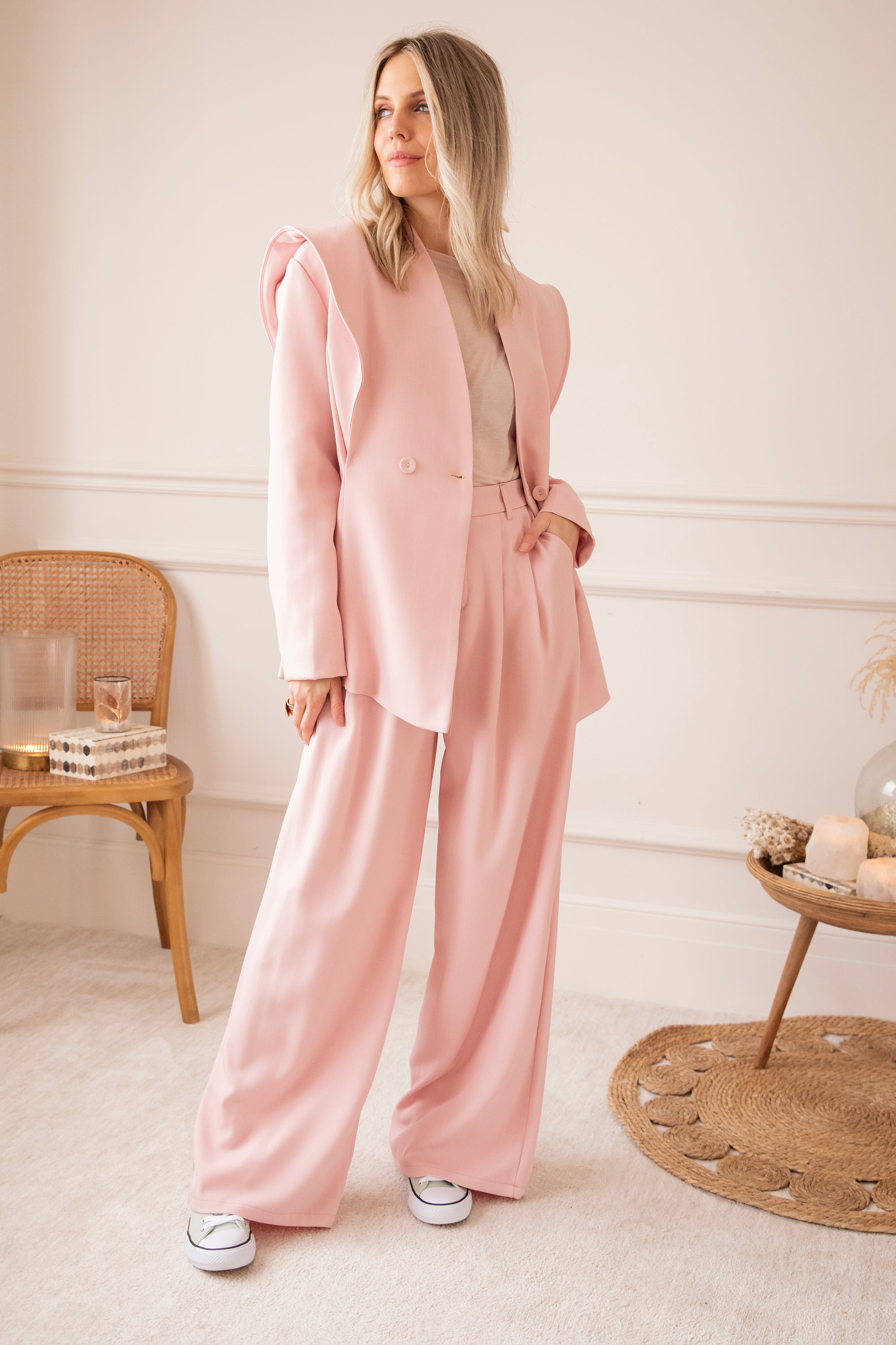 Holaaa, wat een classy blazertje hebben we hier! 😍 De Bravery Blazer springt er meteen uit dankzij haar speelse overslag aan de schouders en subtiel uitlopende onderkant. Ga voor een stijlvolle set met de bijpassende wijde Bravery broek of combineer ‘m casual met een wit T-shirt en jeans 🥰 Perfect voor je work week, een lentefeest of gewoon wanneer je zin hebt in een frisse, elegante look. En hoe mooi is dat zachte roze kleurtje? 🩷 Echt eens iets anders dan de klassieke tinten!