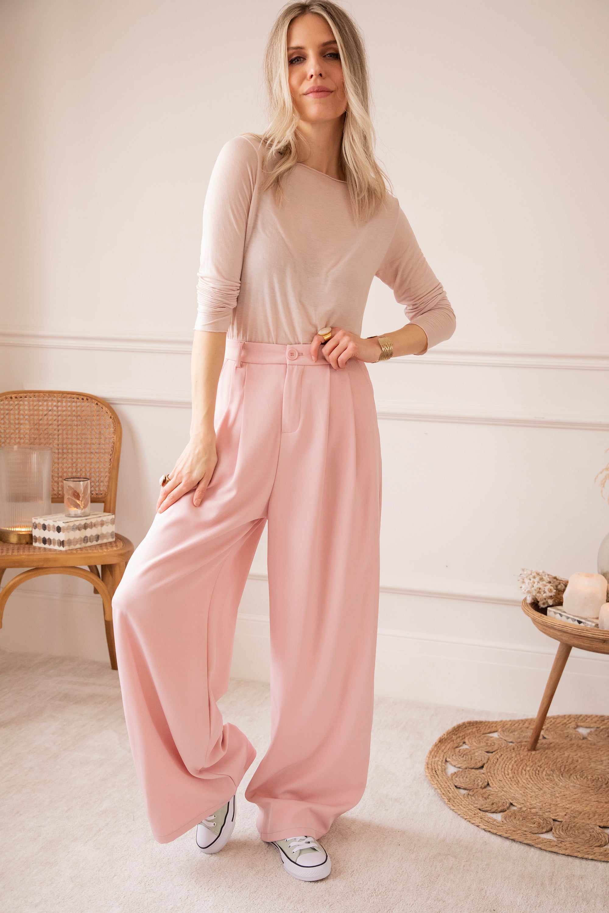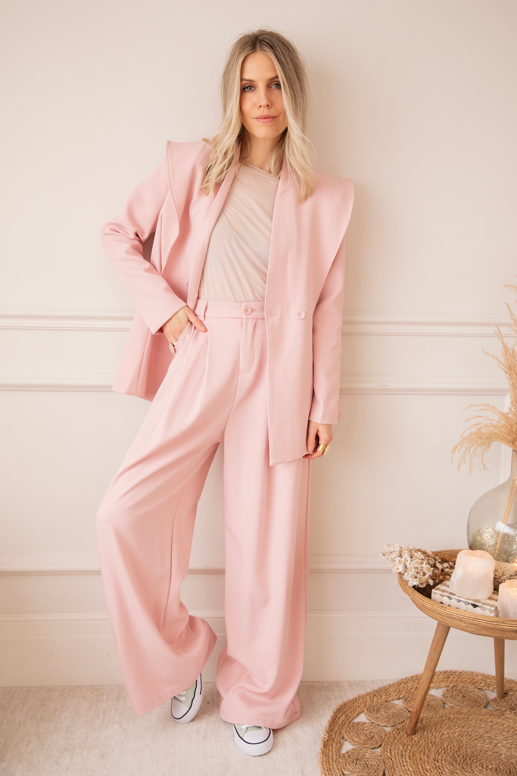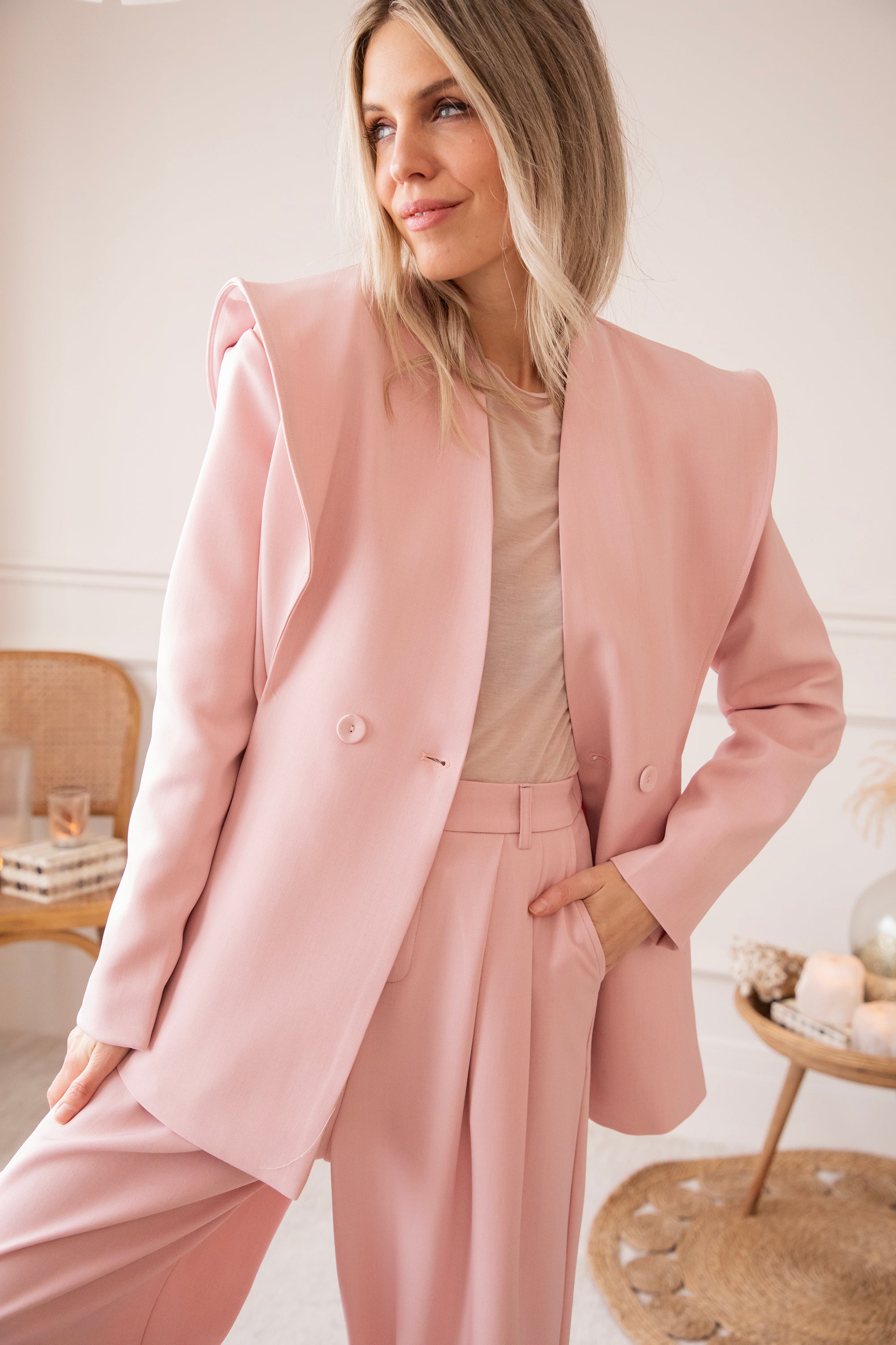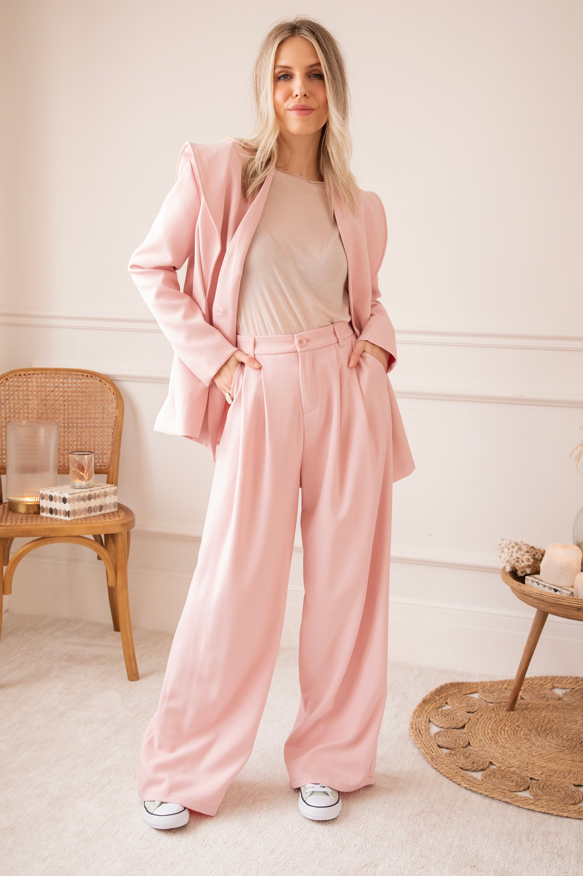 Holaaa, wat een classy blazertje hebben we hier! 😍 De Bravery Blazer springt er meteen uit dankzij haar speelse overslag aan de schouders en subtiel uitlopende onderkant. Ga voor een stijlvolle set met de bijpassende wijde Bravery broek of combineer ‘m casual met een wit T-shirt en jeans 🥰 Perfect voor je work week, een lentefeest of gewoon wanneer je zin hebt in een frisse, elegante look. En hoe mooi is dat zachte roze kleurtje? 🩷 Echt eens iets anders dan de klassieke tinten!