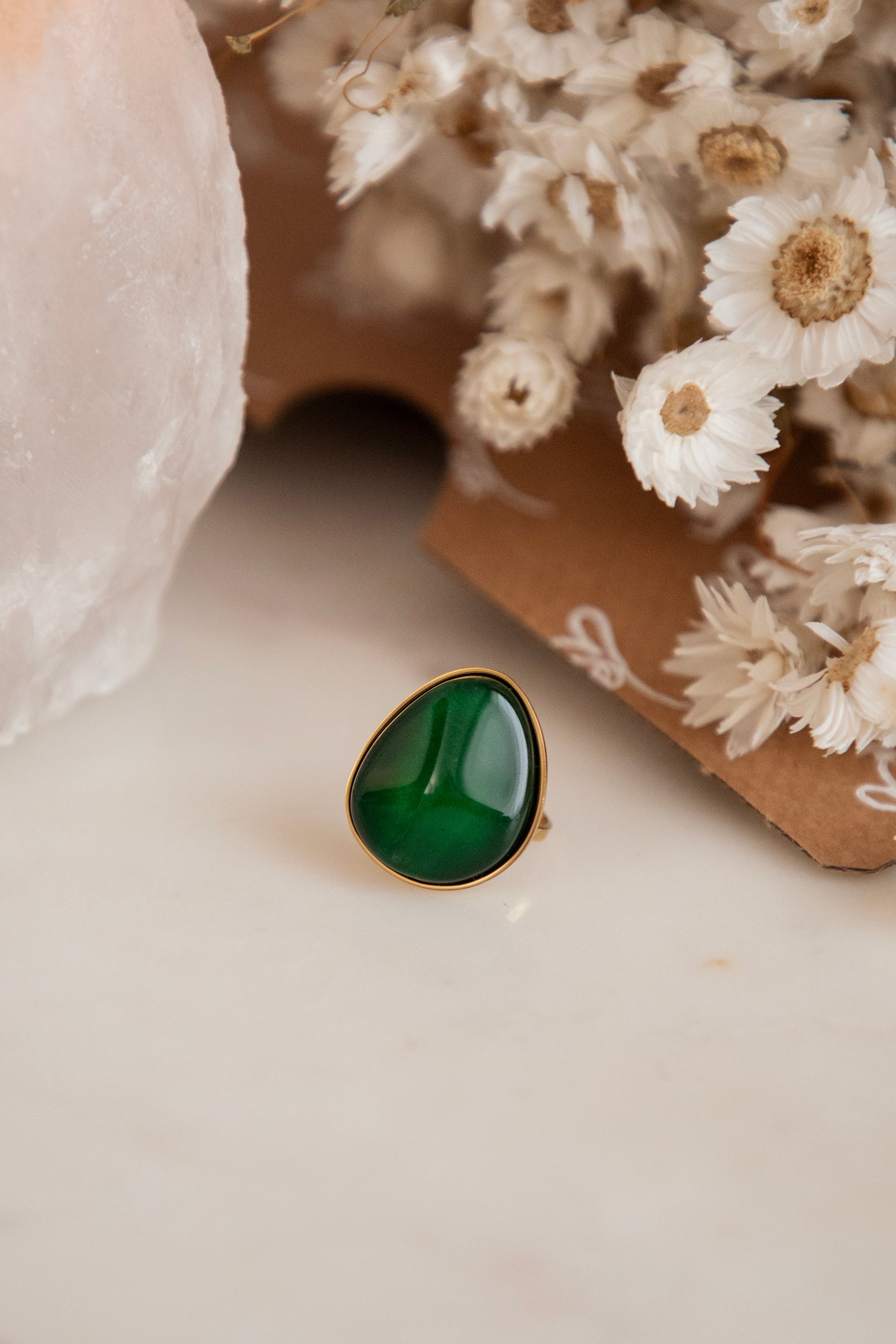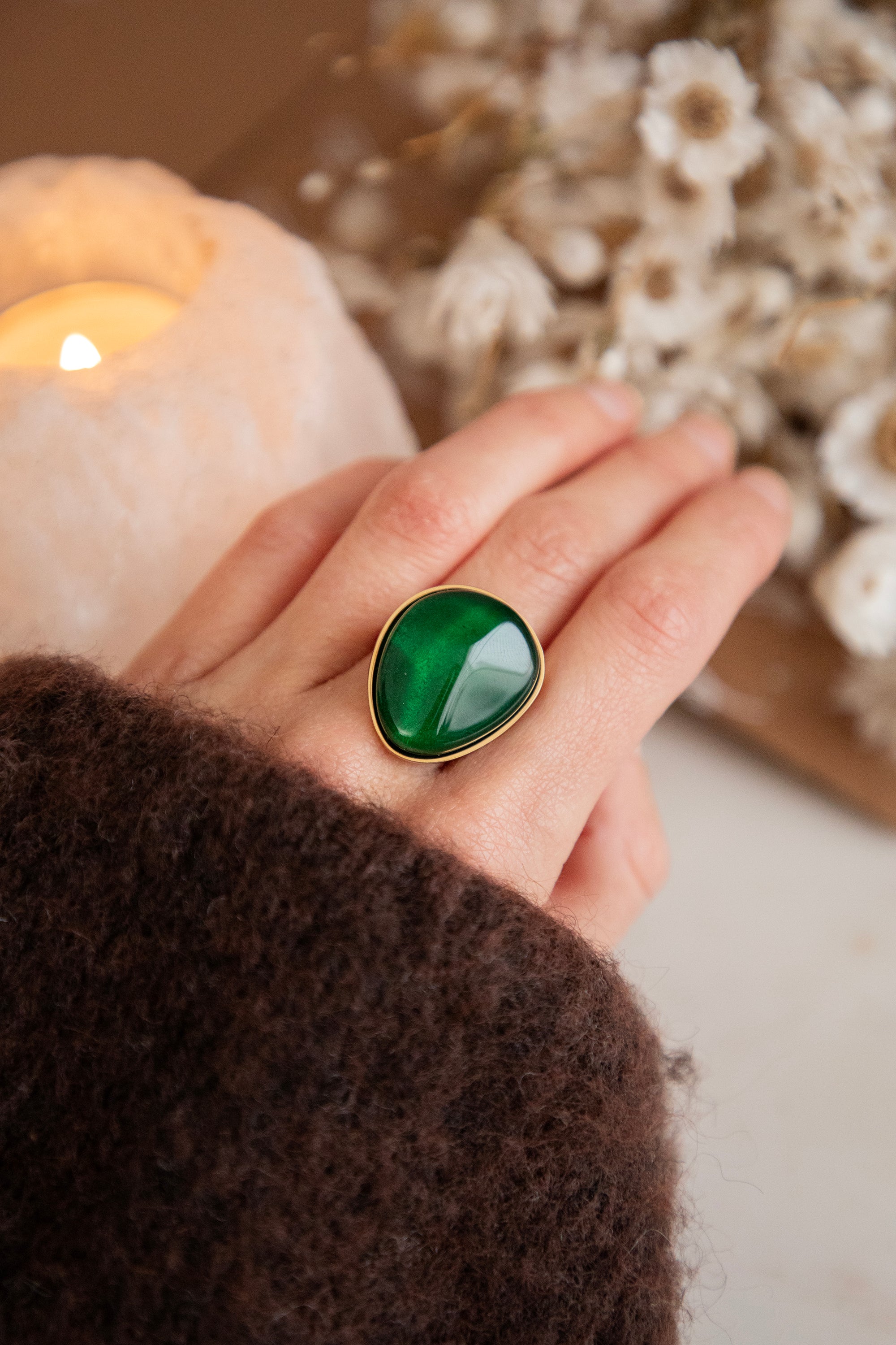 De steen heeft prachtige groene kleurschakeringen, een diepe glans en zelfs een kleine sparkle ✨ De vorm is net iets specialer en subtiel verhoogd voor dat extra wow-effect!