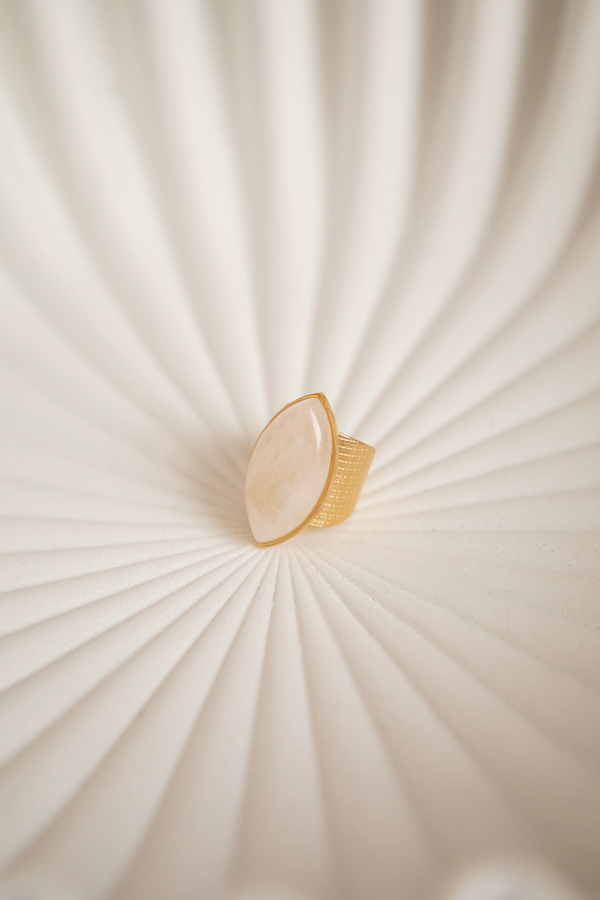De steen ligt mooi in een warm gouden omhulsel, wat de ring een tijdloze en vrouwelijke uitstraling geeft. Clarisse is wat breder van vorm, waardoor ze mooi aansluit rond je vinger en comfortabel draagt. Achteraan zit een kleine opening, zodat ze net dat beetje meegeeft.