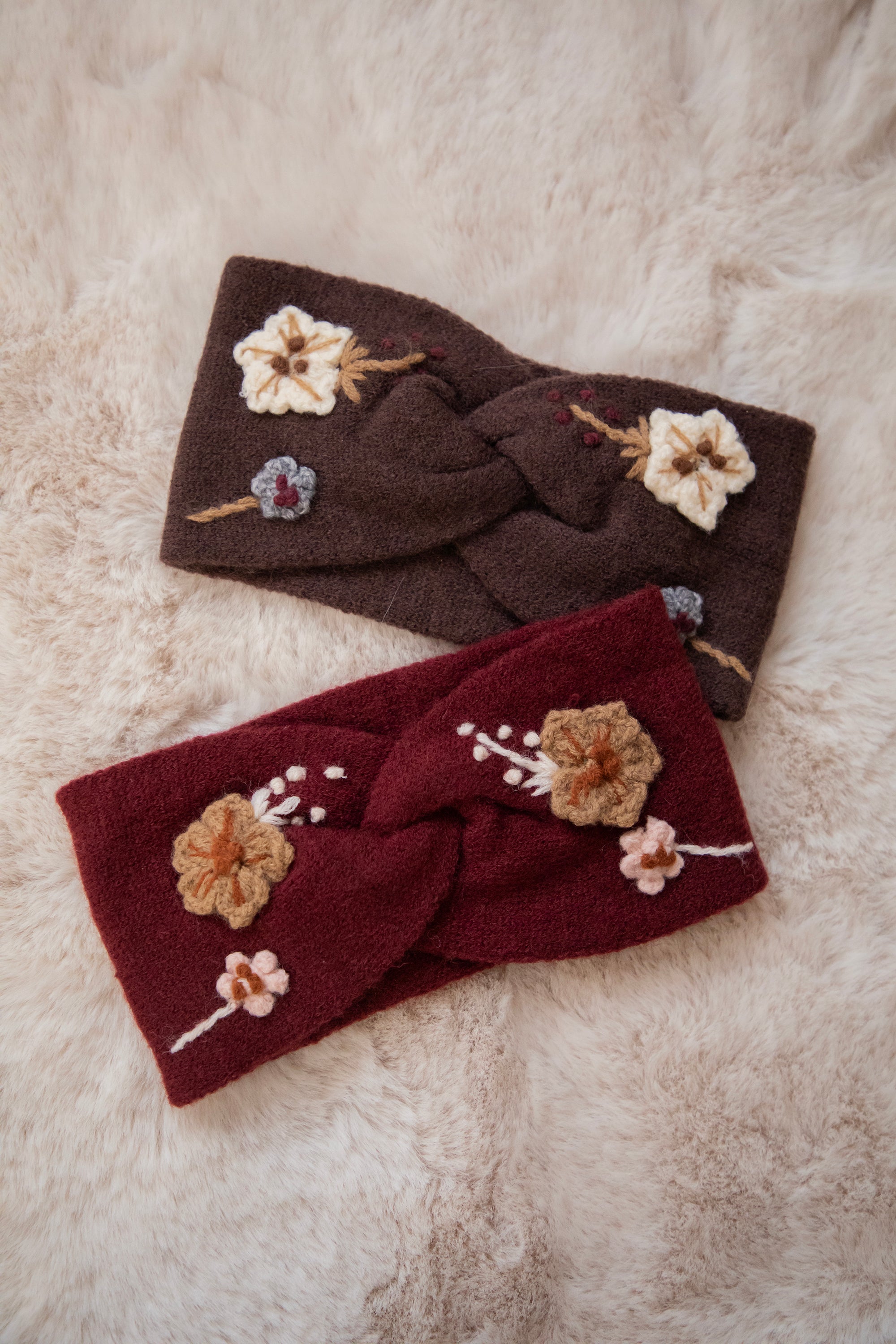 Ook hier zie je dat lieve gebreide bloemetjesdetail, weer met die wollige, zachte look. De twist in het midden blijft super flatterend en de rek is geweldig, dus ze zit altijd comfy. Het is zo’n accessoire dat je outfit meteen dat extra beetje sweetness geeft. Gewoon… love it! 🤍✨