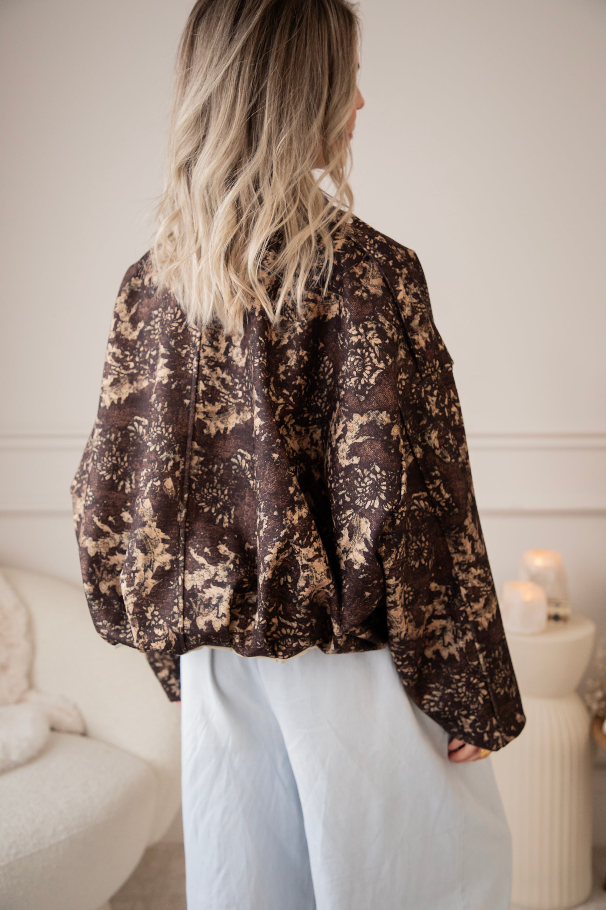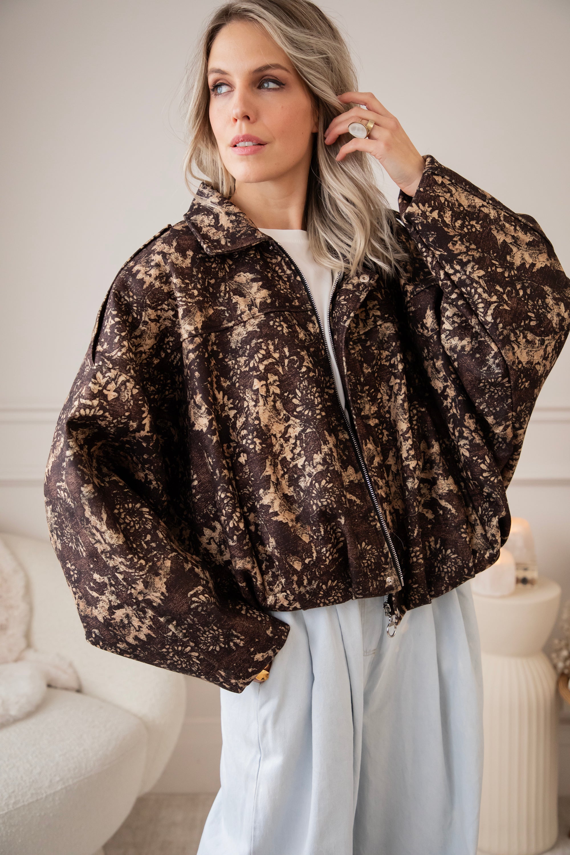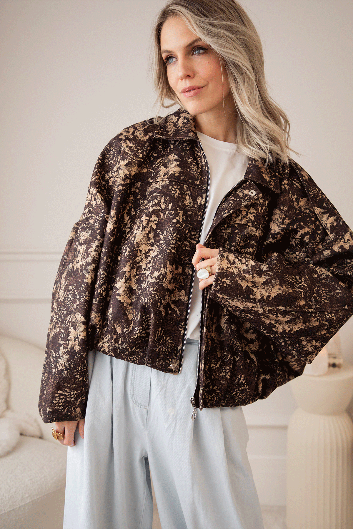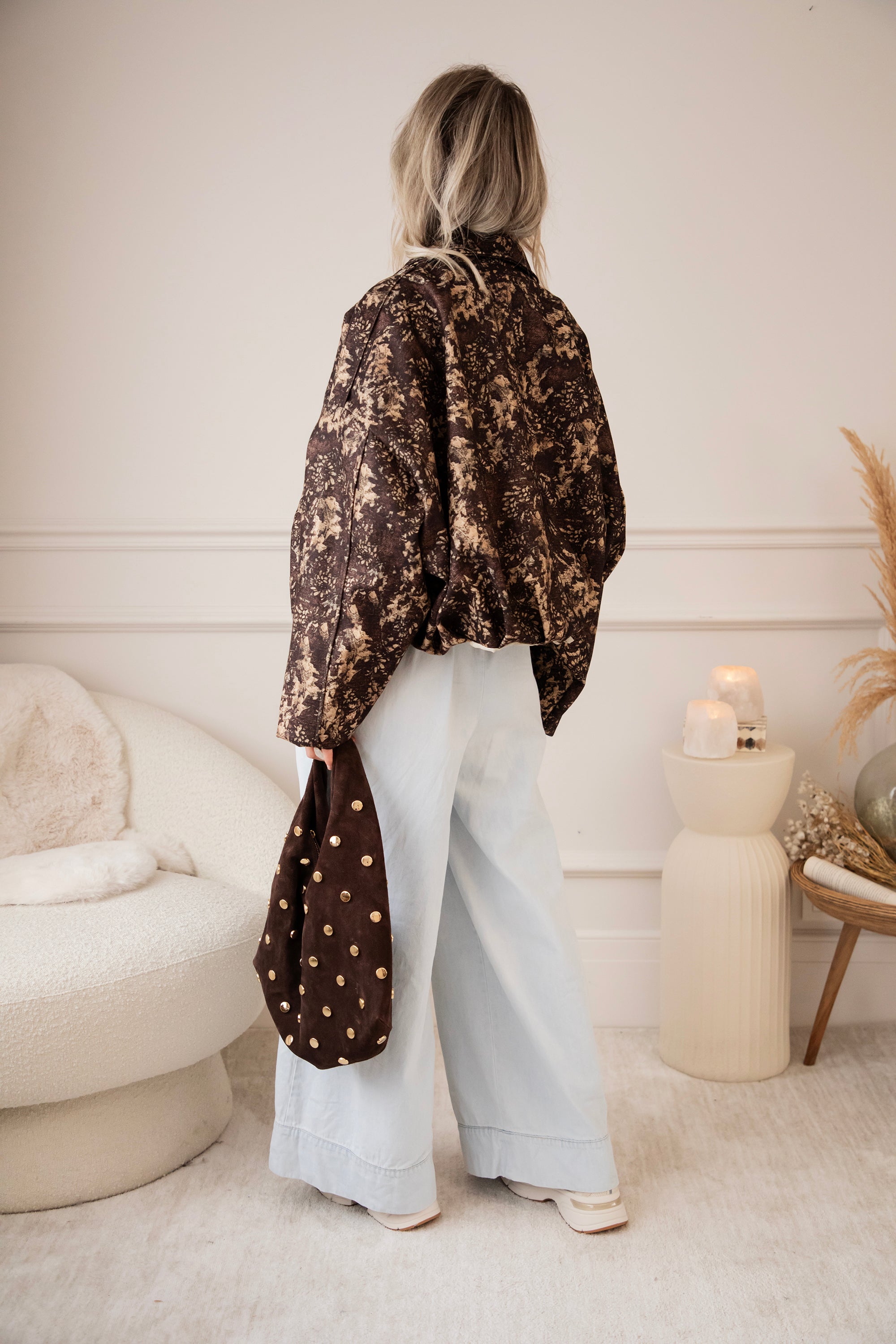 Dawn Till Dusk is een oversized jacket met vlindermouwen en een goudkleurig artistiek patroon. Echt een piece of art. De stof voelt ultra smooth en glad aan, bijna alsof je een zijden jasje draagt ✨ En dat patroon… de warme choco kleur met dat fancy beige… het heeft gewoon iets magisch. Het krijgt daardoor ook een wat meer luxe look, maar dan op een heel draagbare manier 😊