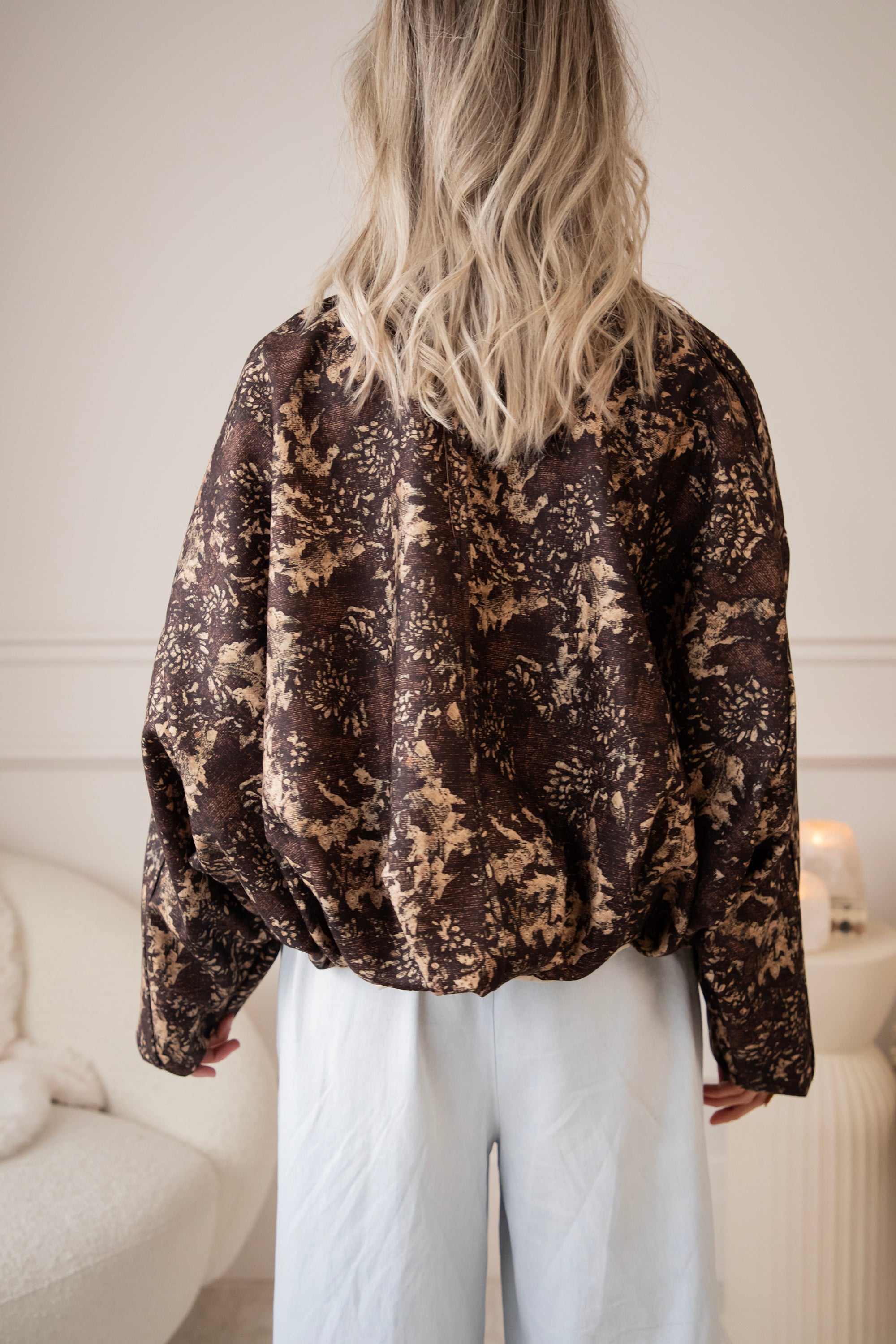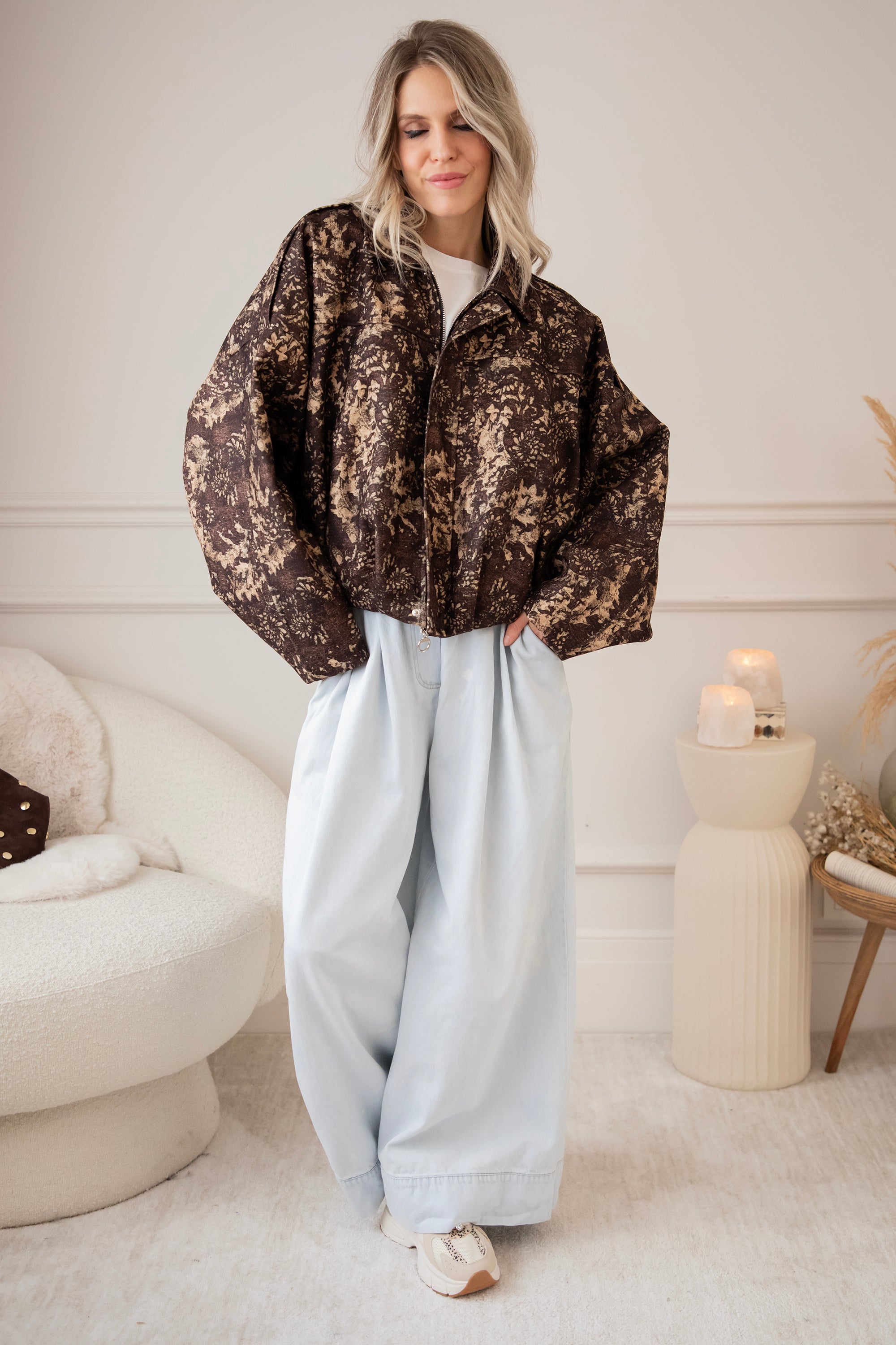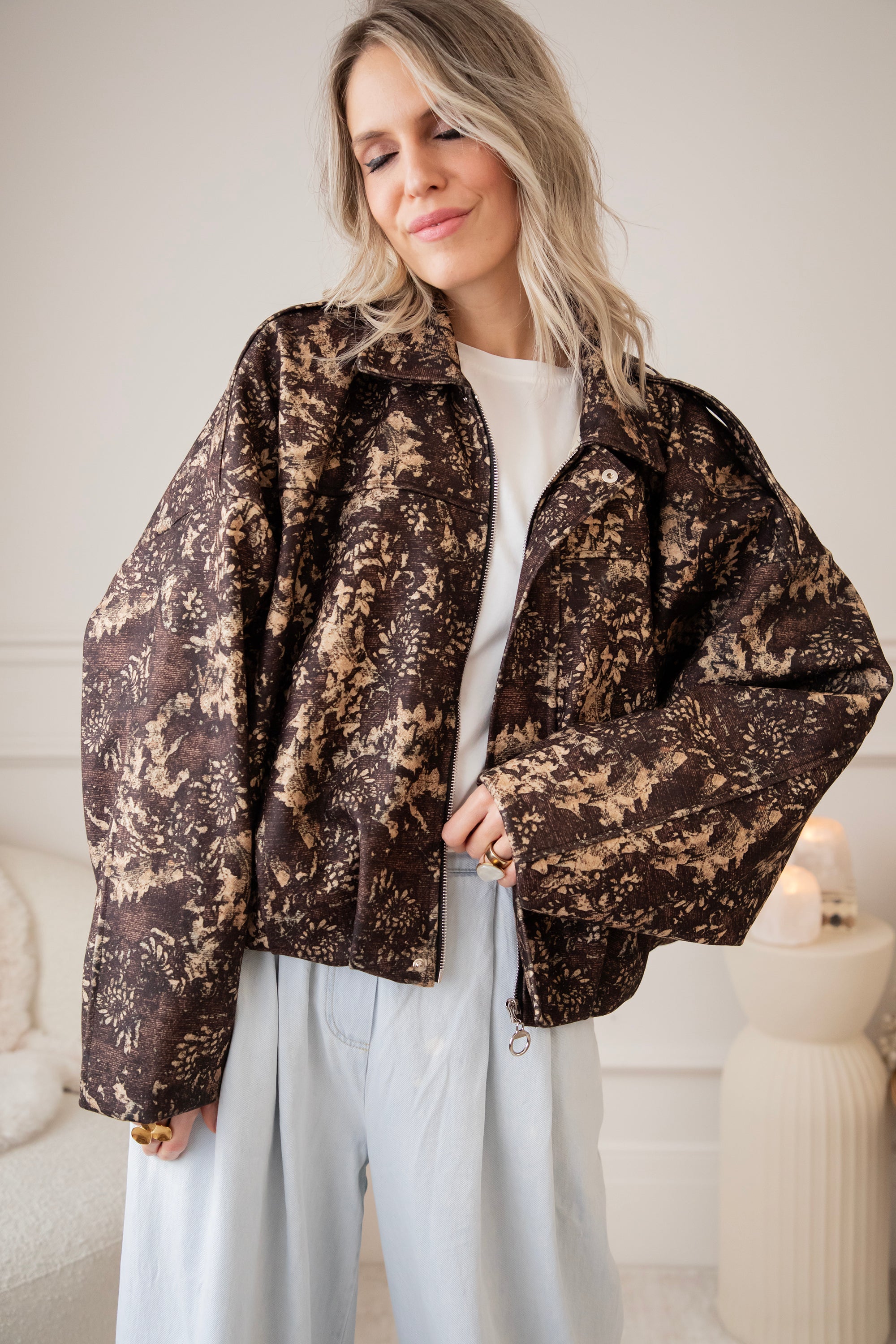 Dawn Till Dusk is een oversized jacket met vlindermouwen en een goudkleurig artistiek patroon. Echt een piece of art. De stof voelt ultra smooth en glad aan, bijna alsof je een zijden jasje draagt ✨ En dat patroon… de warme choco kleur met dat fancy beige… het heeft gewoon iets magisch. Het krijgt daardoor ook een wat meer luxe look, maar dan op een heel draagbare manier 😊