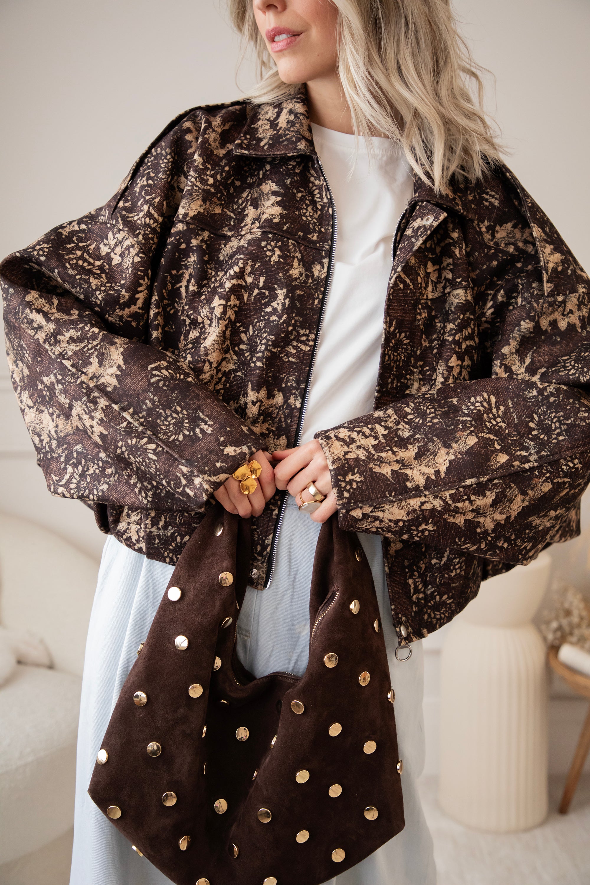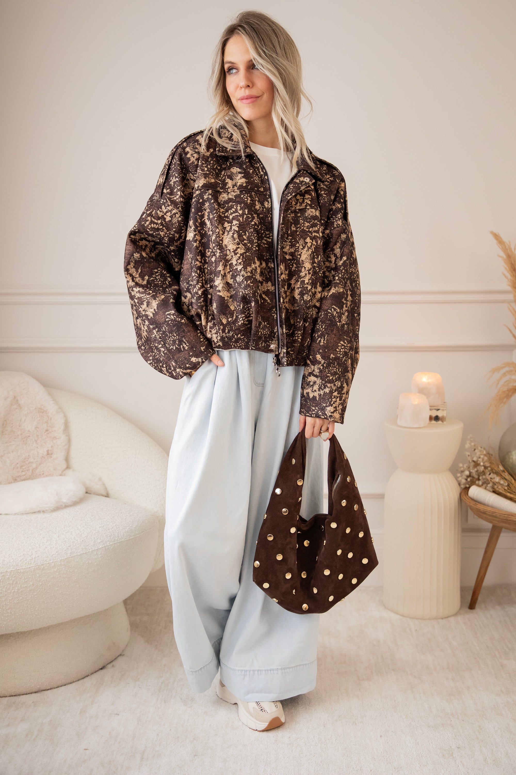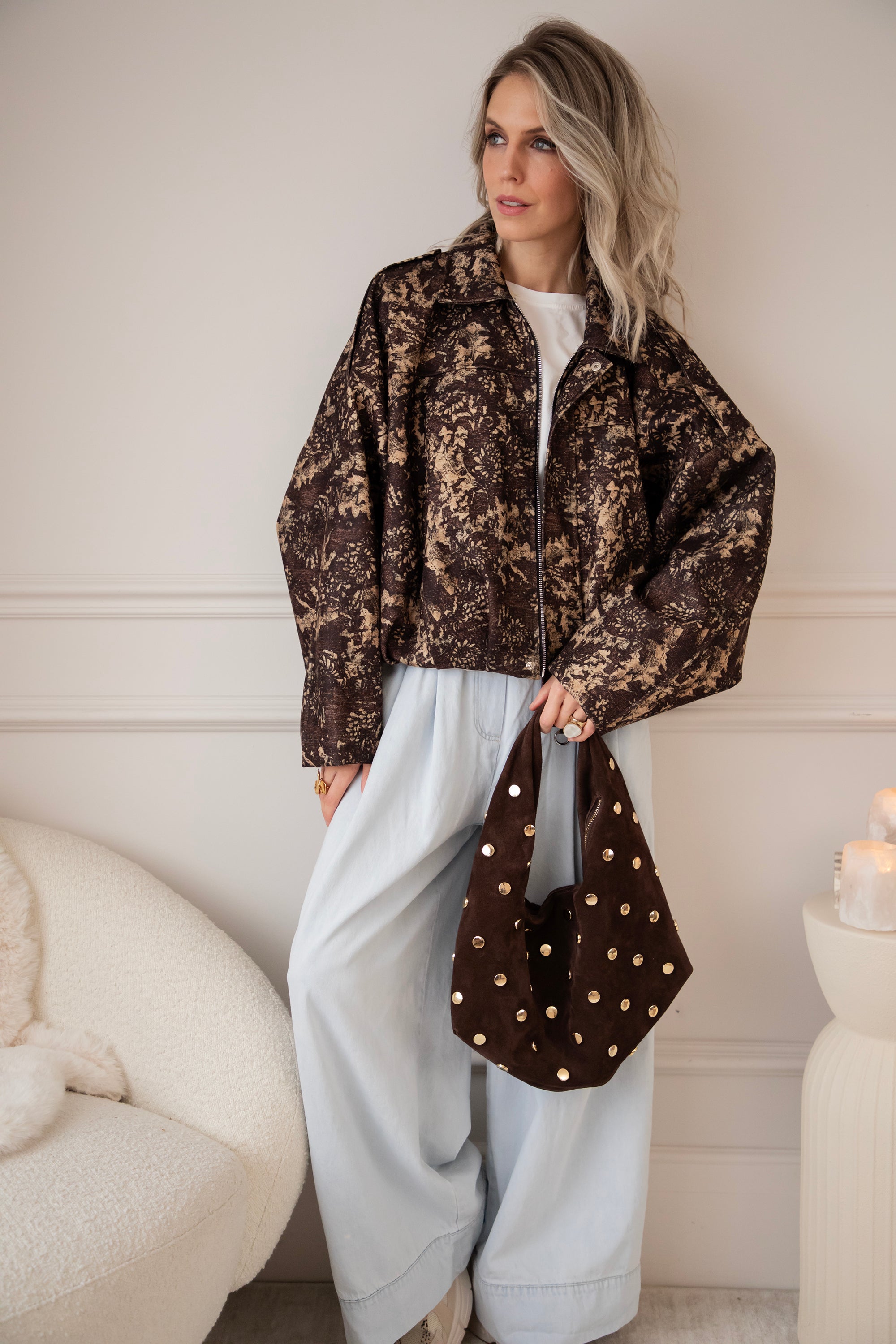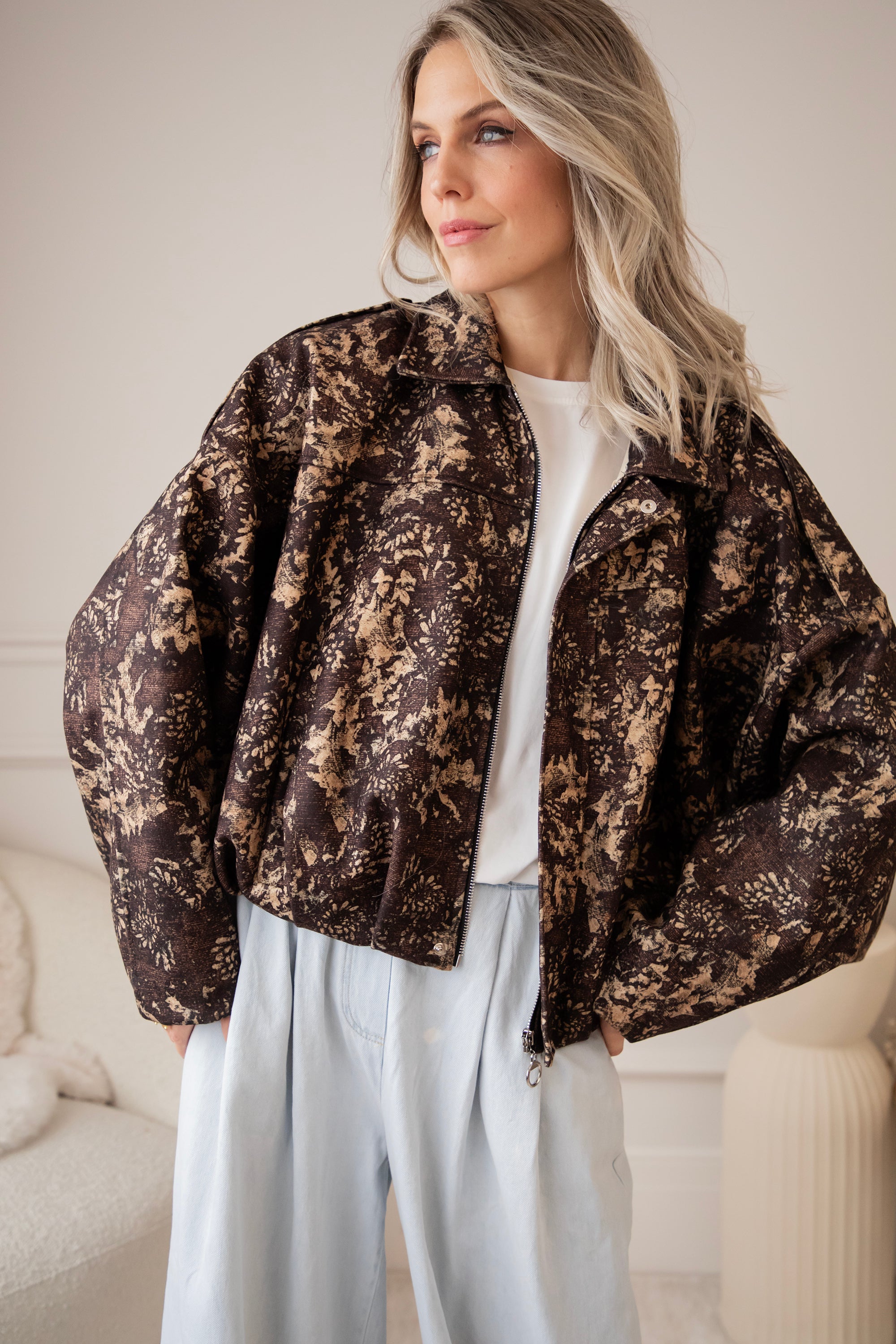 Dawn Till Dusk is een oversized jacket met vlindermouwen en een goudkleurig artistiek patroon. Echt een piece of art. De stof voelt ultra smooth en glad aan, bijna alsof je een zijden jasje draagt ✨ En dat patroon… de warme choco kleur met dat fancy beige… het heeft gewoon iets magisch. Het krijgt daardoor ook een wat meer luxe look, maar dan op een heel draagbare manier 😊