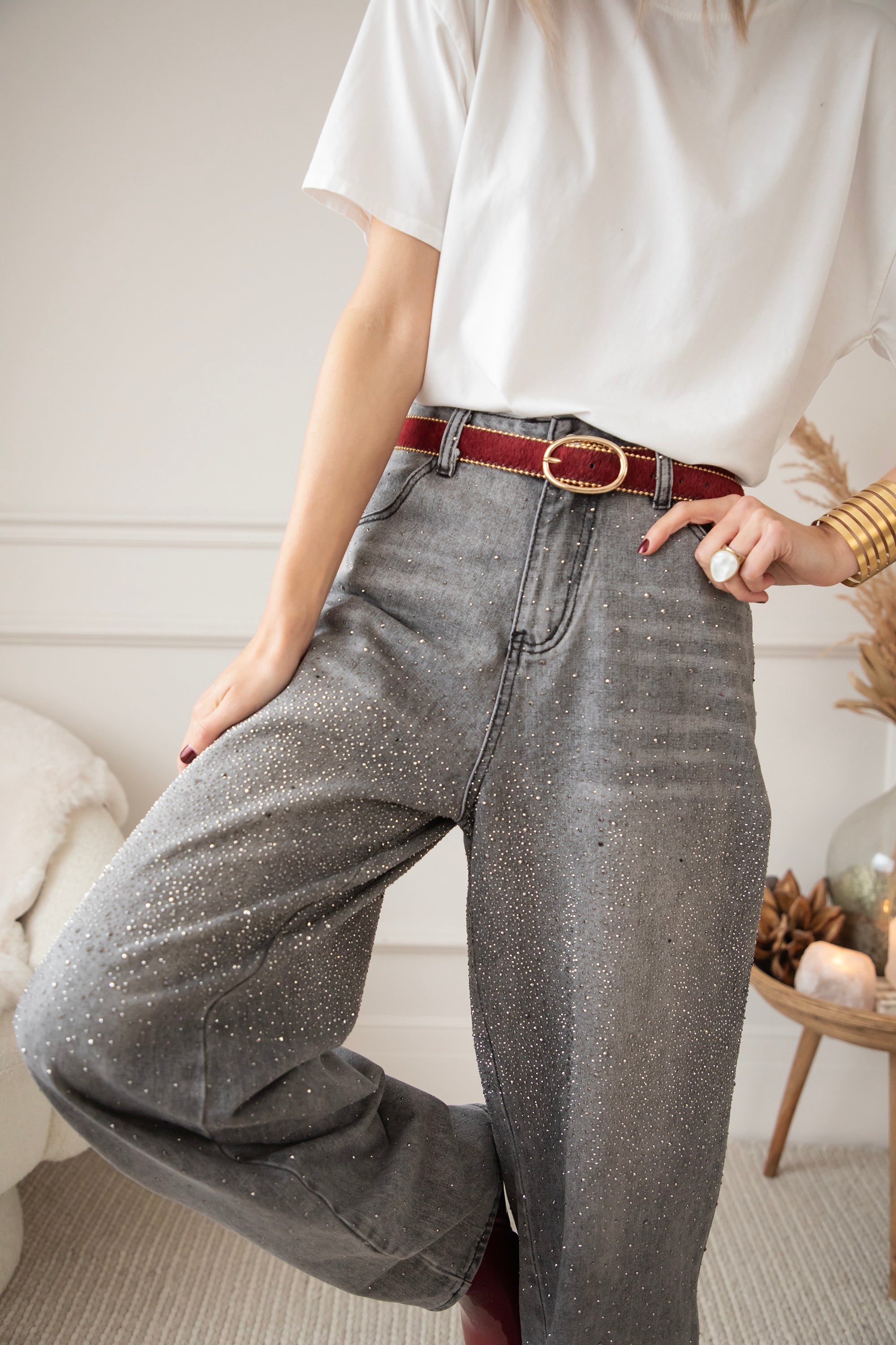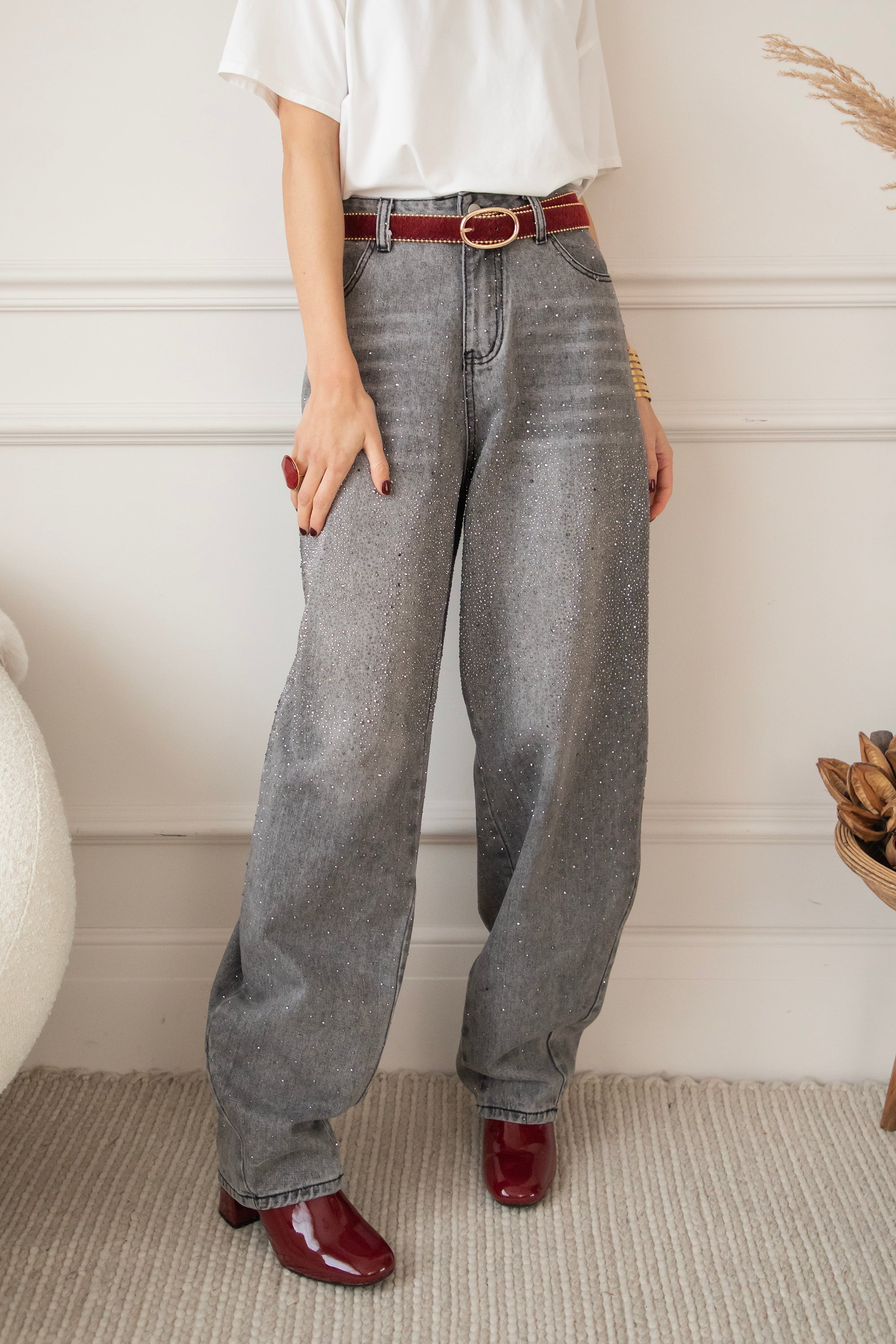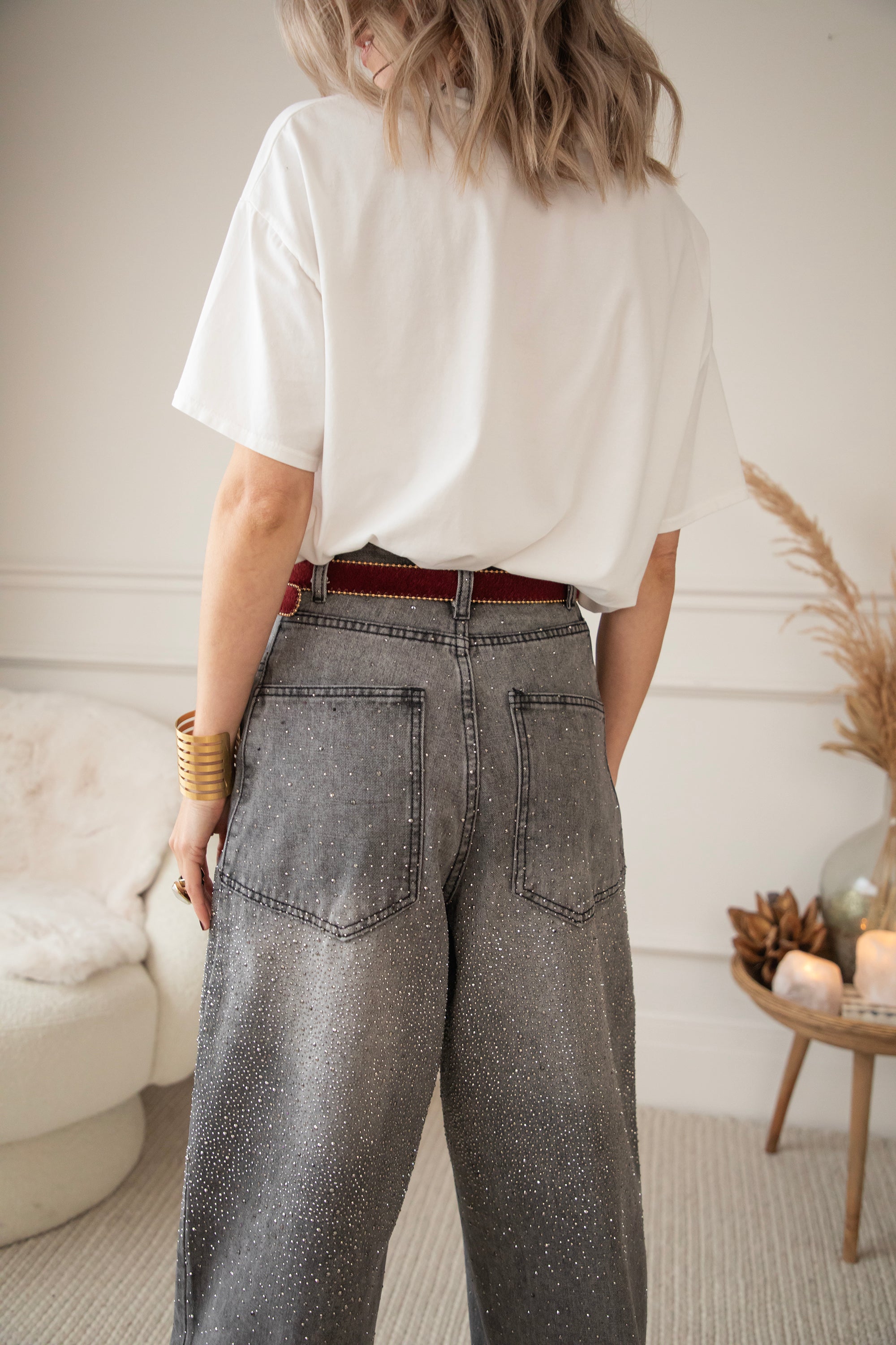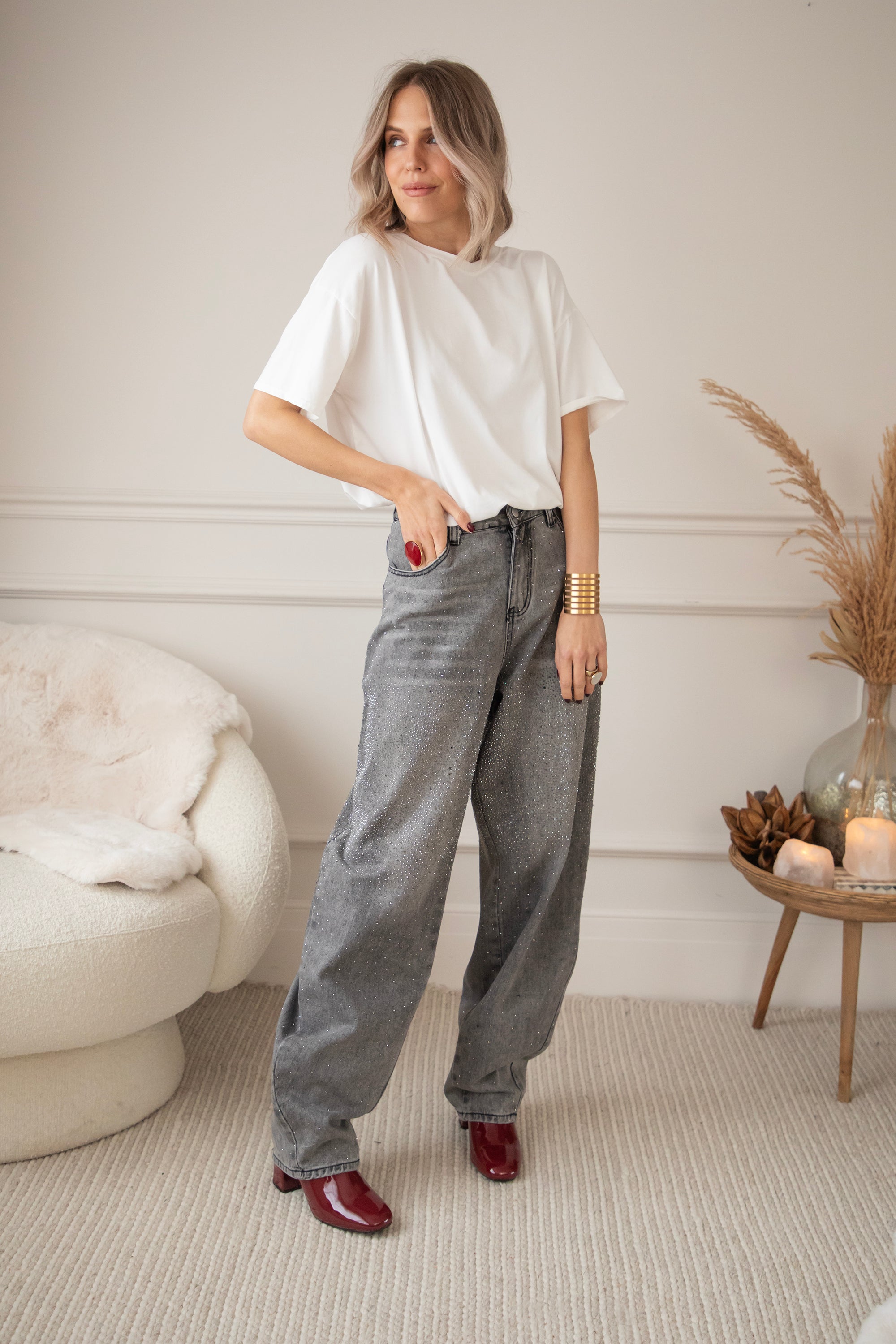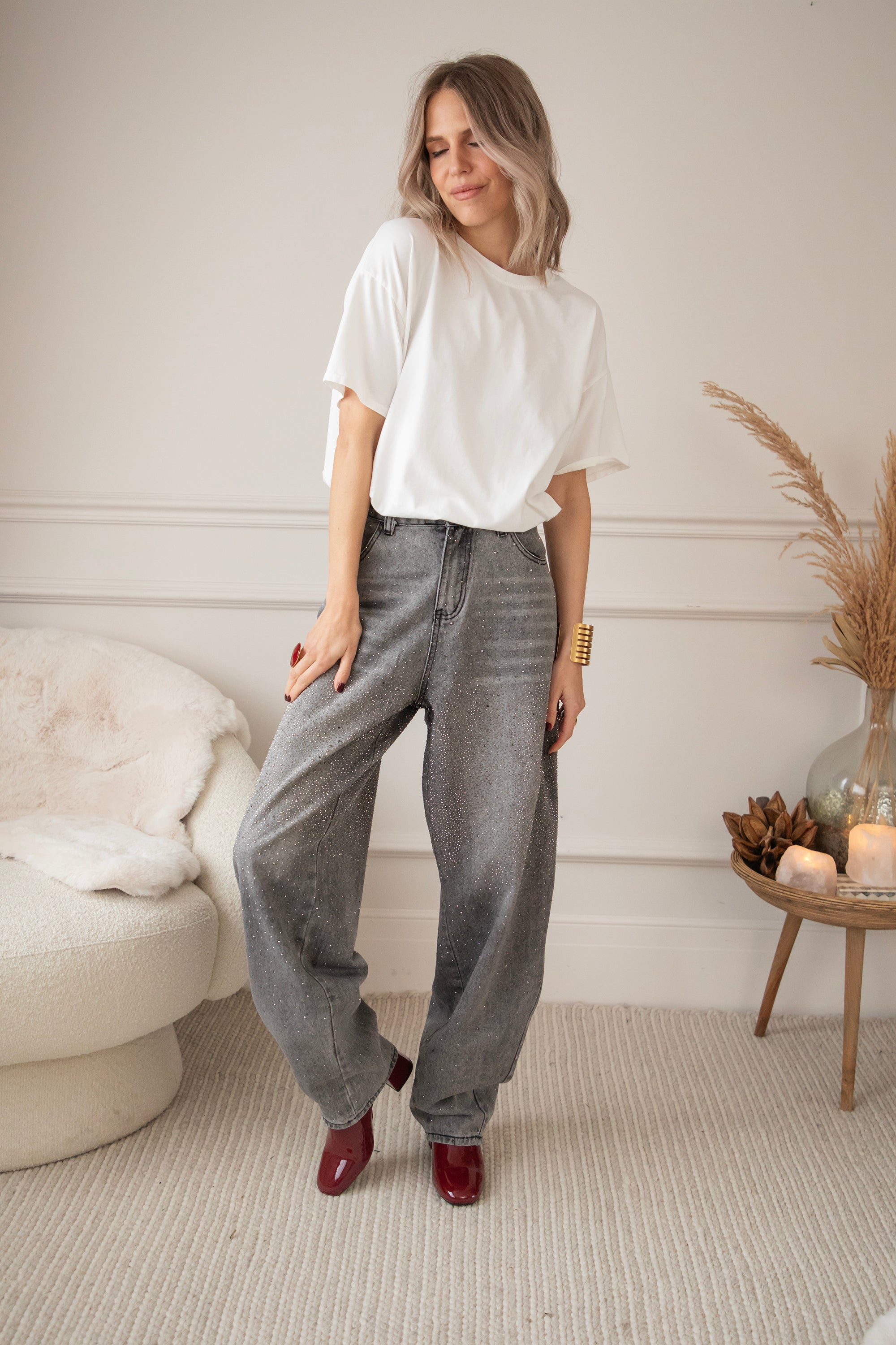 Ohhh, deze jeans is echt een feestje om te dragen! 😍 De Dazzling Denim Jeans is een barrel jeans met een hoge taille en kleine sprankelende diamantjes op de pijpen, zowel aan de voorkant als de achterkant. A little bit of sparkling magic! ✨
