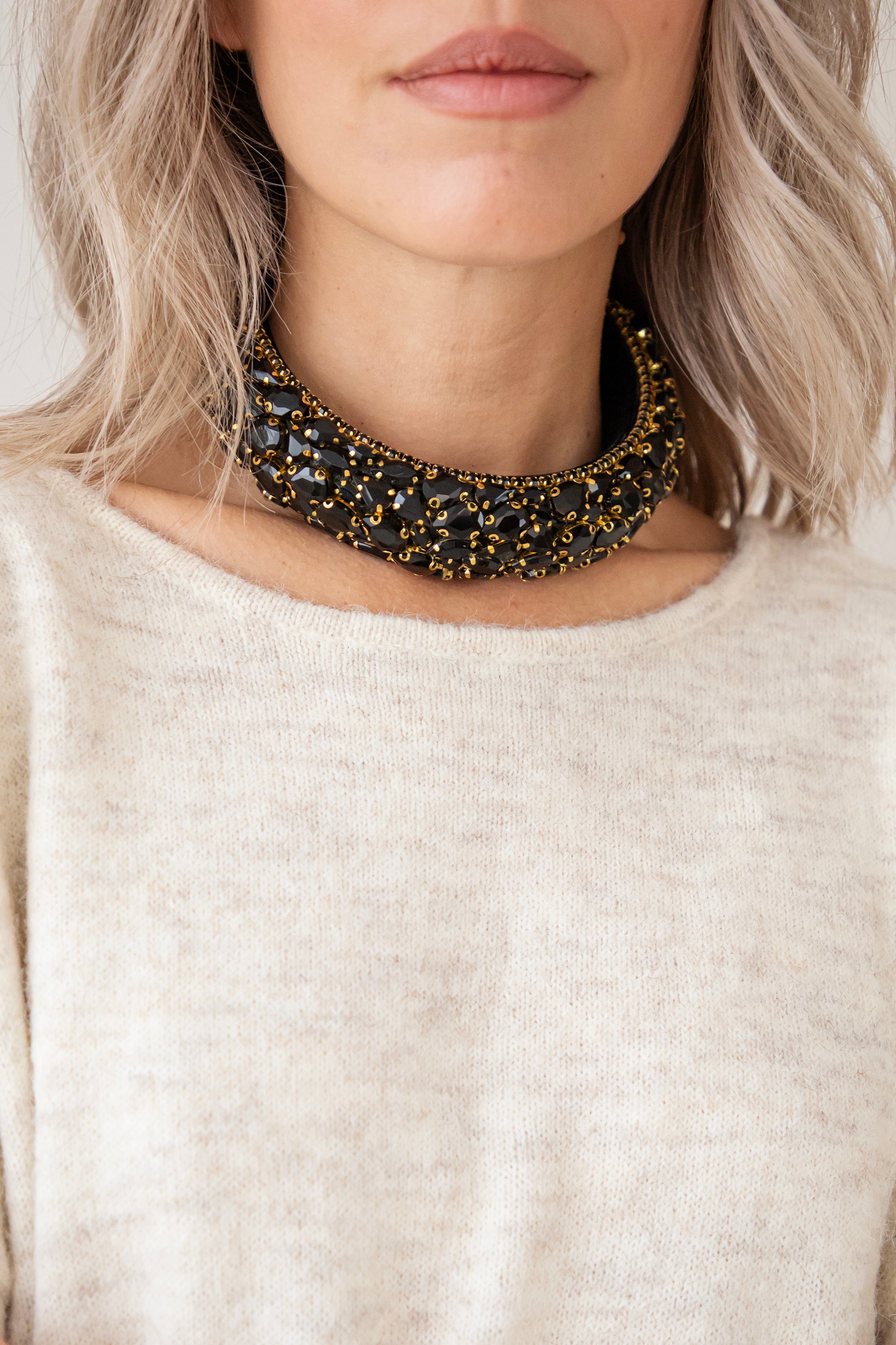 Met haar brede, royale vorm en fonkelende zwarte diamantjes in elegante druppelvorm, straalt ze pure luxe uit. De subtiele gouden details maken het helemaal af! Kortom: een kroontje voor jouw winter looks 🖤
