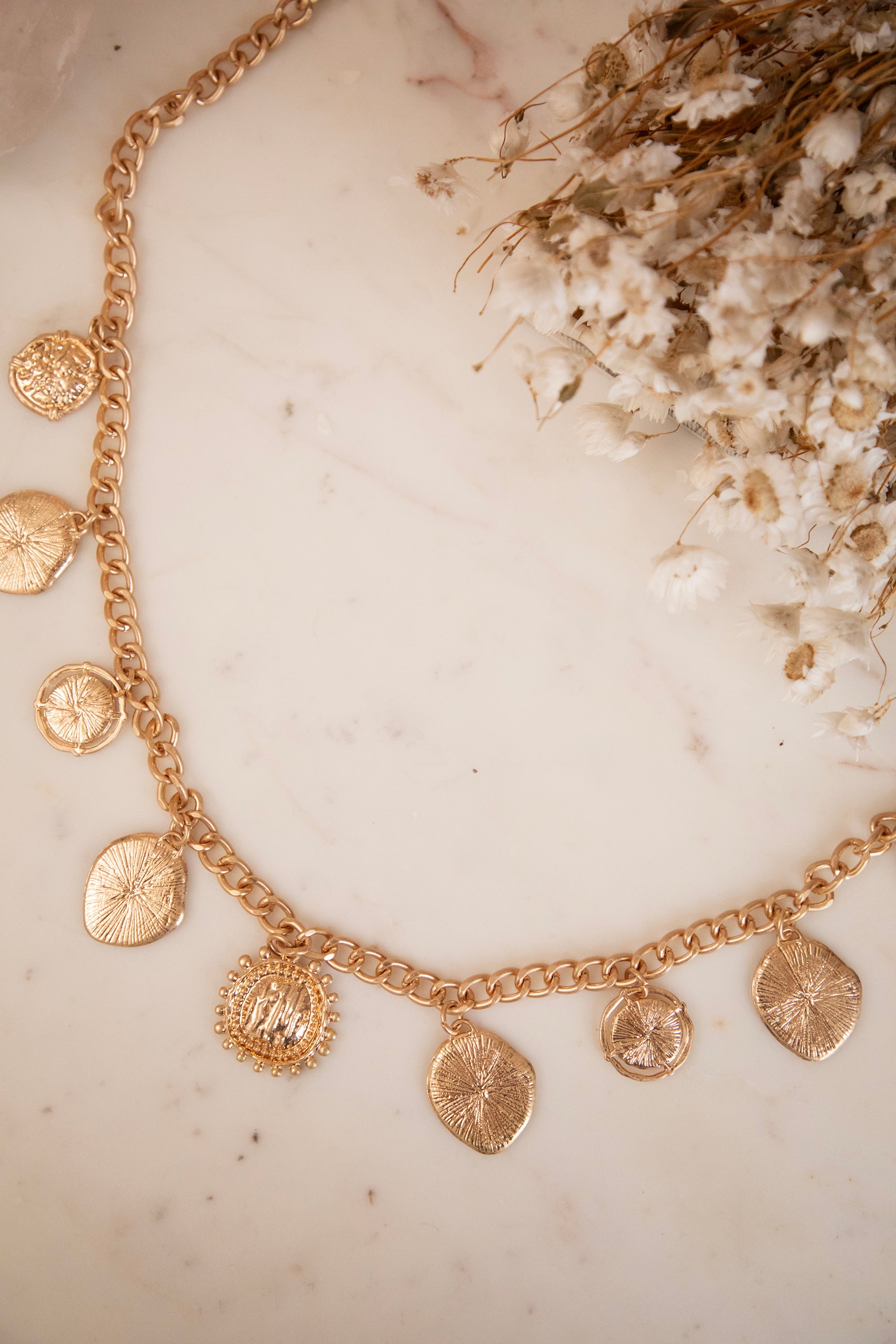 Wat deze riem zo leuk maakt? De details 🥰 Ze zit vol kleine hangertjes en elementen: gouden shields met fijn reliëf, een zonnetje, een kompasvormig detail (of laat je fantasie maar werken hihi 😁). Het goud heeft een mooie, warme glans die zacht opvalt zonder te overheersen ✨