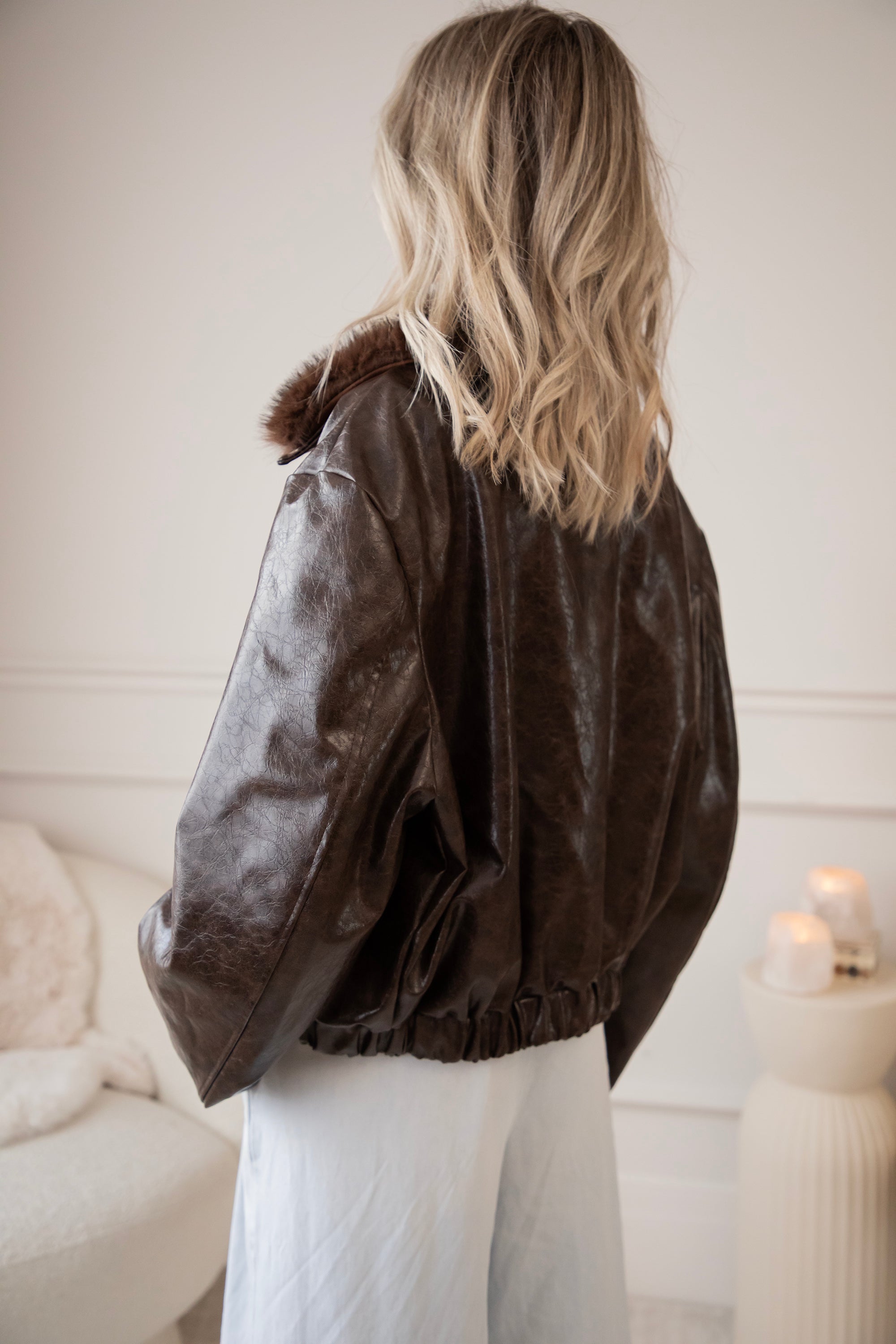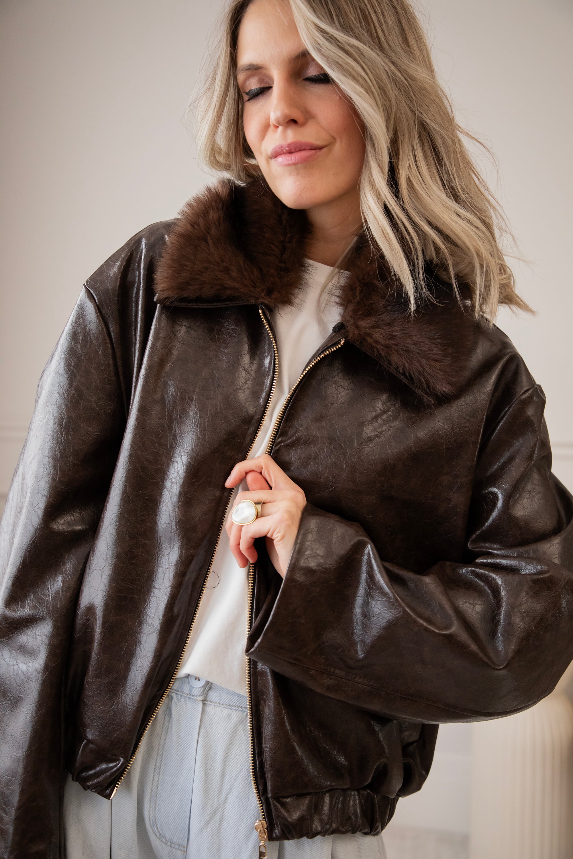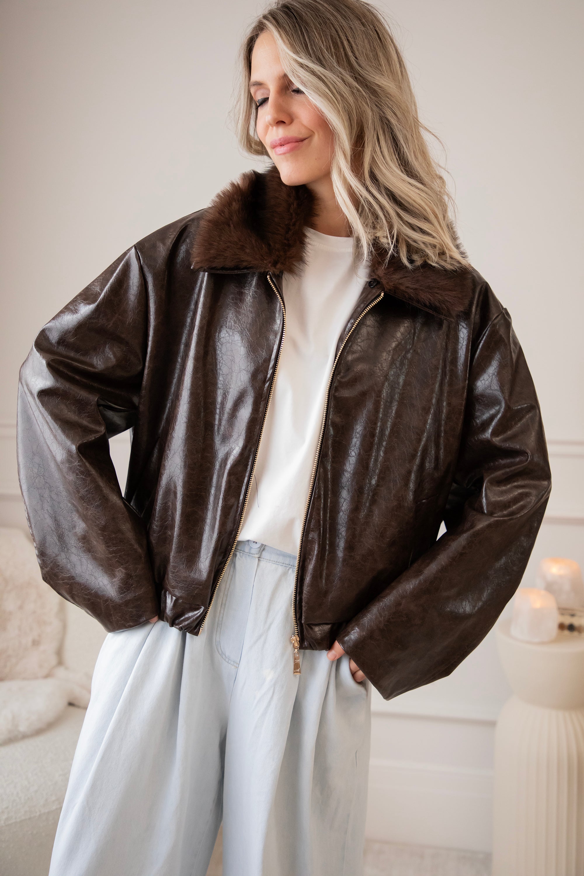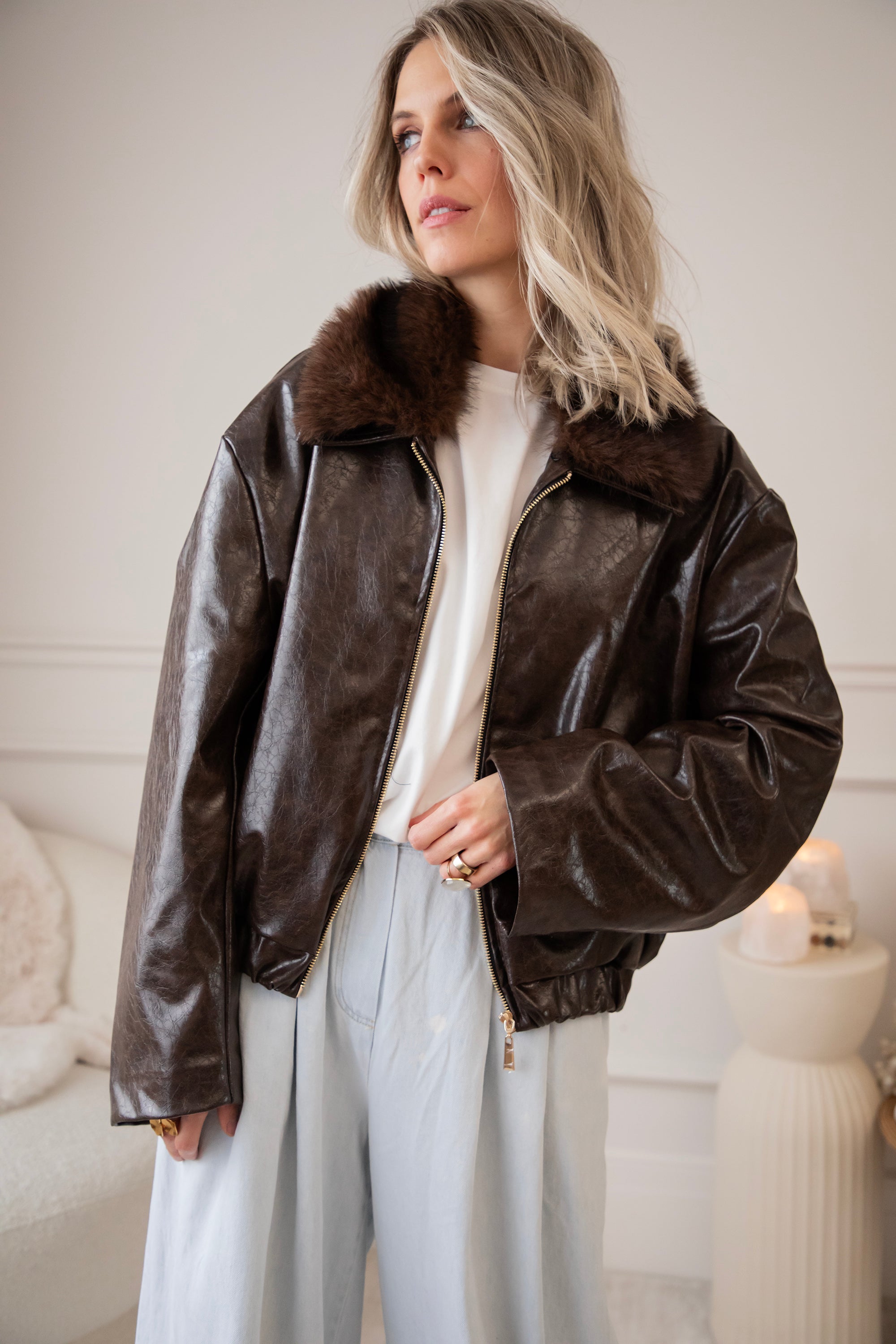 Oehhh wat een stoer exemplaar! Ember Pelt heeft die shiny leather look die meteen opvalt, maar voelt tegelijk heerlijk smooth en zacht aan ✨ Echt zo’n jasje dat er super fancy uitziet zonder in te boeten aan comfort. Het bombermodel met de stretchy onderrand geeft haar die stoerdere vibe, terwijl het afneembare pelskraagje zorgt voor een cozy touch 🤎