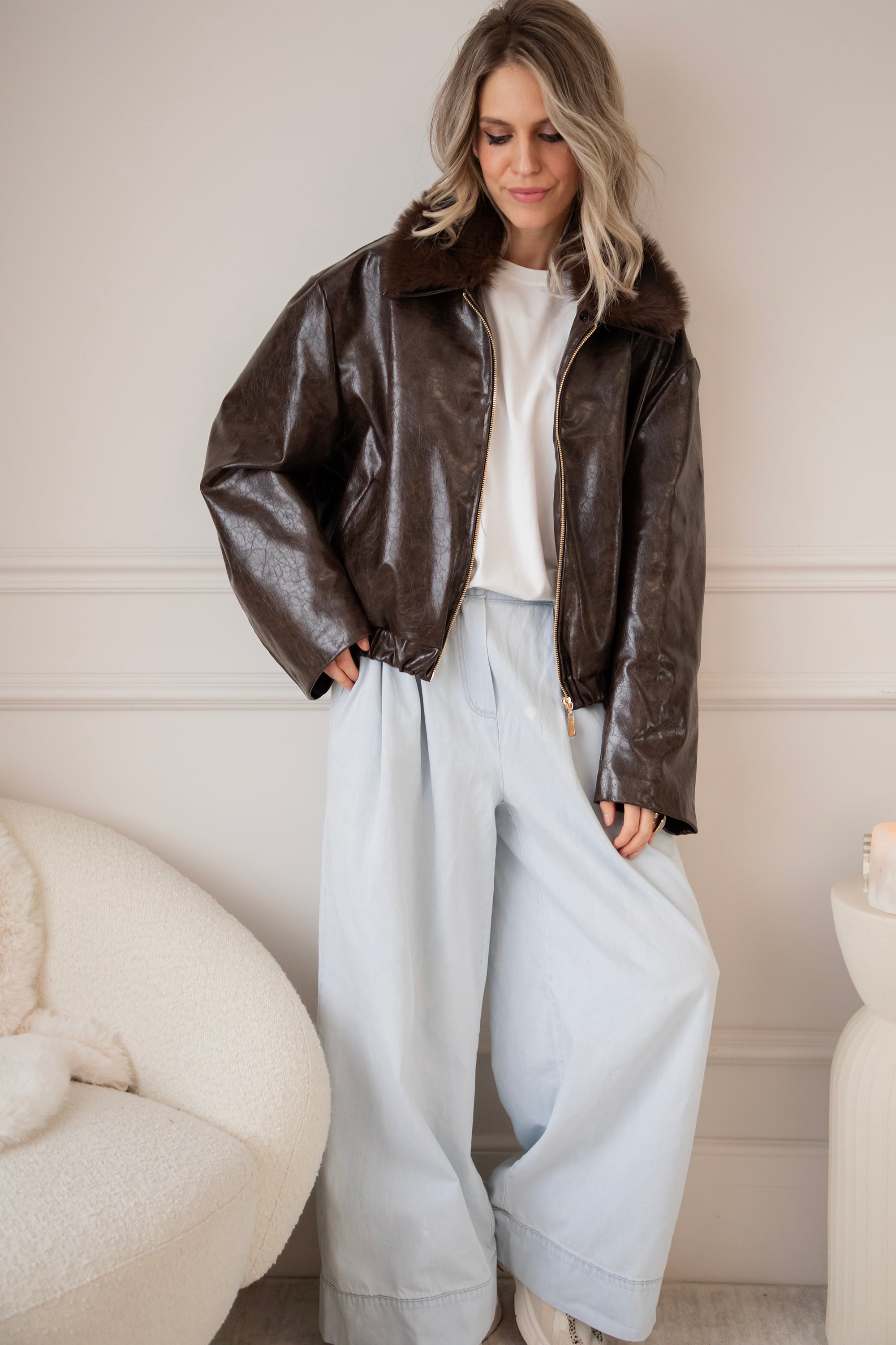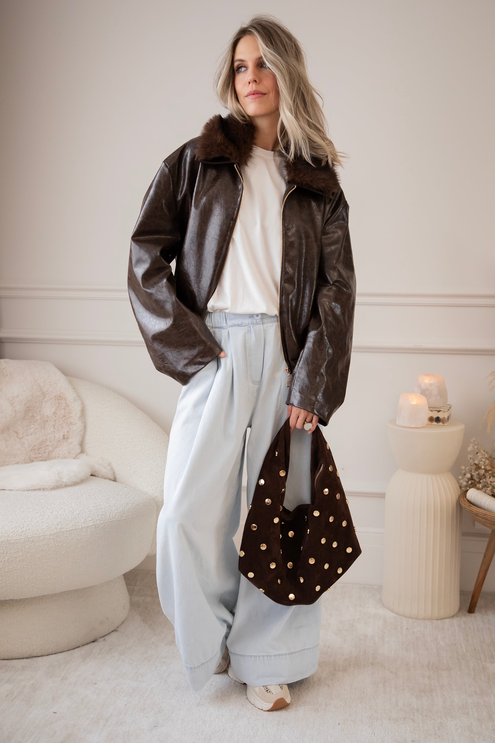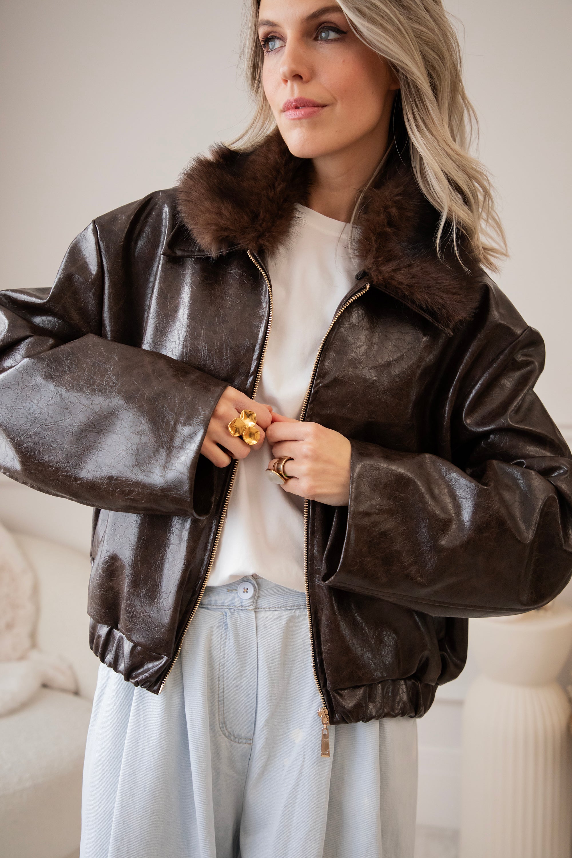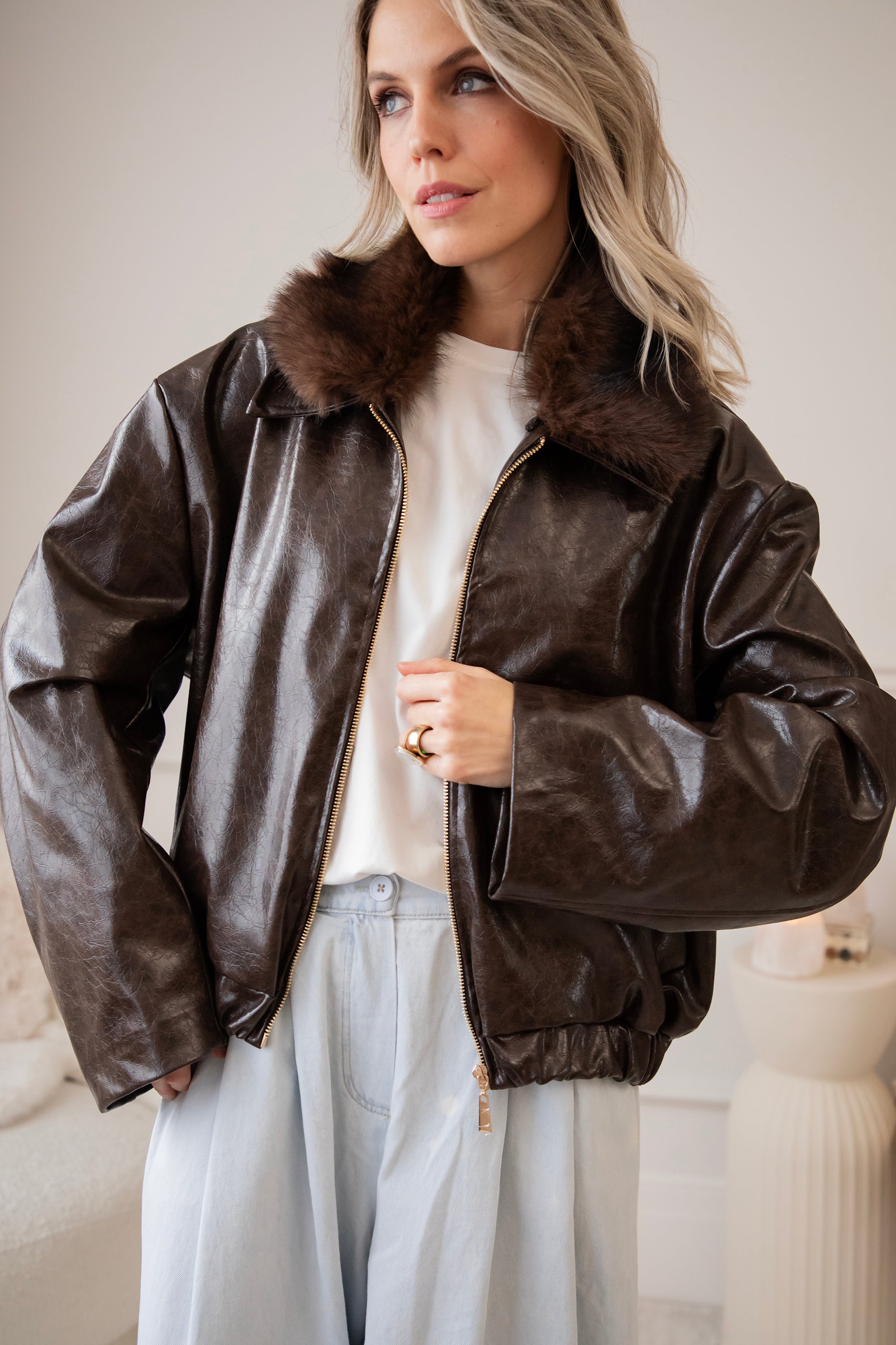 Oehhh wat een stoer exemplaar! Ember Pelt heeft die shiny leather look die meteen opvalt, maar voelt tegelijk heerlijk smooth en zacht aan ✨ Echt zo’n jasje dat er super fancy uitziet zonder in te boeten aan comfort. Het bombermodel met de stretchy onderrand geeft haar die stoerdere vibe, terwijl het afneembare pelskraagje zorgt voor een cozy touch 🤎