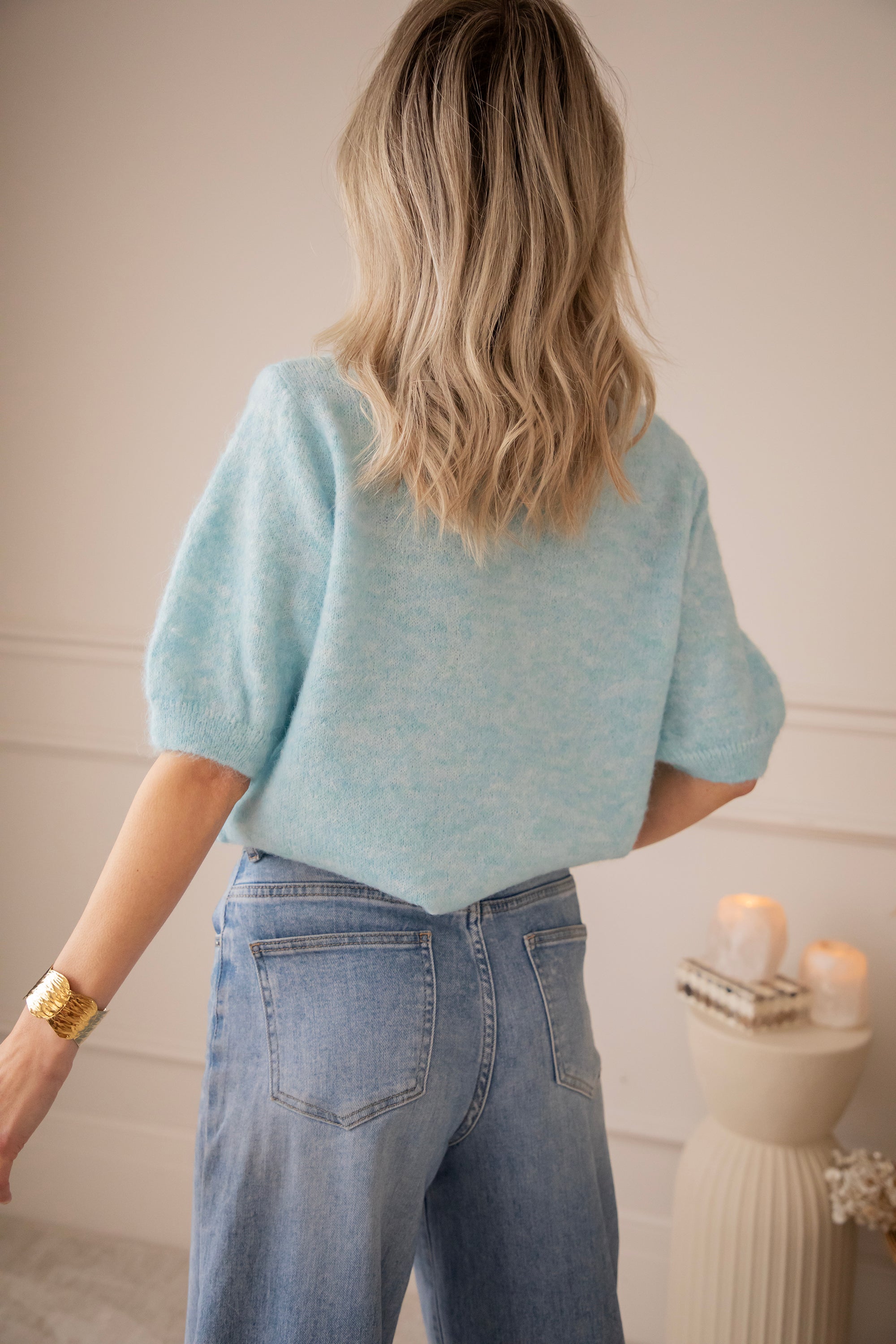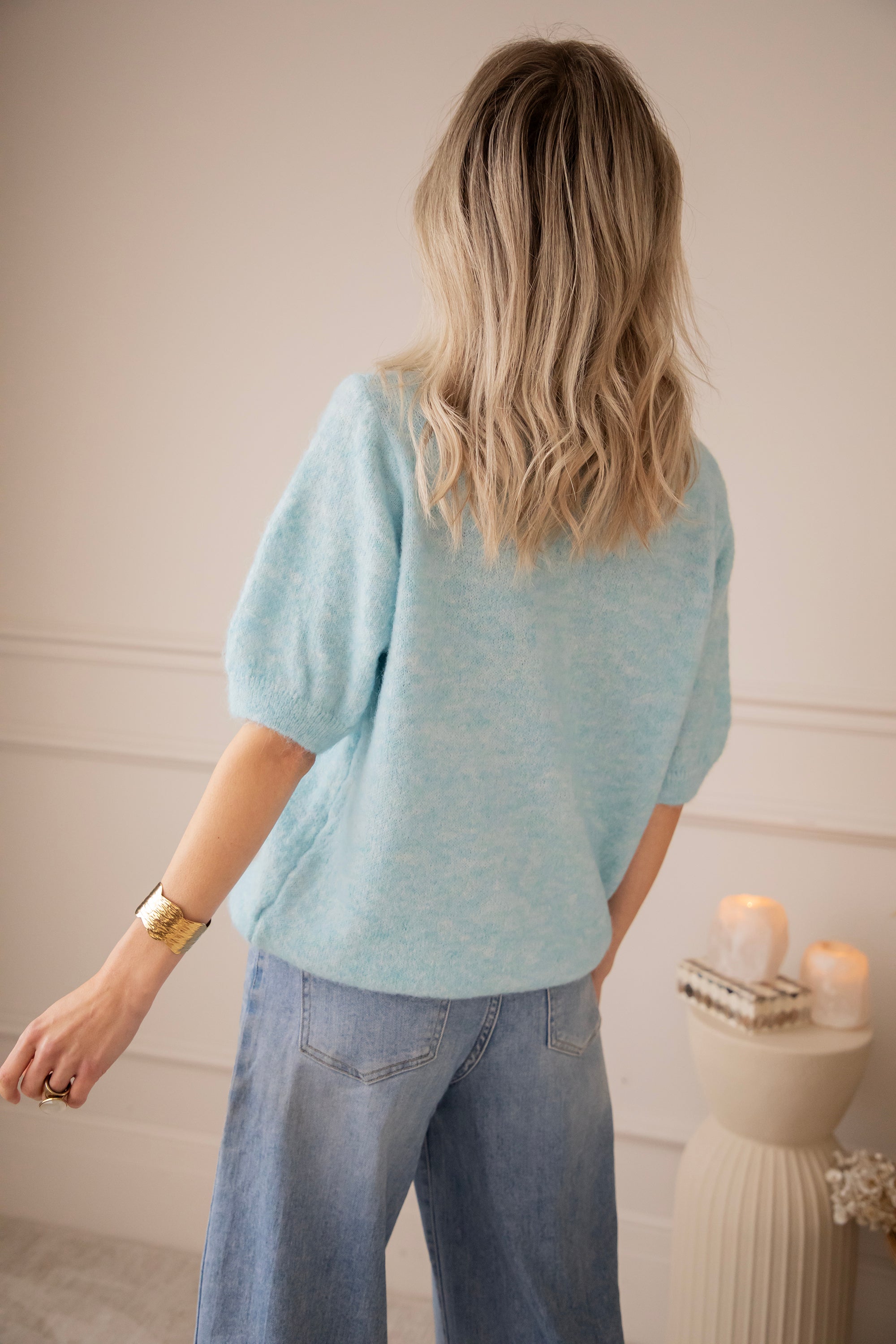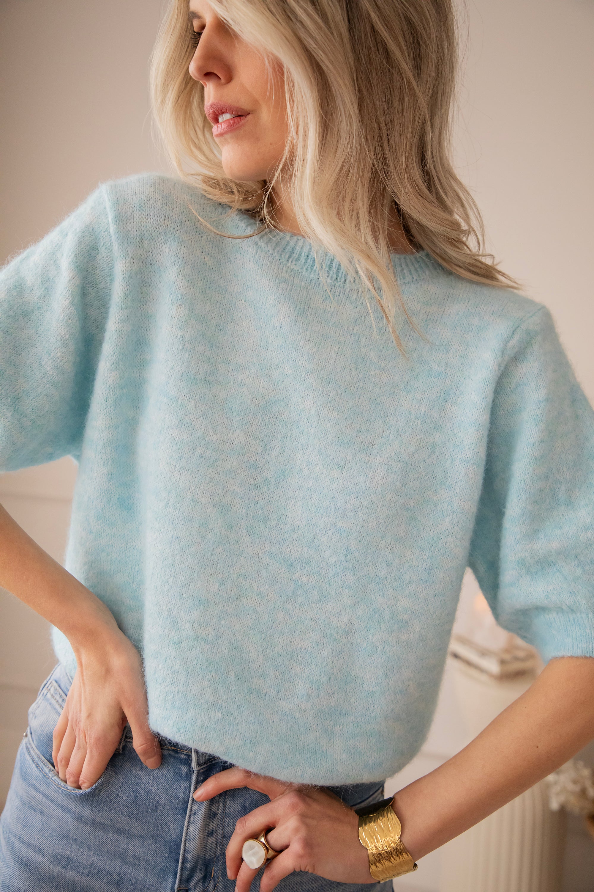 Hoewel ze gebreid is, voelt ze verrassend licht aan, perfect voor de eerste lentedagen. De korte mouwen houden het geheel fris en airy, terwijl de melange kleur haar net dat tikkeltje extra charme geeft ✨