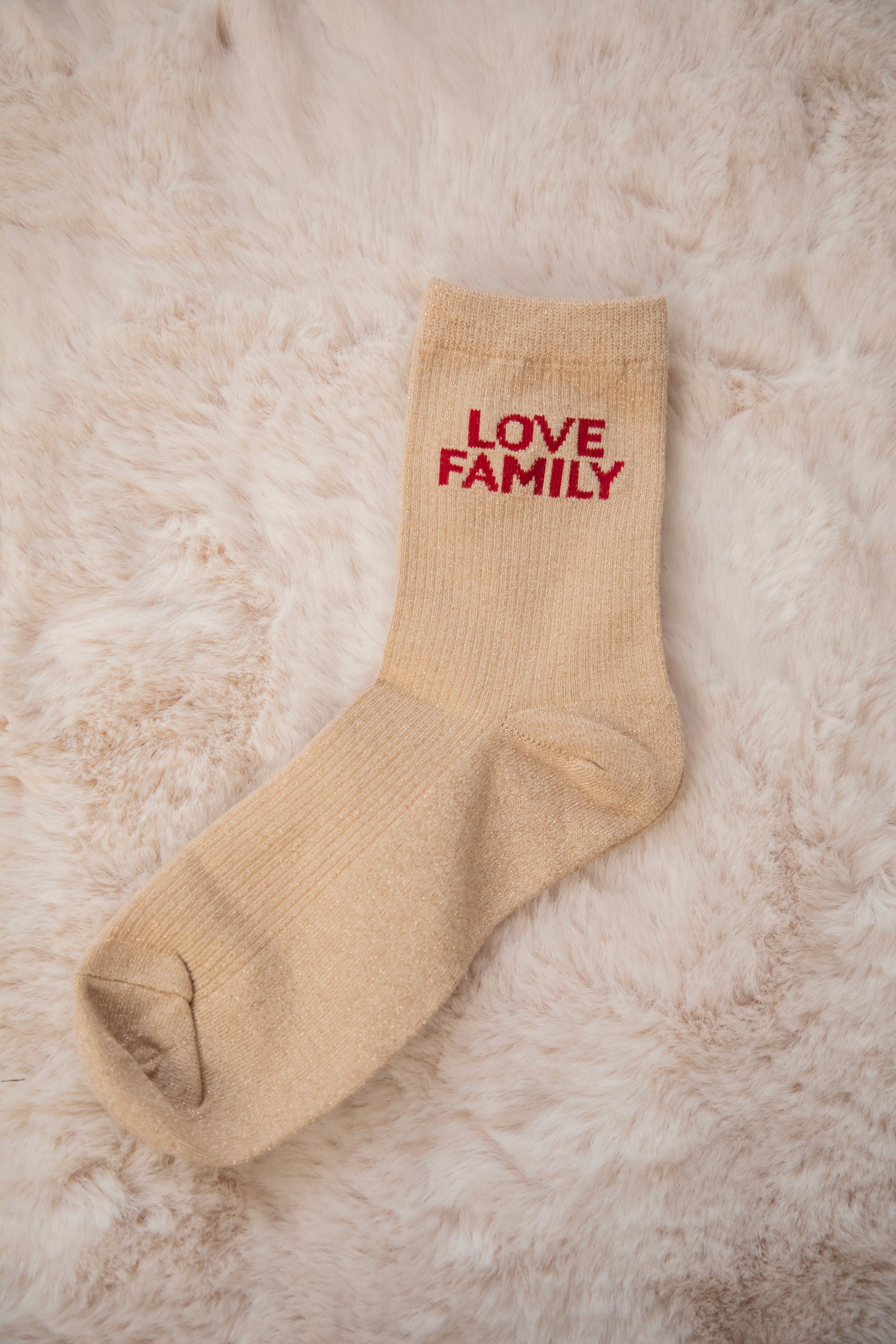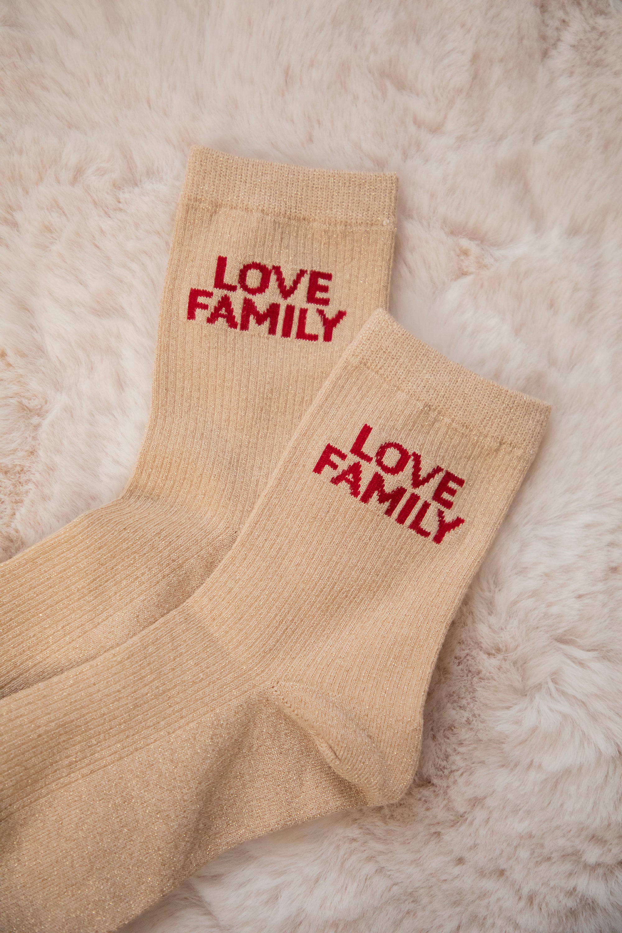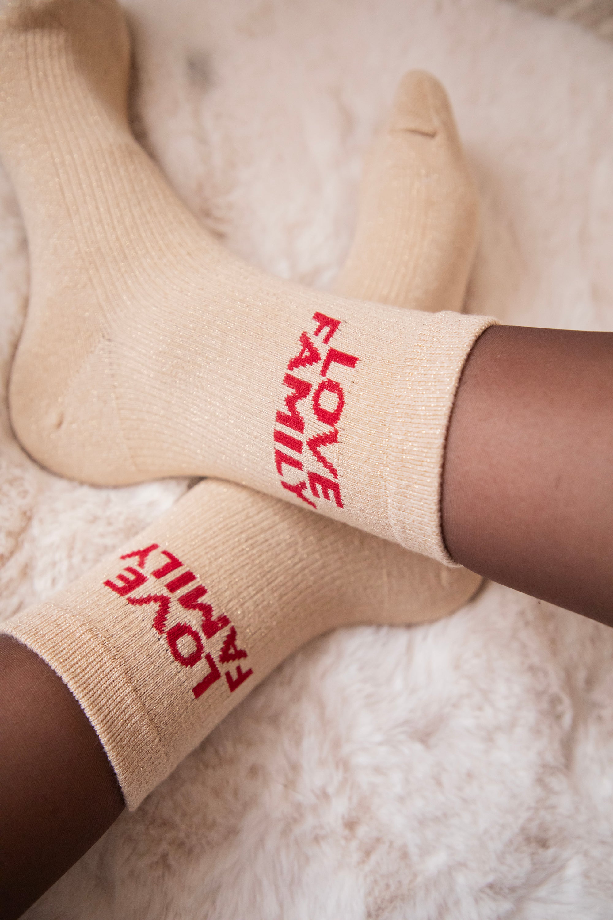 Onze FAMILY LOVE sokken zijn echt zo’n klein, hartverwarmend accessoire dat je outfit net dat tikkeltje specialer maakt. De beige kleur met bordeaux letters en een subtiel goud glittertje geeft ze die cosy, liefdevolle vibe - een reminder aan de mensen die je het meest dierbaar zijn ❤️