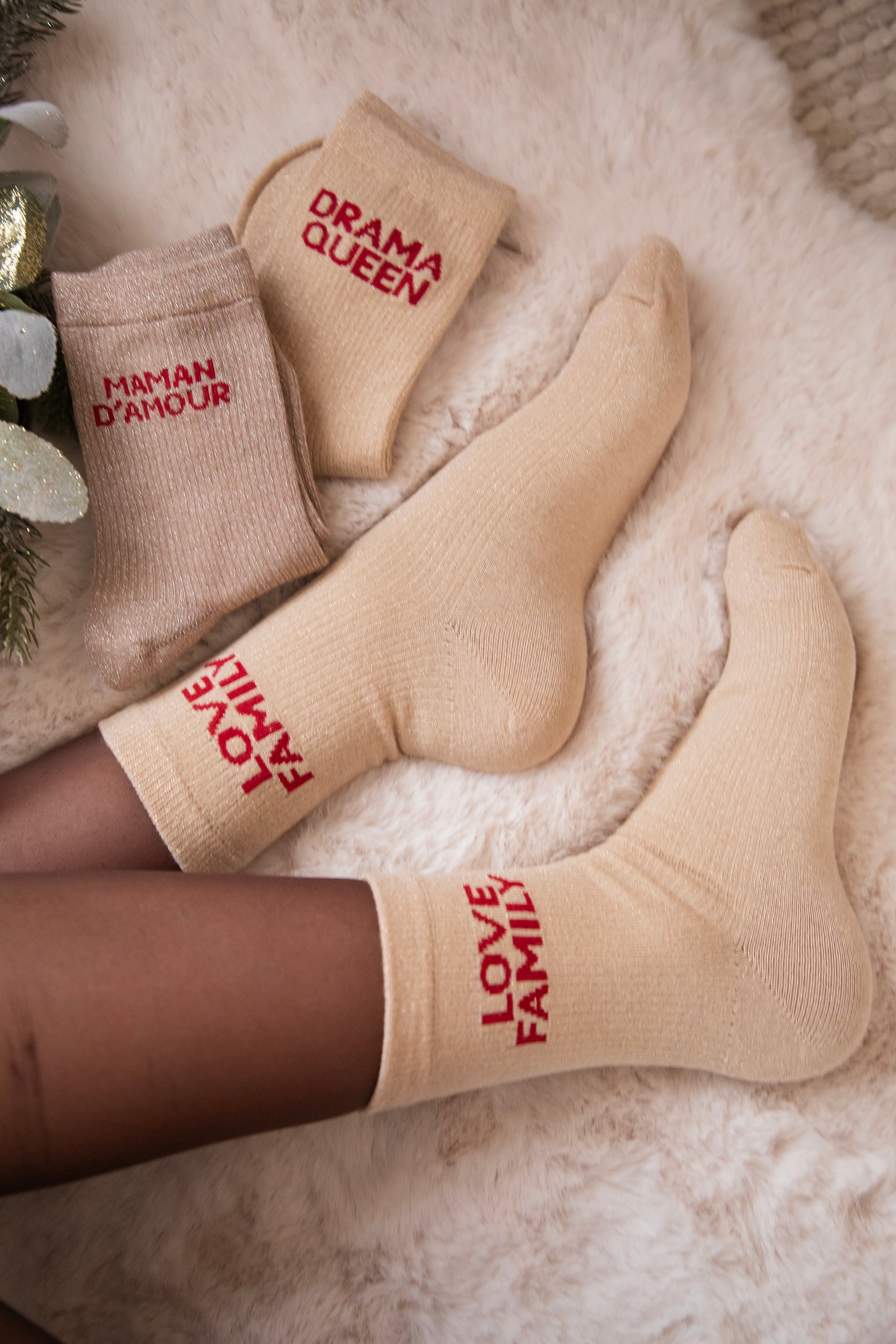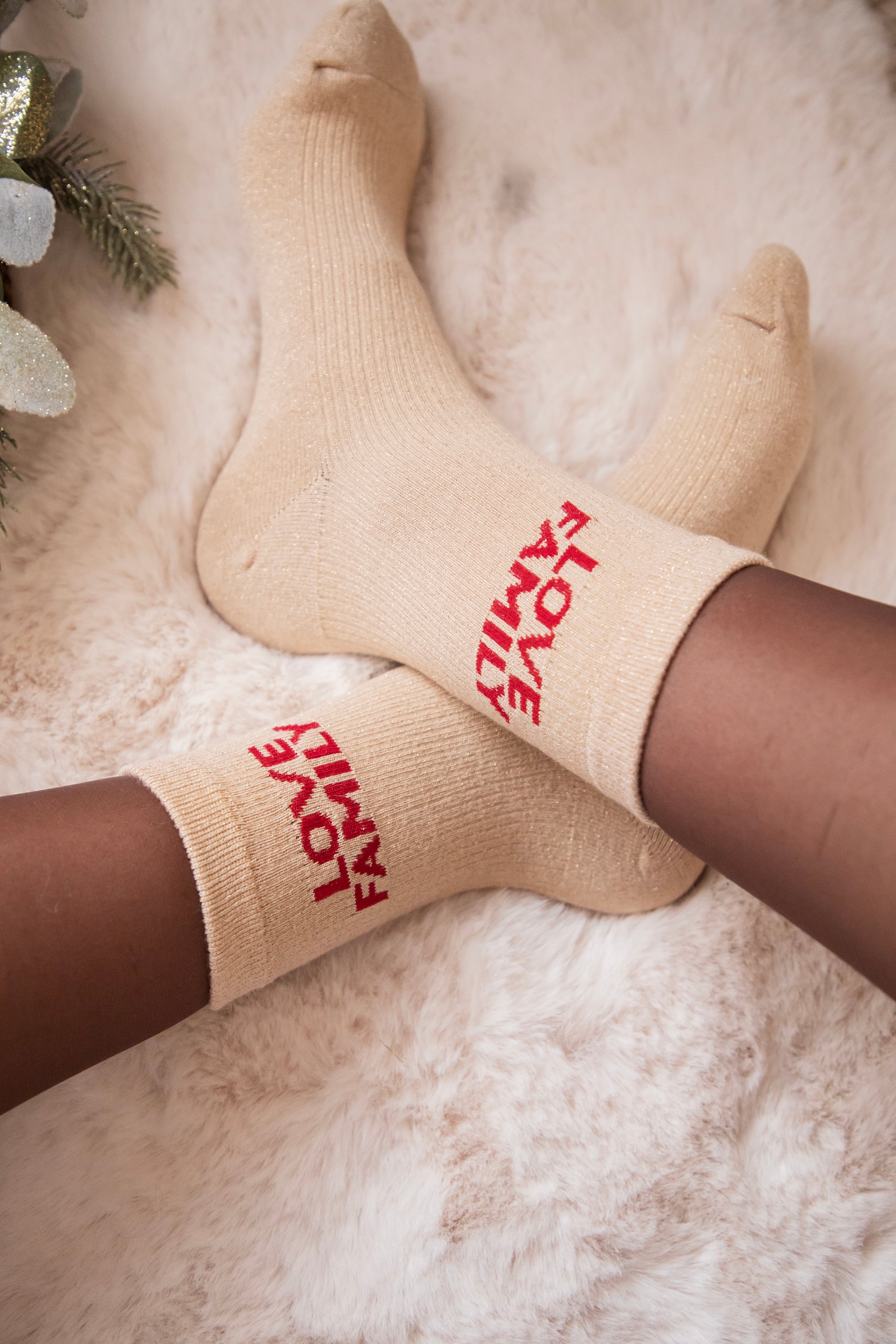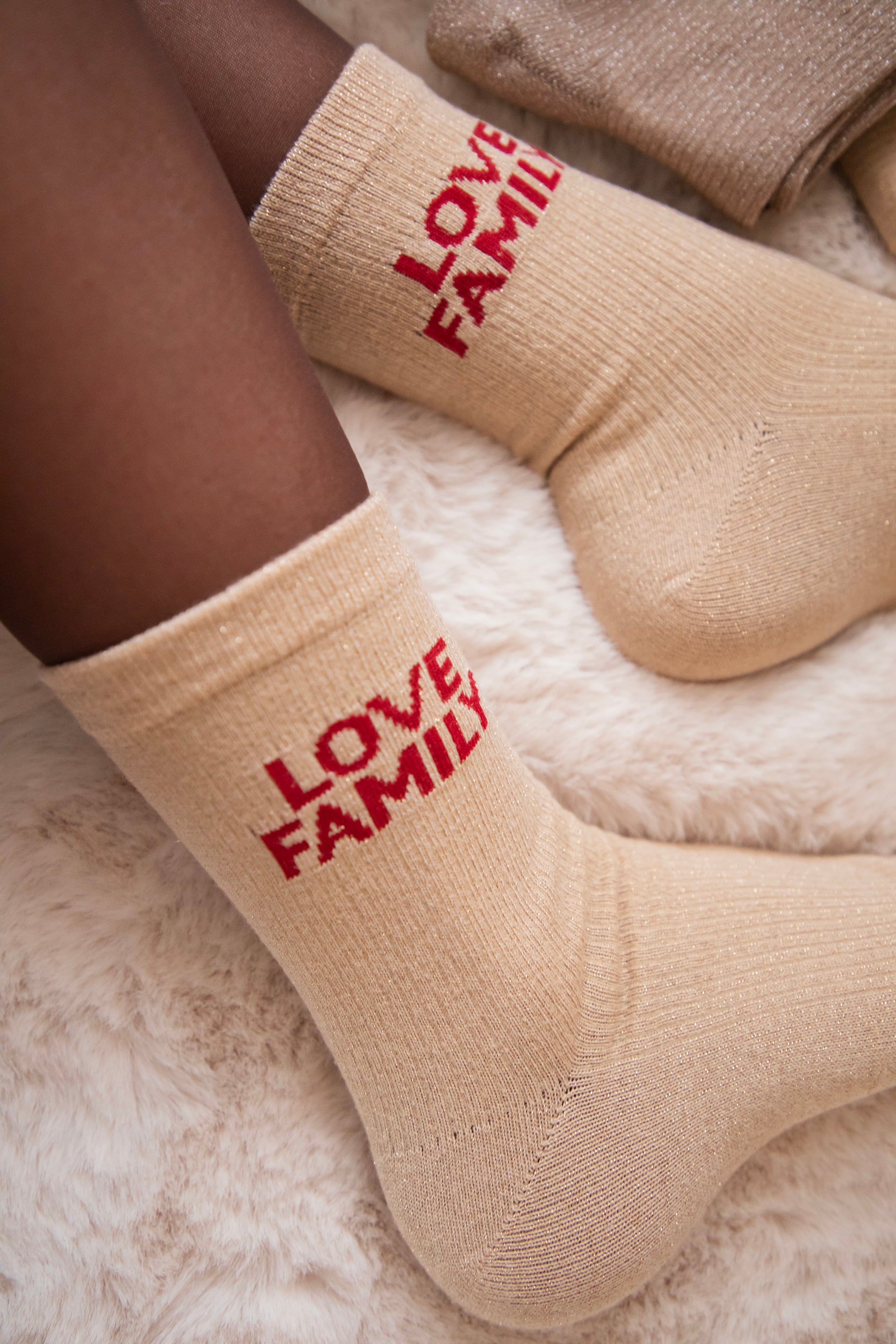 Onze FAMILY LOVE sokken zijn echt zo’n klein, hartverwarmend accessoire dat je outfit net dat tikkeltje specialer maakt. De beige kleur met bordeaux letters en een subtiel goud glittertje geeft ze die cosy, liefdevolle vibe - een reminder aan de mensen die je het meest dierbaar zijn ❤️
