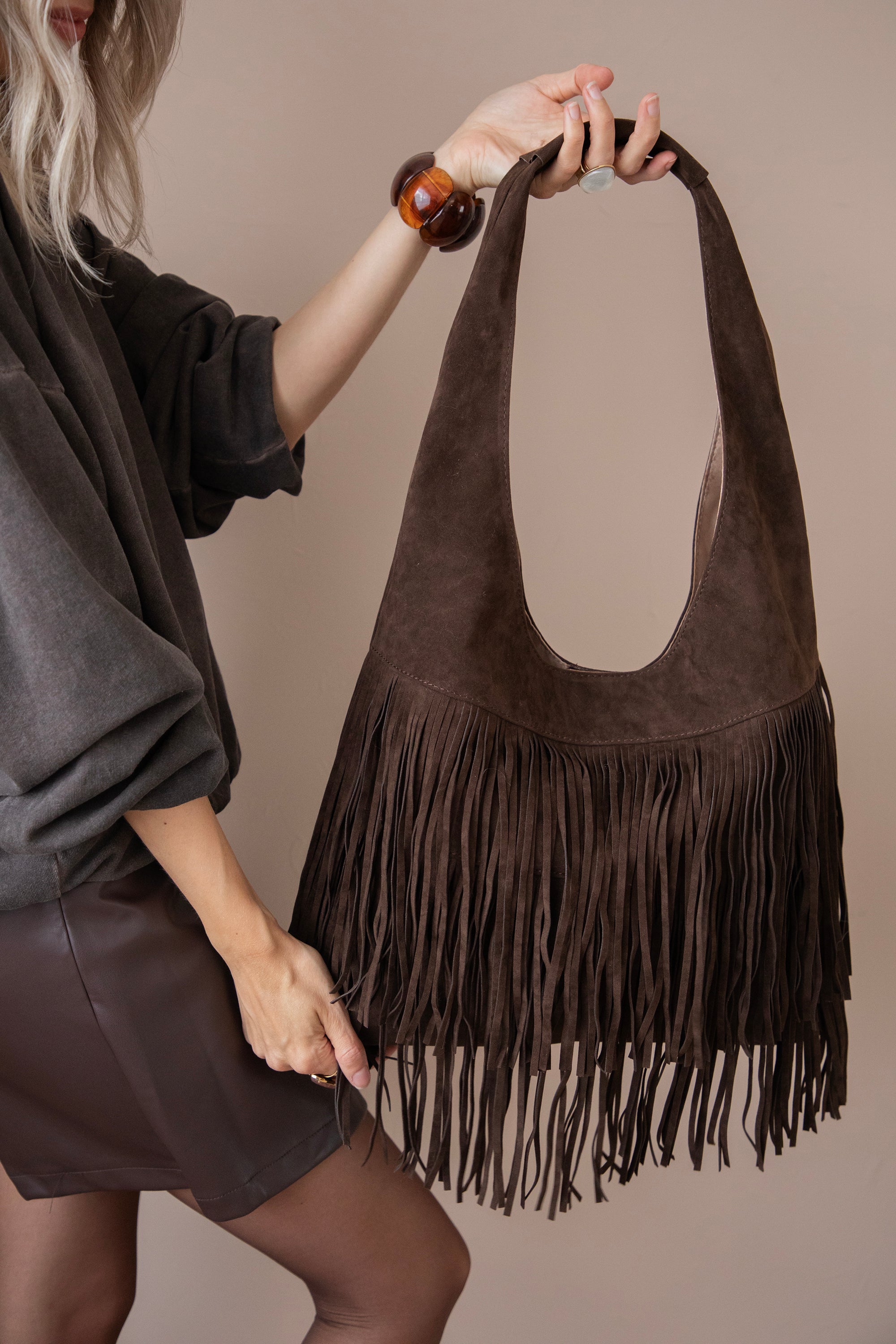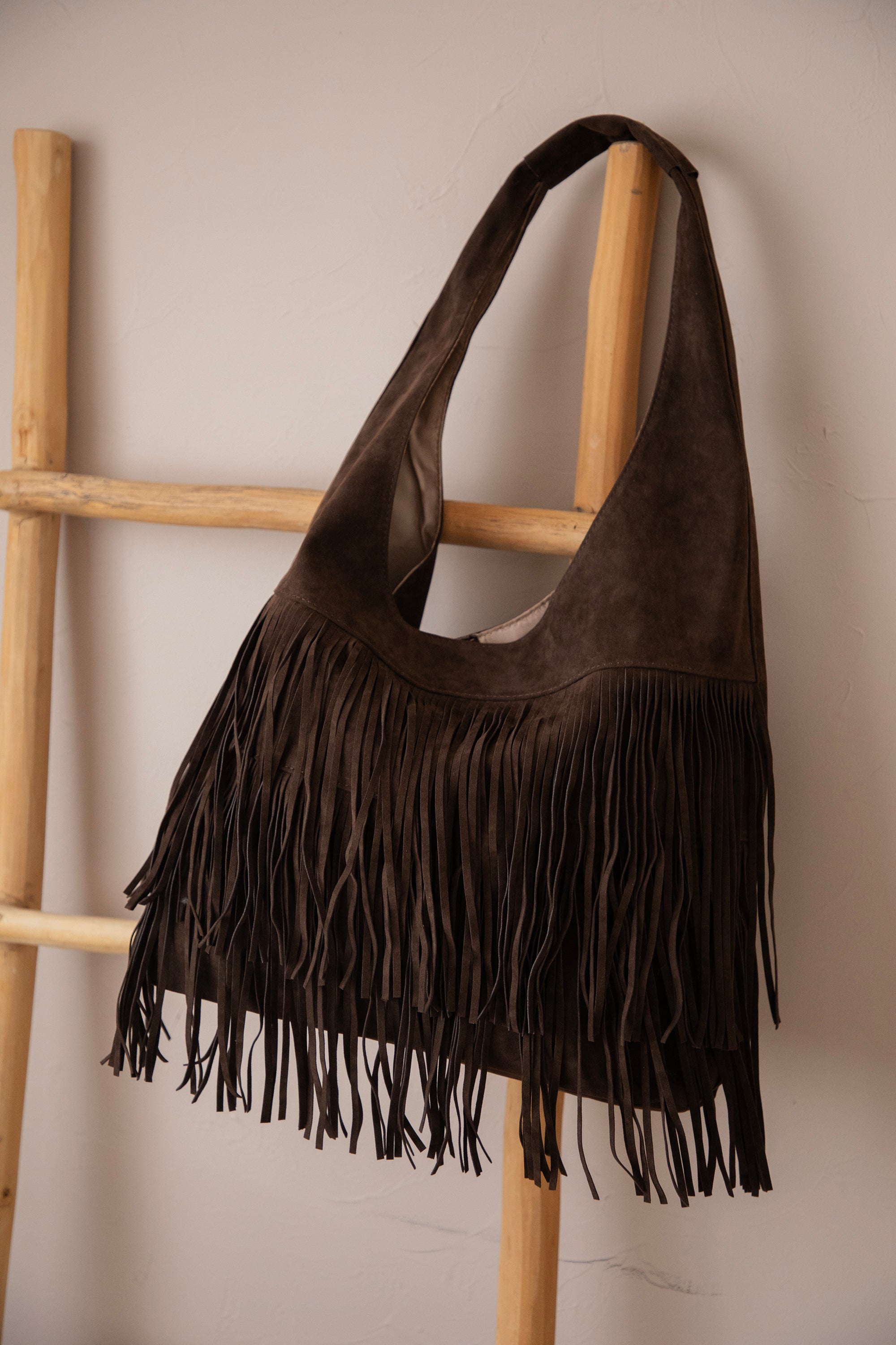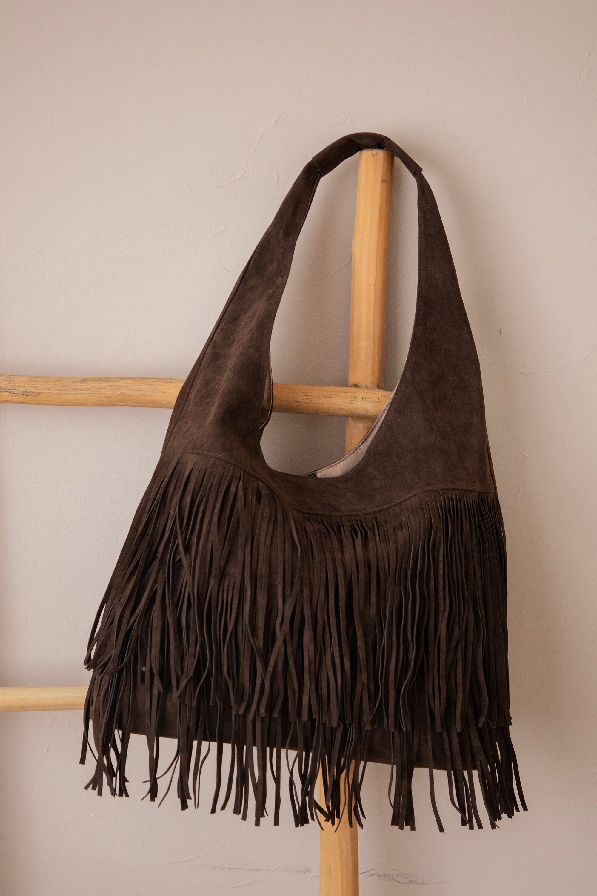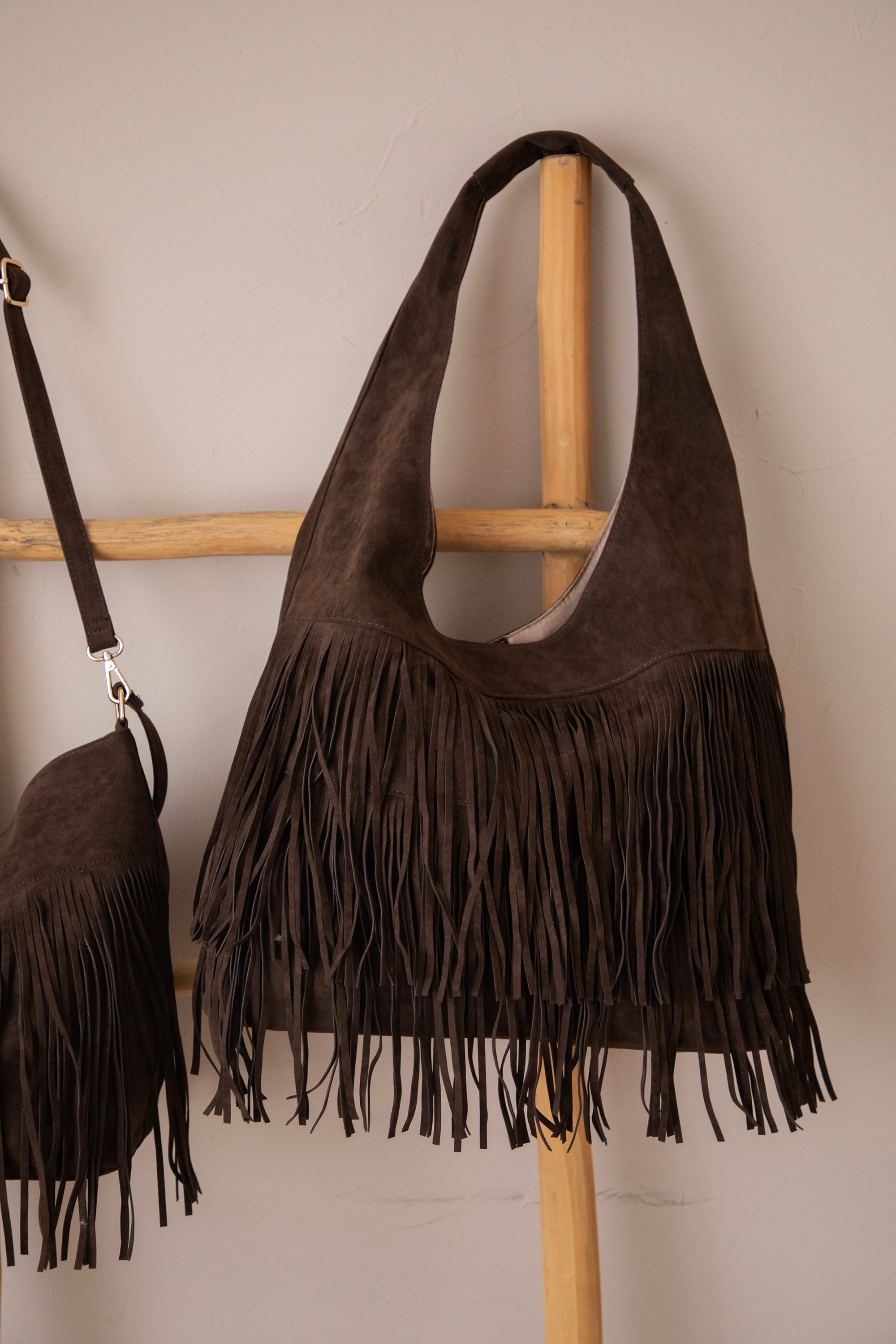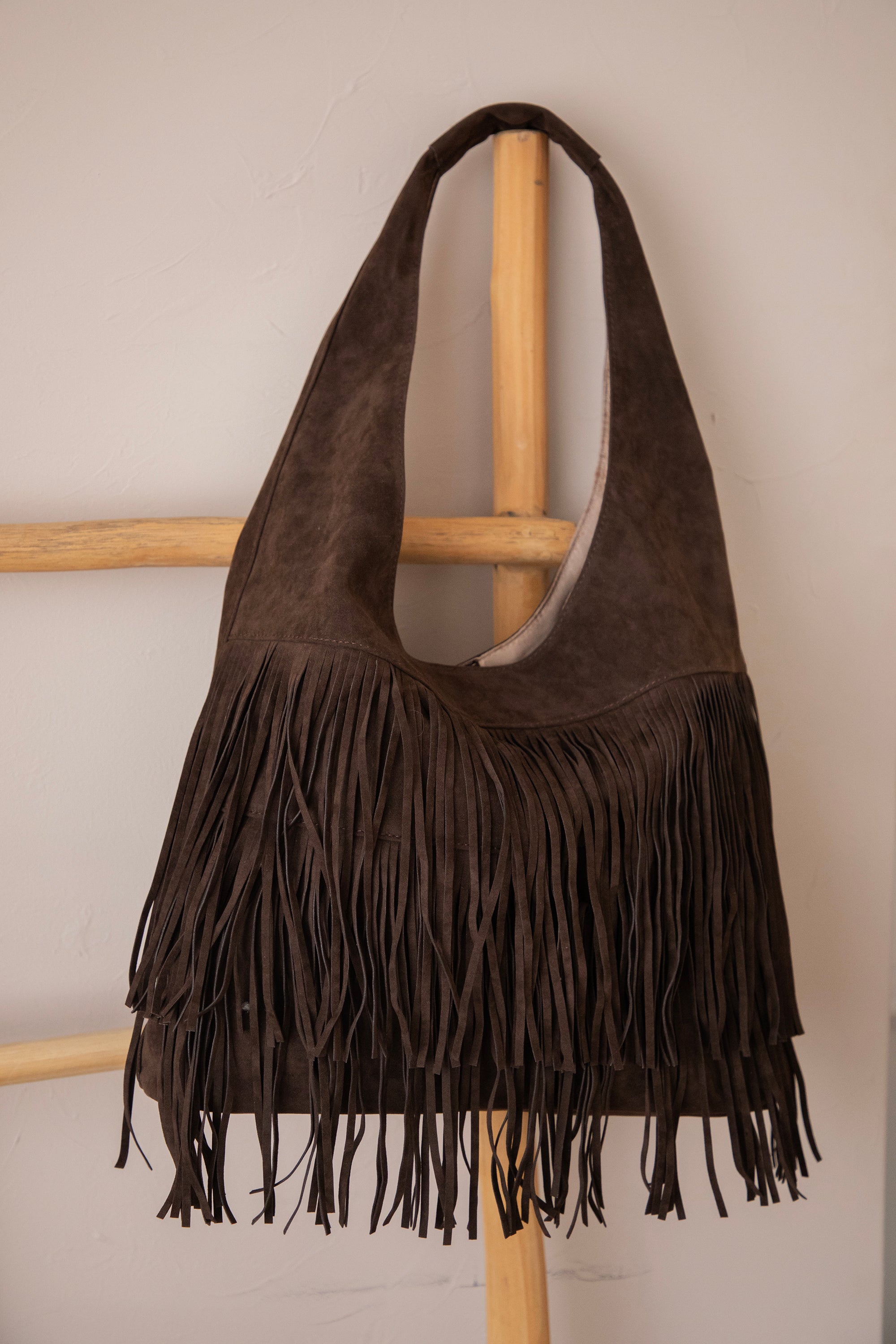 Ontdek de Farah Fringe, dé suède handtas die dit seizoen niet mag ontbreken! 🤎 De voorkant is versierd met speelse laagjes fringes, wat de tas die leuke bohemian touch geeft. Perfect om je outfit net dat beetje extra flair te geven, zonder dat het te druk wordt.