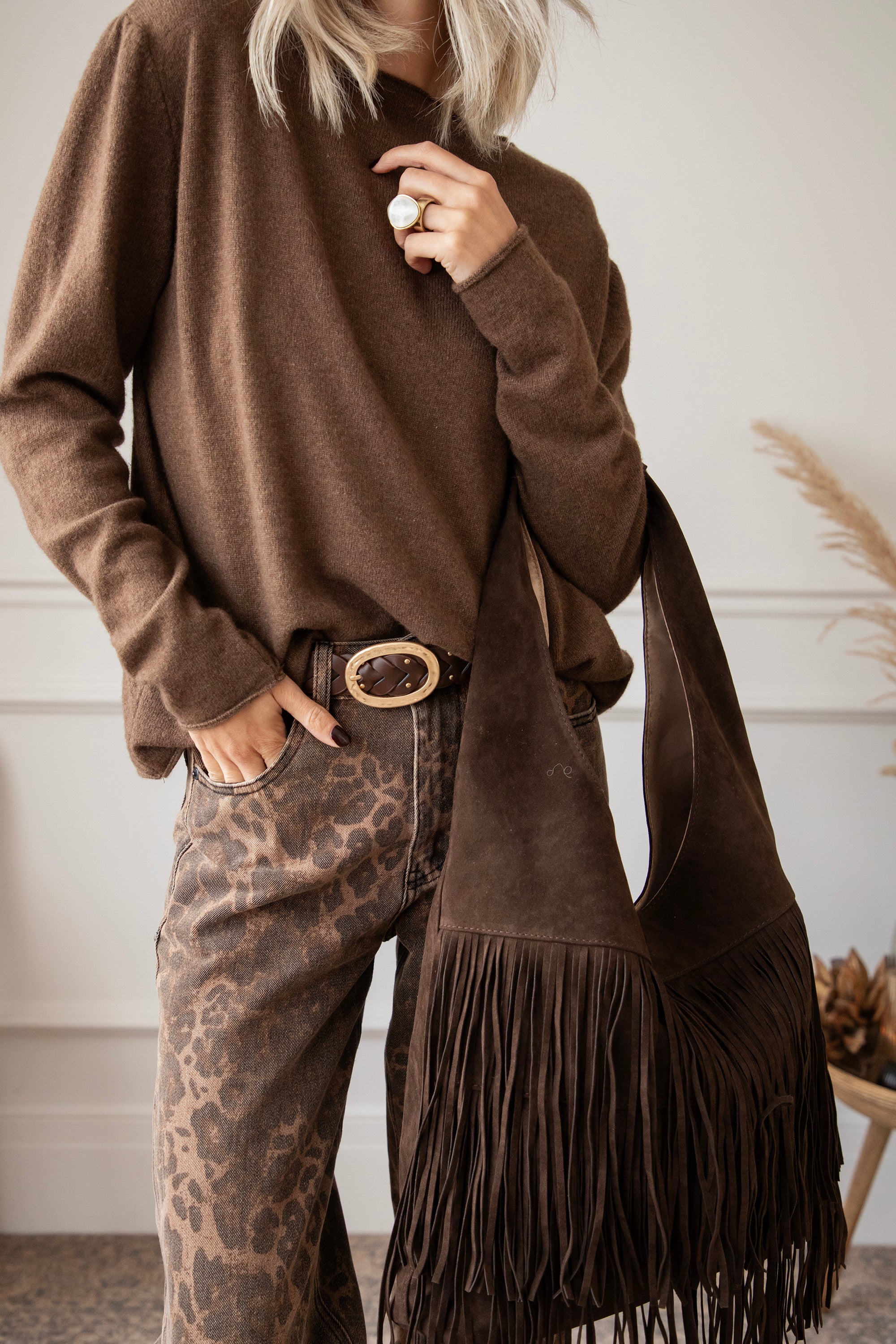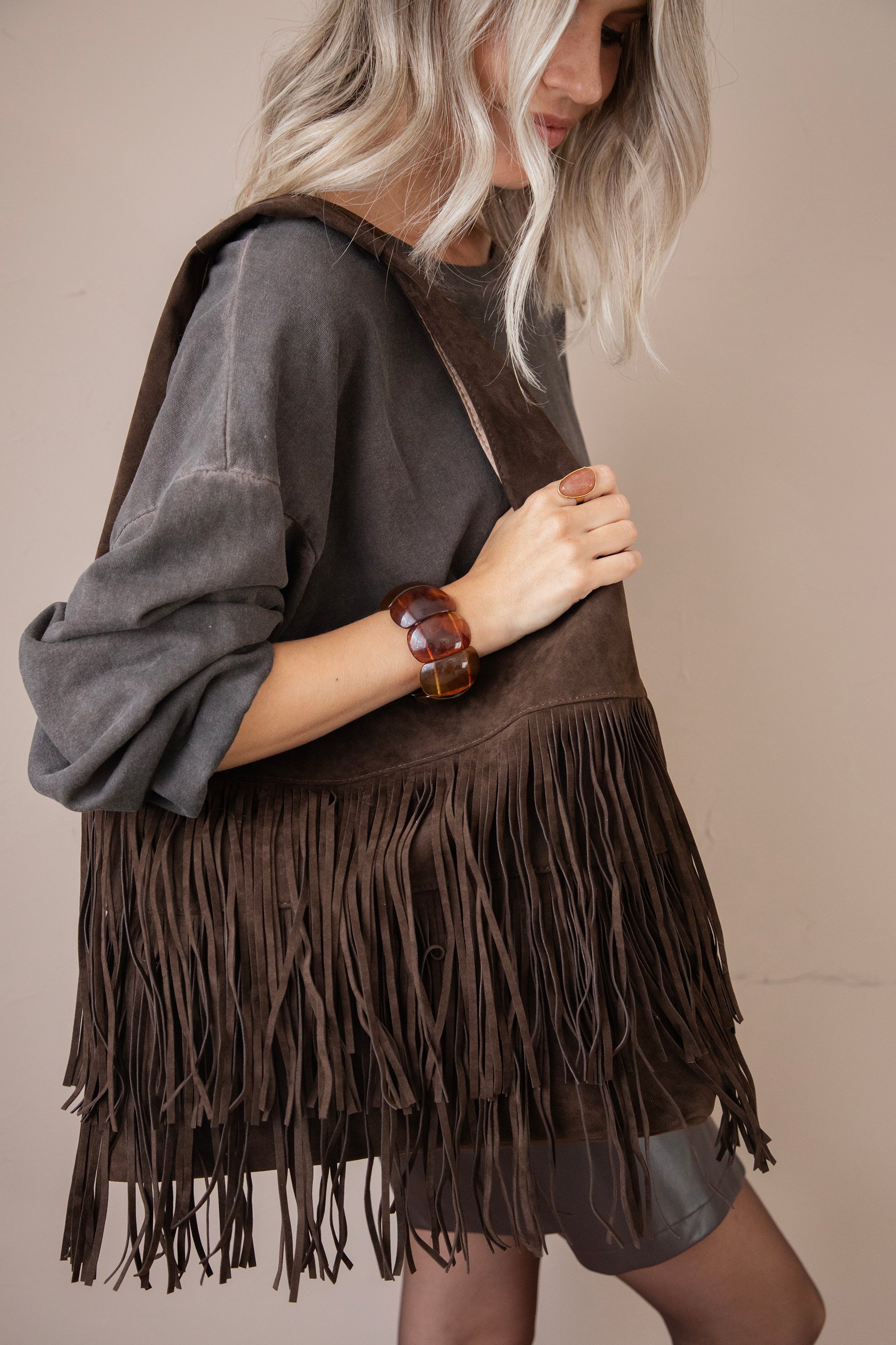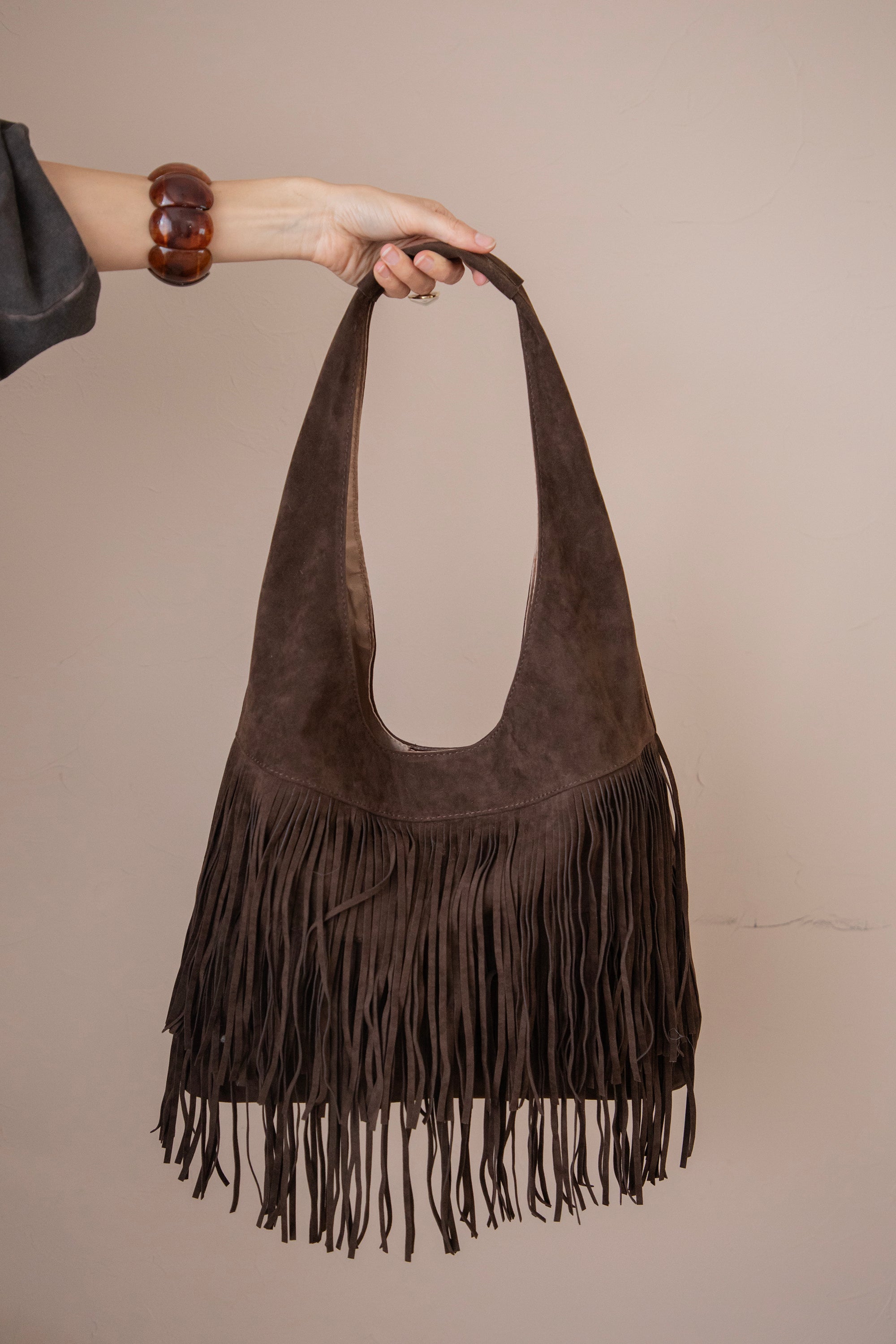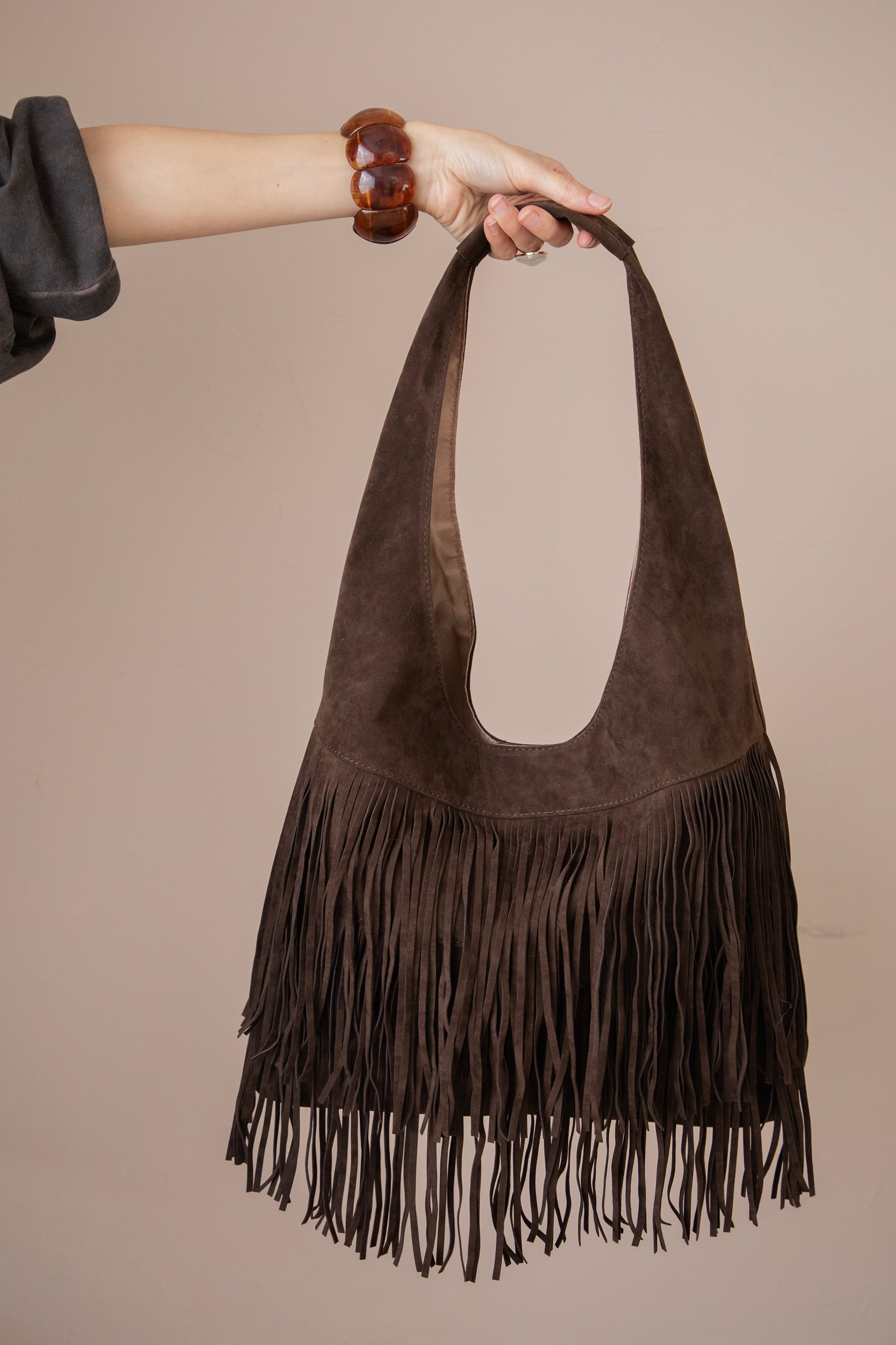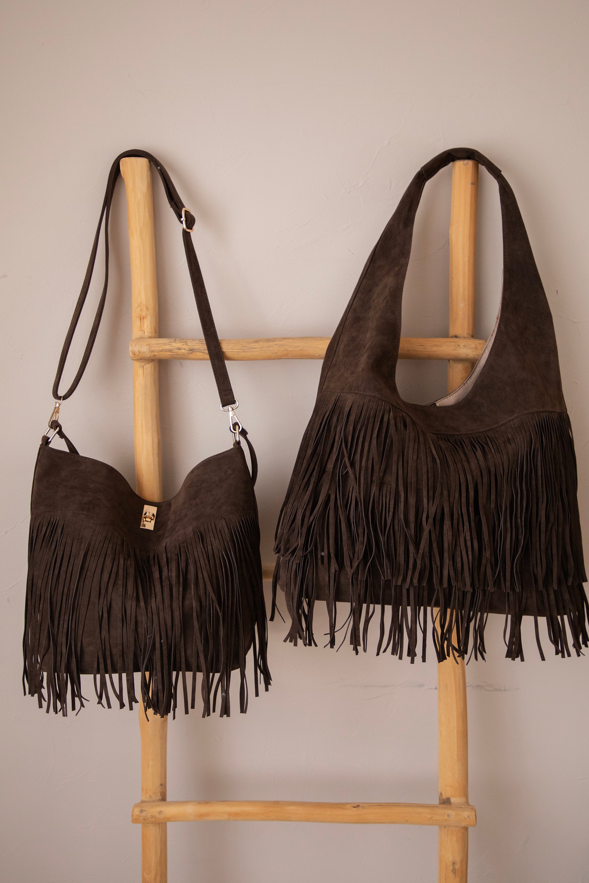 Ontdek de Farah Fringe, dé suède handtas die dit seizoen niet mag ontbreken! 🤎 De voorkant is versierd met speelse laagjes fringes, wat de tas die leuke bohemian touch geeft. Perfect om je outfit net dat beetje extra flair te geven, zonder dat het te druk wordt.