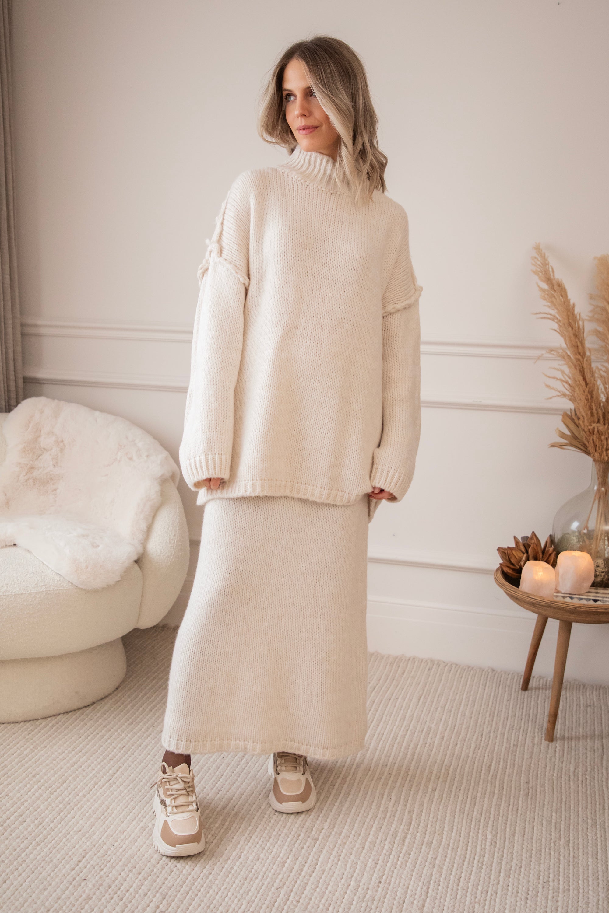 Femmy is echt één van mijn favoriete combi sets voor deze winter ❄️ Dit is 100% winterproof, dus koud weer? Geen probleem! 😍 De set bestaat uit een lange, baggy trui en een maxi rok, beide gemaakt van dat heerlijke zachte acryl breiwerk 🧶 Het voelt zo comfy en warm, echt een set die je omarmt op de koudste dagen.