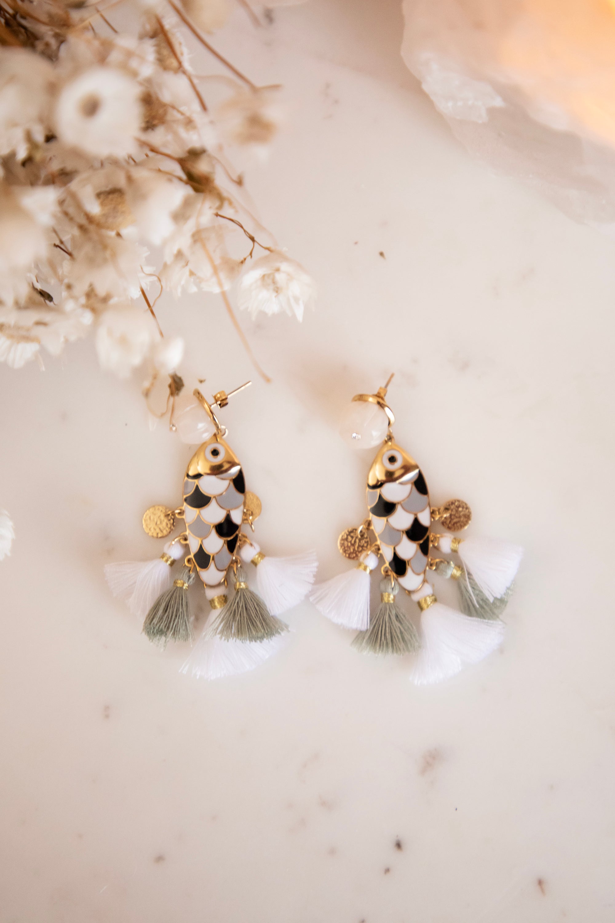 De sluiting is een schattig beige bloemetje met een klein diamantje ✨ Onder de visjes bungelen nog gouden muntjes en zachte kwastjes, wat zorgt voor een speels, bewegend effect. Echt een vrolijke statement oorbel die je look meteen opfleurt!