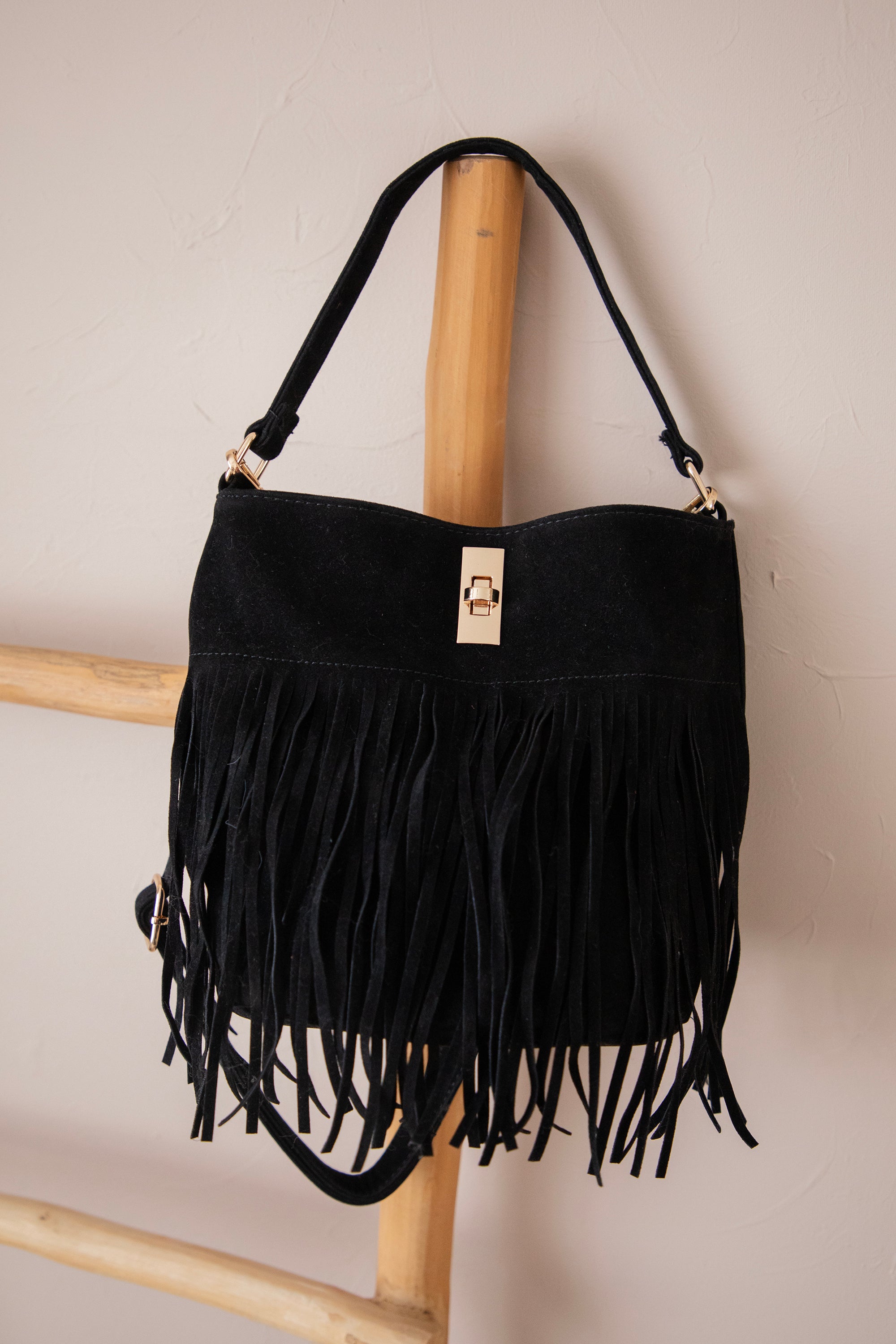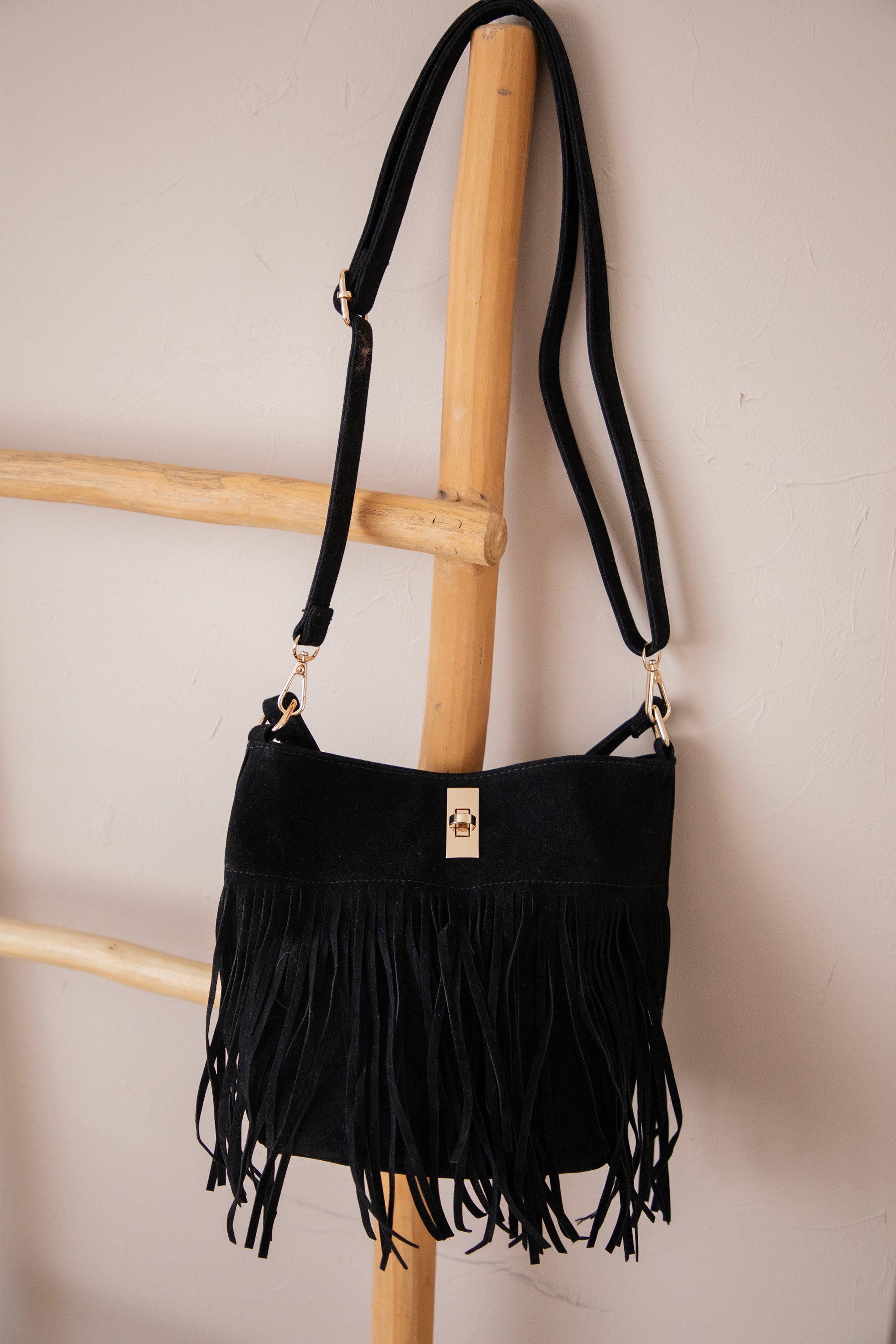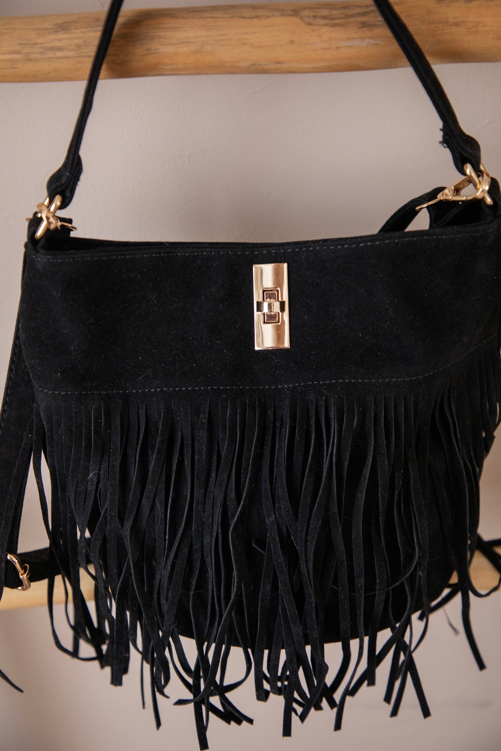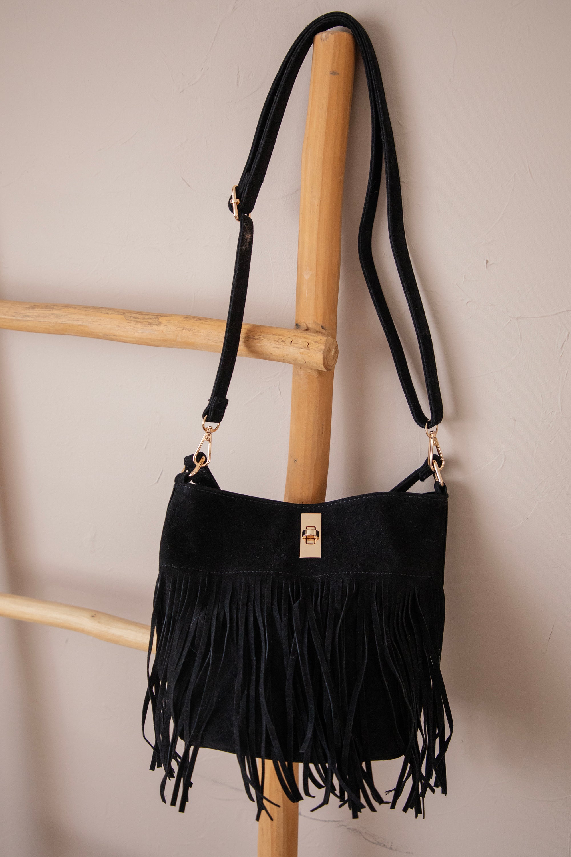 Het zwarte suĆØde voelt heerlijk soepel aan en geeft de tas een luxueuze uitstraling, terwijl de speelse franjes zorgen voor die echte bohemian western vibe. Het is een tas die met je meebeweegt, letterlijk Ć©n figuurlijk, want de franjes dansen zo vrolijk mee, yihaaaa! š De fringes zie je maar aan een kant.Ā