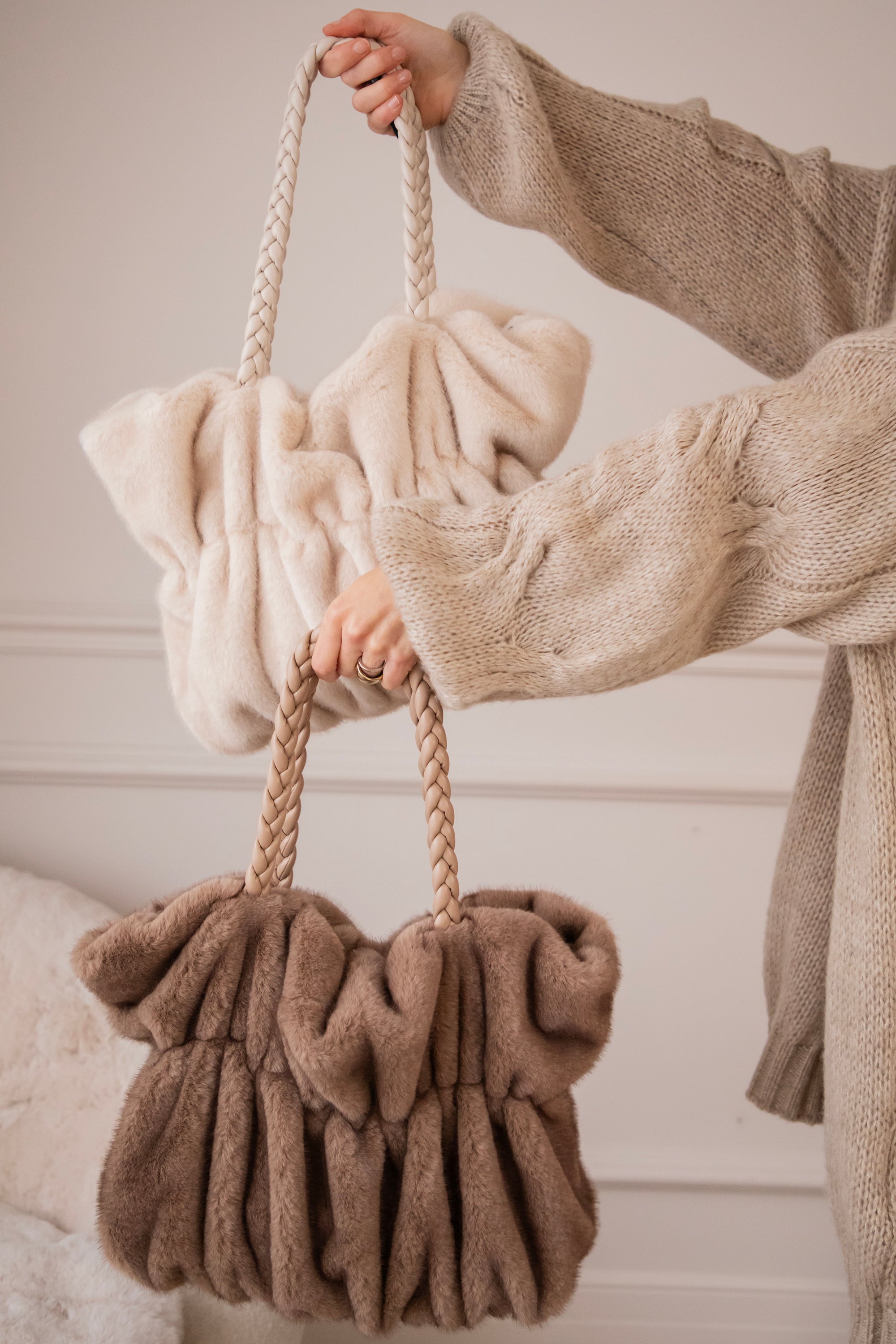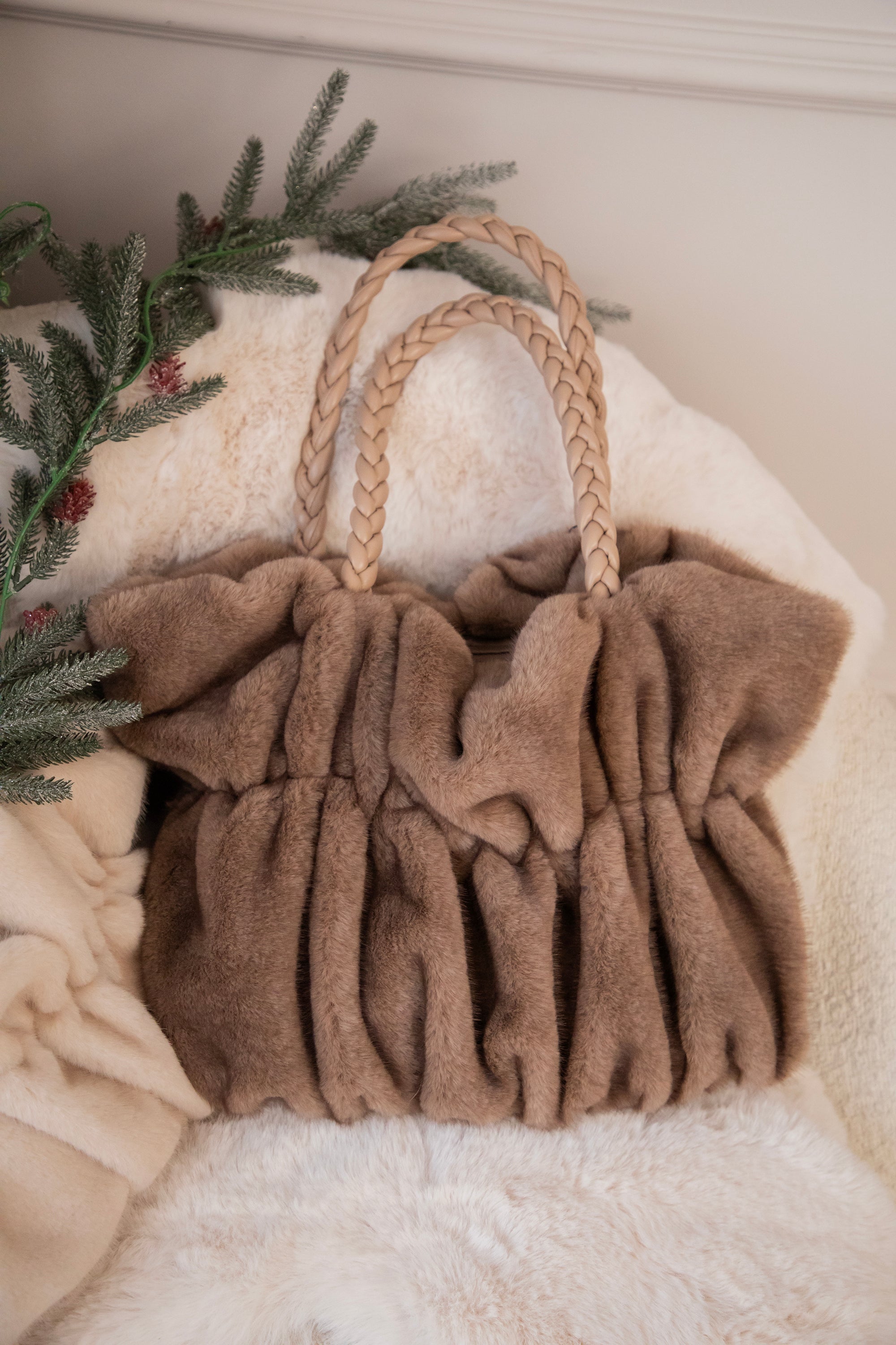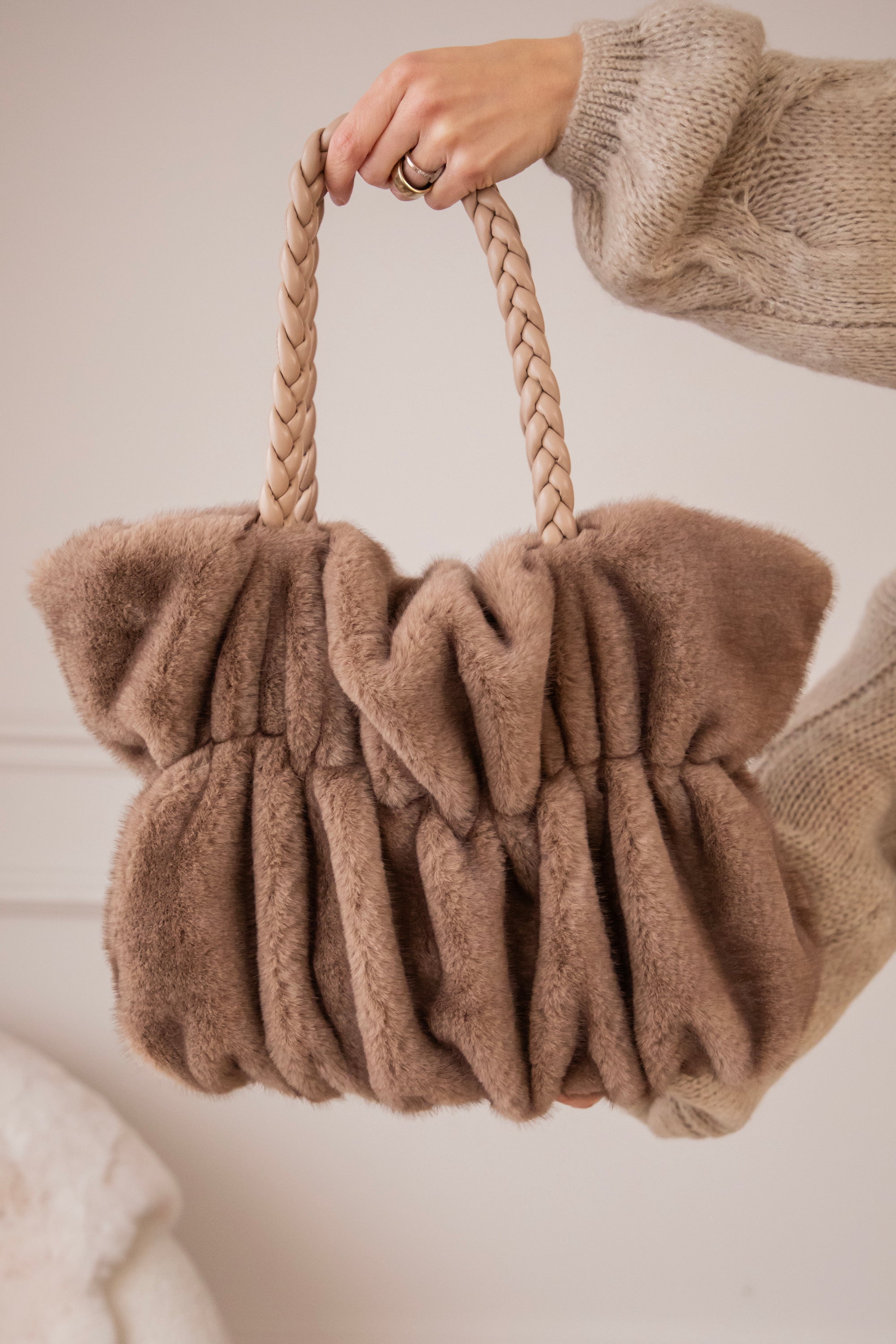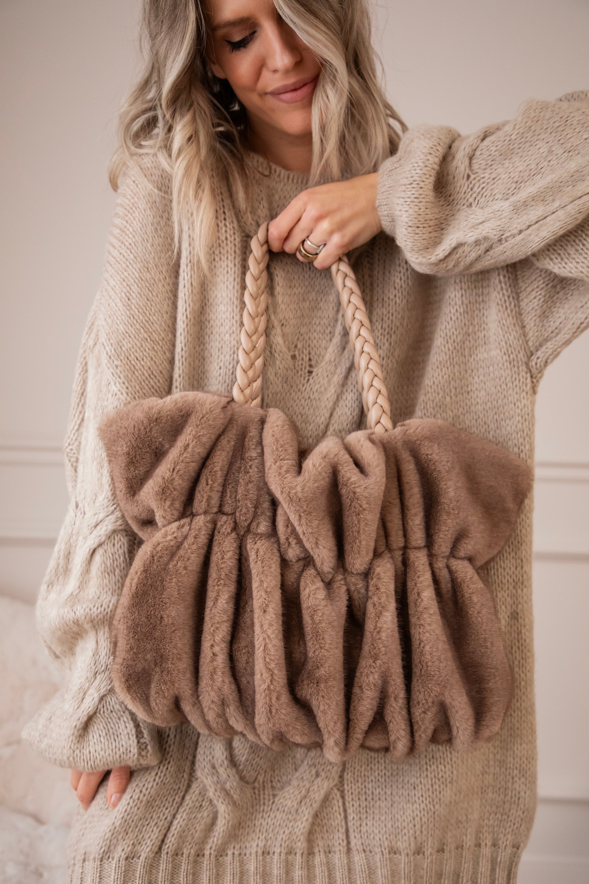 Die frowned look geeft haar een speels kantje, en het faux fur maakt alles lekker zacht en cozy. De gevlochten PU-leren handvaten vind ik zelf ook echt een mooi detail, dat maakt het geheel net iets stijlvoller ✨