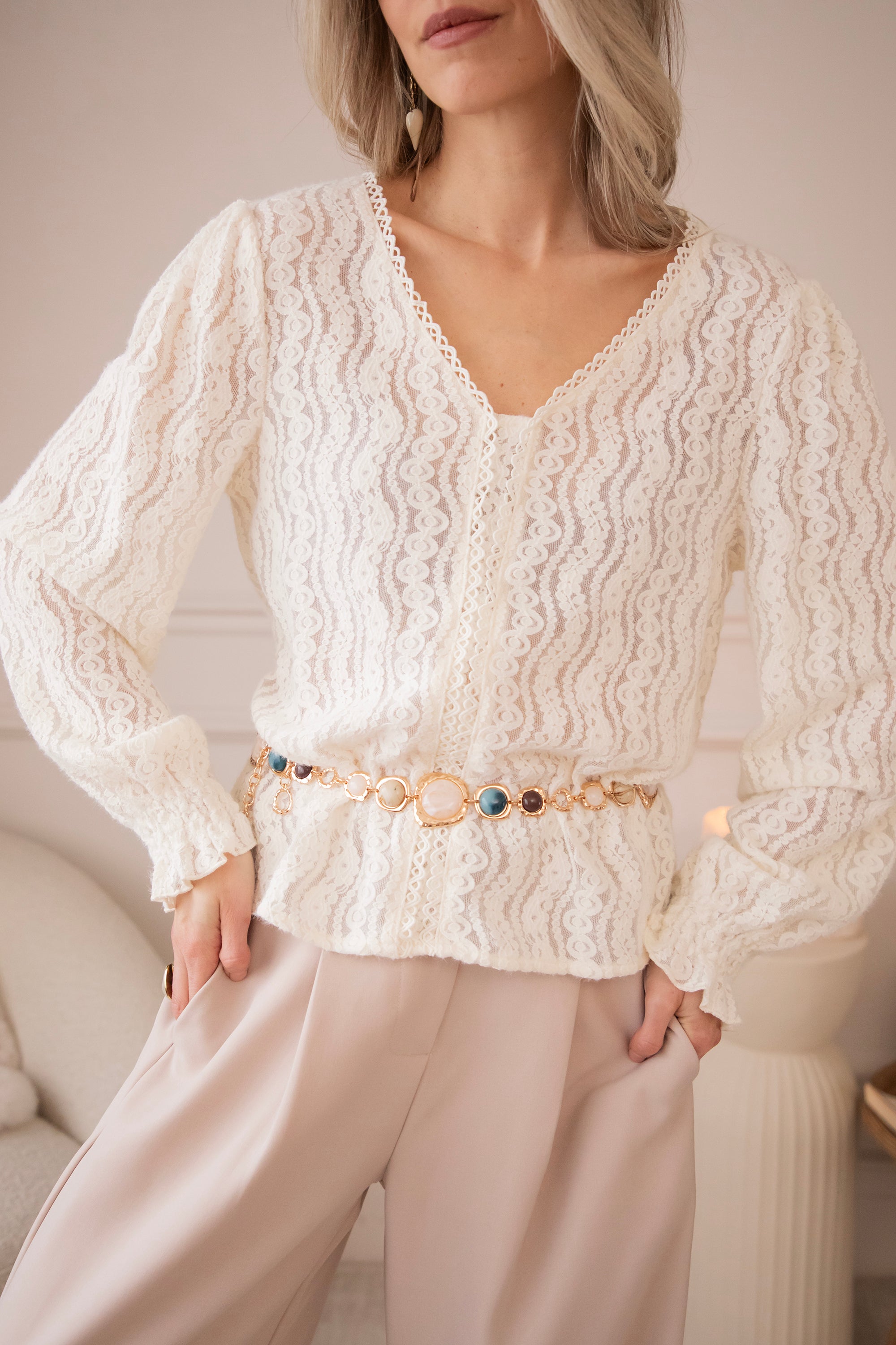 De Gem Chain riem is zo’n accessoire dat meteen je aandacht trekt ✨ Een chain belt met schakels, afgewerkt met kleine en grotere steentjes in beige, blauw en bruin - allemaal met die mooie marmeren look. Zó zacht en dromerig. Accessoires met stenen hebben sowieso een streepje voor bij mij hihi, dus deze riem heeft echt mijn hart gestolen 🤍 Ze matcht ook prachtig met de Caia ringen en met al die zachte blouses en jurken van dit seizoen ✨