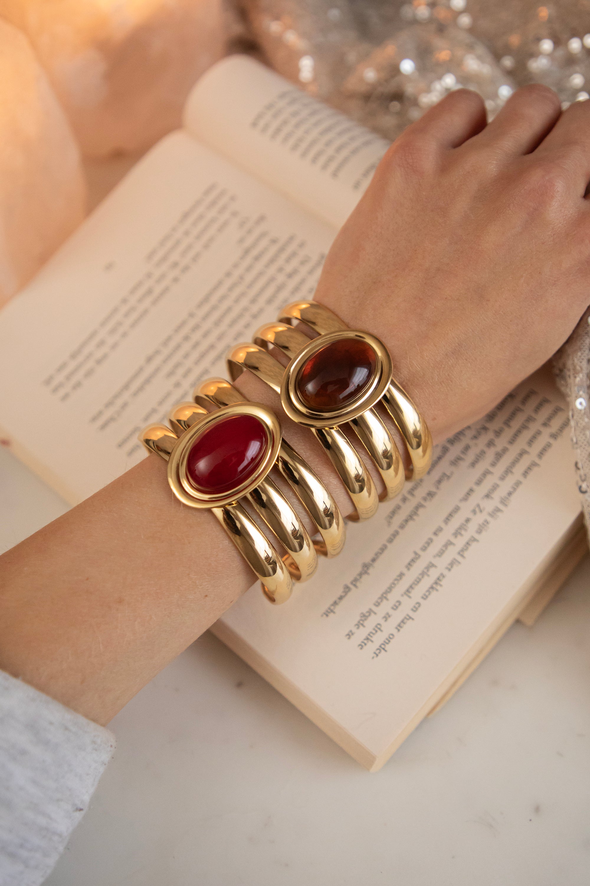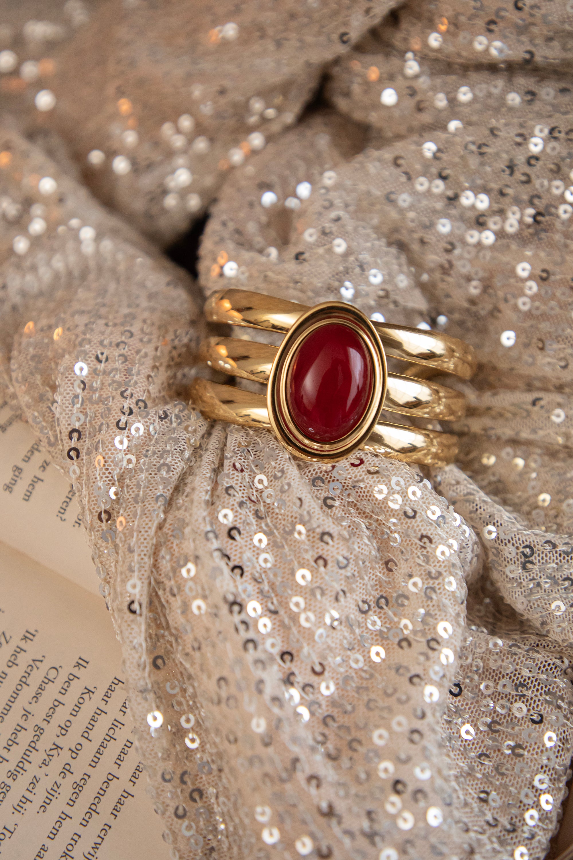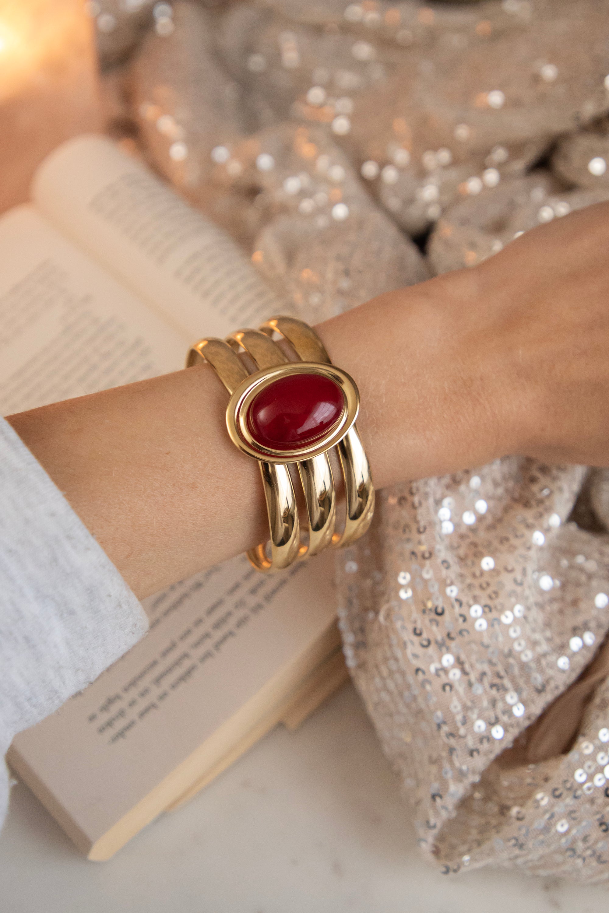 Meet Gemma, de armband met een hoge WOW-factor! Deze beauty straalt dankzij de grote bordeaux steen met een see-through glaseffect die prachtig bovenop glimt en over drie gouden bangles valt ❤️