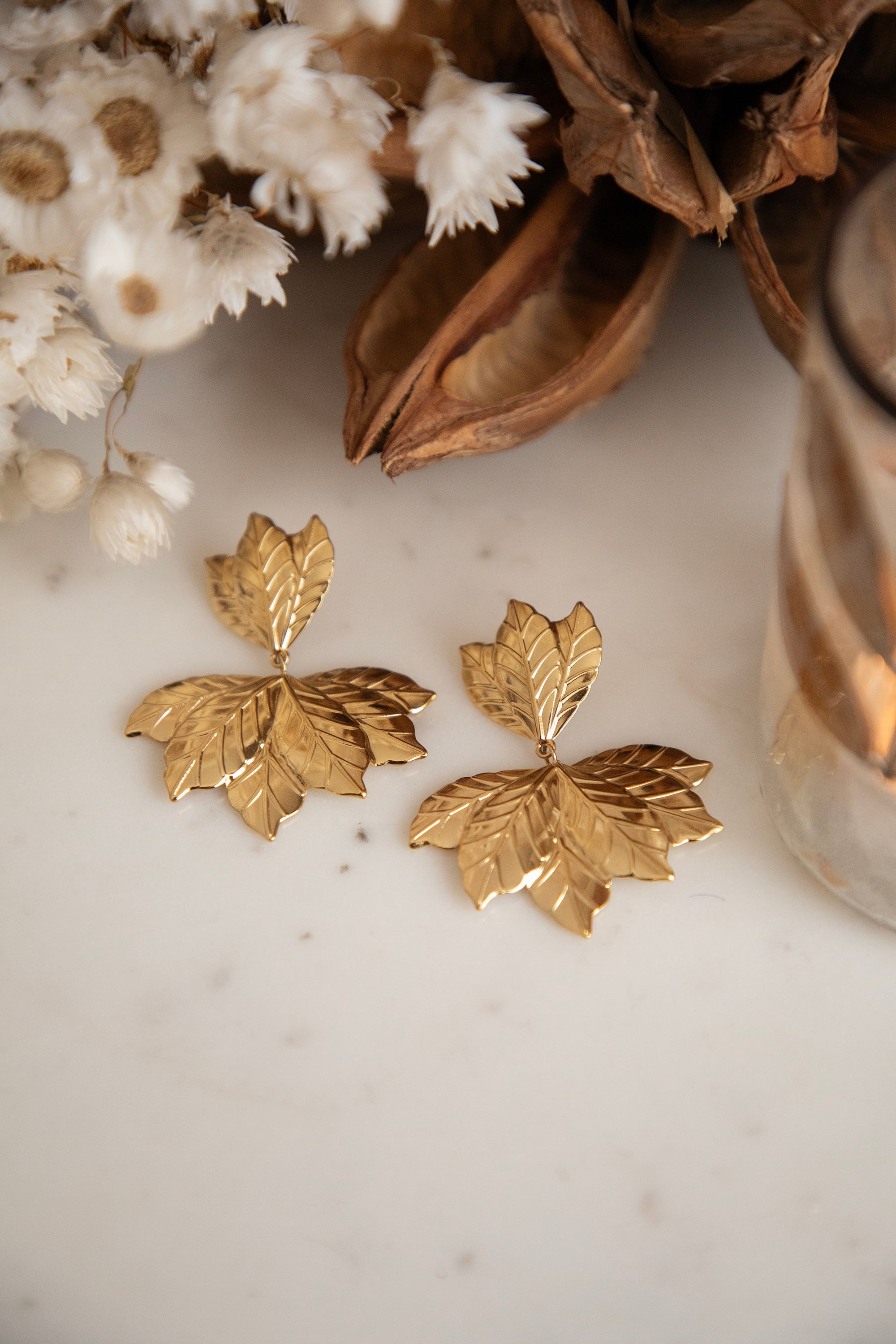 De nerven zijn subtiel verwerkt in het metaal, waardoor de blaadjes extra mooi tot hun recht komen 🥰 Dit paar tilt élke outfit meteen naar een hoger niveau: van cozy knit tot feestjurkje!