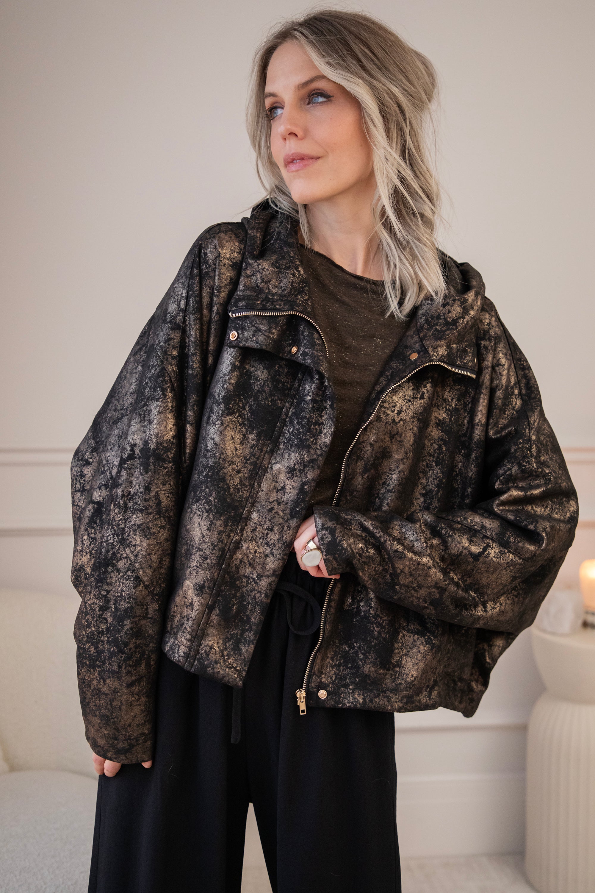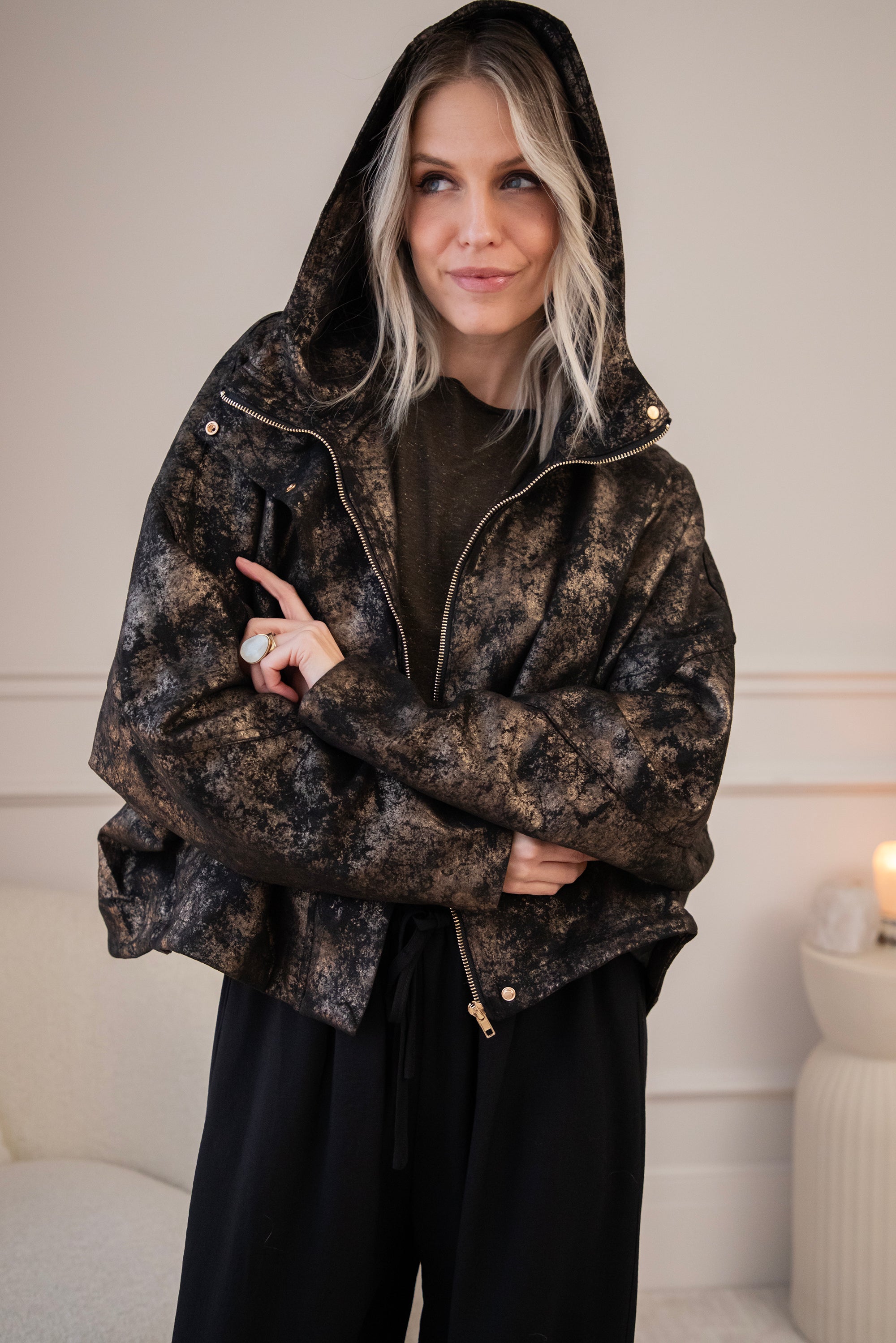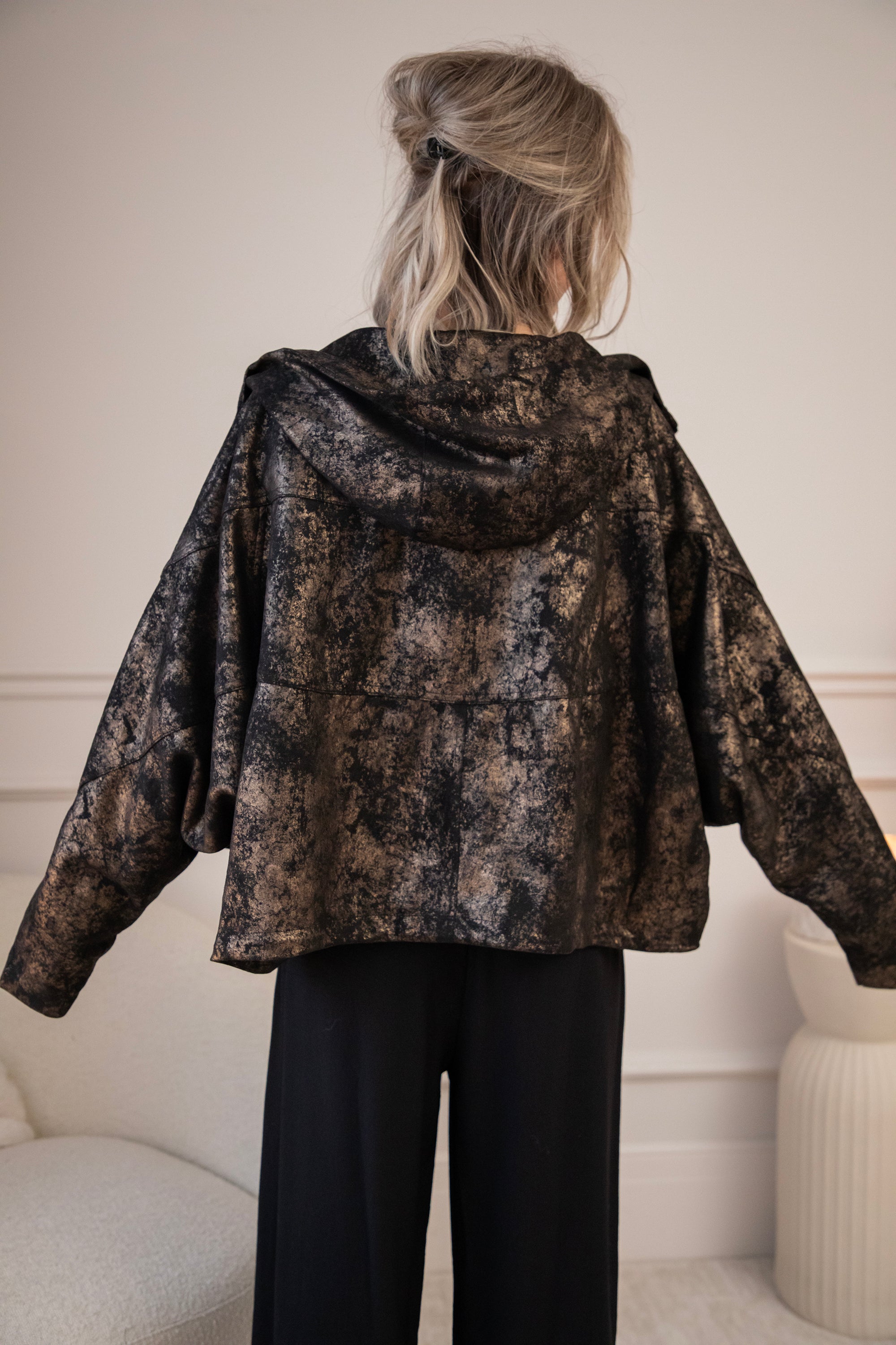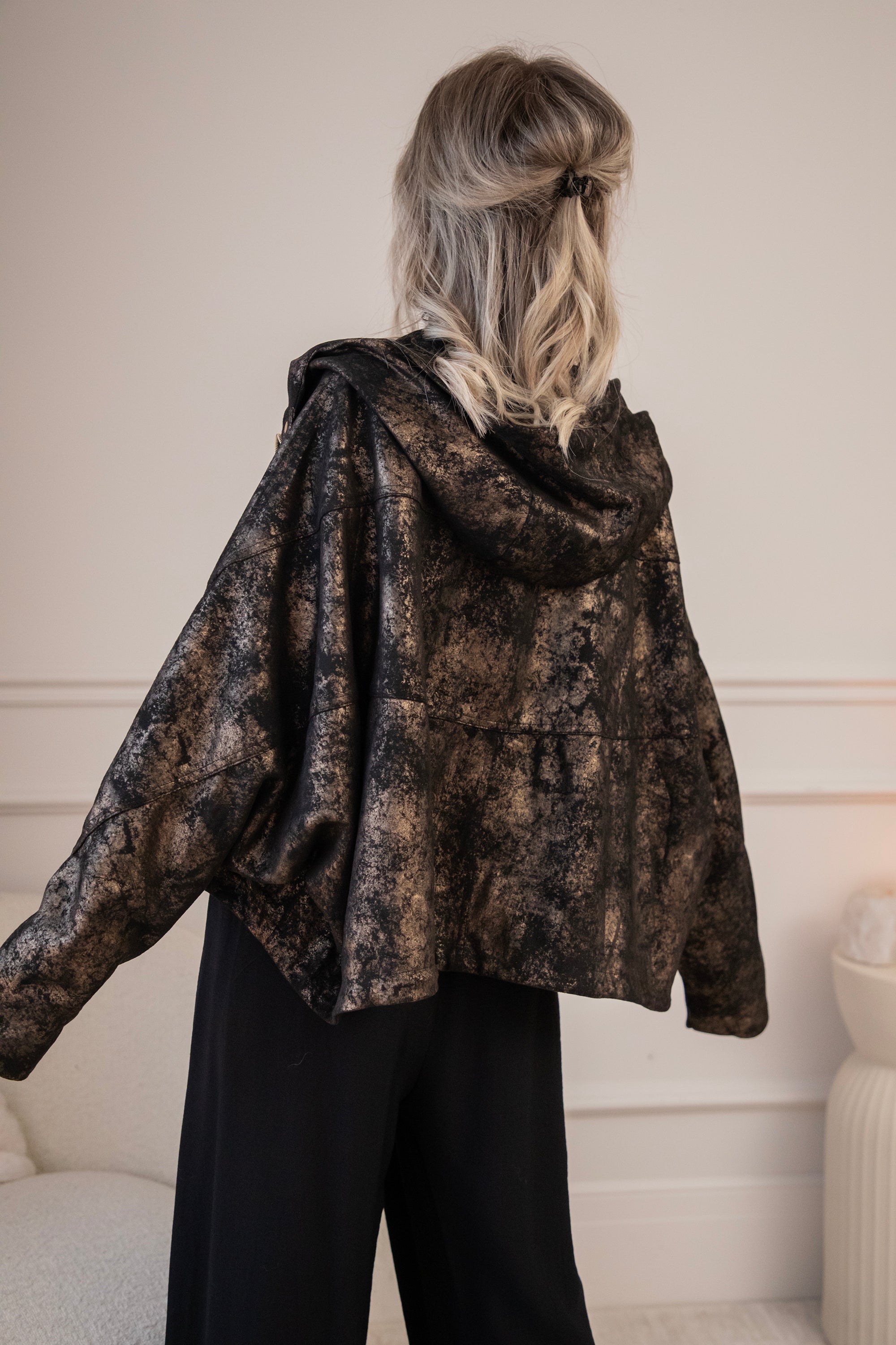 Oh ellemillagirls… ik heb zo'n MOOI jasje gevonden voor ons 😍 De zwarte suède-achtige stof is besprenkeld met een gouden gloed... very classy, very mysterious ✨ De loose fit en ruime mouwen geven haar een nonchalante, moderne snit die meteen goed aanvoelt. De verdoken ritssluiting en capuchon zijn fijne extra’s die het geheel nog net dat tikkeltje cooler maken.