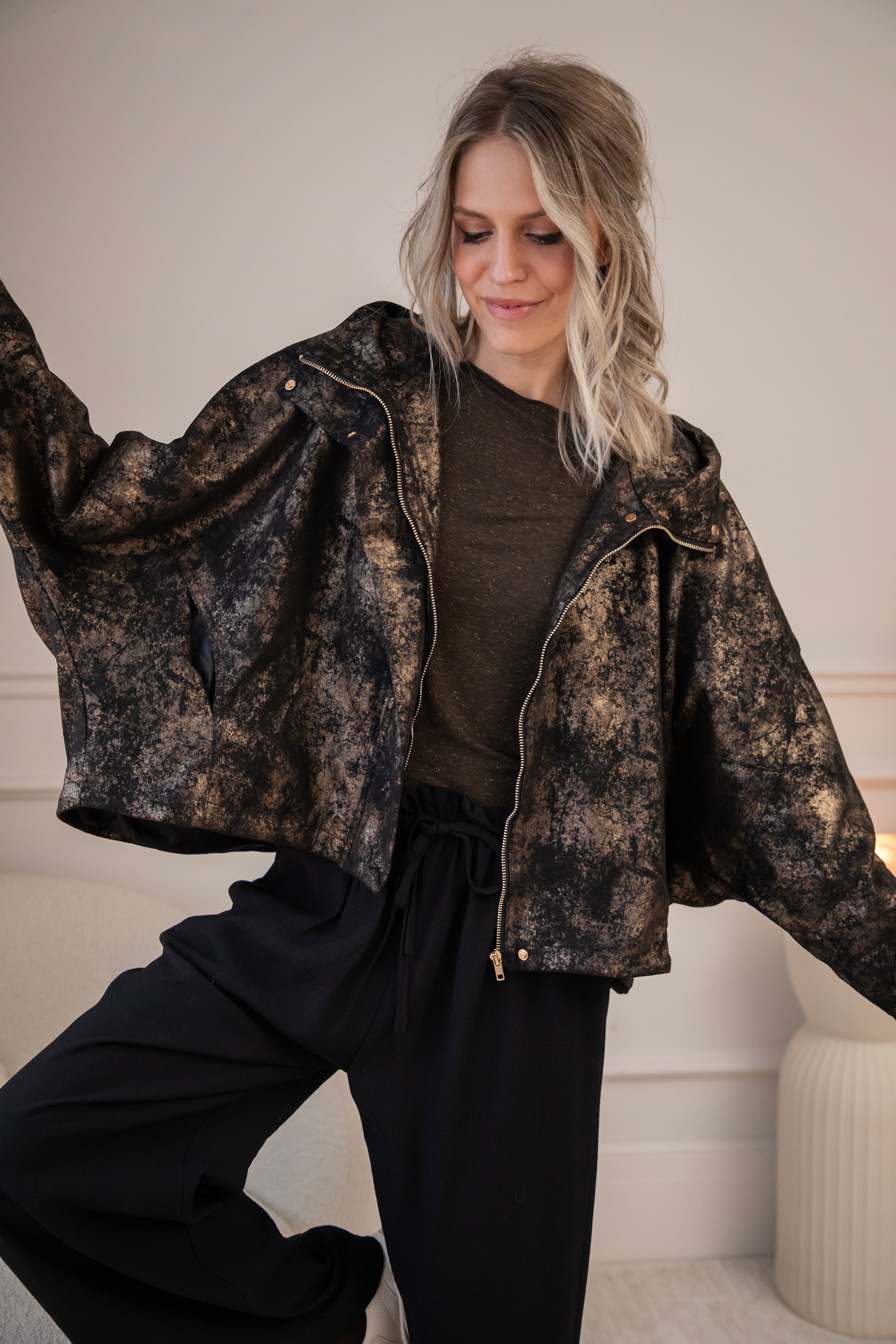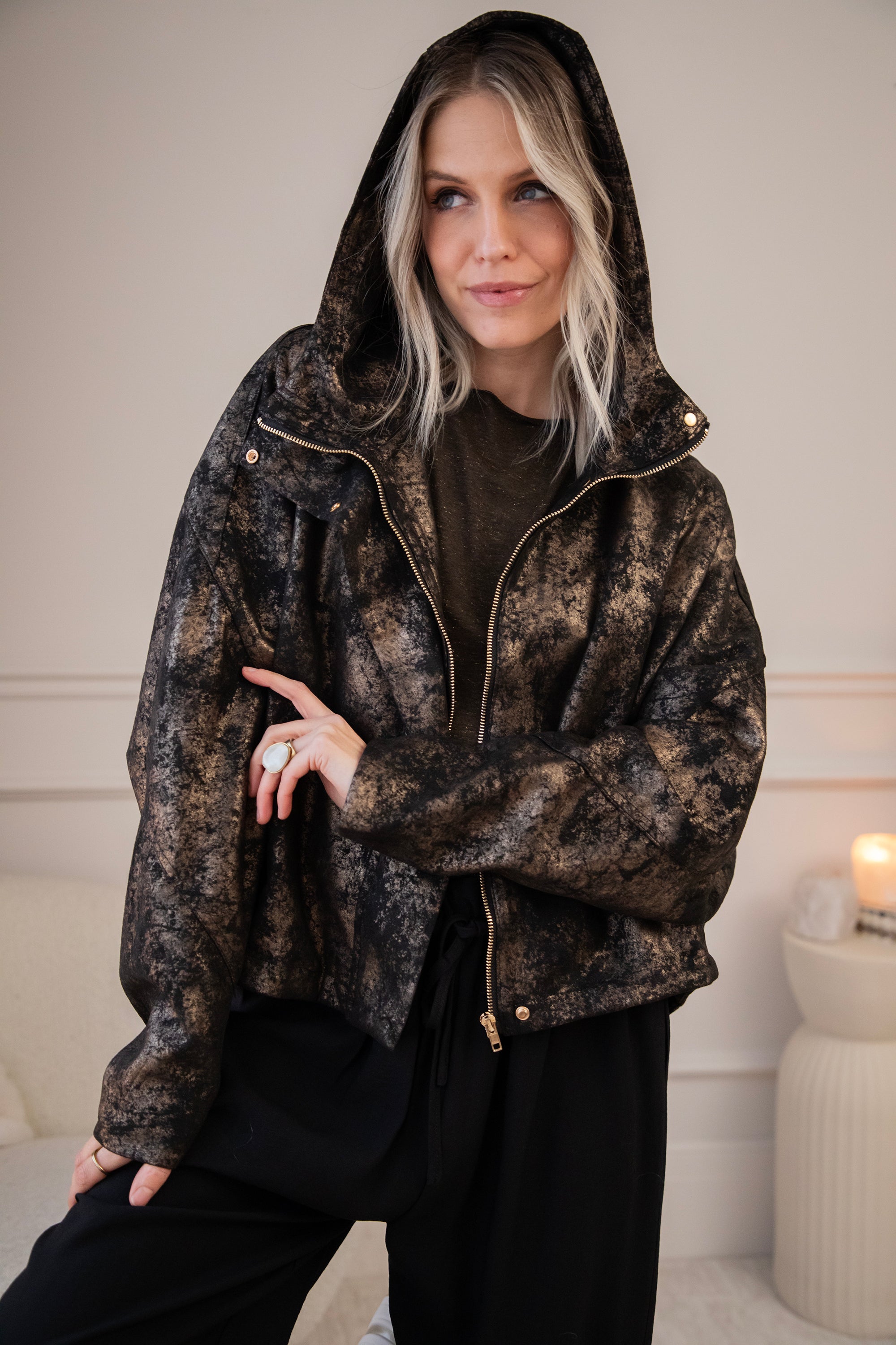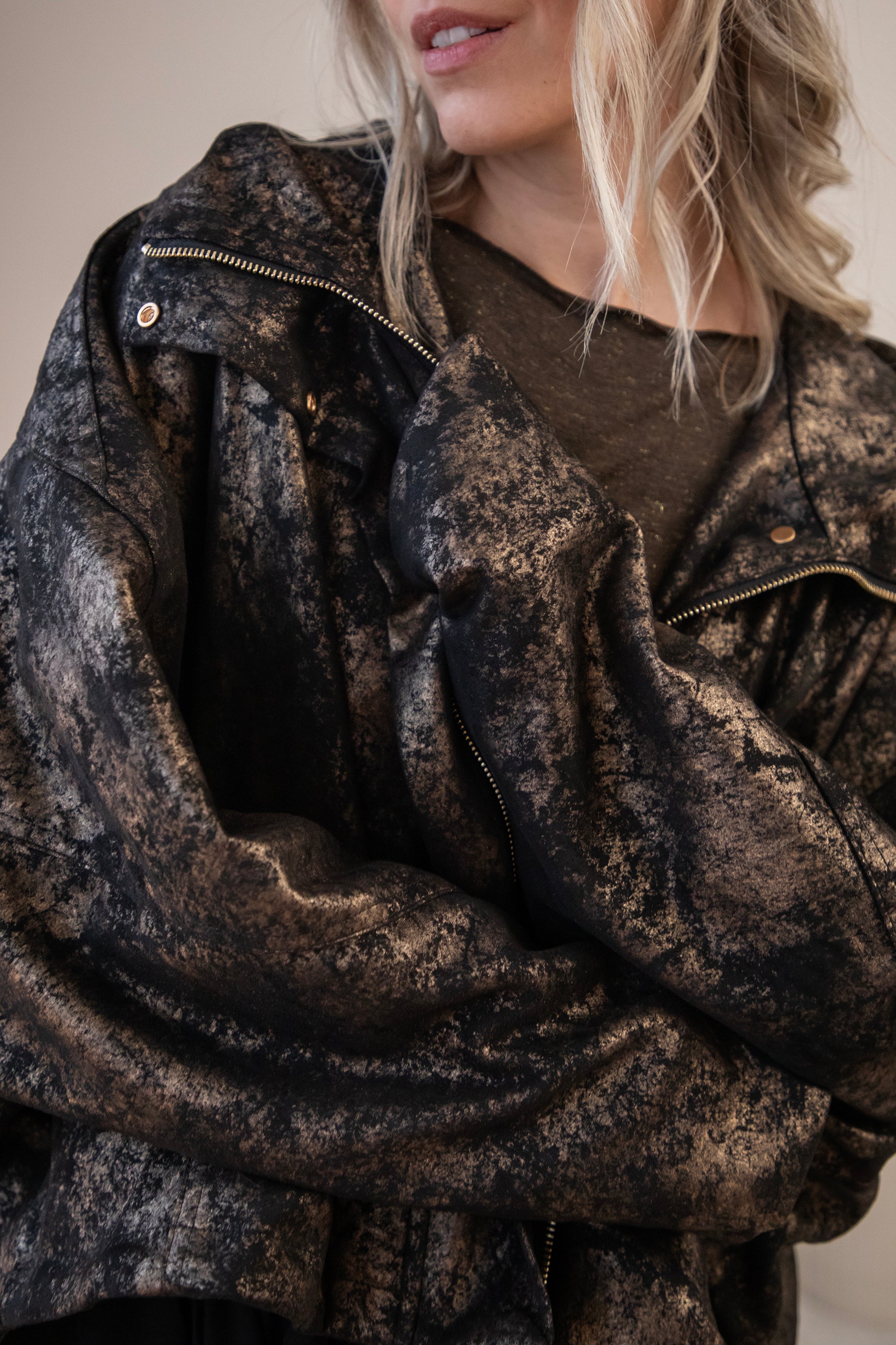 Oh ellemillagirls… ik heb zo'n MOOI jasje gevonden voor ons 😍 De zwarte suède-achtige stof is besprenkeld met een gouden gloed... very classy, very mysterious ✨ De loose fit en ruime mouwen geven haar een nonchalante, moderne snit die meteen goed aanvoelt. De verdoken ritssluiting en capuchon zijn fijne extra’s die het geheel nog net dat tikkeltje cooler maken.
