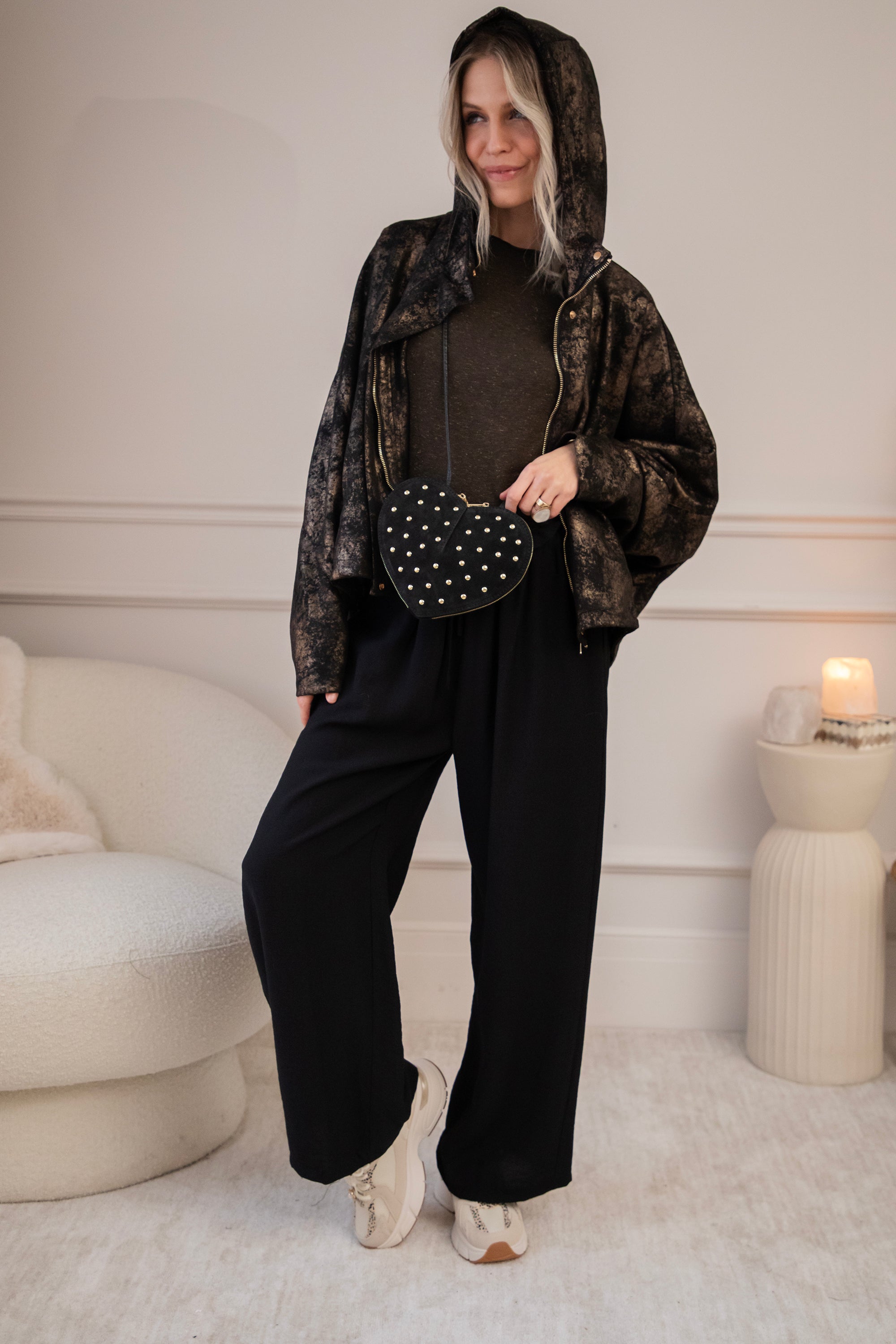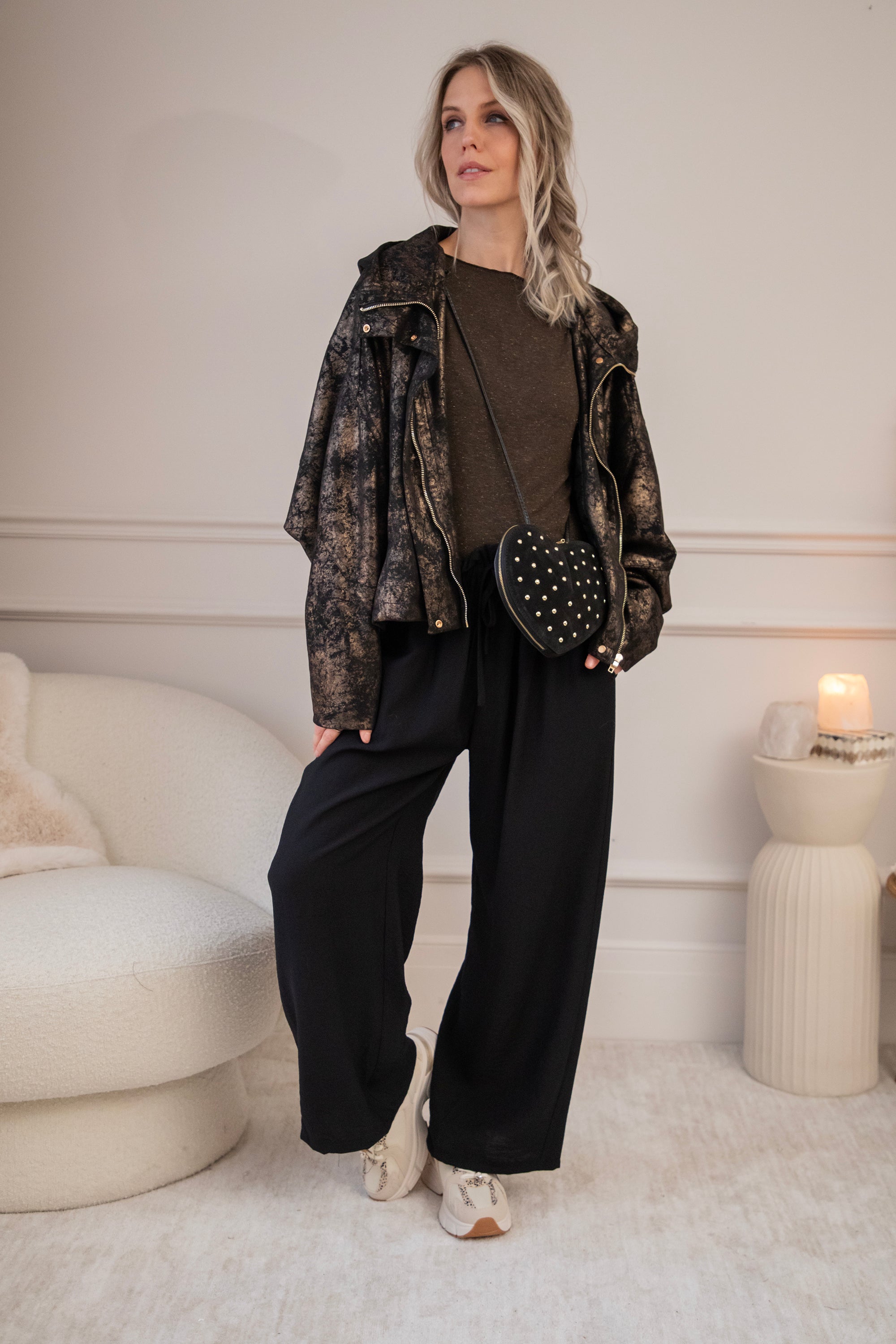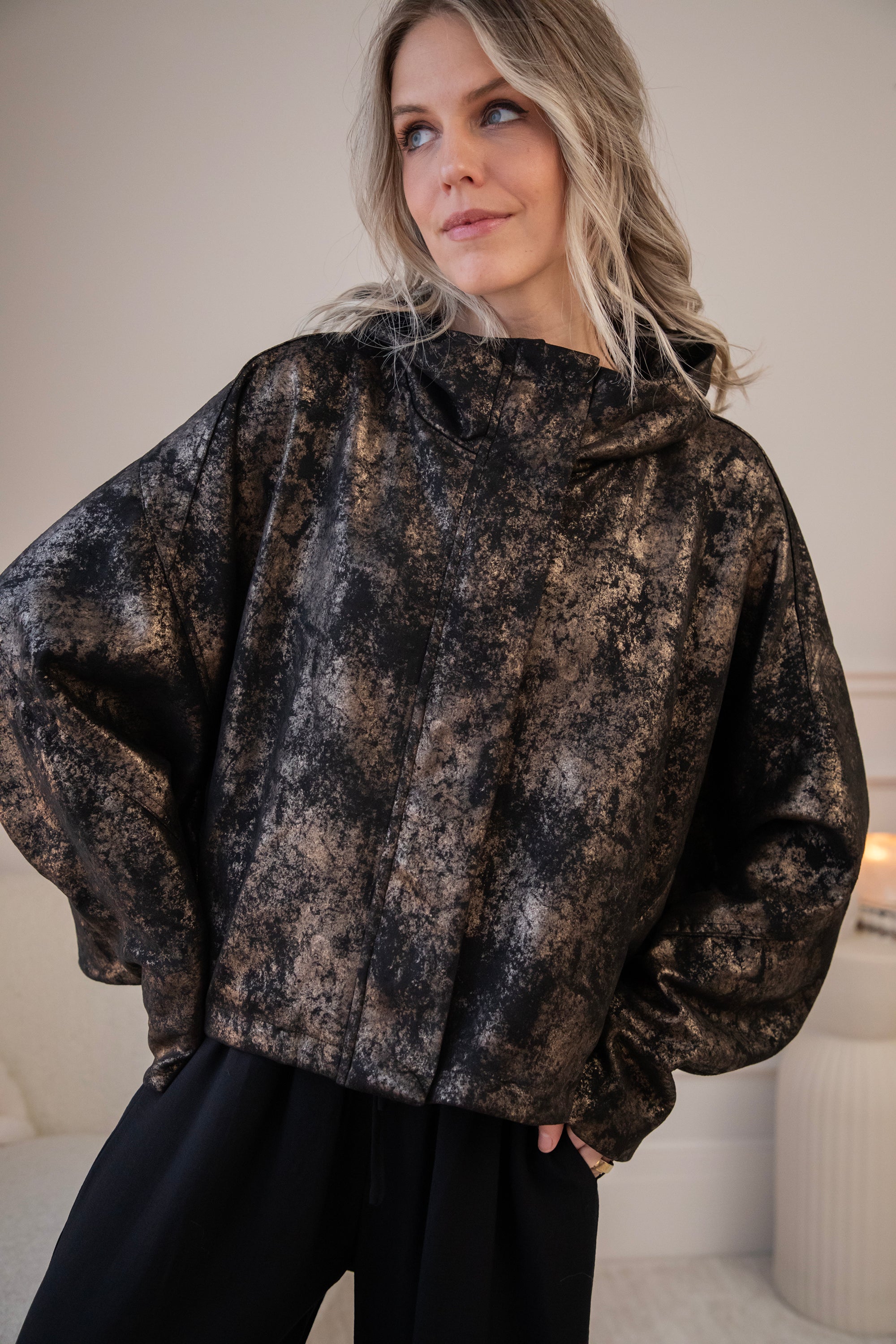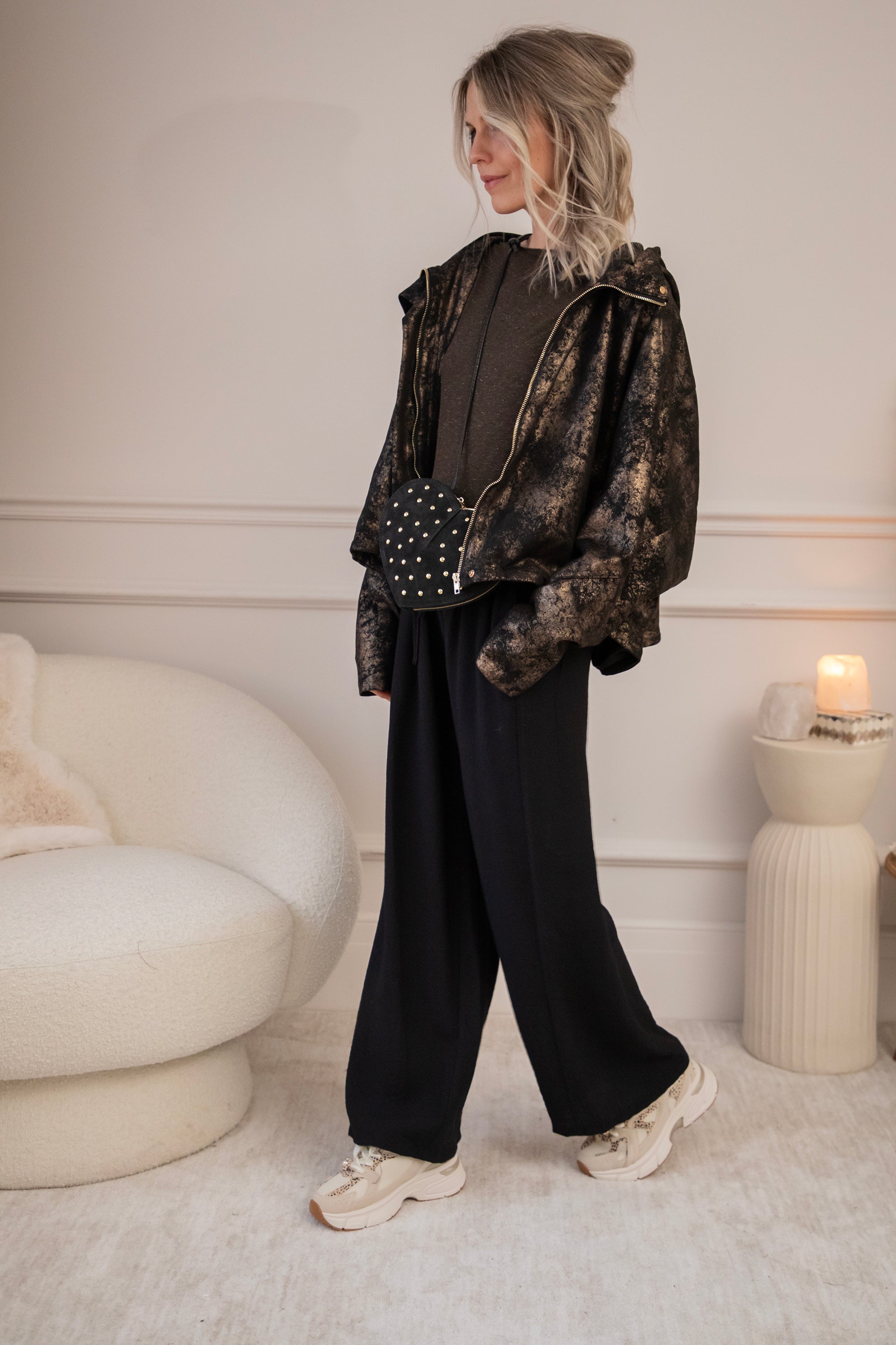 Oh ellemillagirls… ik heb zo'n MOOI jasje gevonden voor ons 😍 De zwarte suède-achtige stof is besprenkeld met een gouden gloed... very classy, very mysterious ✨ De loose fit en ruime mouwen geven haar een nonchalante, moderne snit die meteen goed aanvoelt. De verdoken ritssluiting en capuchon zijn fijne extra’s die het geheel nog net dat tikkeltje cooler maken.