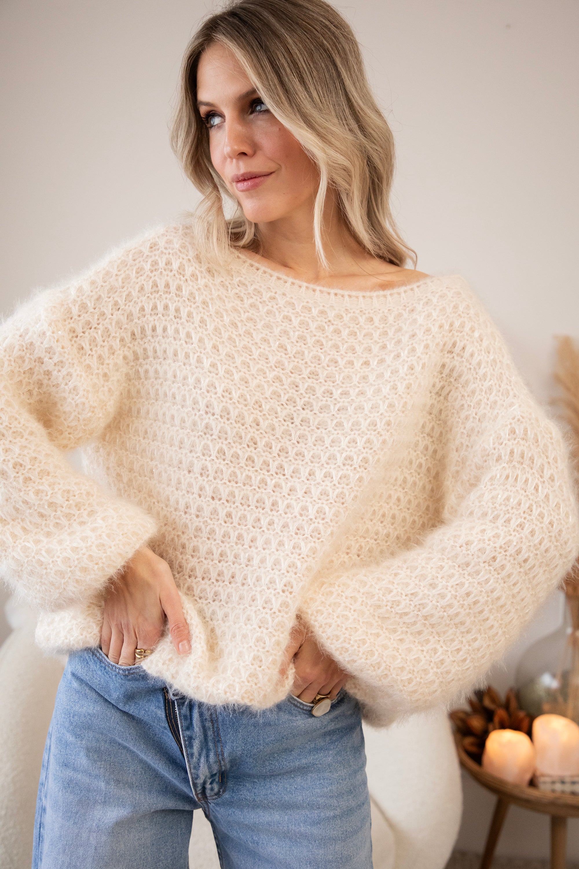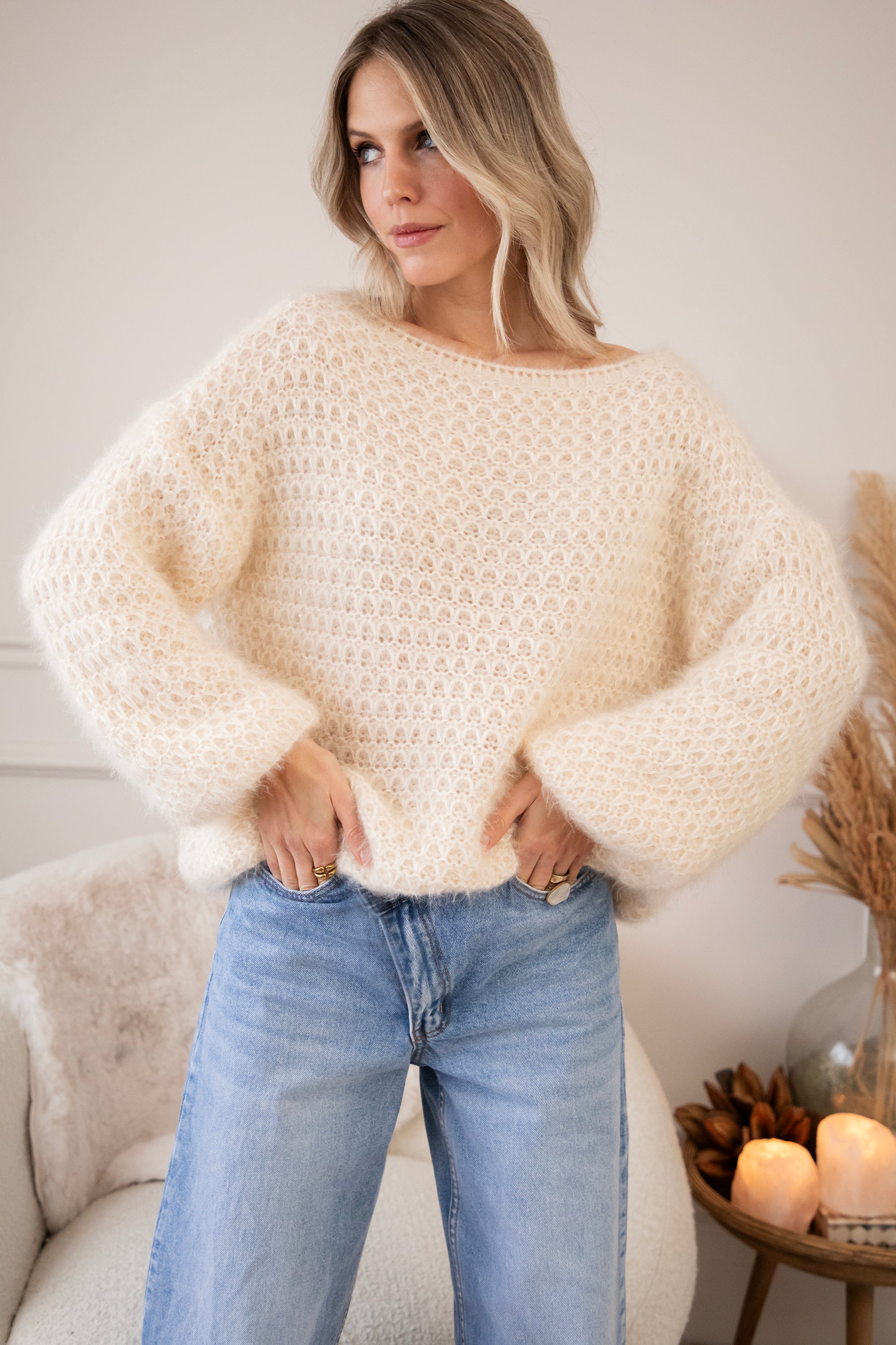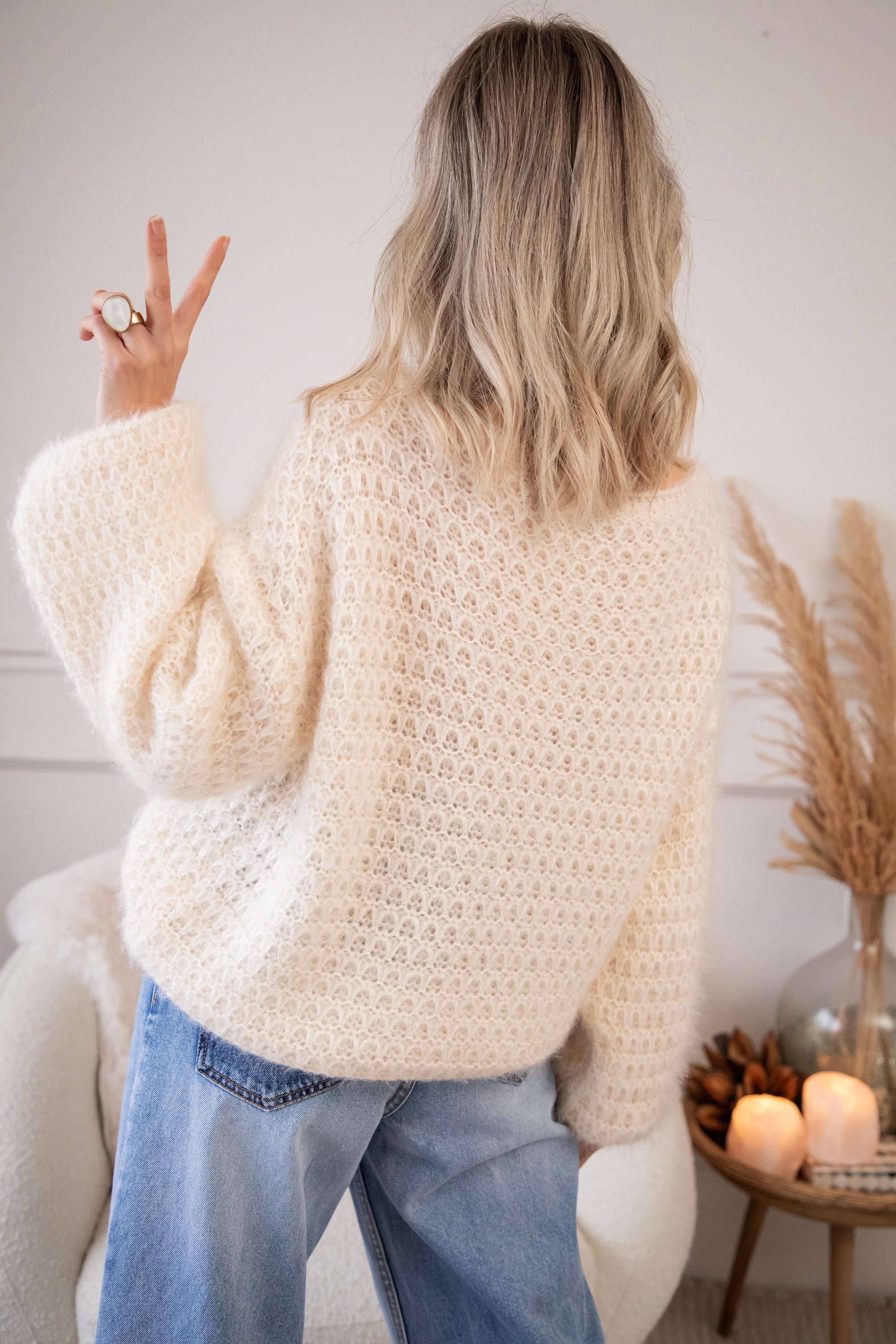 Deze fluffy trui is een ellemilla FAVORITE! 🤍 Ze heeft een subtiel geruit reliëfpatroon en een heerlijke baggy fit waardoor ze mooi poft, zowel in het lichaam als in de mouwen. Extra leuk detail? In de stof zitten mini pailletjes verwerkt die hier en daar zachtjes meeschitteren ✨ Niet te opvallend, maar net genoeg voor dat vleugje glam. Super zacht, cozy én een tikkeltje sparkly!