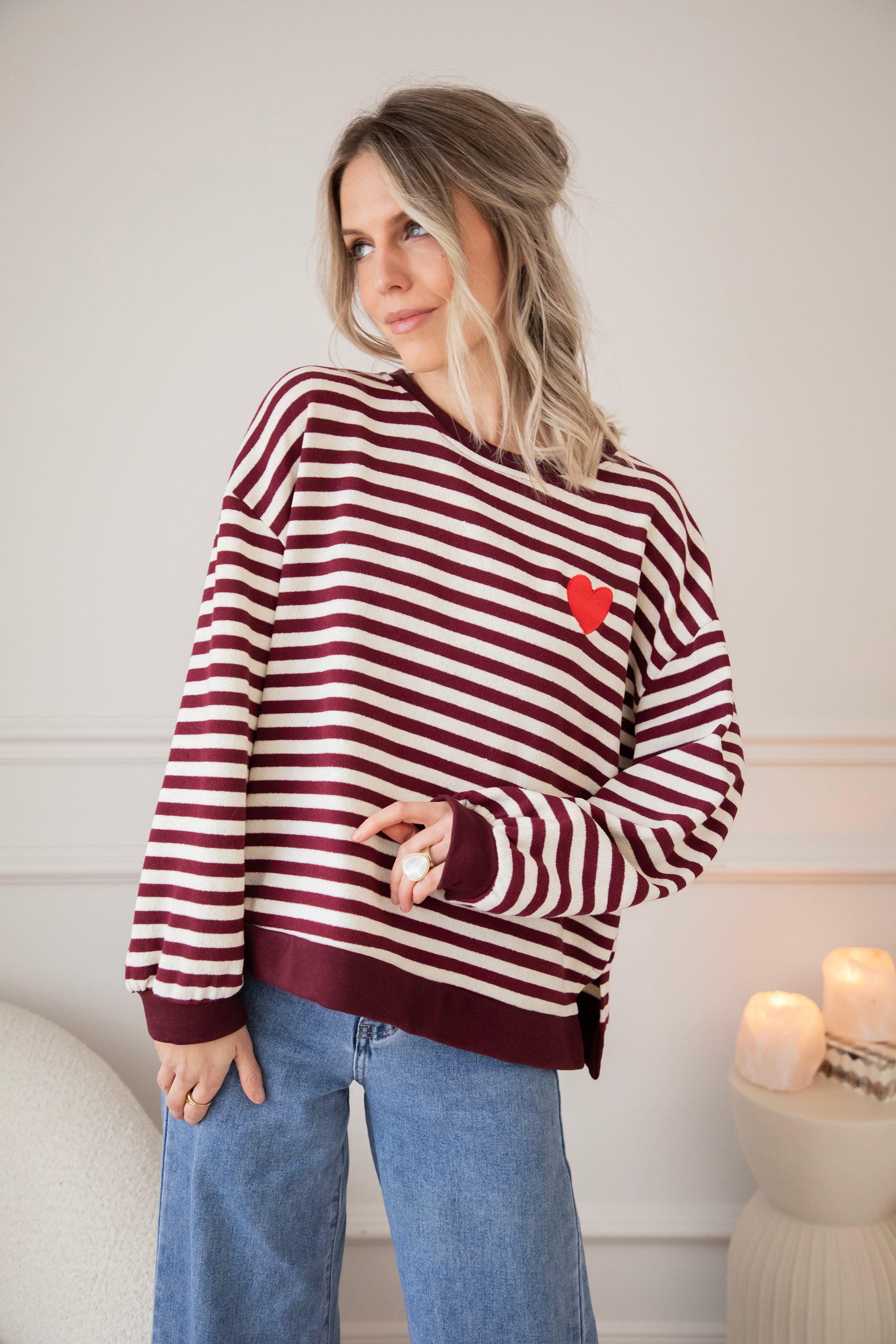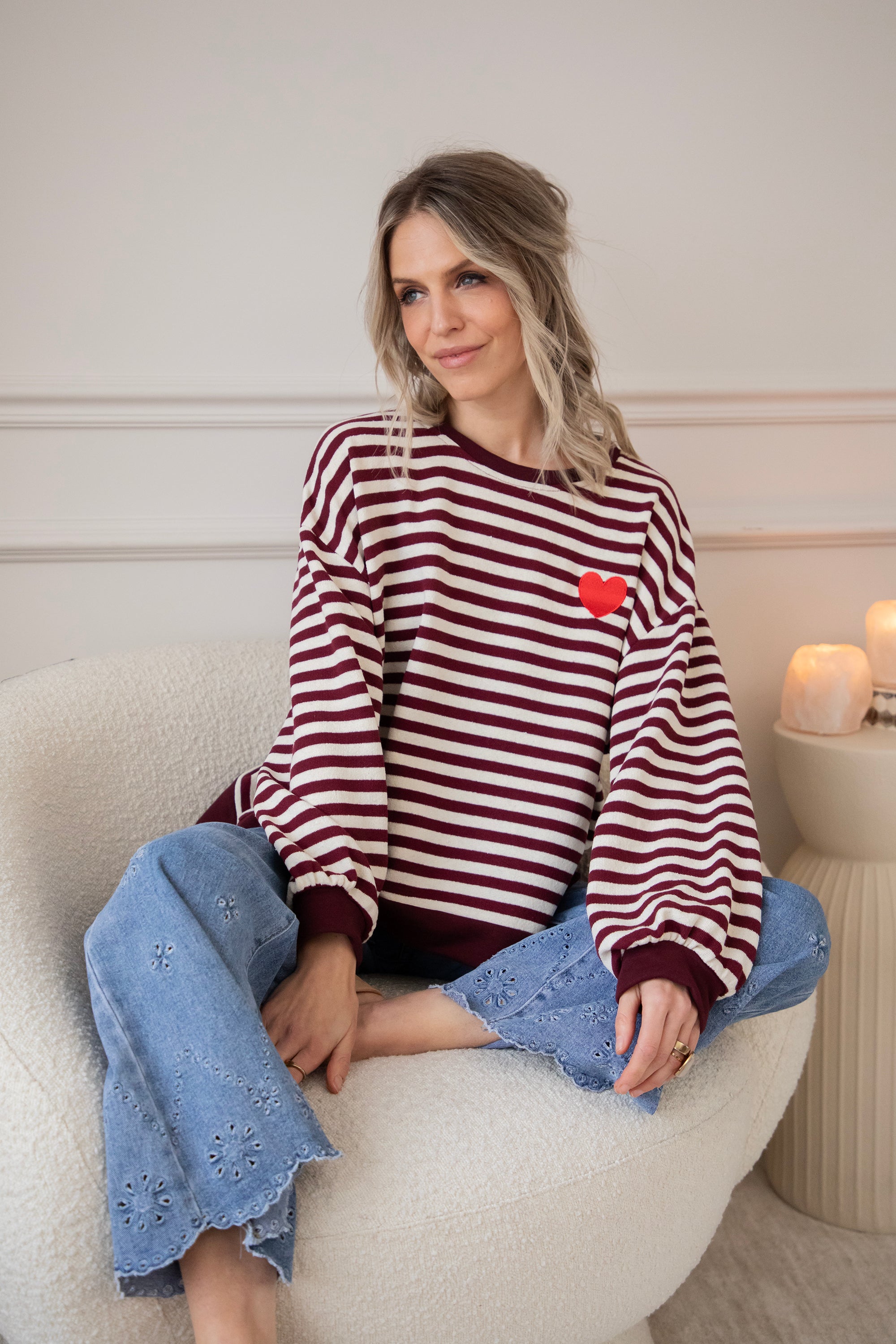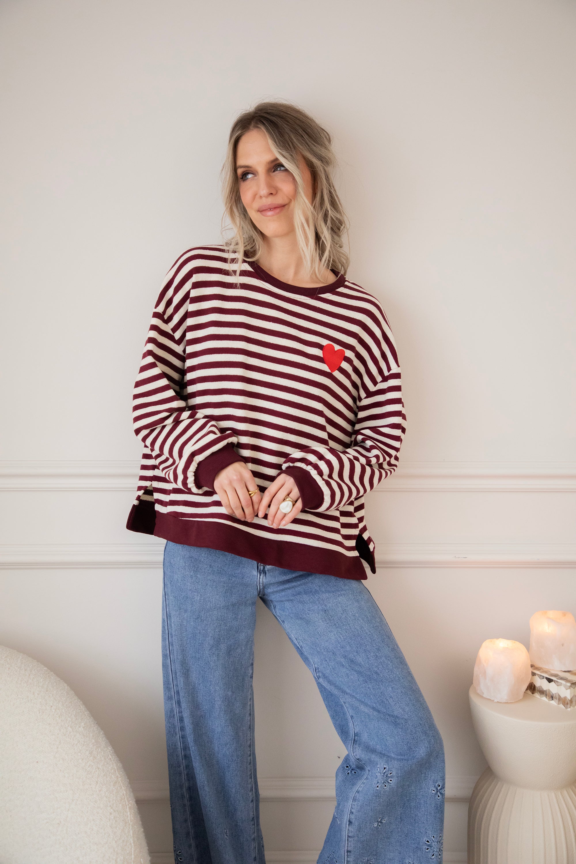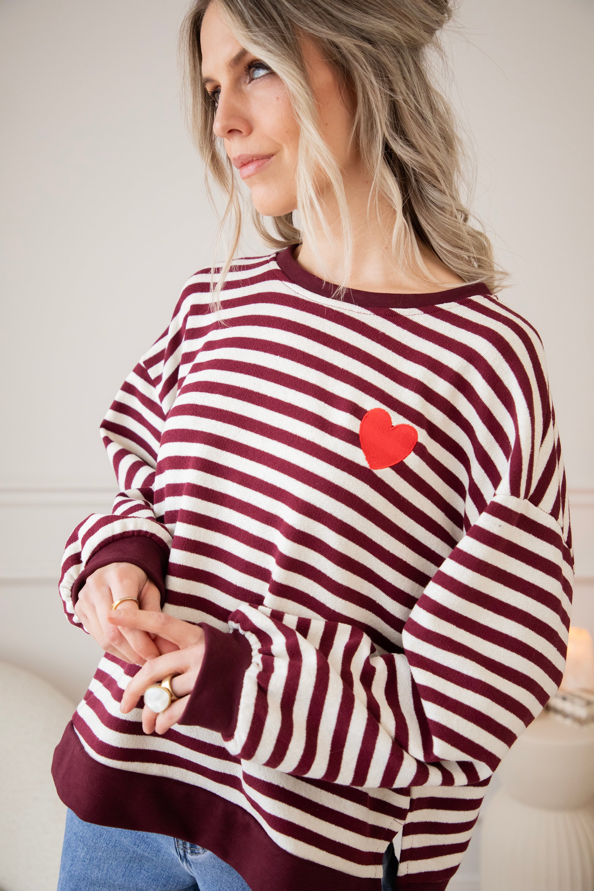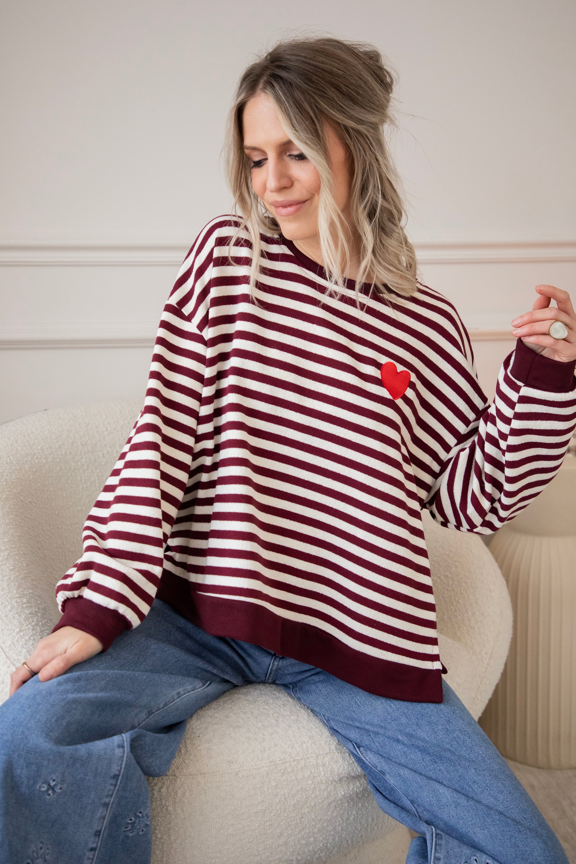 Voor iedereen met een hart voor strepen! Wij dus hihi 😍 En ik bedoel dat echt letterlijk, want deze sweater steelt je hart meteen met haar burgundy strepenpatroon én het felrode hart ❤️ Het baggy model zorgt dat ze lekker comfy zit en er stylish uitziet. Echt een toptrui en ik weet zeker dat heel wat ellemillagirls hier net zo verliefd op gaan zijn. Strepen, hartjes, zachtheid… het is gewoon 100% ellemilla.