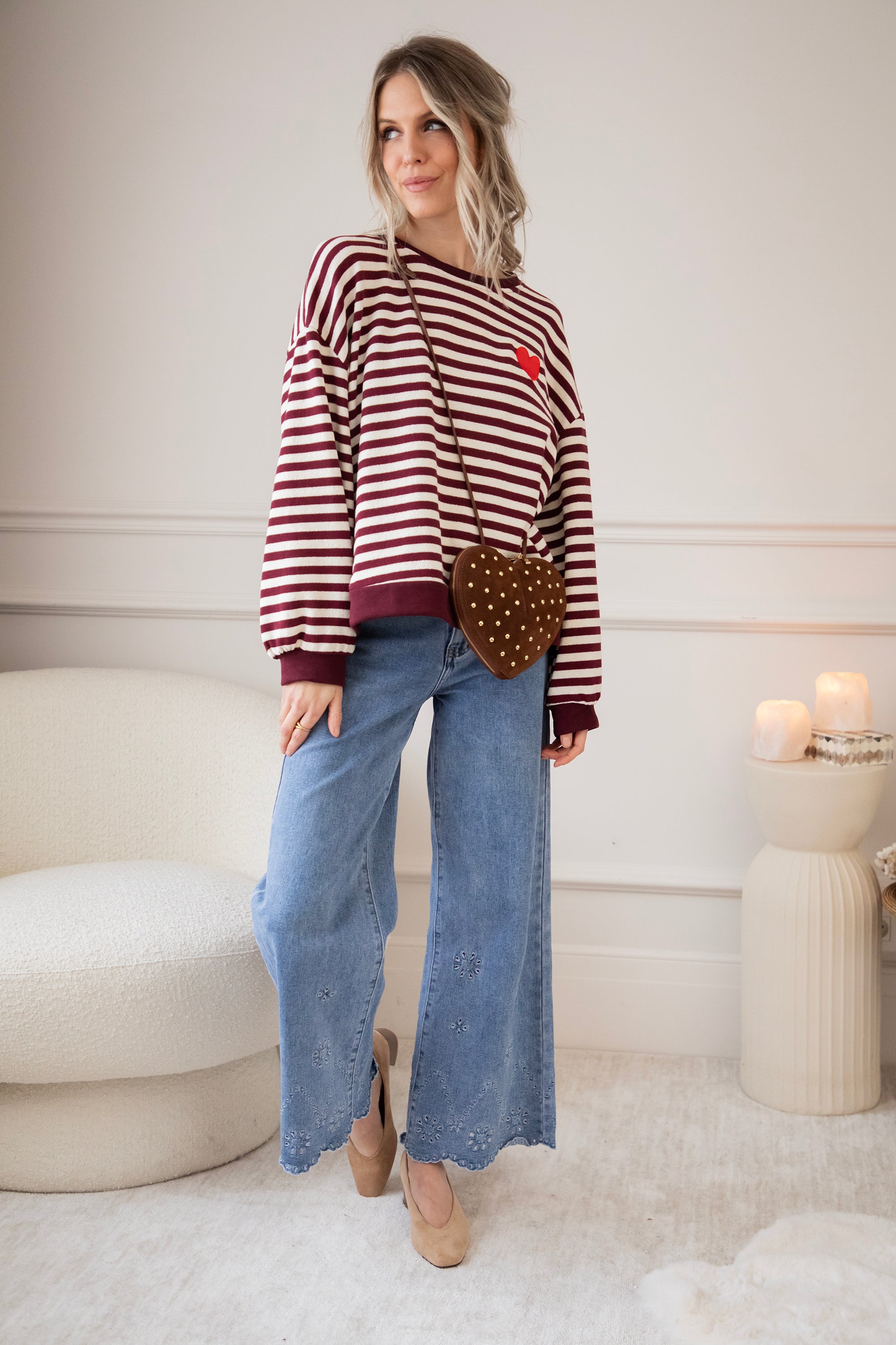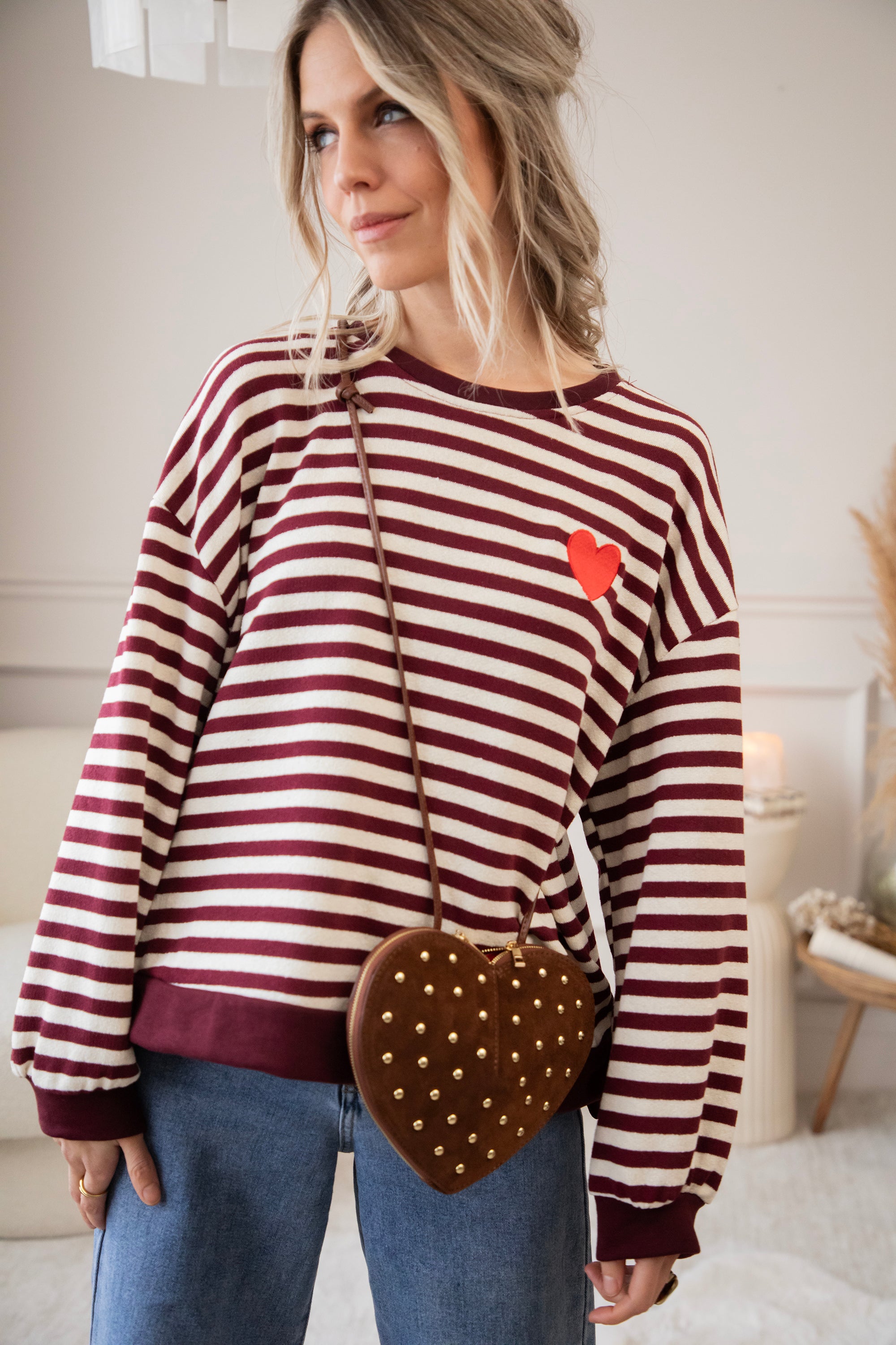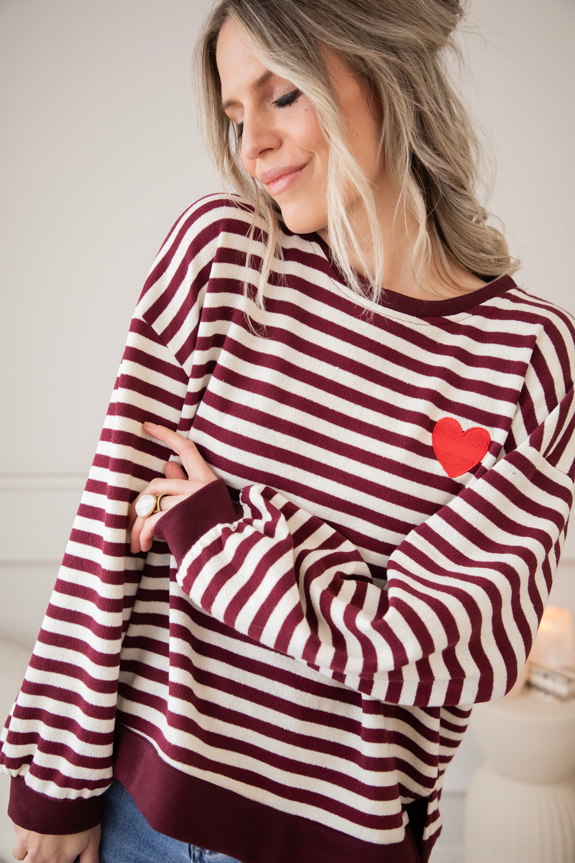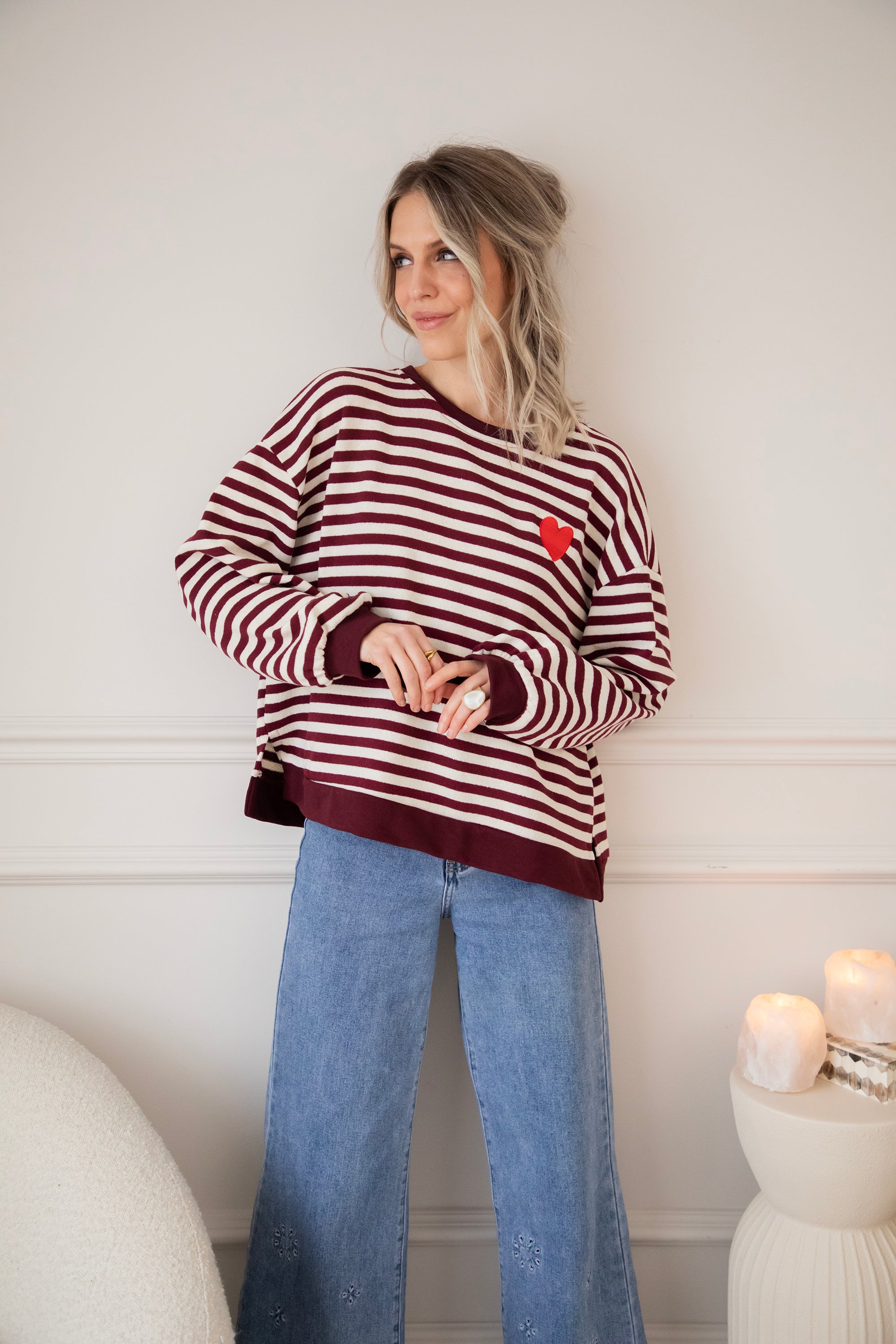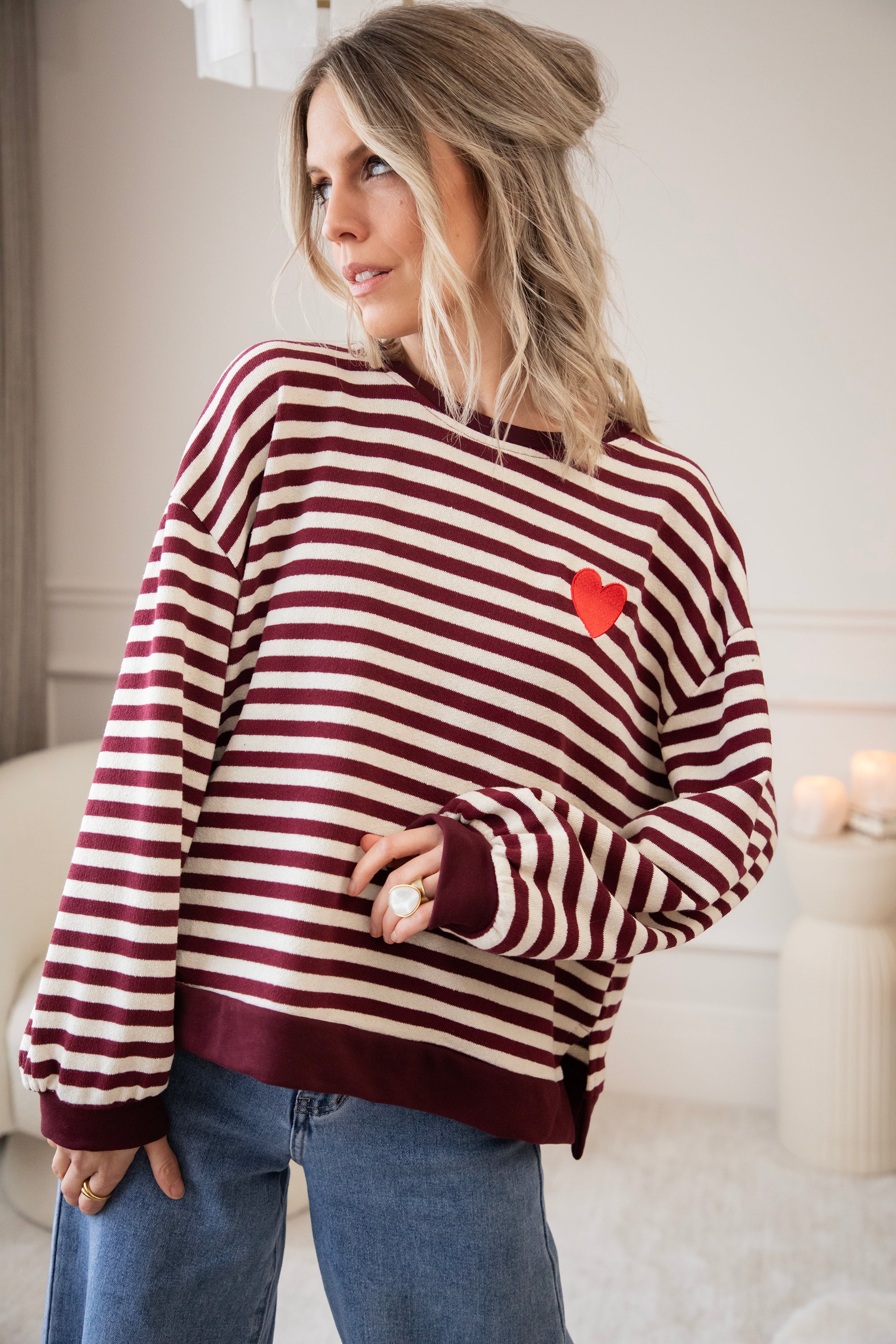 Voor iedereen met een hart voor strepen! Wij dus hihi 😍 En ik bedoel dat echt letterlijk, want deze sweater steelt je hart meteen met haar burgundy strepenpatroon én het felrode hart ❤️ Het baggy model zorgt dat ze lekker comfy zit en er stylish uitziet. Echt een toptrui en ik weet zeker dat heel wat ellemillagirls hier net zo verliefd op gaan zijn. Strepen, hartjes, zachtheid… het is gewoon 100% ellemilla.