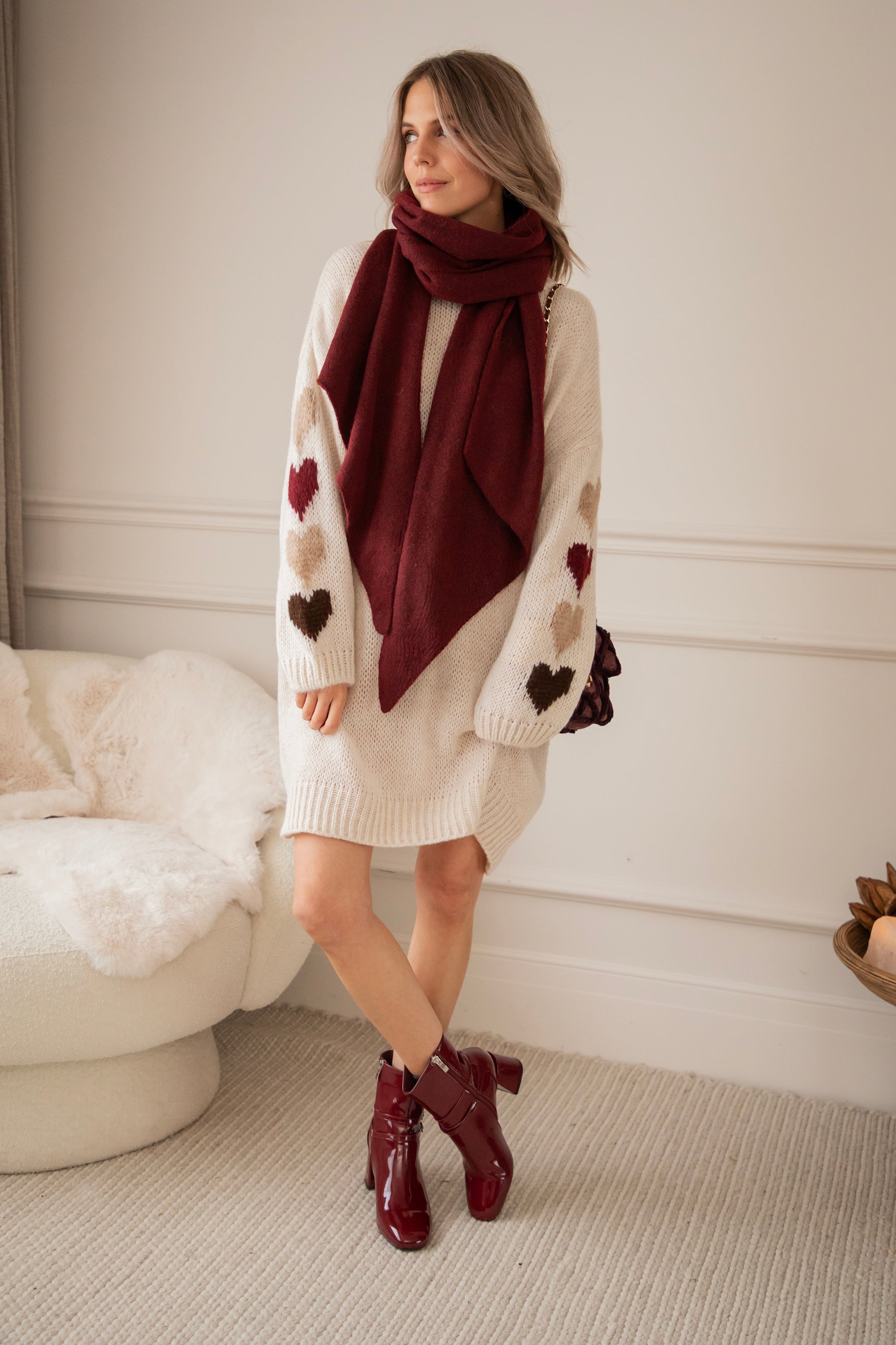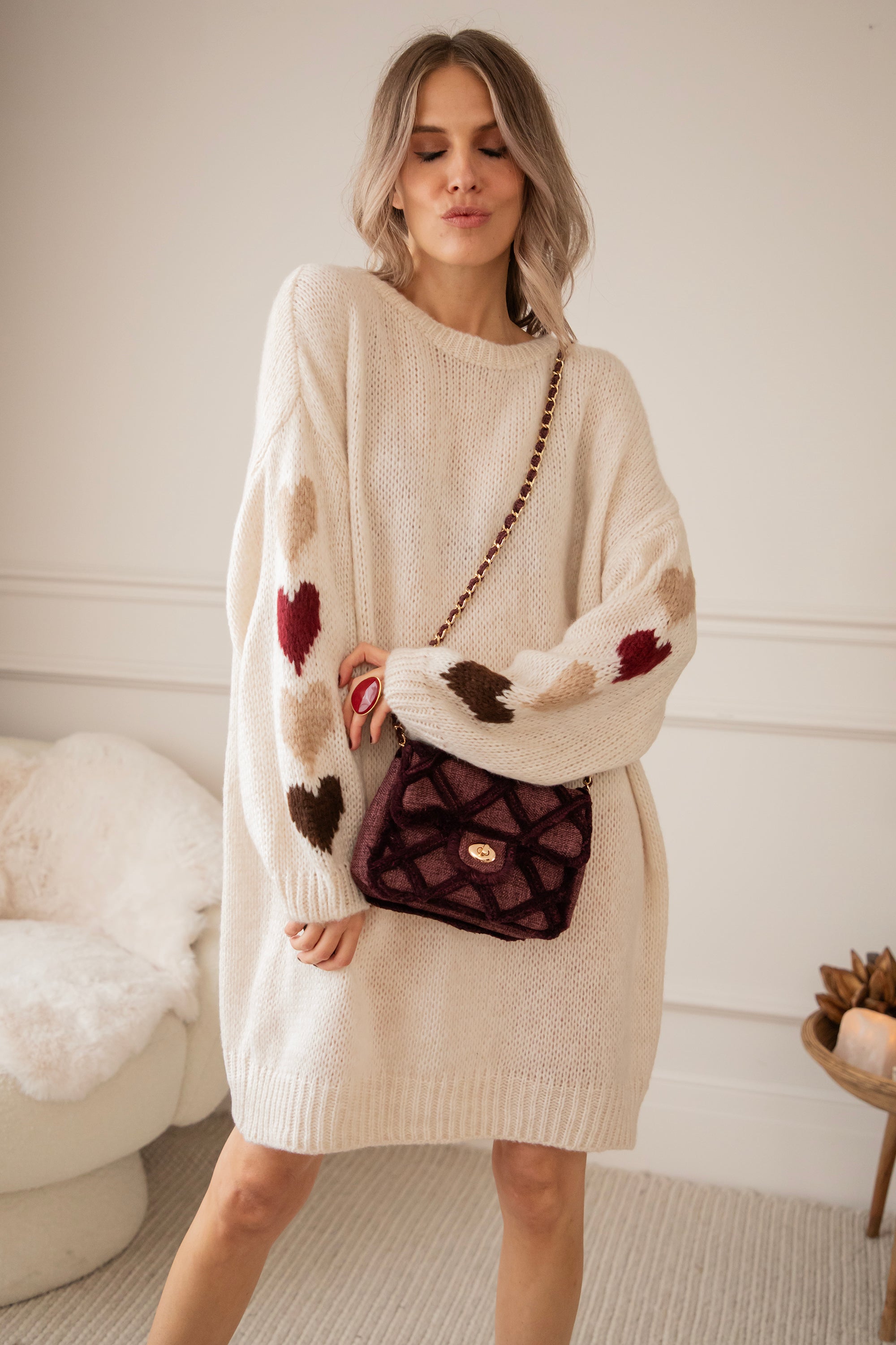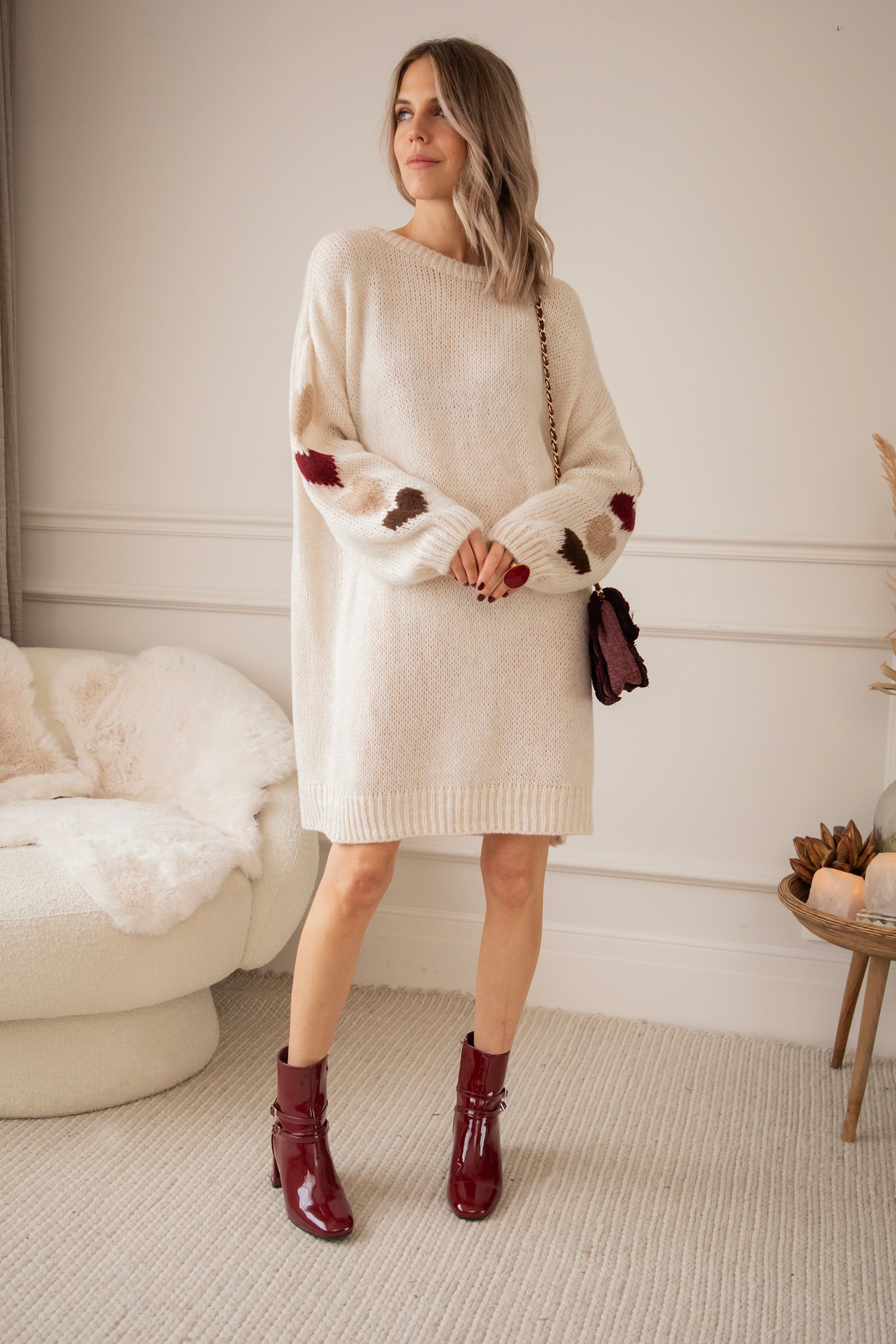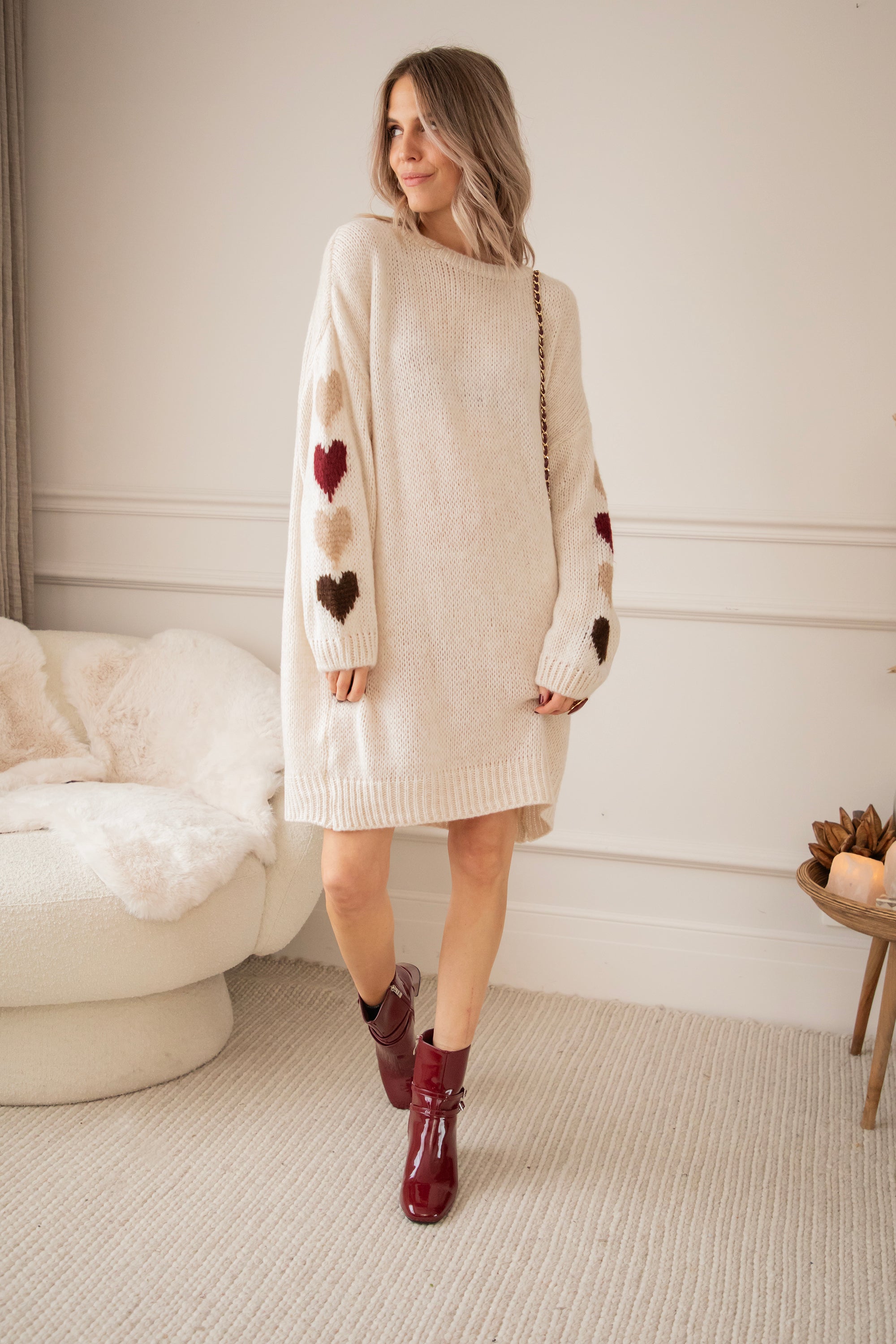 En met deze cozy sweater dress mag dat helemaal gezien worden! Ik wissel mijn jeans en sweater looks heel graag af met een cozy sweater dress, vergezeld van een panty en enkelboots 😍 Op de mouwtjes zie je vier lieve hartjes in camel, bordeaux en bruin… mega cute en totally ellemilla ❤️🤎 De stof voelt heerlijk zacht aan dankzij een mix van acryl, wol en viscose: warm, comfy en perfect voor die knusse herfst- en winterdagen!