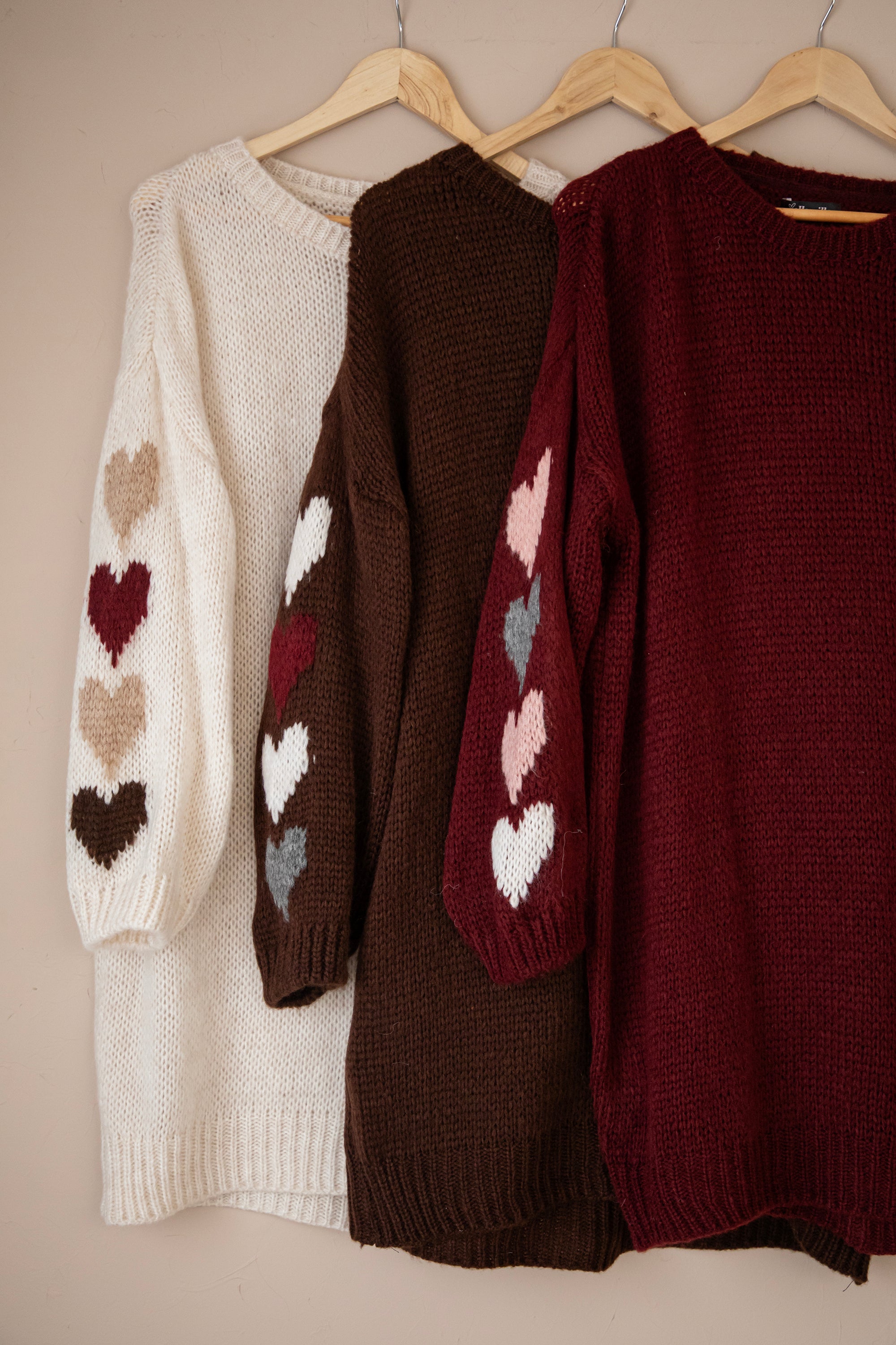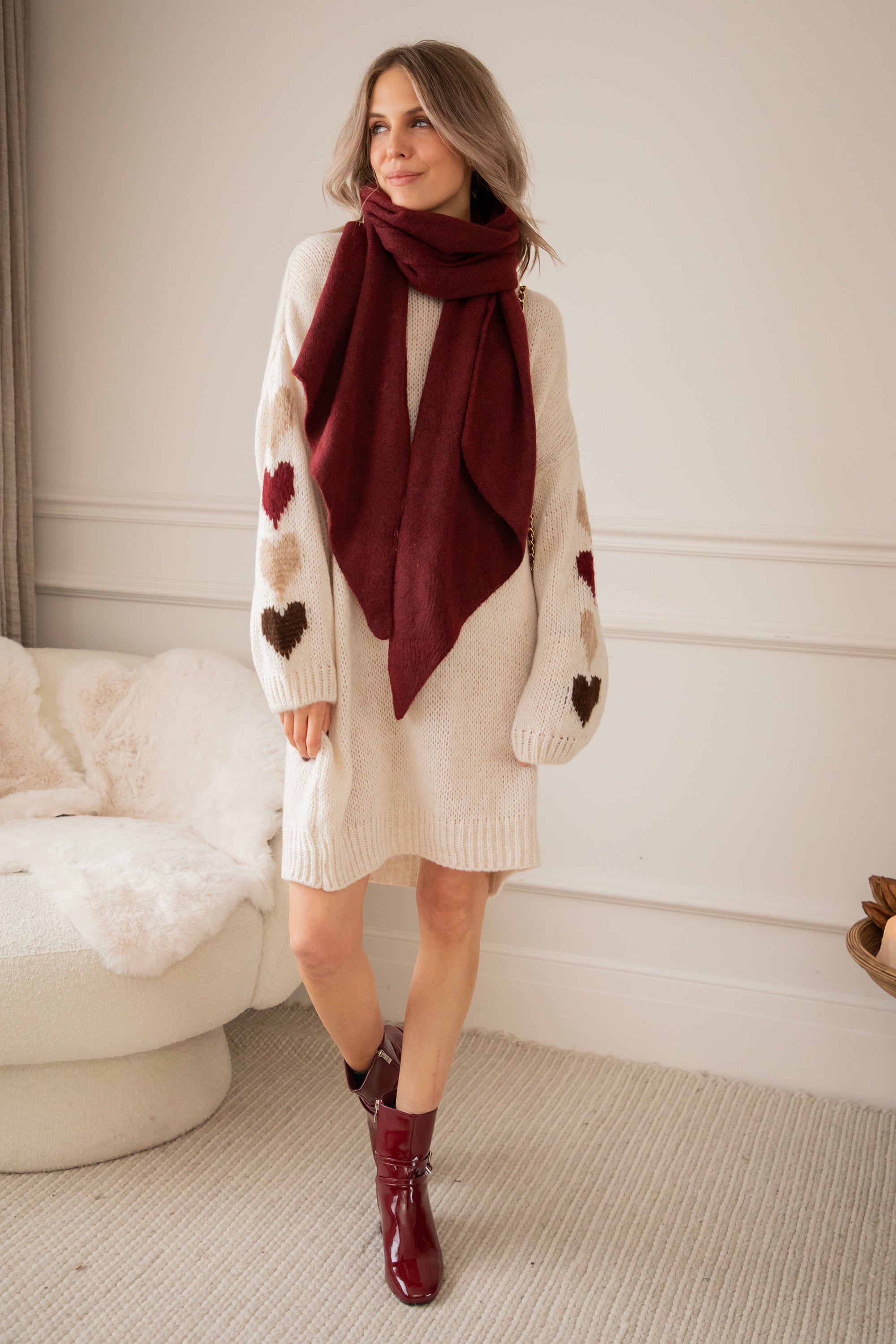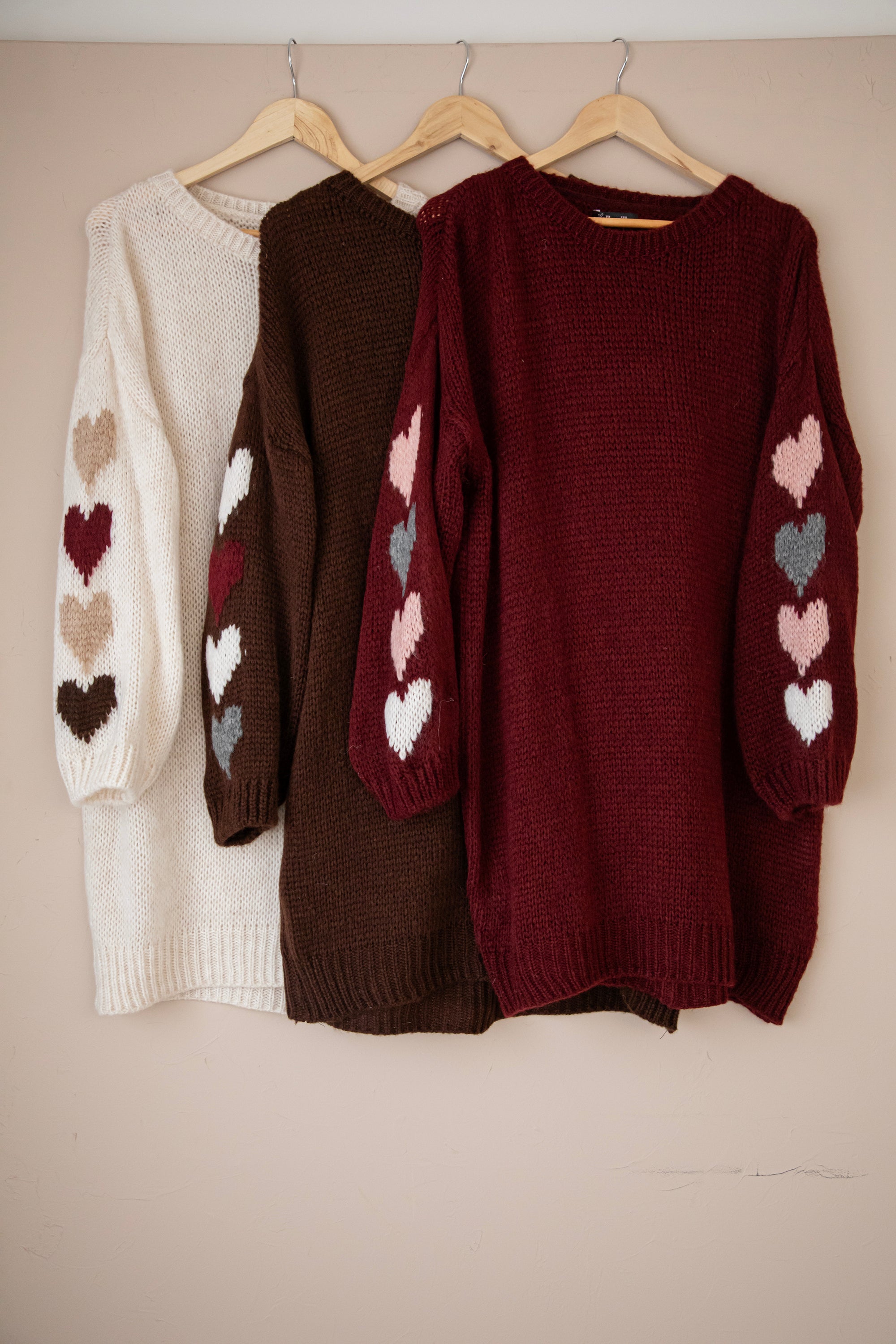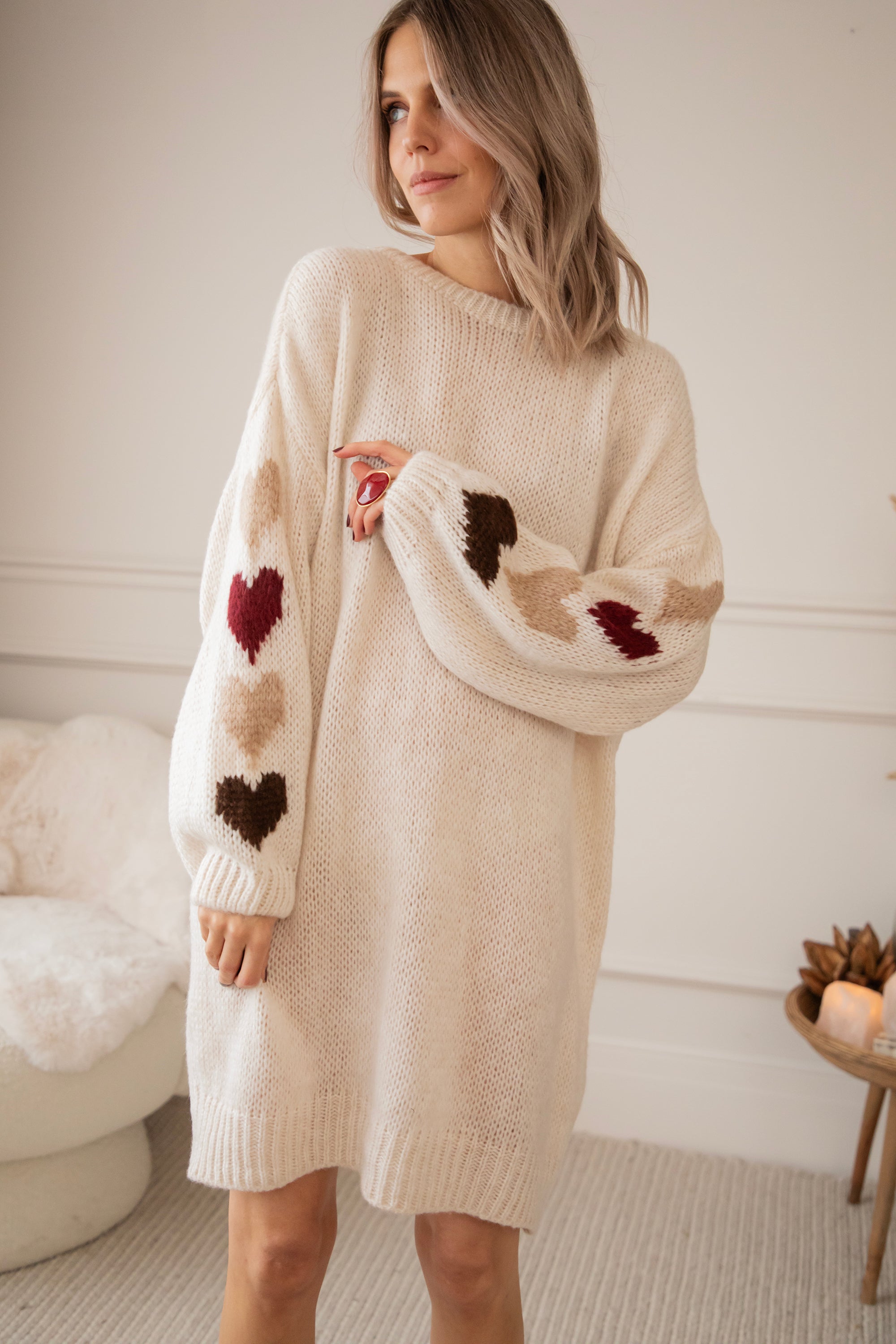 En met deze cozy sweater dress mag dat helemaal gezien worden! Ik wissel mijn jeans en sweater looks heel graag af met een cozy sweater dress, vergezeld van een panty en enkelboots 😍 Op de mouwtjes zie je vier lieve hartjes in camel, bordeaux en bruin… mega cute en totally ellemilla ❤️🤎 De stof voelt heerlijk zacht aan dankzij een mix van acryl, wol en viscose: warm, comfy en perfect voor die knusse herfst- en winterdagen!